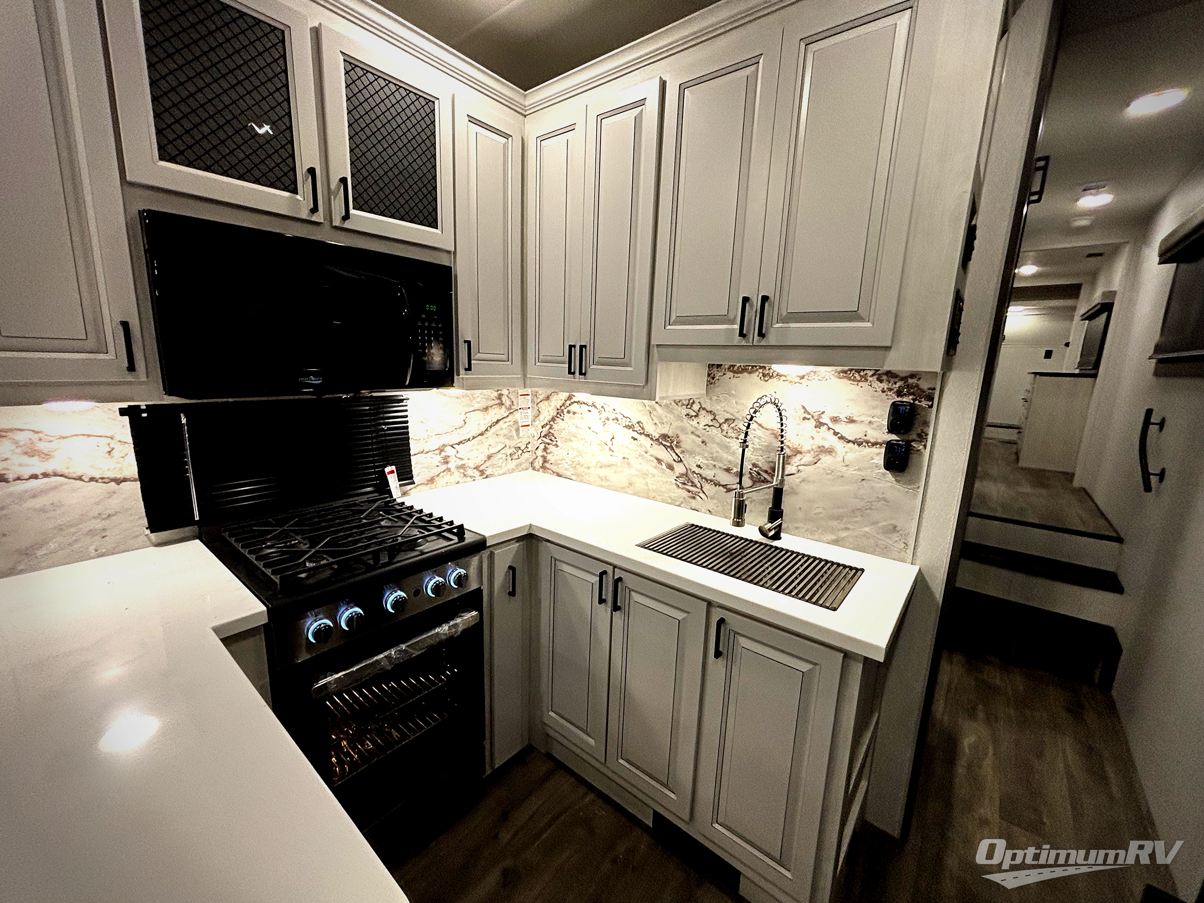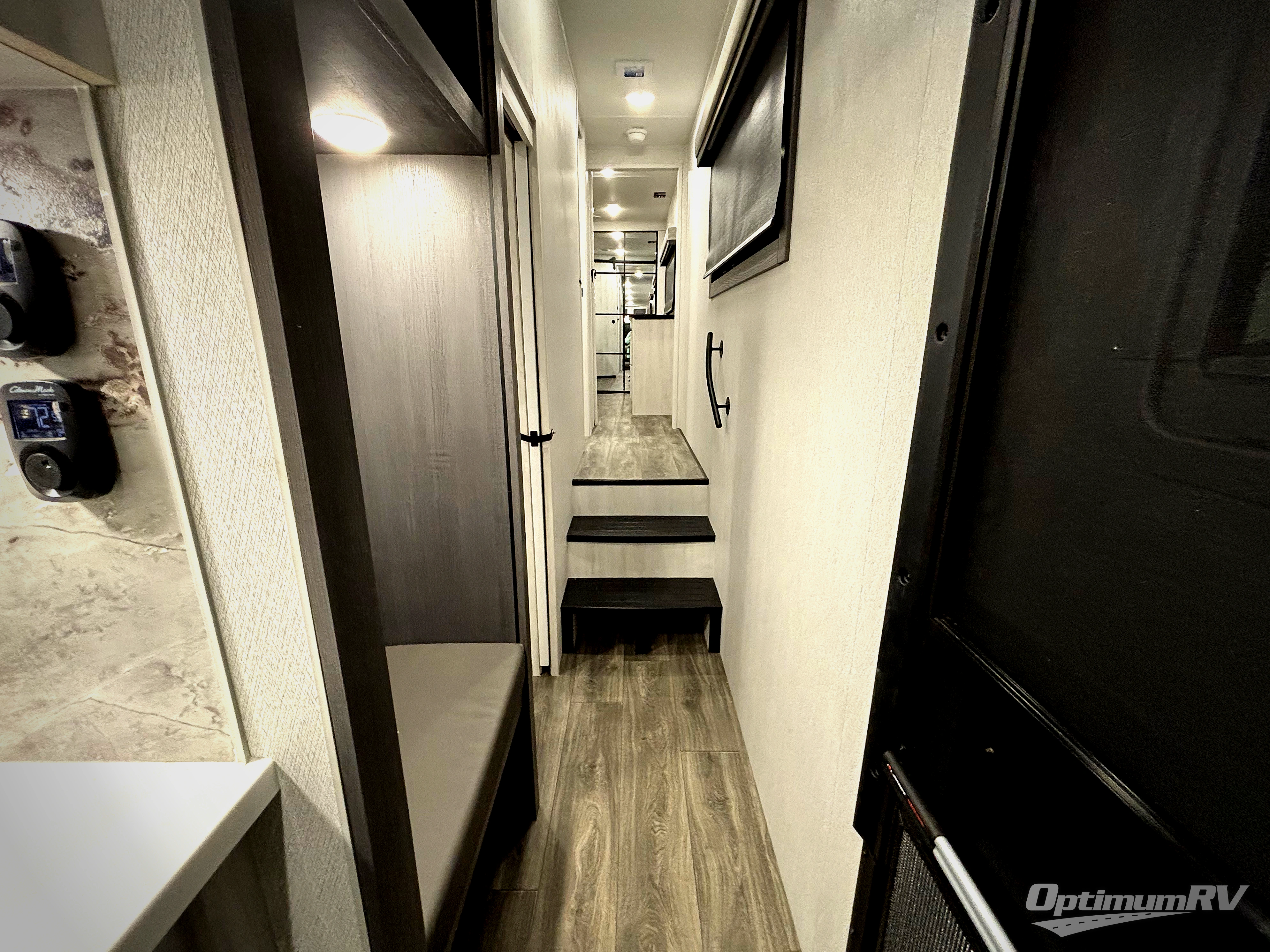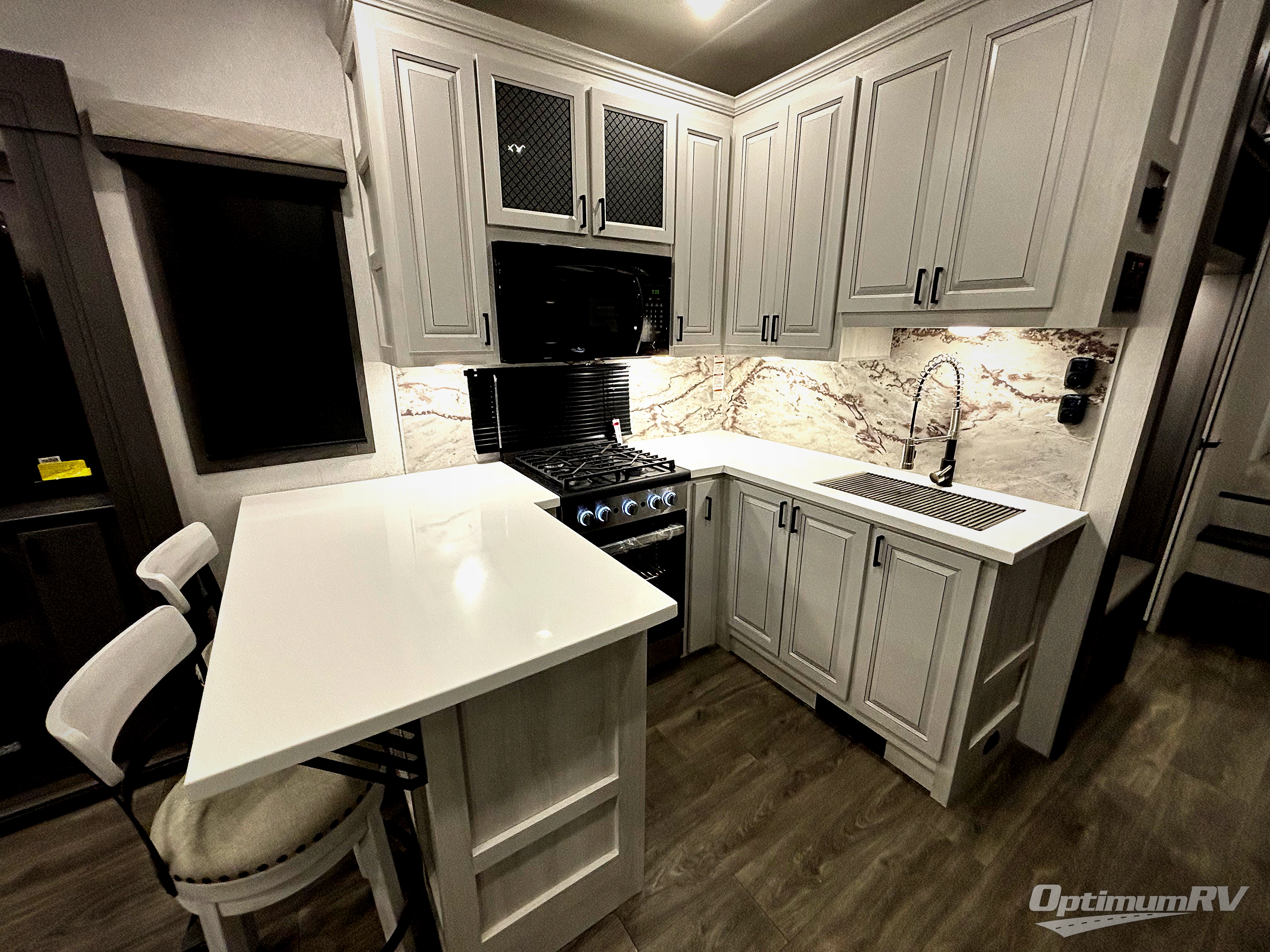 There is just too much luxury to name on the EAST TO WEST Ahara fifth wheel! These units are quite impressive, and once you see them, you'll know what we mean. The Ahara first grabs your attention with its fully painted aerodynamic fiberglass front cap, 102" wide-body chassis, and deep tint square frameless windows. For towing, you'll find a MORryde CRE 3000 suspension, LED marker lights, LED taillights with back-up lights, and rear view camera prep. Traveling in different climates is also made easy with the high-efficiency triple A/C system, 40,000 BTU high-capacity furnace, plus heated, insulated, and enclosed underbelly found within the Climate Package. Head inside to enjoy Slow Rise roller shades, a flush floor kitchen slide to help prevent trips, and solid surface countertops in the kitchen and bath to name a few luxuries!