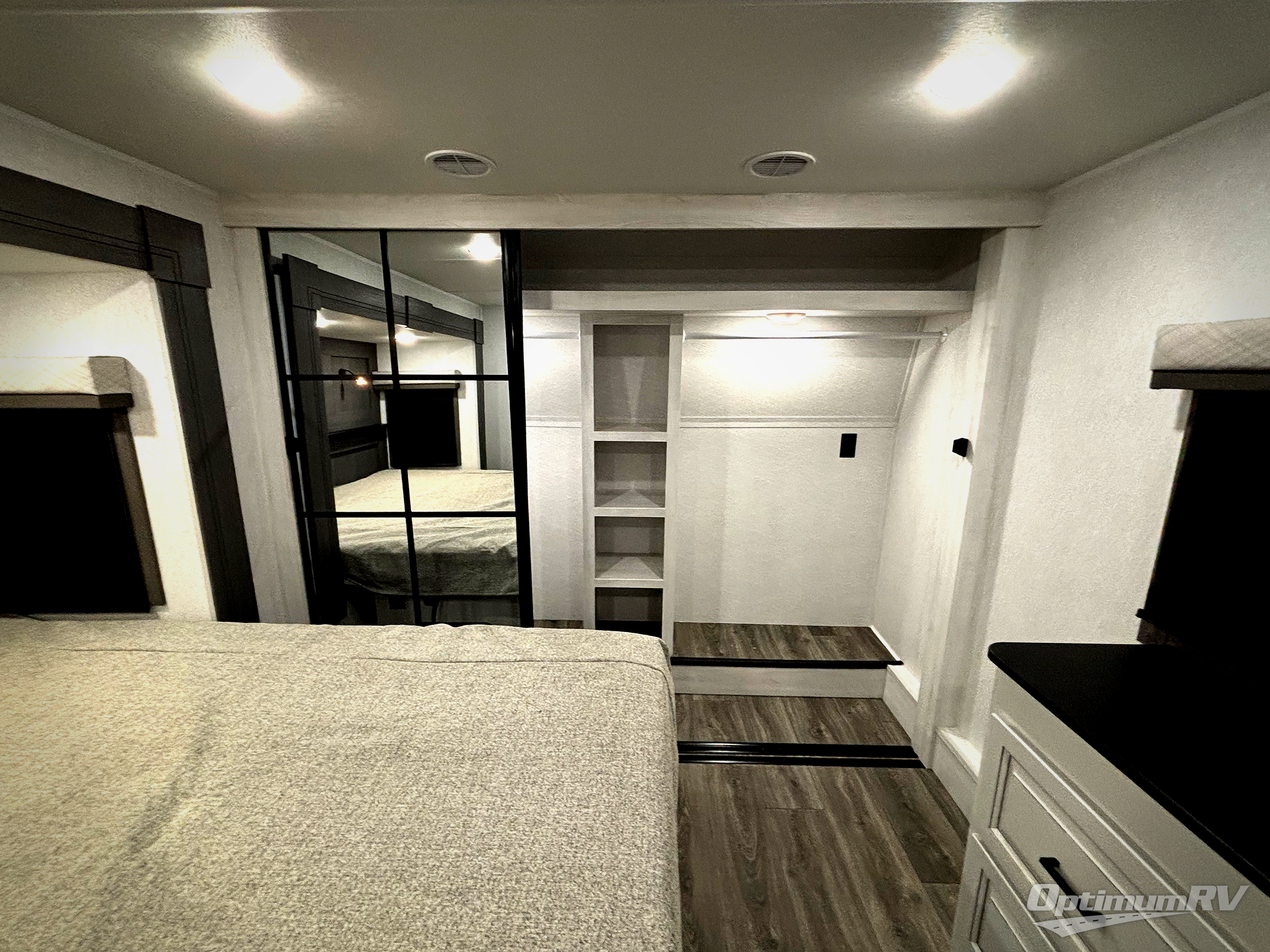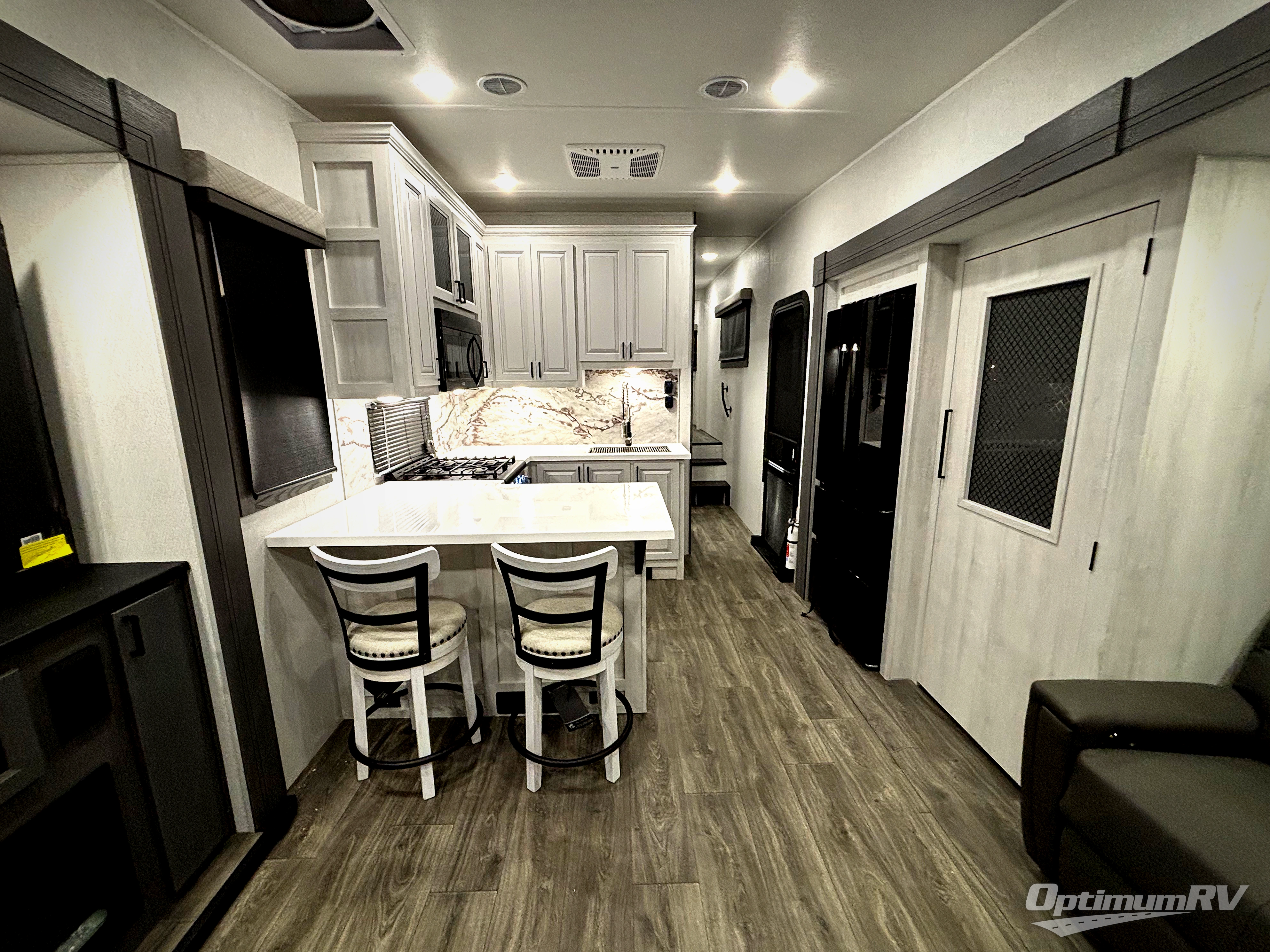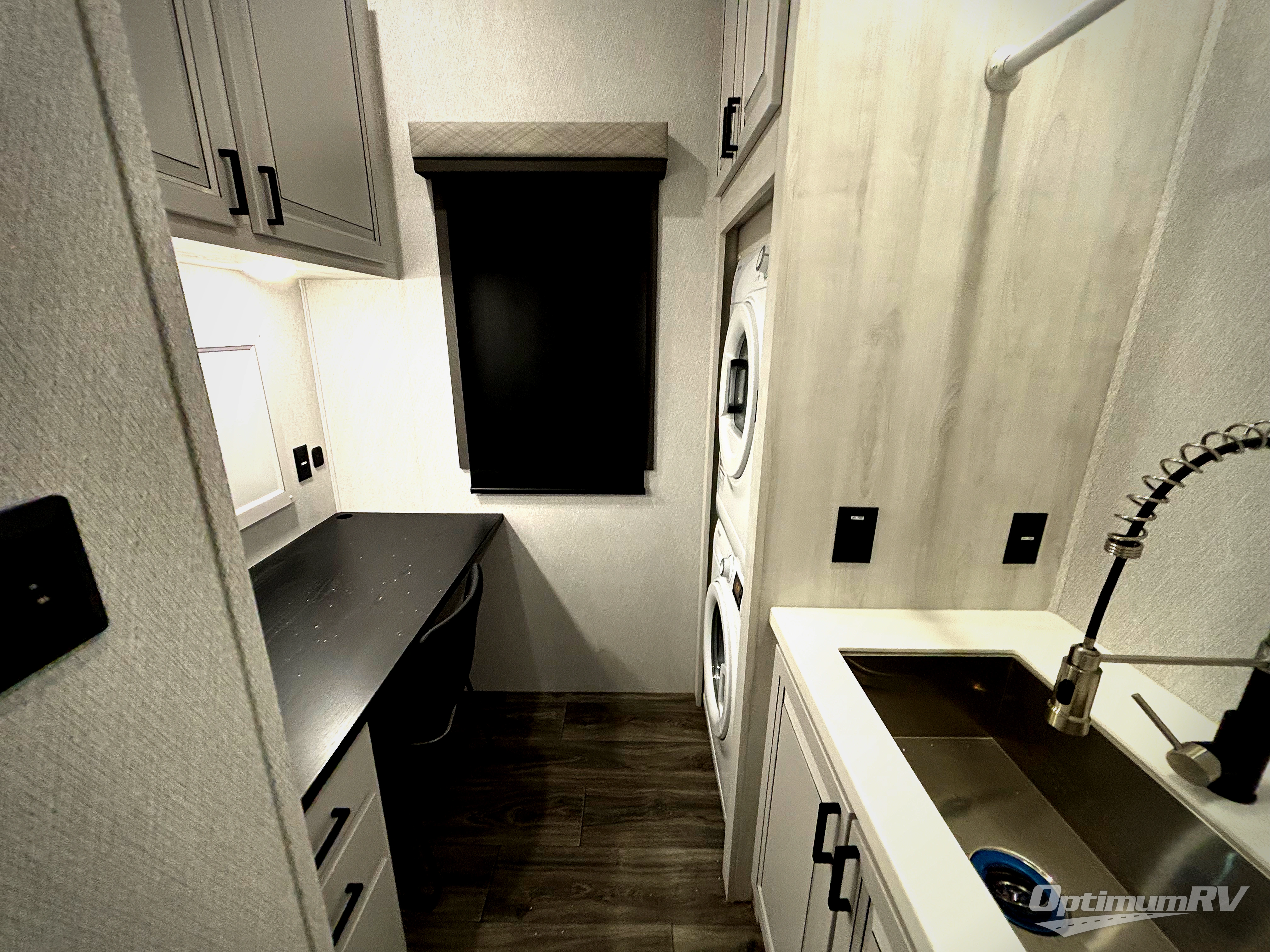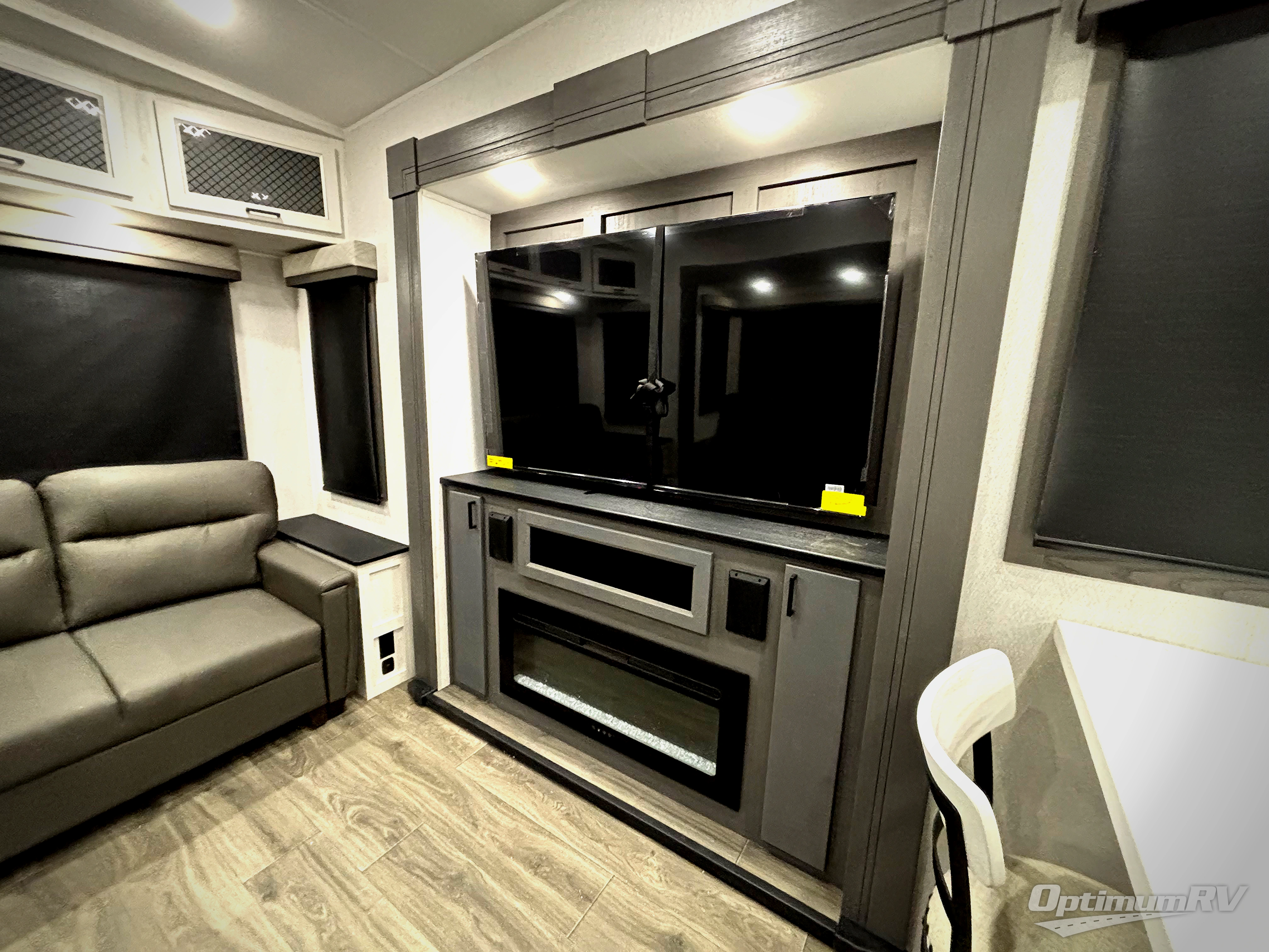 Head to the lake in this spacious fifth wheel for four! You will love the front private bedroom with a king bed slide out, sliding dresser top with hidden storage, and front closet to keep your clothes organized. The full bath is right next to the bedroom for easy access at night, and you're going to love having the utility room in this unit. There is stackable washer and dryer prep, a desk or laundry table, plus a sink with a mirror, making this room multi-functional! A full kitchen includes a u-shaped counter, a four burner range and an over-the-range microwave, plus a 16 cu. ft. refrigerator and walk-in pantry with a coffee bar and shelves. There is also a breakfast bar with seating here where you can visit with the chef while dinner is being made. Last but not least, the rear living area will be a favorite place to hang out with theater seating, a rear 78" EZ out sofa, and a TV with a fireplace!