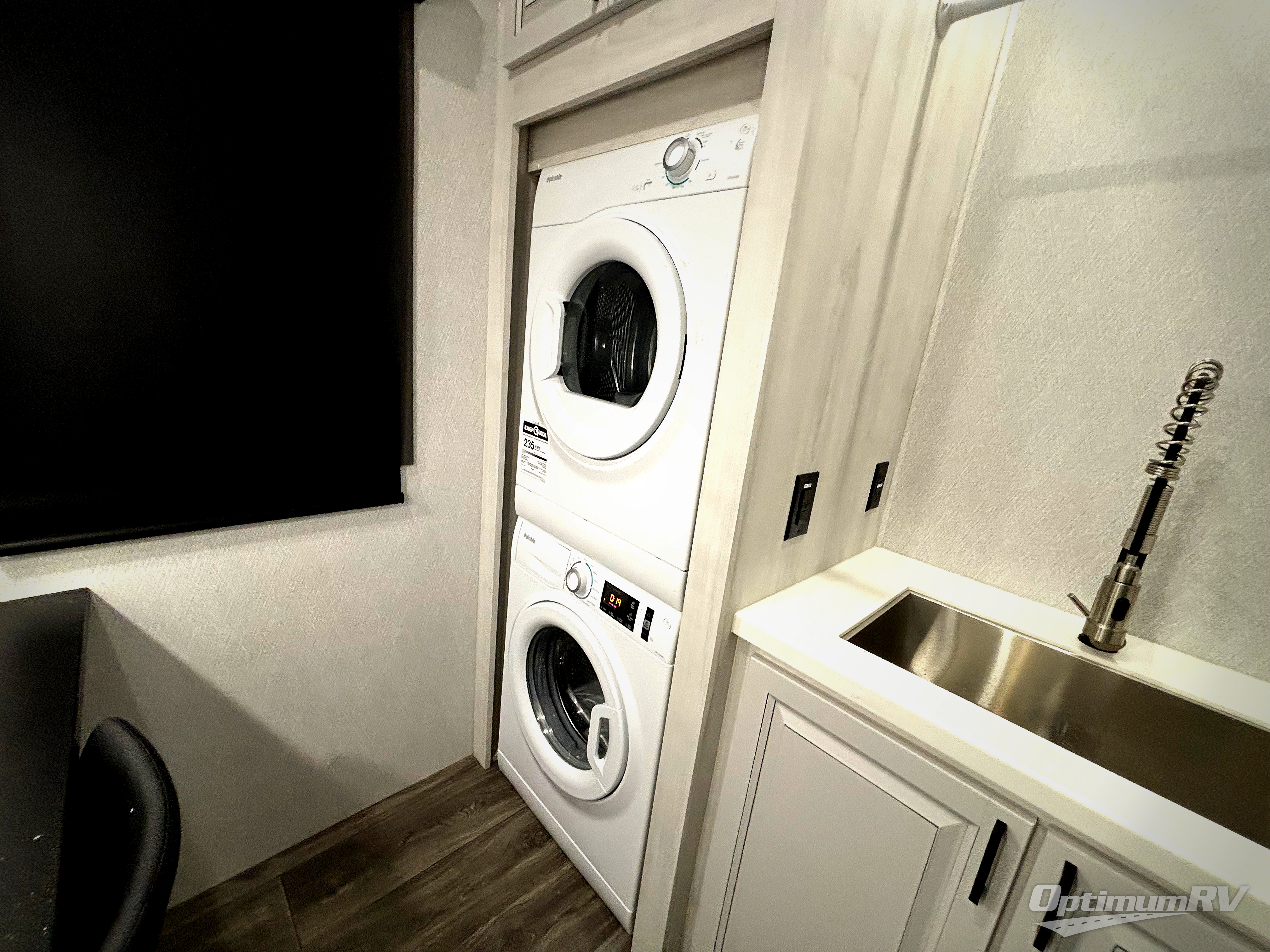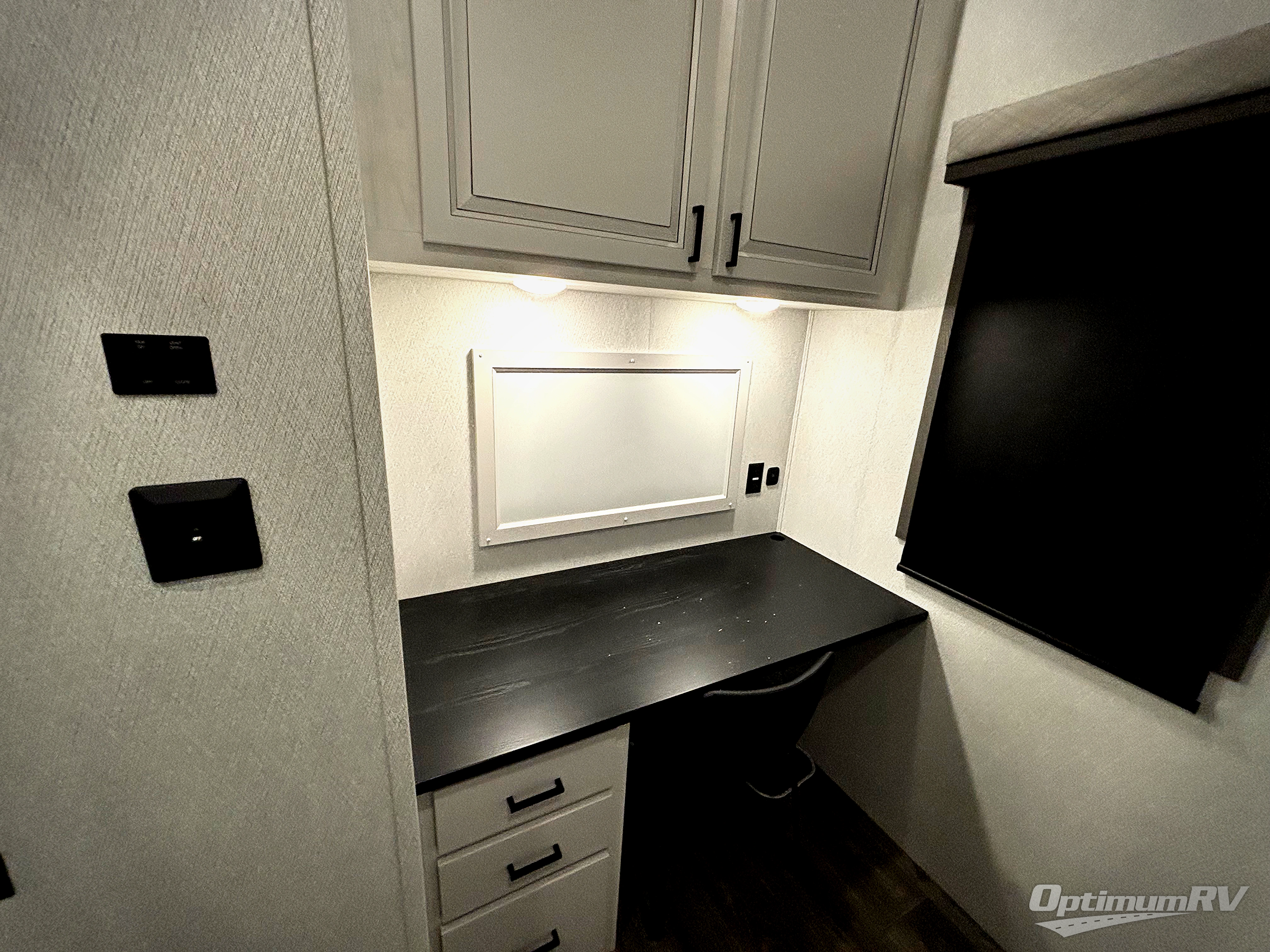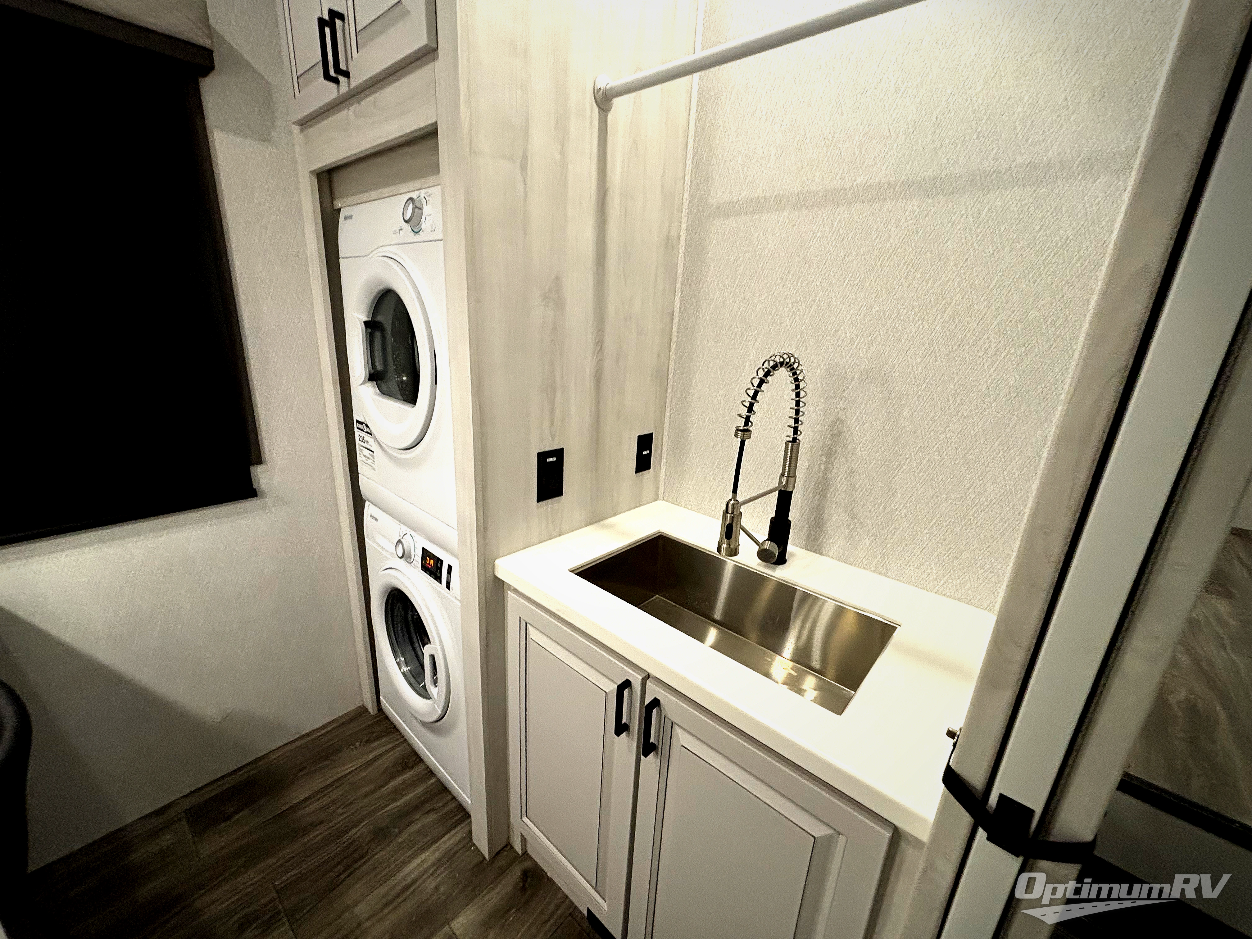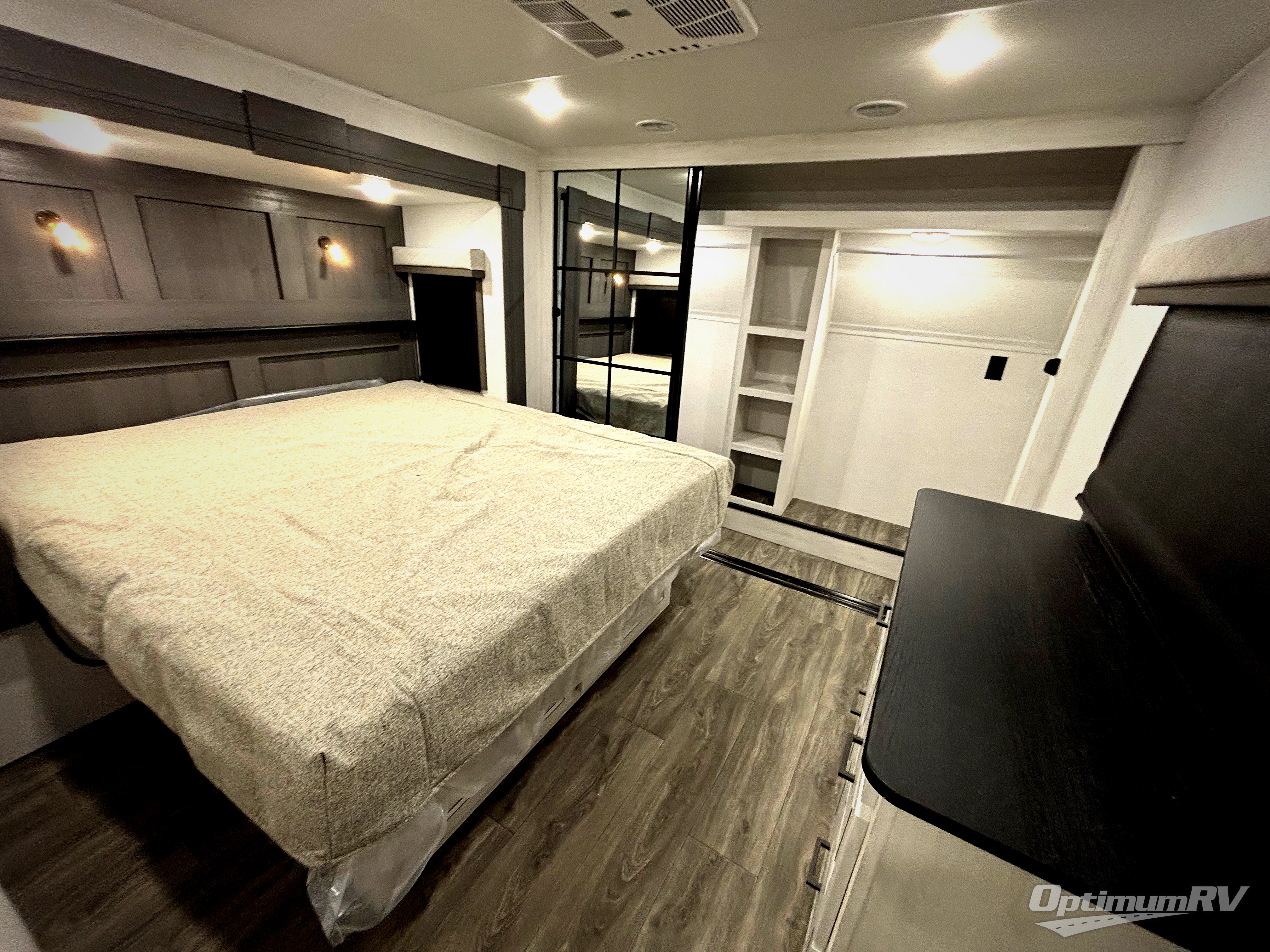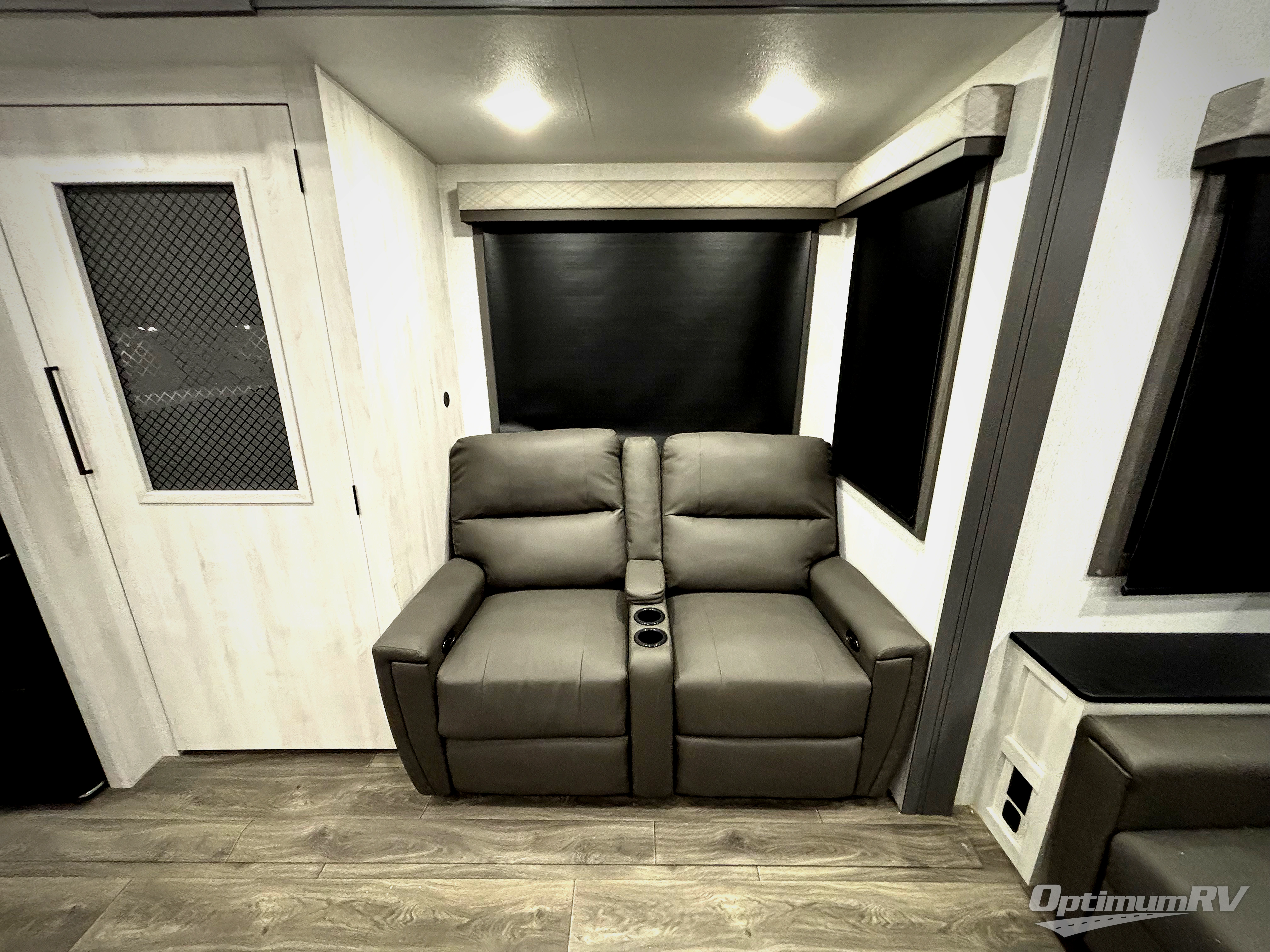 Head to the lake in this spacious fifth wheel for four! You will love the front private bedroom with a king bed slide out, sliding dresser top with hidden storage, and front closet to keep your clothes organized. The full bath is right next to the bedroom for easy access at night, and you're going to love having the utility room in this unit. There is stackable washer and dryer prep, a desk or laundry table, plus a sink with a mirror, making this room multi-functional! A full kitchen includes a u-shaped counter, a four burner range and an over-the-range microwave, plus a 16 cu. ft. refrigerator and walk-in pantry with a coffee bar and shelves. There is also a breakfast bar with seating here where you can visit with the chef while dinner is being made. Last but not least, the rear living area will be a favorite place to hang out with theater seating, a rear 78" EZ out sofa, and a TV with a fireplace!