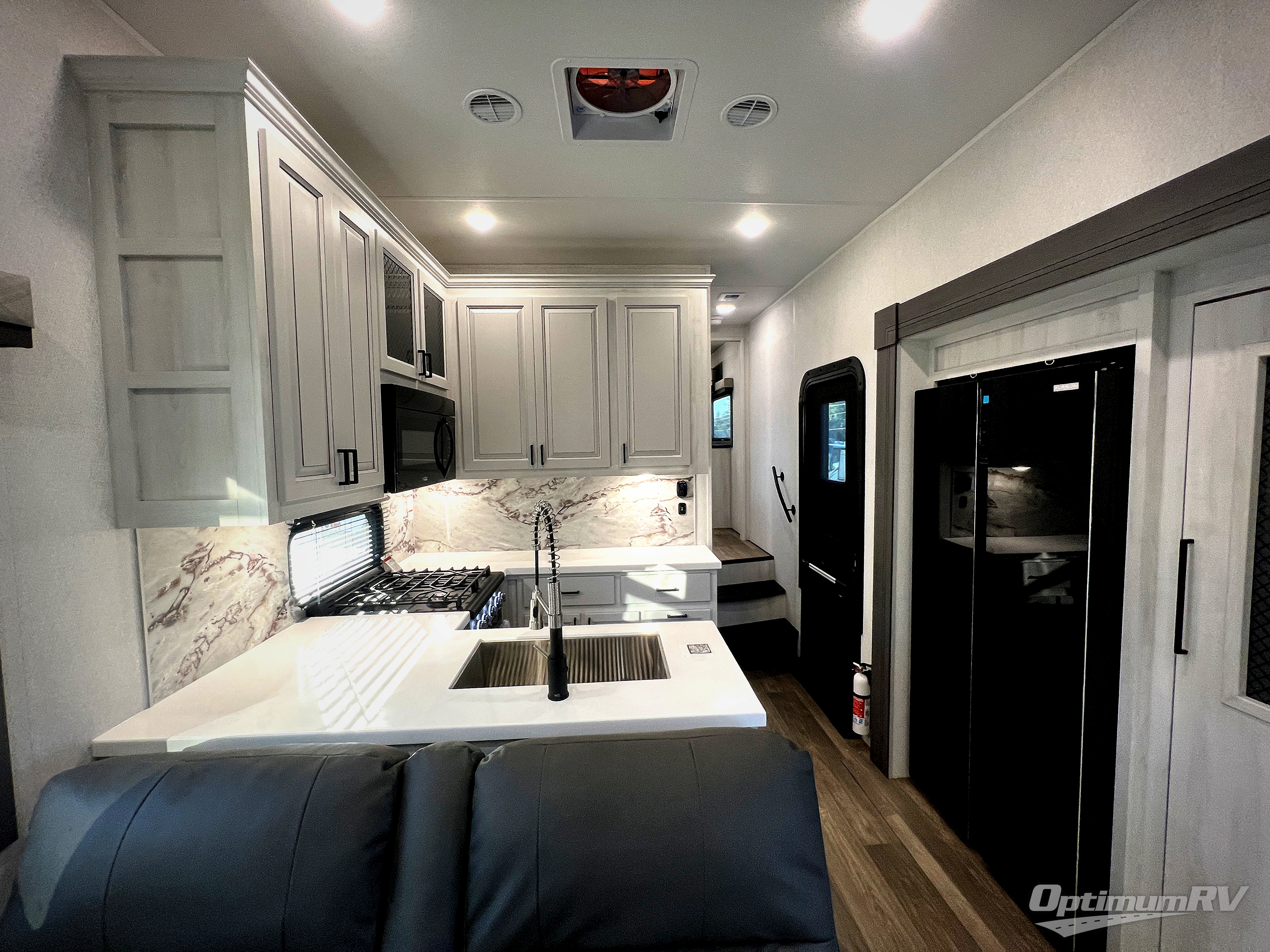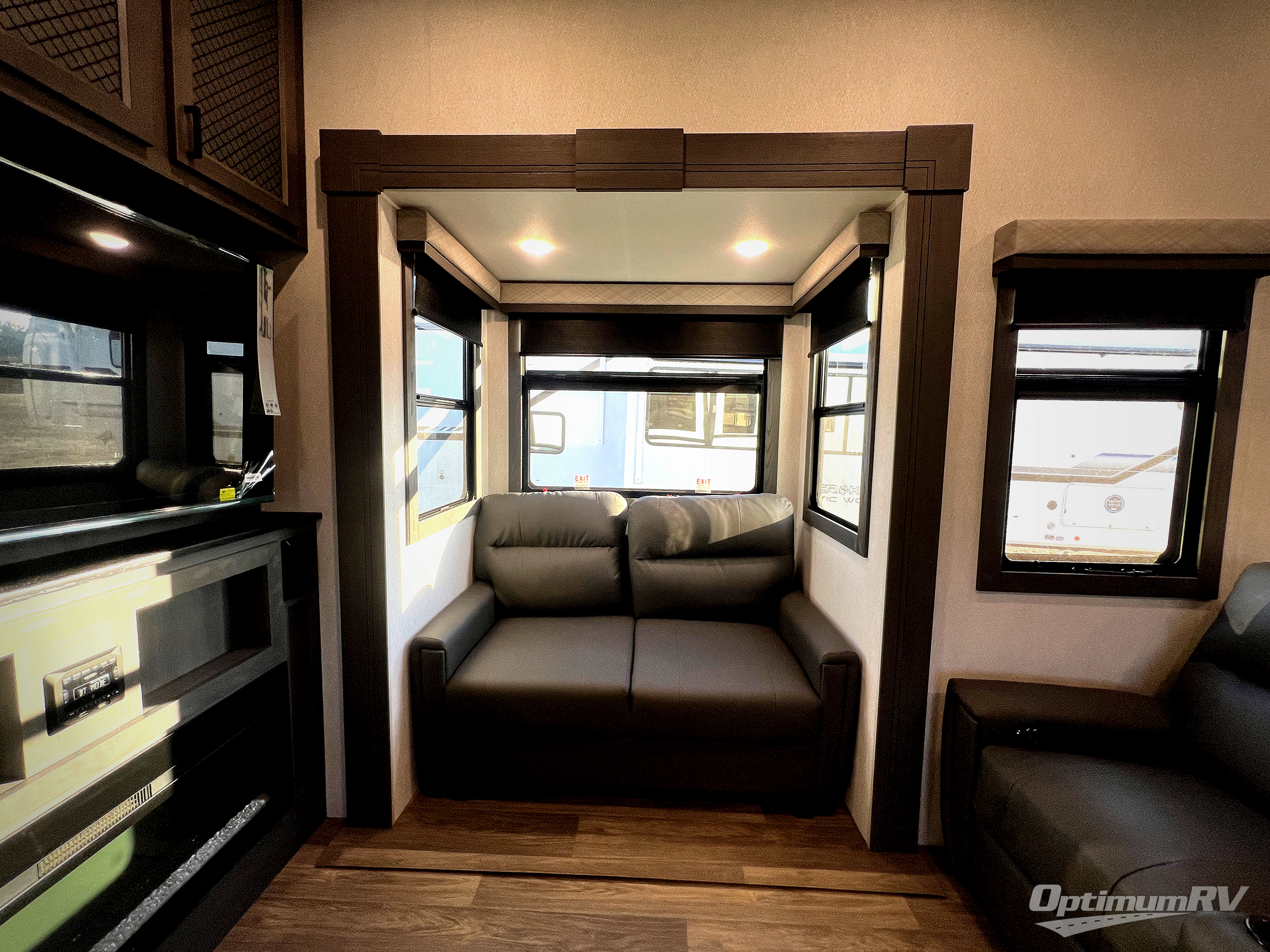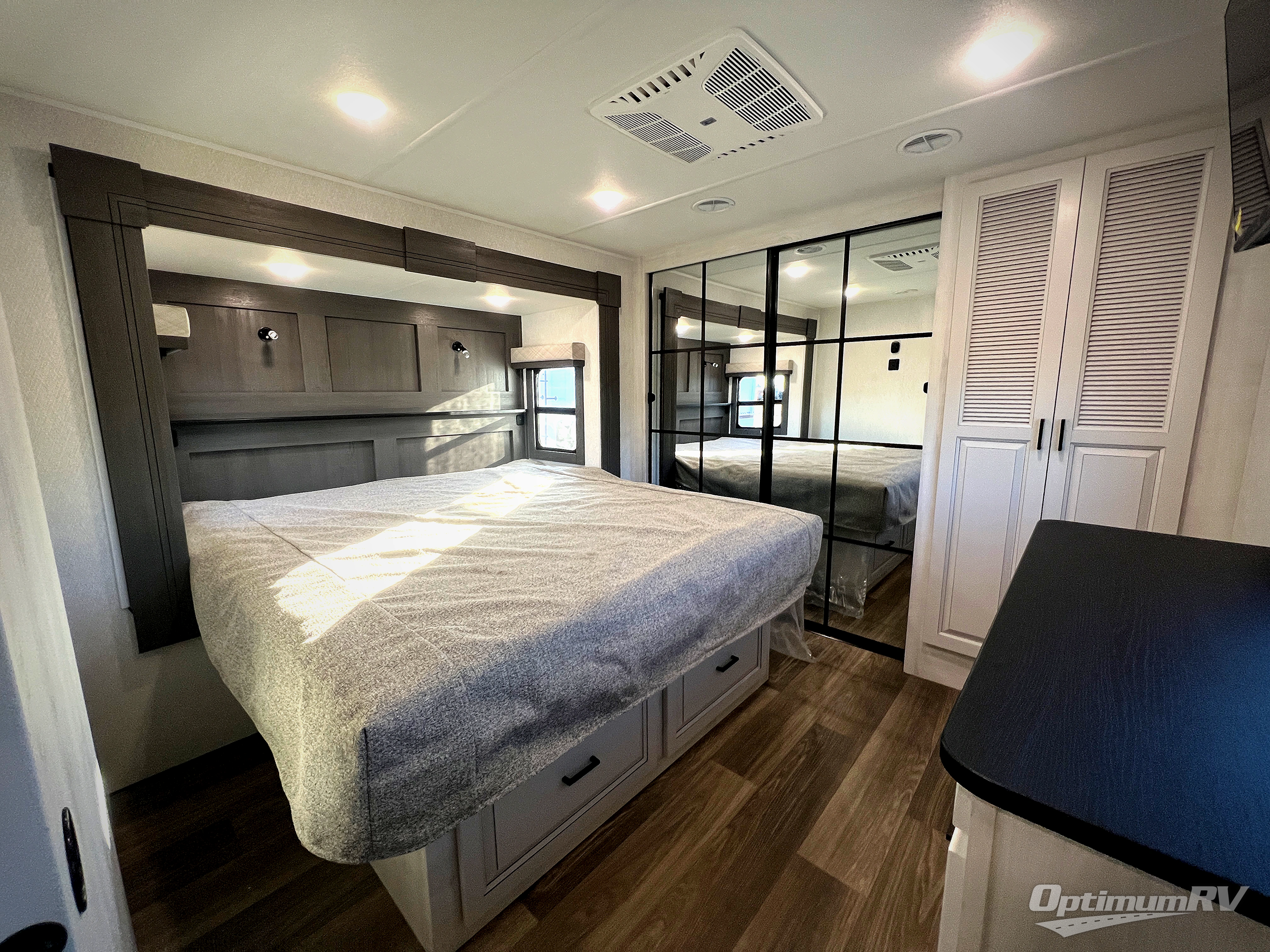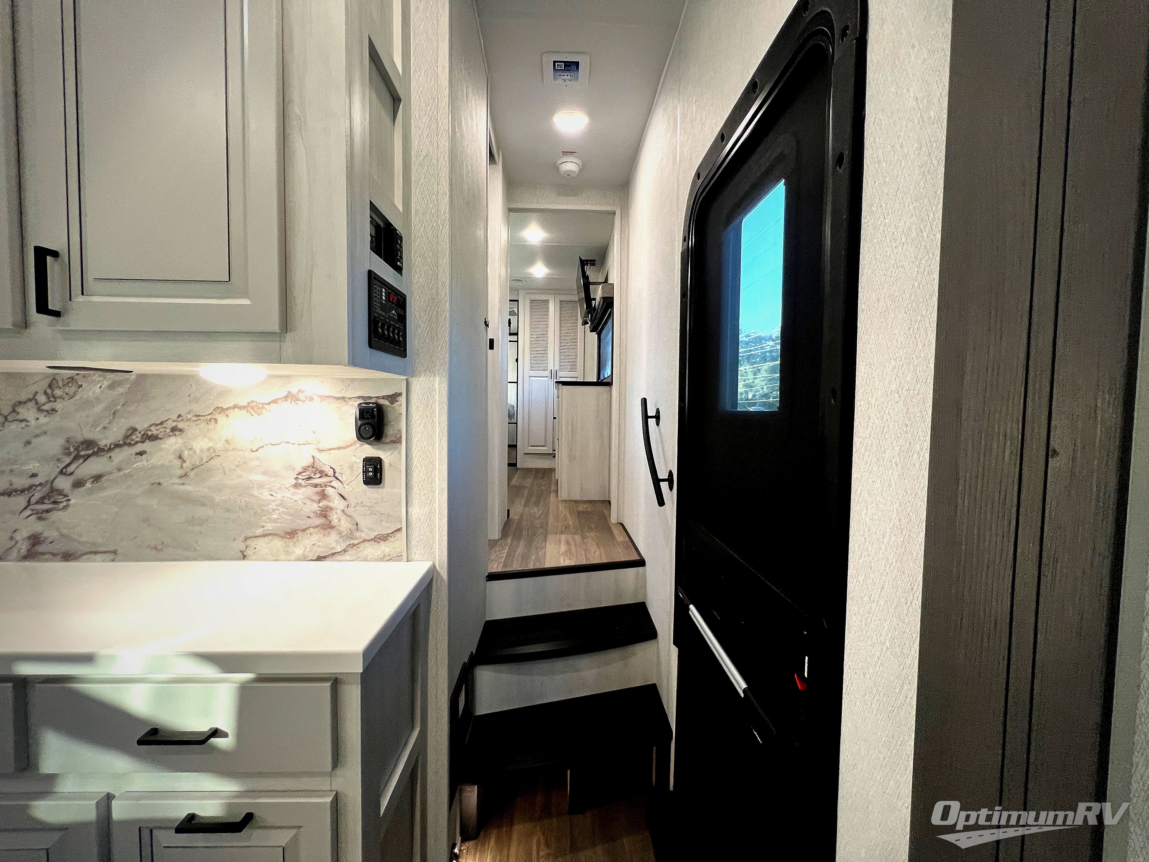 There is just too much luxury to name on the EAST TO WEST Ahara fifth wheel! These units are quite impressive, and once you see them, you'll know what we mean. The Ahara first grabs your attention with its fully painted aerodynamic fiberglass front cap, 102" wide-body chassis, and deep tint square frameless windows. For towing, you'll find a MORryde CRE 3000 suspension, LED marker lights, LED taillights with back-up lights, and rear view camera prep. Traveling in different climates is also made easy with the high-efficiency triple A/C system, 40,000 BTU high-capacity furnace, plus heated, insulated, and enclosed underbelly found within the Climate Package. Head inside to enjoy Slow Rise roller shades, a flush floor kitchen slide to help prevent trips, and solid surface countertops in the kitchen and bath to name a few luxuries!