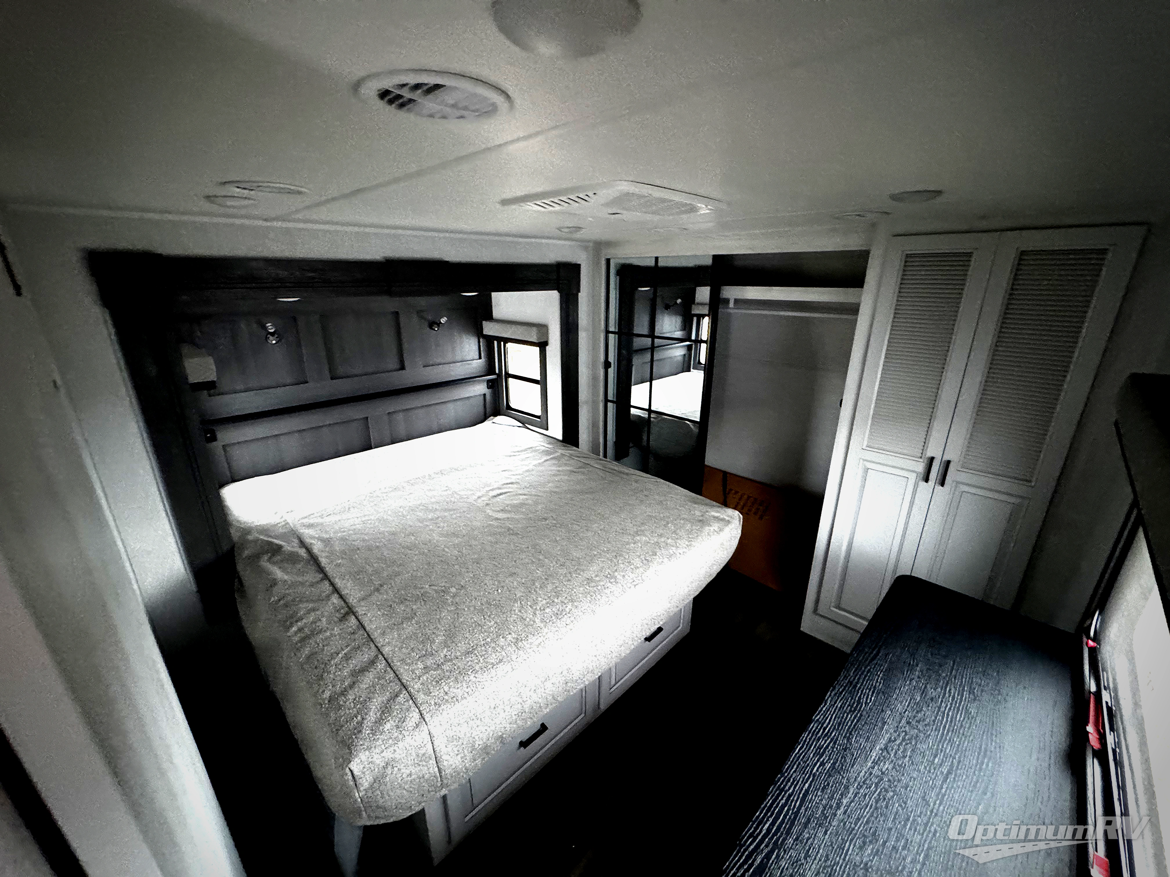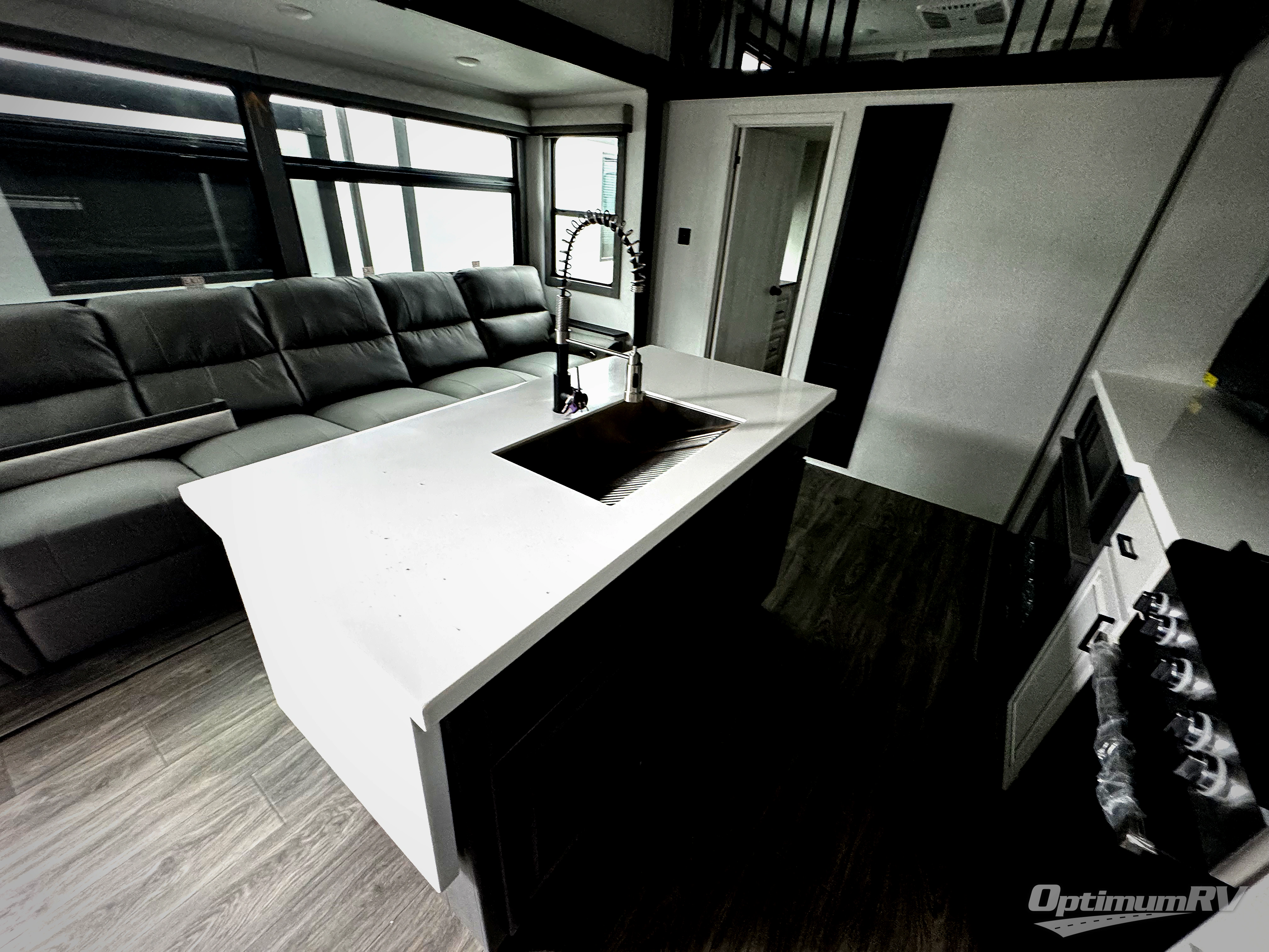 If you're looking for a luxury fifth wheel with more space for friends and family, you've found it in this Ahara! The main entry door opens up to the living area with dual opposing slides, a 50" LED TV with a fireplace, plus a full kitchen with residential appliances, a hutch, and even a pantry for dry goods and snacks. Everyone can meet here in the evenings to dine at the free-standing dinette or relax on the theater seating. You'll love the rear master suite with its king bed slide out, drawers under the bed, and full rear bath with the unique rear second entry door. And check out the Ahara Sky Suite loft above this room for even more sleeping or storage space! Your guests will find the front private bedroom to be accommodating since it includes a king bed slide out, drawers under the bed, plus a large wardrobe to keep clothes tidy. There is also a closet with washer and dryer prep. Who knows, you may just choose this bedroom for your own!