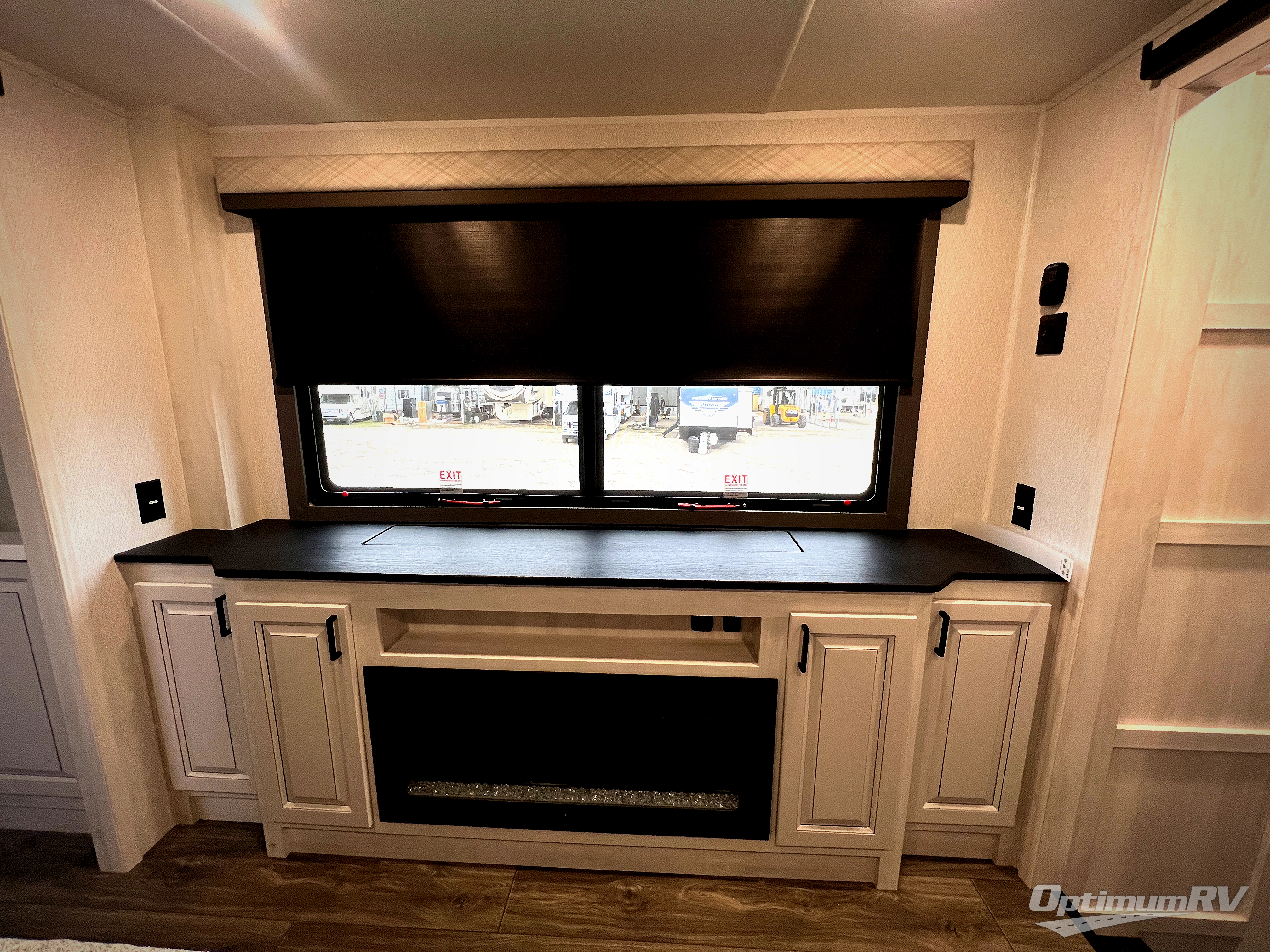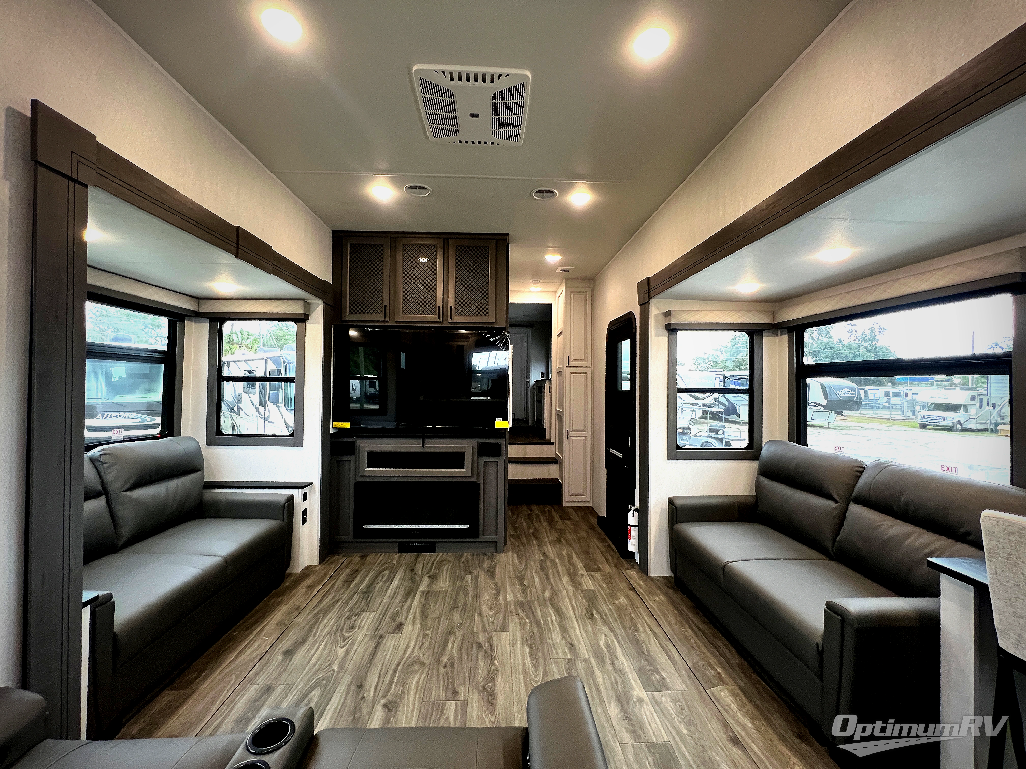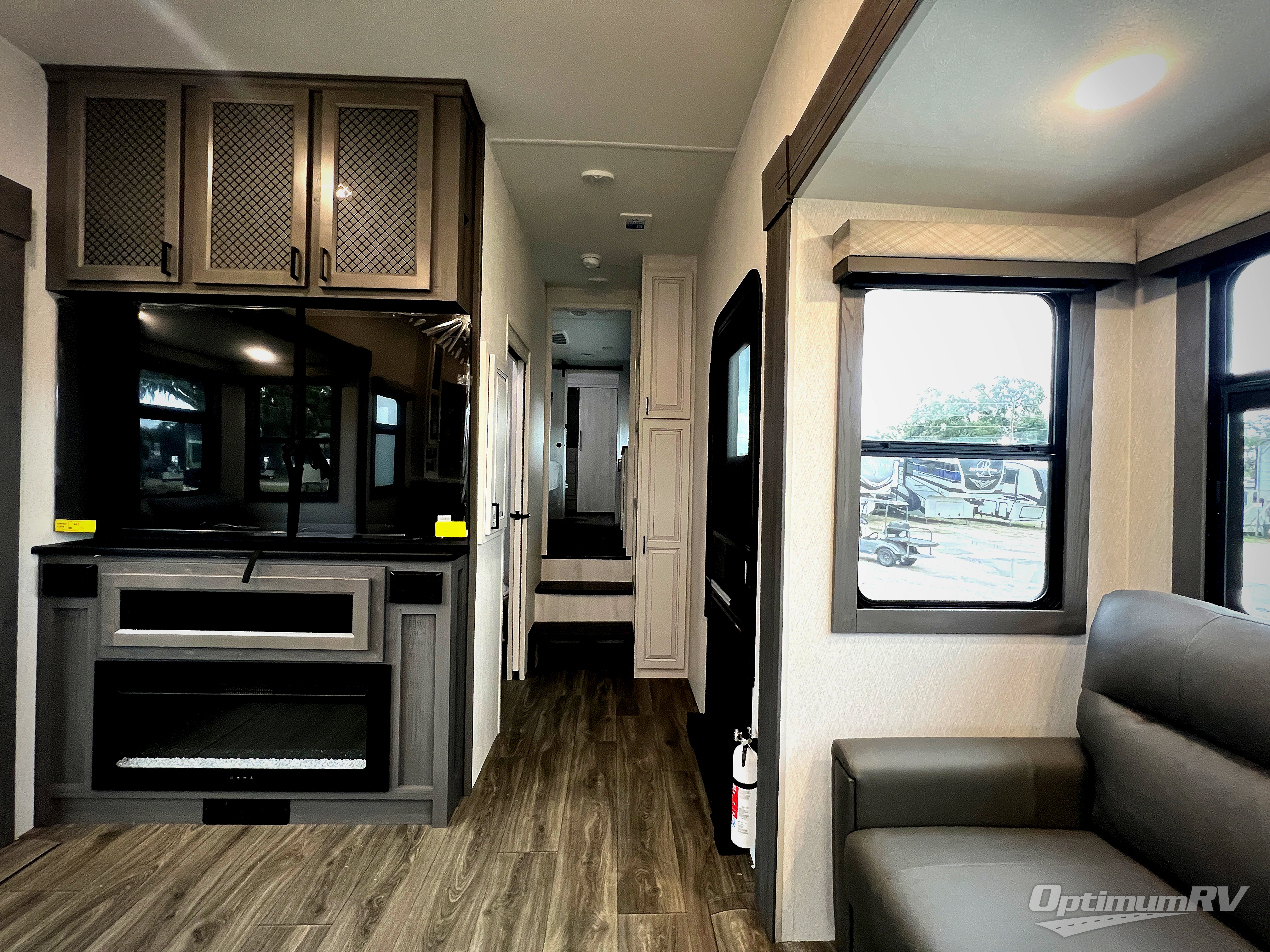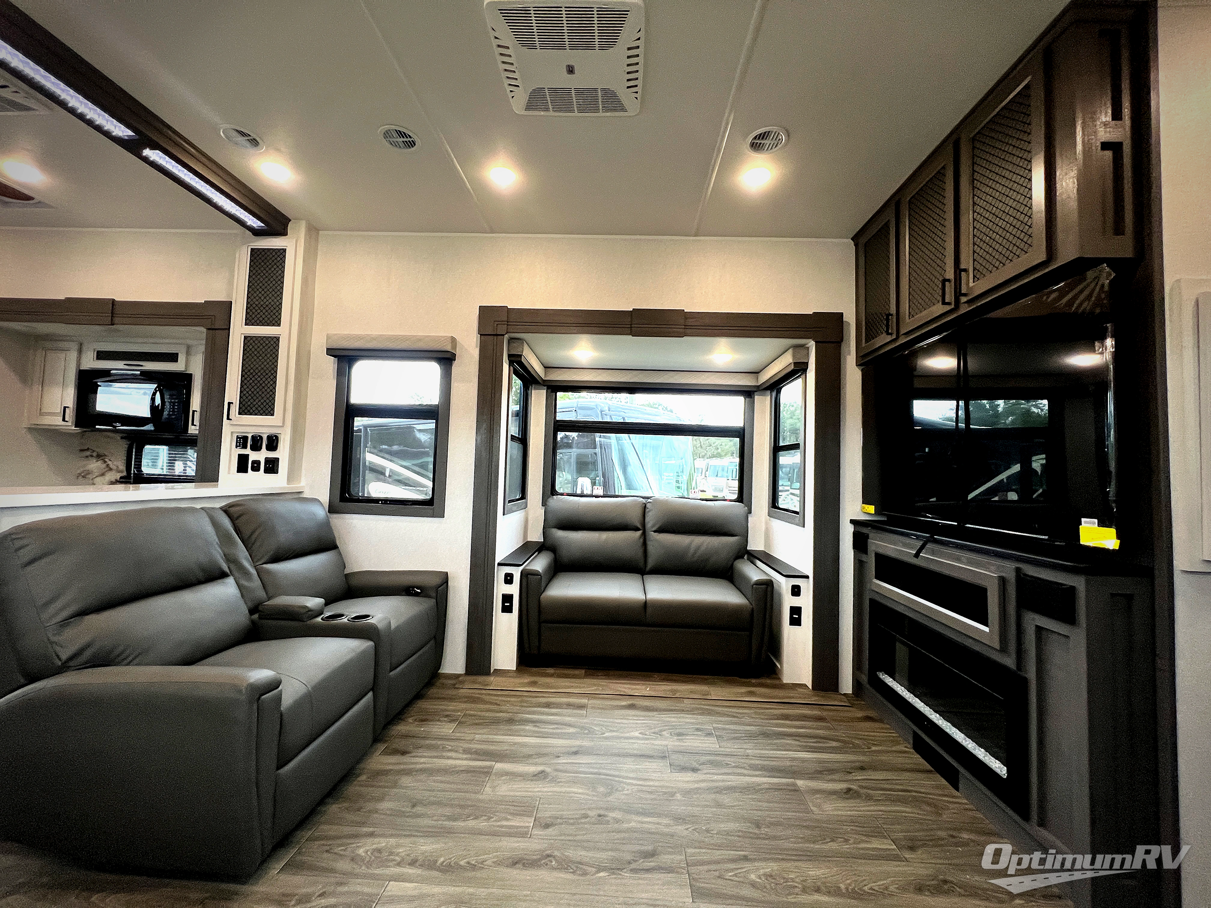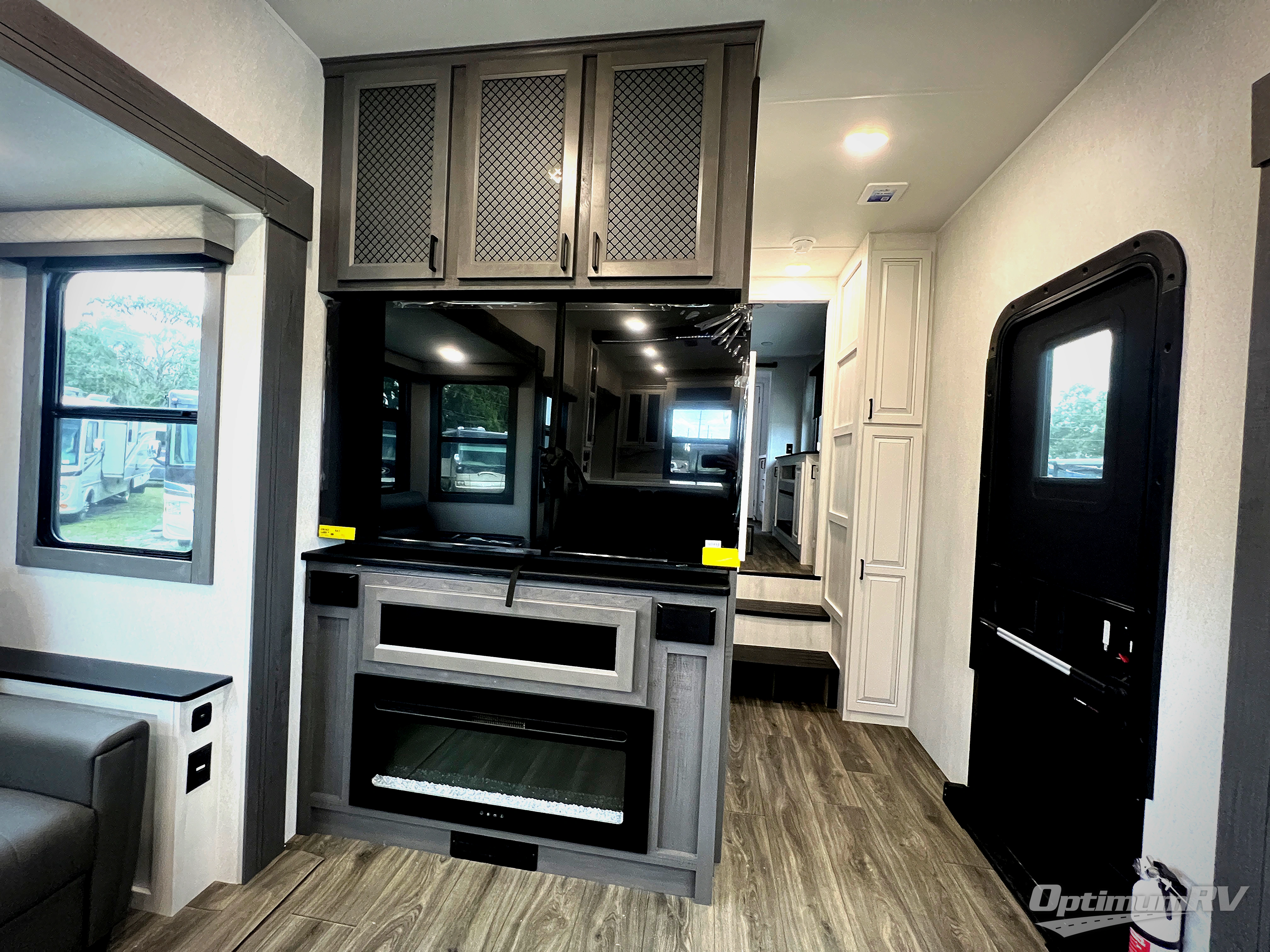 The spacious rear kitchen is equipped with a 30” microwave, 24” residential oven, overhead cabinets, breakfast bar with bar stools, walk-in pantry, and 16 cu. ft. refrigerator, perfect for cooking all your favorite dishes with the greatest convenience The living room is the heart of the home, featuring a desk with chairs, theater seating, two 60” trifold sofas, a TV with fireplace, and more. And when nature calls, you'll appreciate the convenient half bath with overhead cabinets and washer and dryer prep. The main bedroom is a serene retreat, featuring a king bed, drawers under the bed, a bedroom fireplace, and more. This is the perfect place to relax and recharge after a long day of adventure, and with a front full bathroom featuring a 30” x 40” shower, dual sink vanity, walk-in closet, dresser/drawers, you'll have everything you need to stay clean and comfortable on the go. Outside, you'll find not one, but two awnings to providing plenty of shade and protection from the elements.