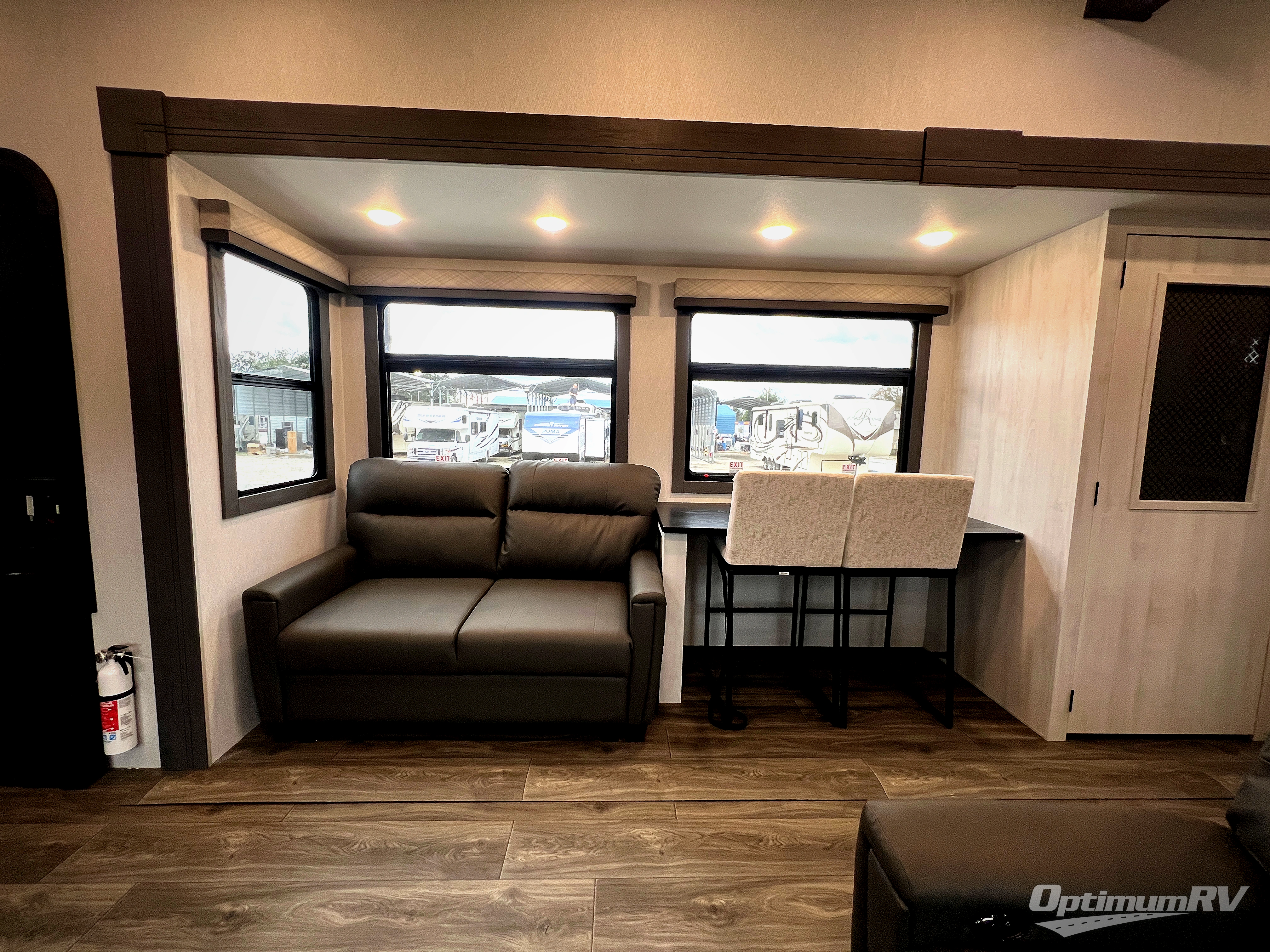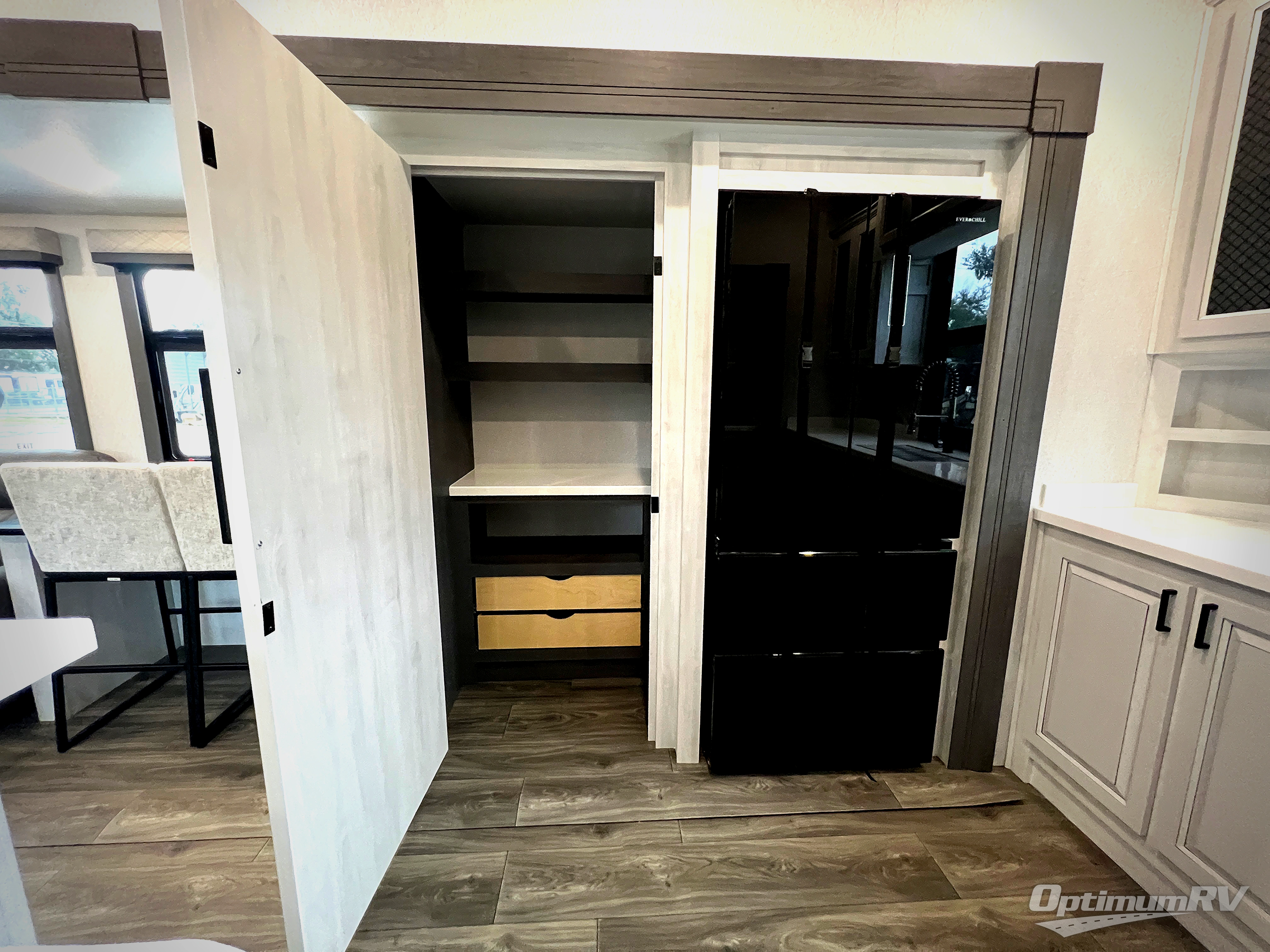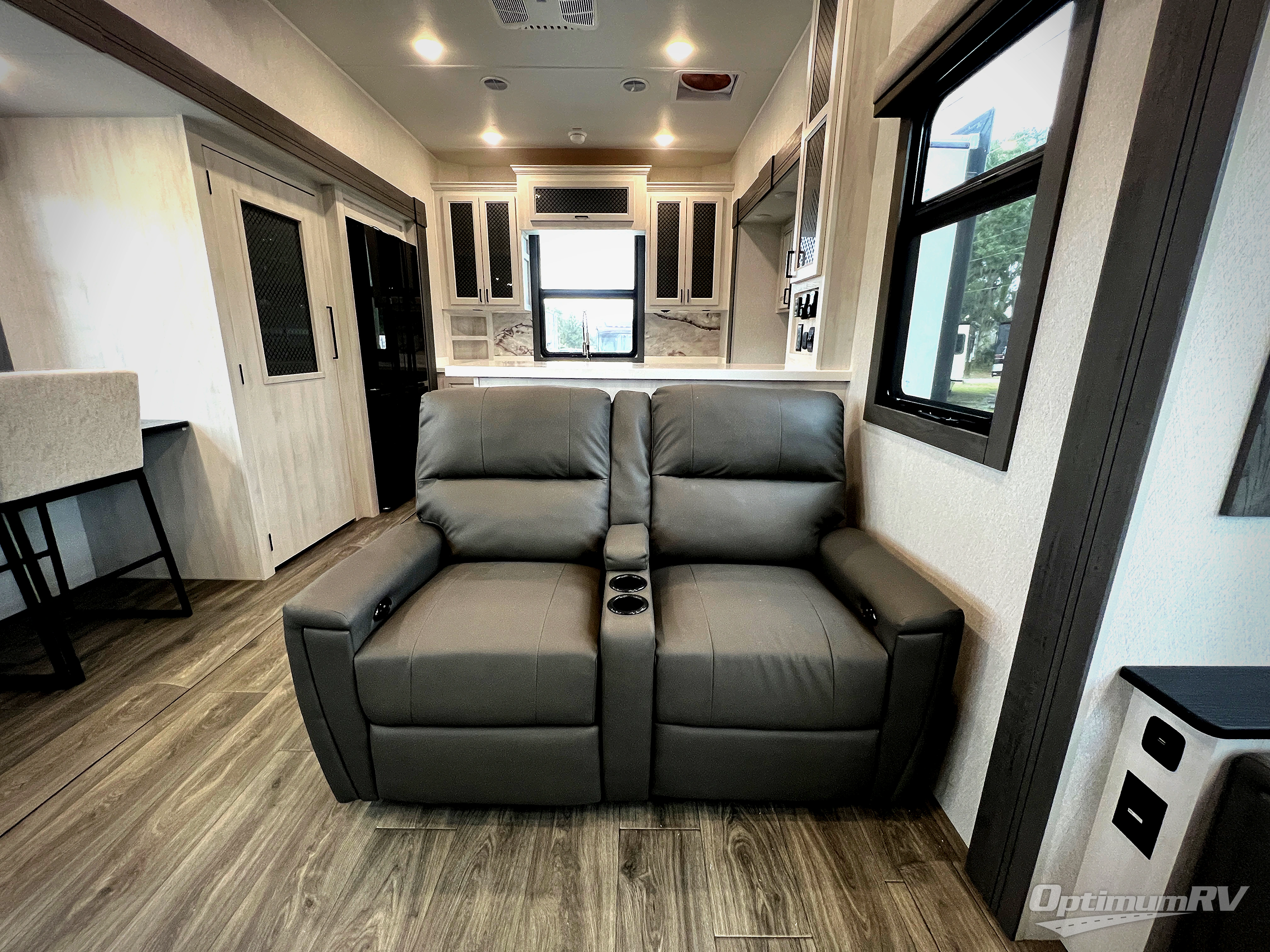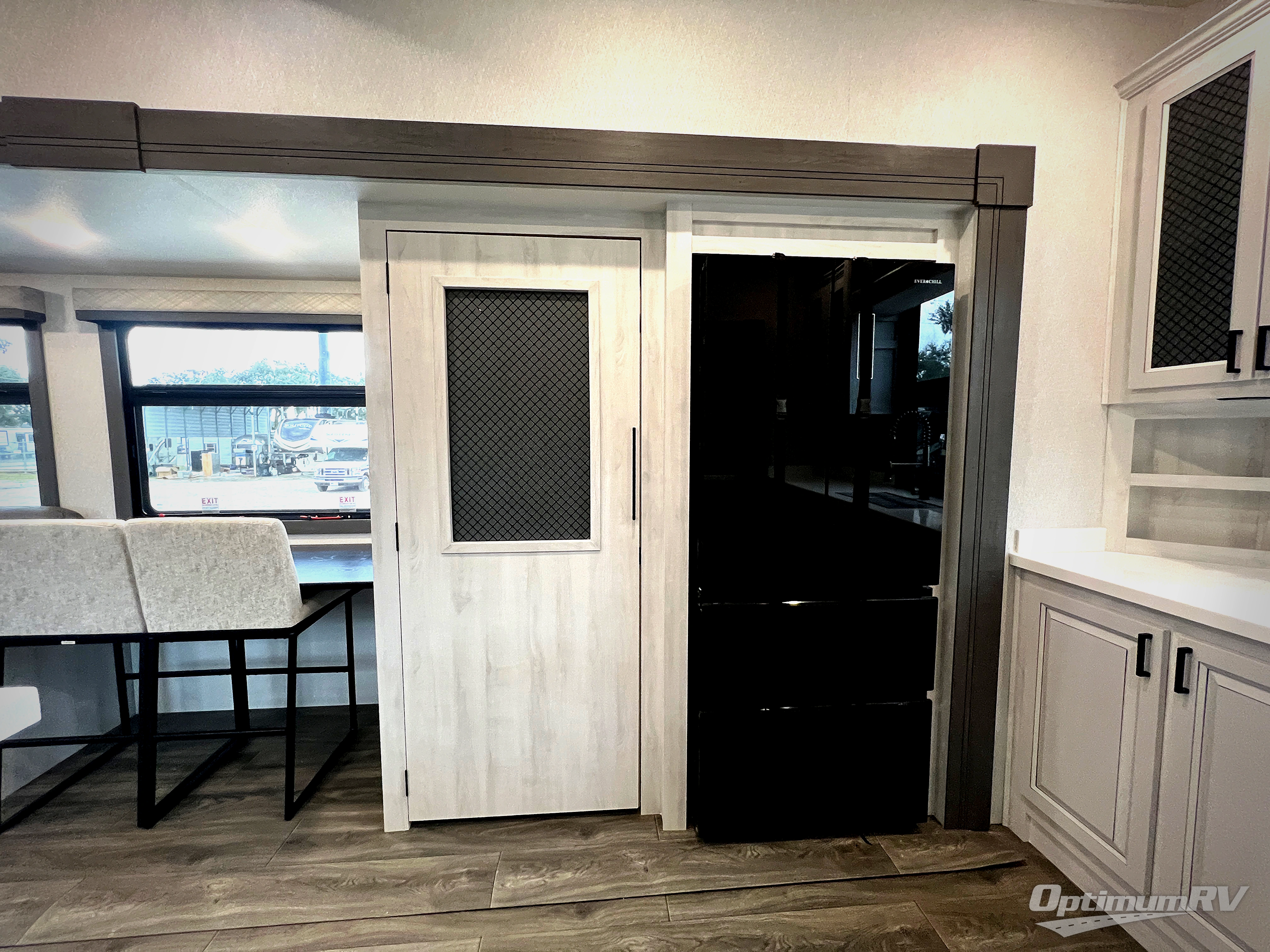 The spacious rear kitchen is equipped with a 30” microwave, 24” residential oven, overhead cabinets, breakfast bar with bar stools, walk-in pantry, and 16 cu. ft. refrigerator, perfect for cooking all your favorite dishes with the greatest convenience The living room is the heart of the home, featuring a desk with chairs, theater seating, two 60” trifold sofas, a TV with fireplace, and more. And when nature calls, you'll appreciate the convenient half bath with overhead cabinets and washer and dryer prep. The main bedroom is a serene retreat, featuring a king bed, drawers under the bed, a bedroom fireplace, and more. This is the perfect place to relax and recharge after a long day of adventure, and with a front full bathroom featuring a 30” x 40” shower, dual sink vanity, walk-in closet, dresser/drawers, you'll have everything you need to stay clean and comfortable on the go. Outside, you'll find not one, but two awnings to providing plenty of shade and protection from the elements.