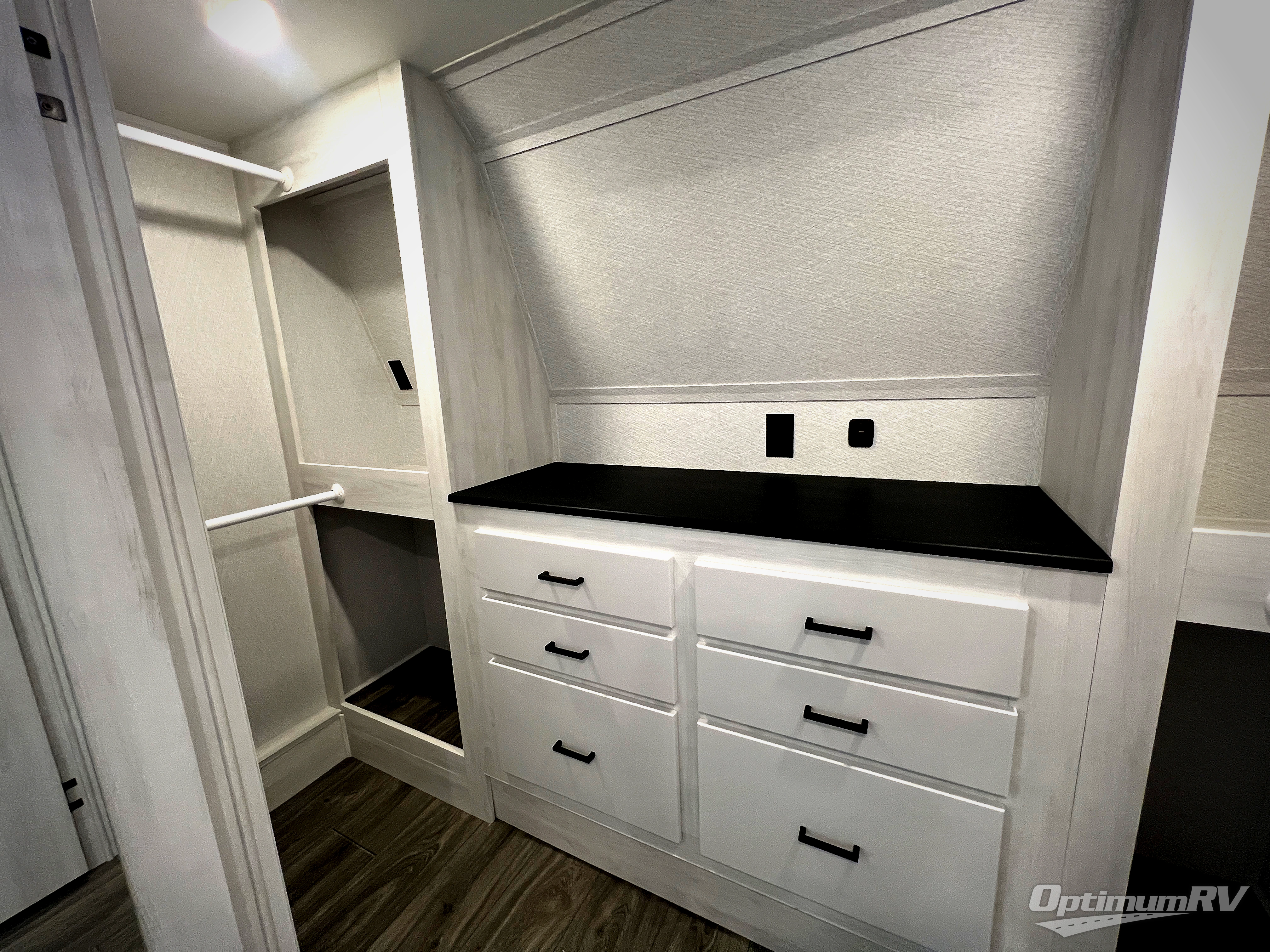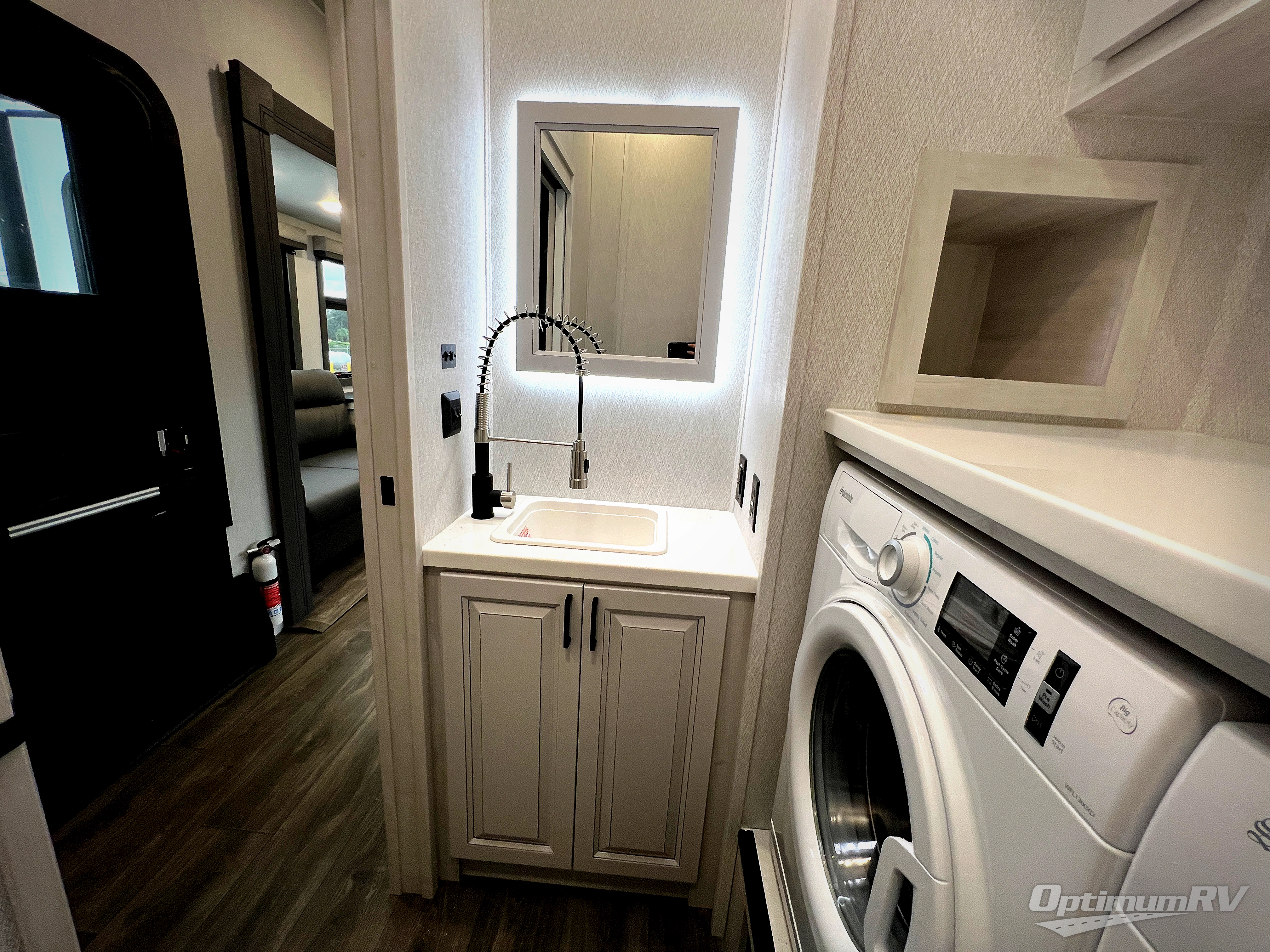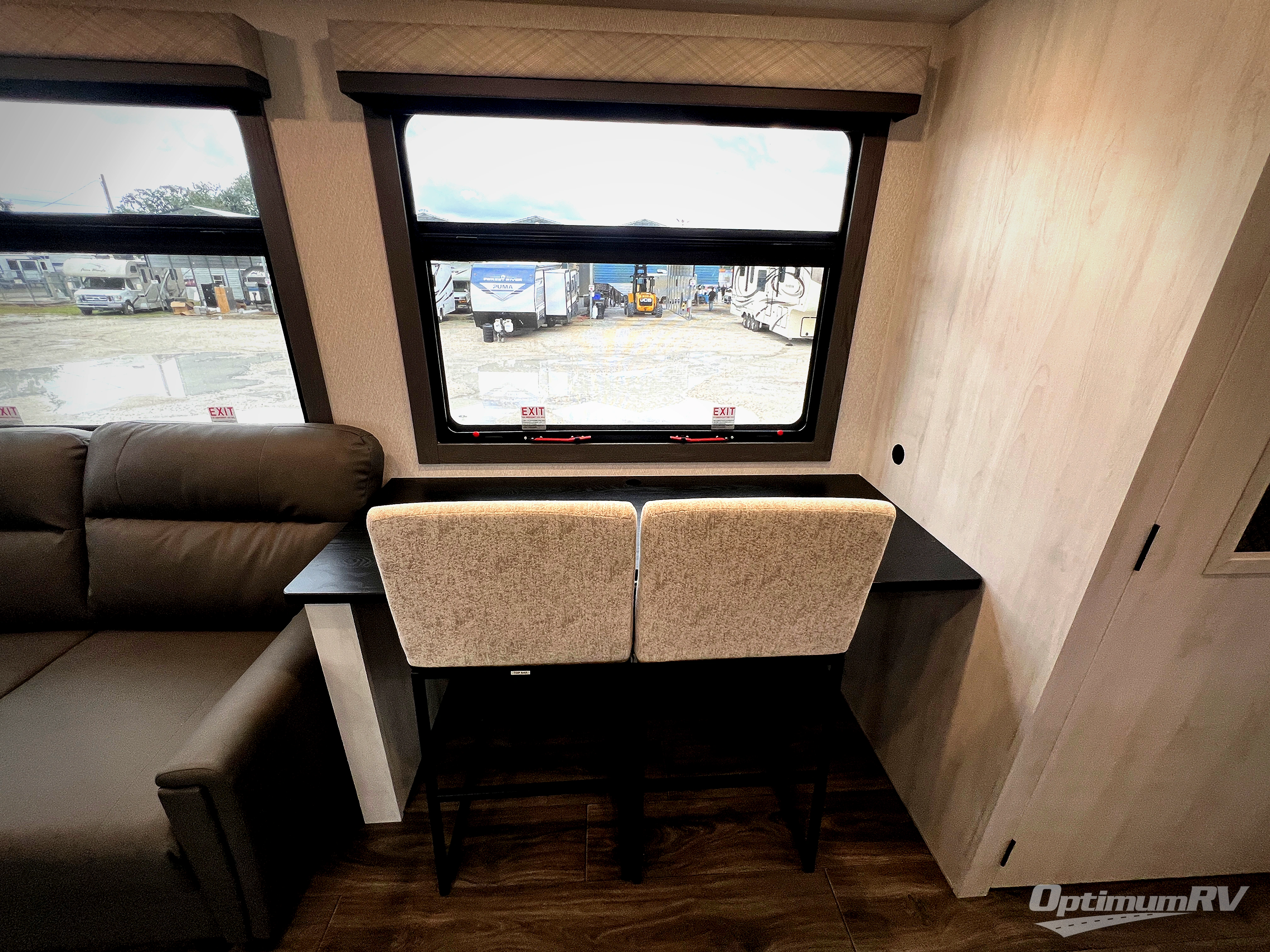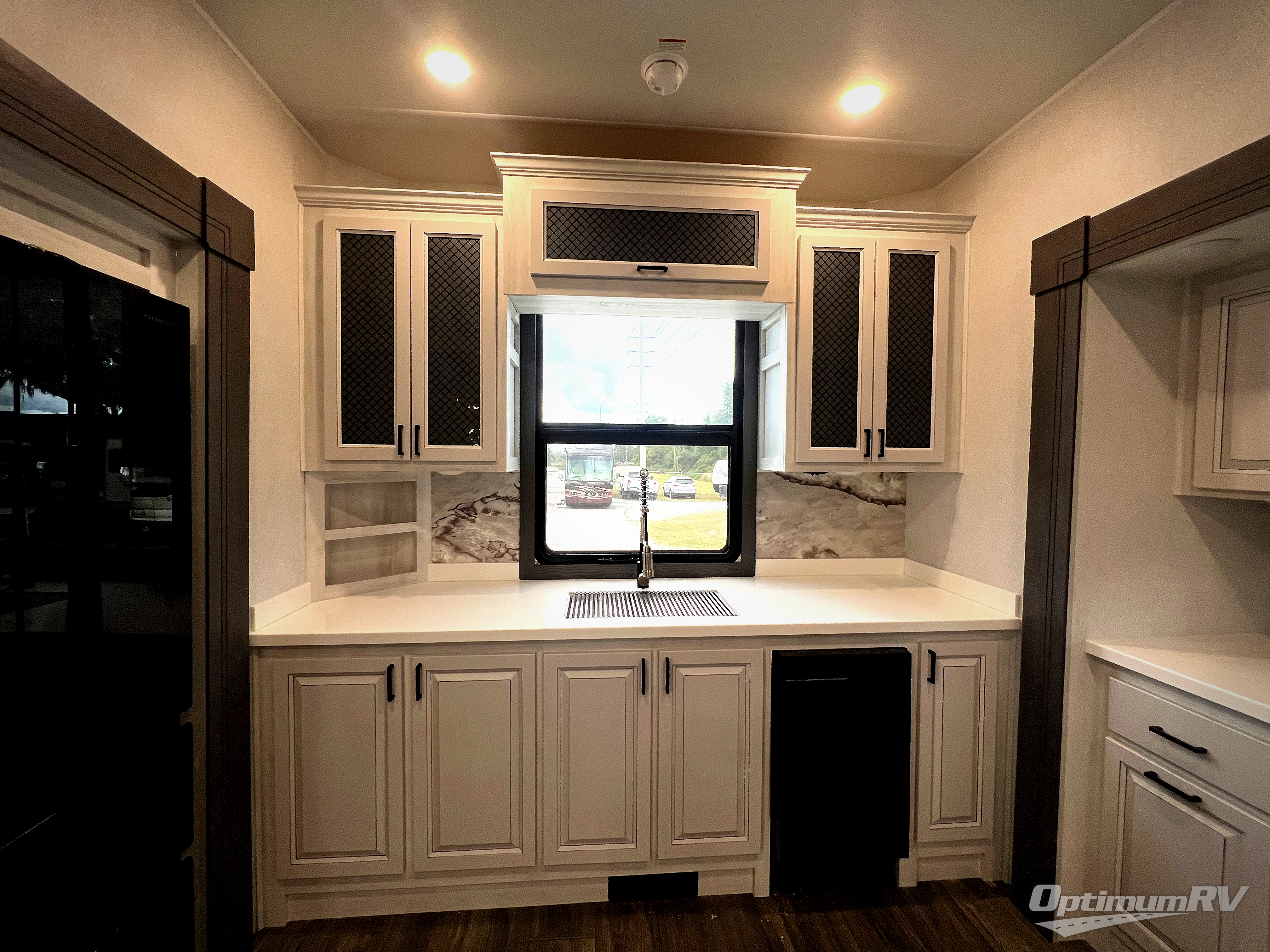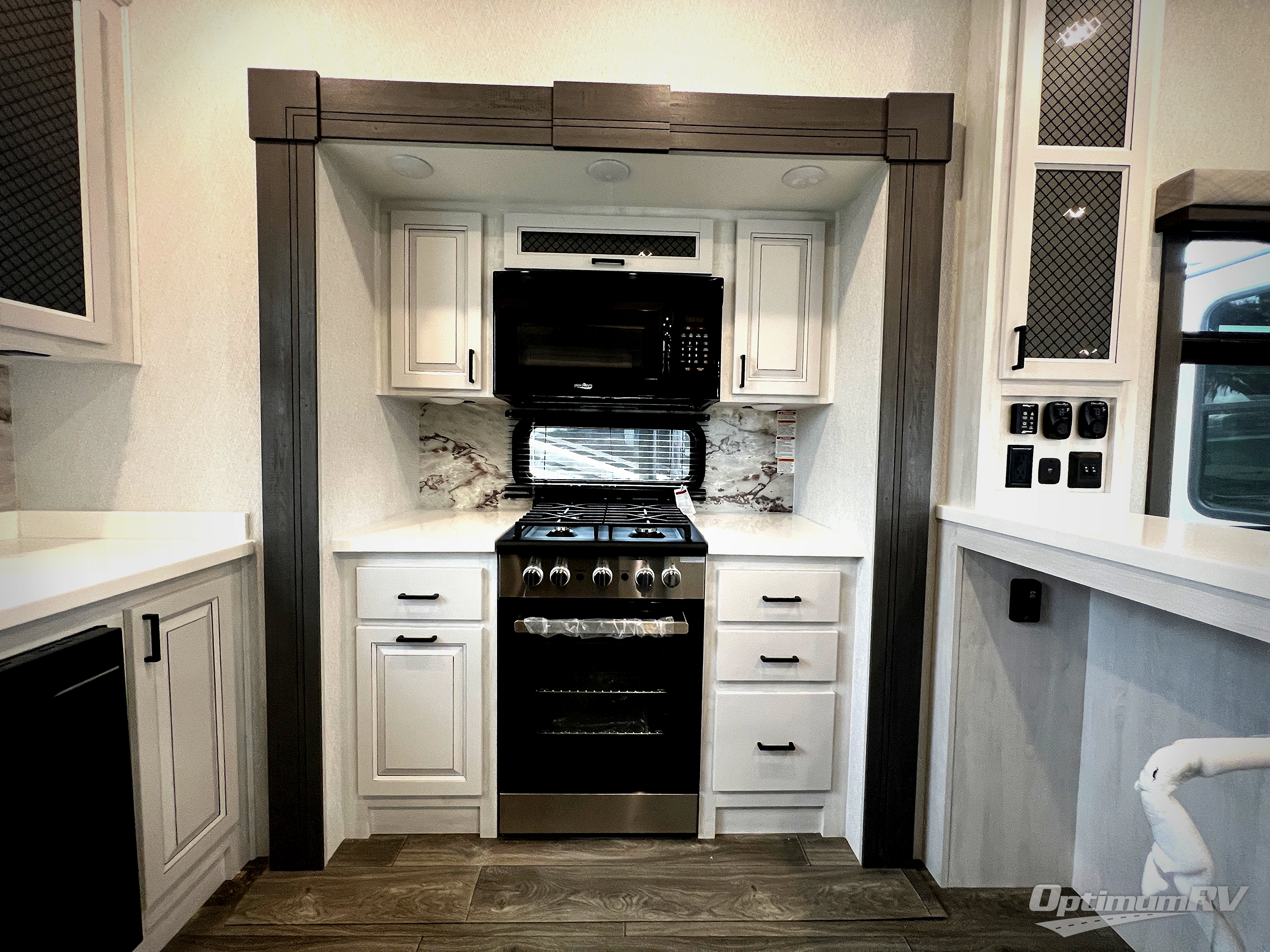 The spacious rear kitchen is equipped with a 30” microwave, 24” residential oven, overhead cabinets, breakfast bar with bar stools, walk-in pantry, and 16 cu. ft. refrigerator, perfect for cooking all your favorite dishes with the greatest convenience The living room is the heart of the home, featuring a desk with chairs, theater seating, two 60” trifold sofas, a TV with fireplace, and more. And when nature calls, you'll appreciate the convenient half bath with overhead cabinets and washer and dryer prep. The main bedroom is a serene retreat, featuring a king bed, drawers under the bed, a bedroom fireplace, and more. This is the perfect place to relax and recharge after a long day of adventure, and with a front full bathroom featuring a 30” x 40” shower, dual sink vanity, walk-in closet, dresser/drawers, you'll have everything you need to stay clean and comfortable on the go. Outside, you'll find not one, but two awnings to providing plenty of shade and protection from the elements.