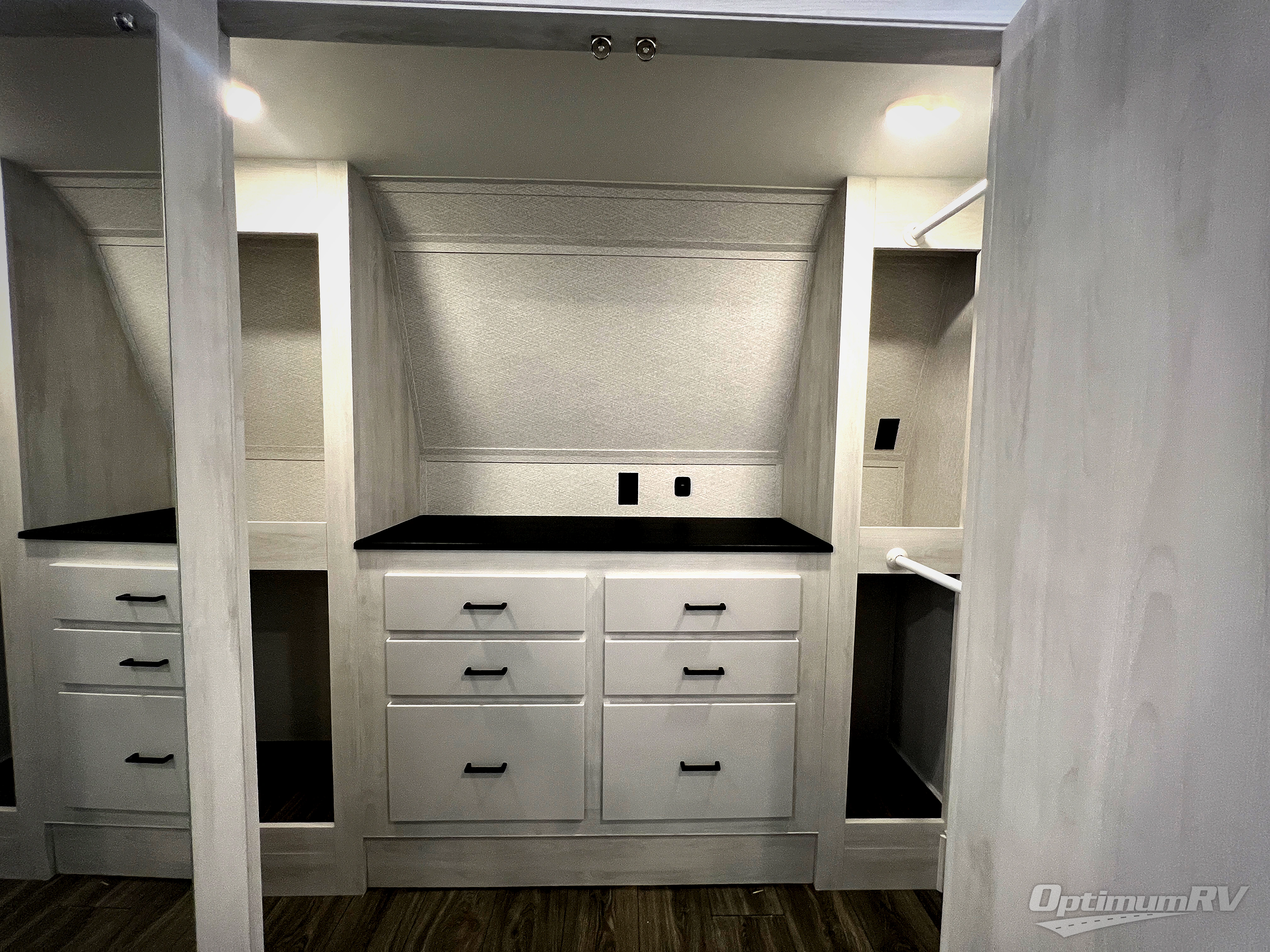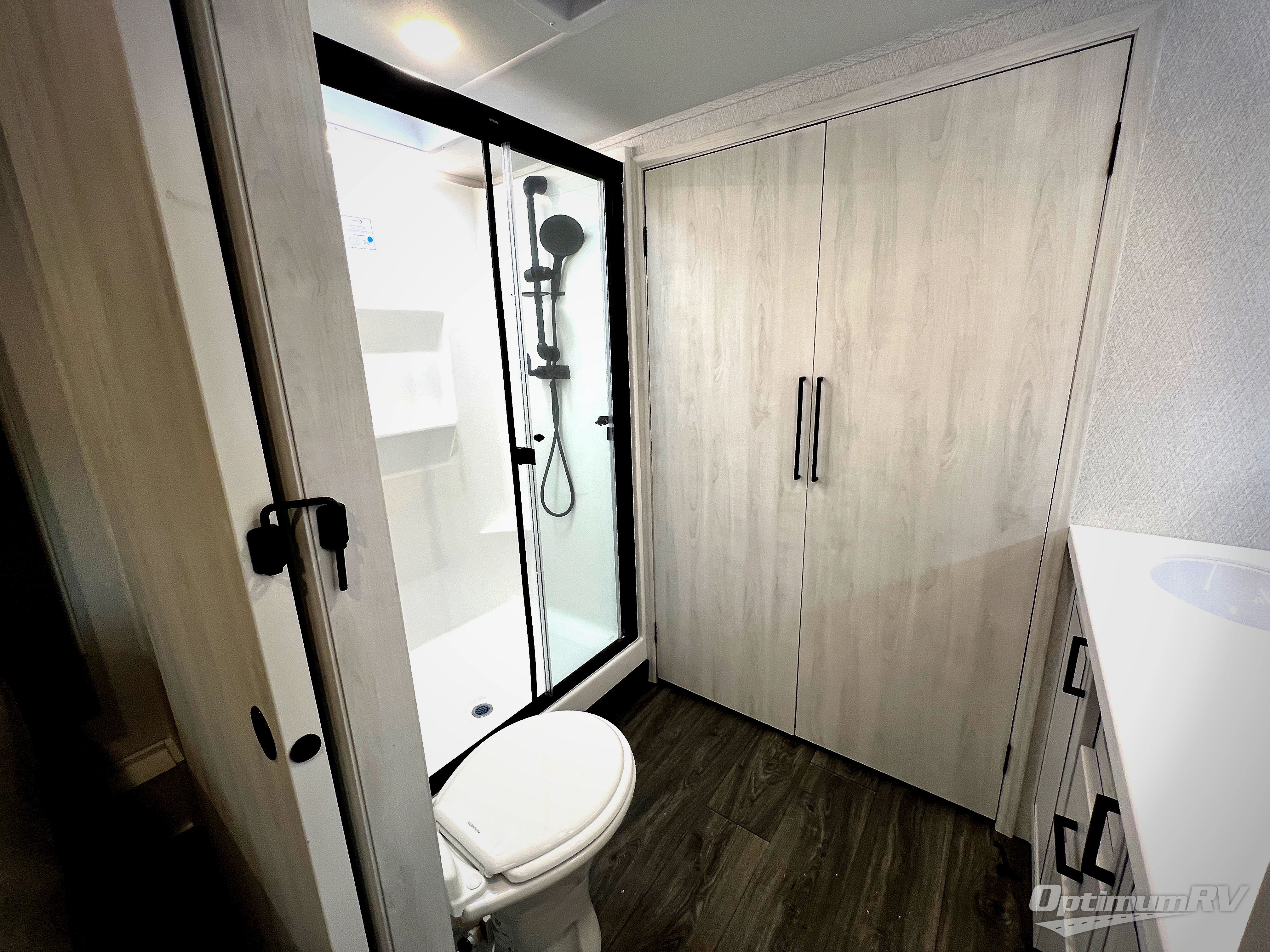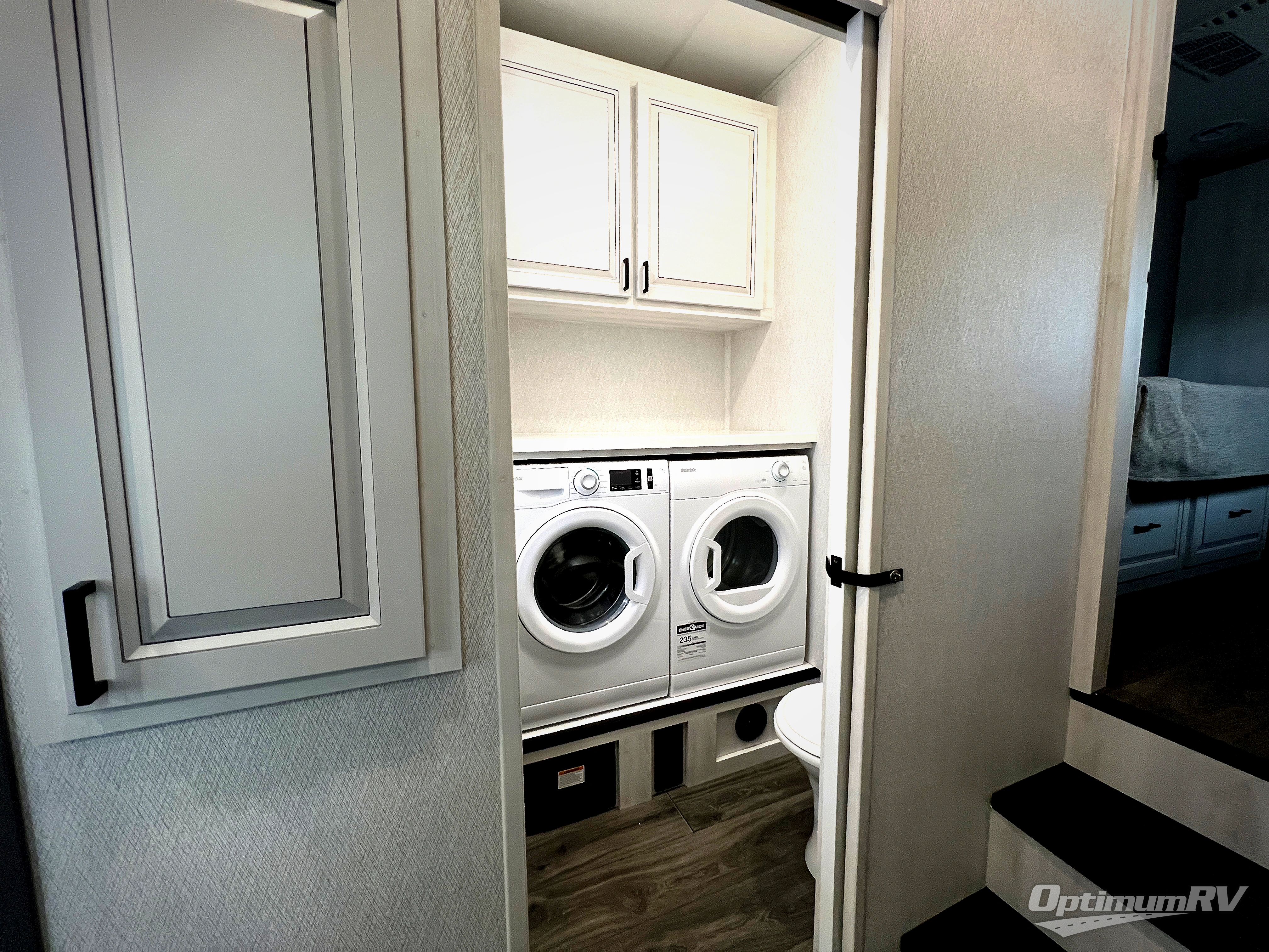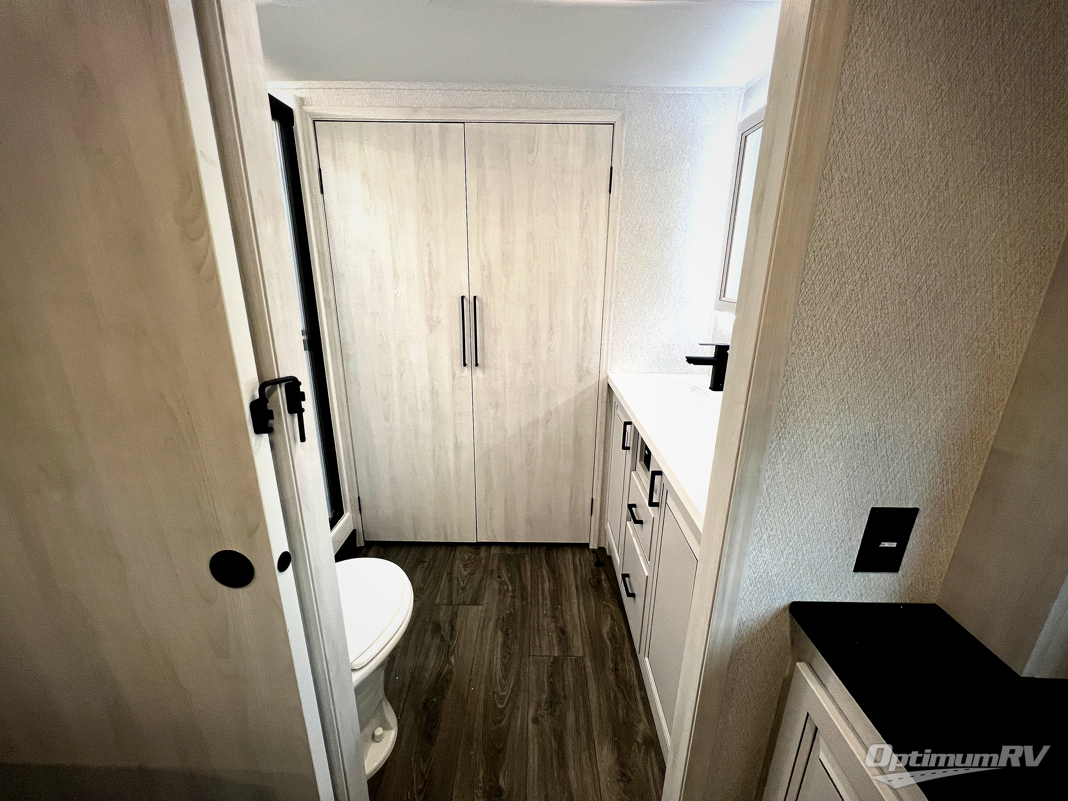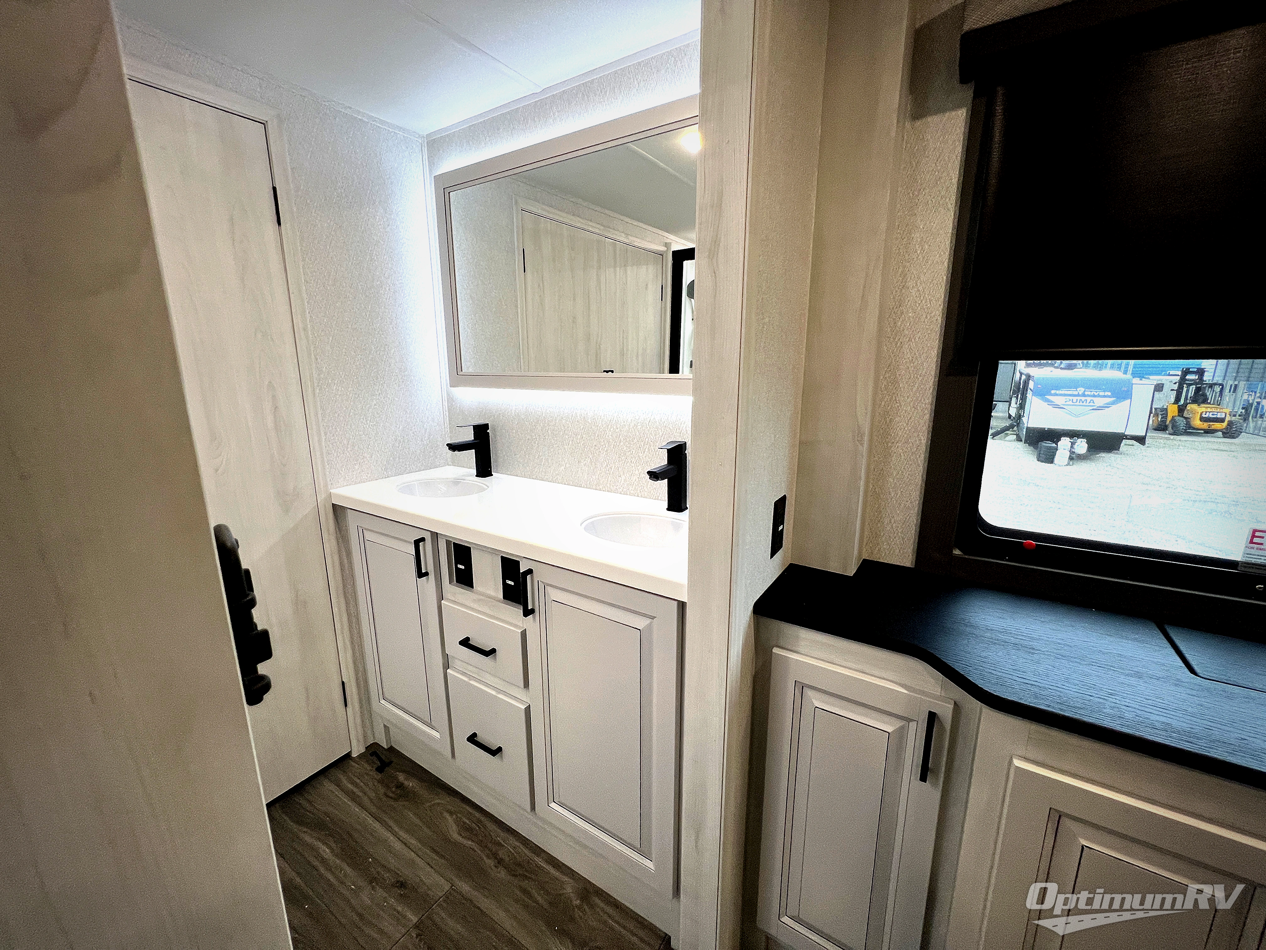The spacious rear kitchen is equipped with a 30” microwave, 24” residential oven, overhead cabinets, breakfast bar with bar stools, walk-in pantry, and 16 cu. ft. refrigerator, perfect for cooking all your favorite dishes with the greatest convenience The living room is the heart of the home, featuring a desk with chairs, theater seating, two 60” trifold sofas, a TV with fireplace, and more. And when nature calls, you'll appreciate the convenient half bath with overhead cabinets and washer and dryer prep. The main bedroom is a serene retreat, featuring a king bed, drawers under the bed, a bedroom fireplace, and more. This is the perfect place to relax and recharge after a long day of adventure, and with a front full bathroom featuring a 30” x 40” shower, dual sink vanity, walk-in closet, dresser/drawers, you'll have everything you need to stay clean and comfortable on the go. Outside, you'll find not one, but two awnings to providing plenty of shade and protection from the elements.