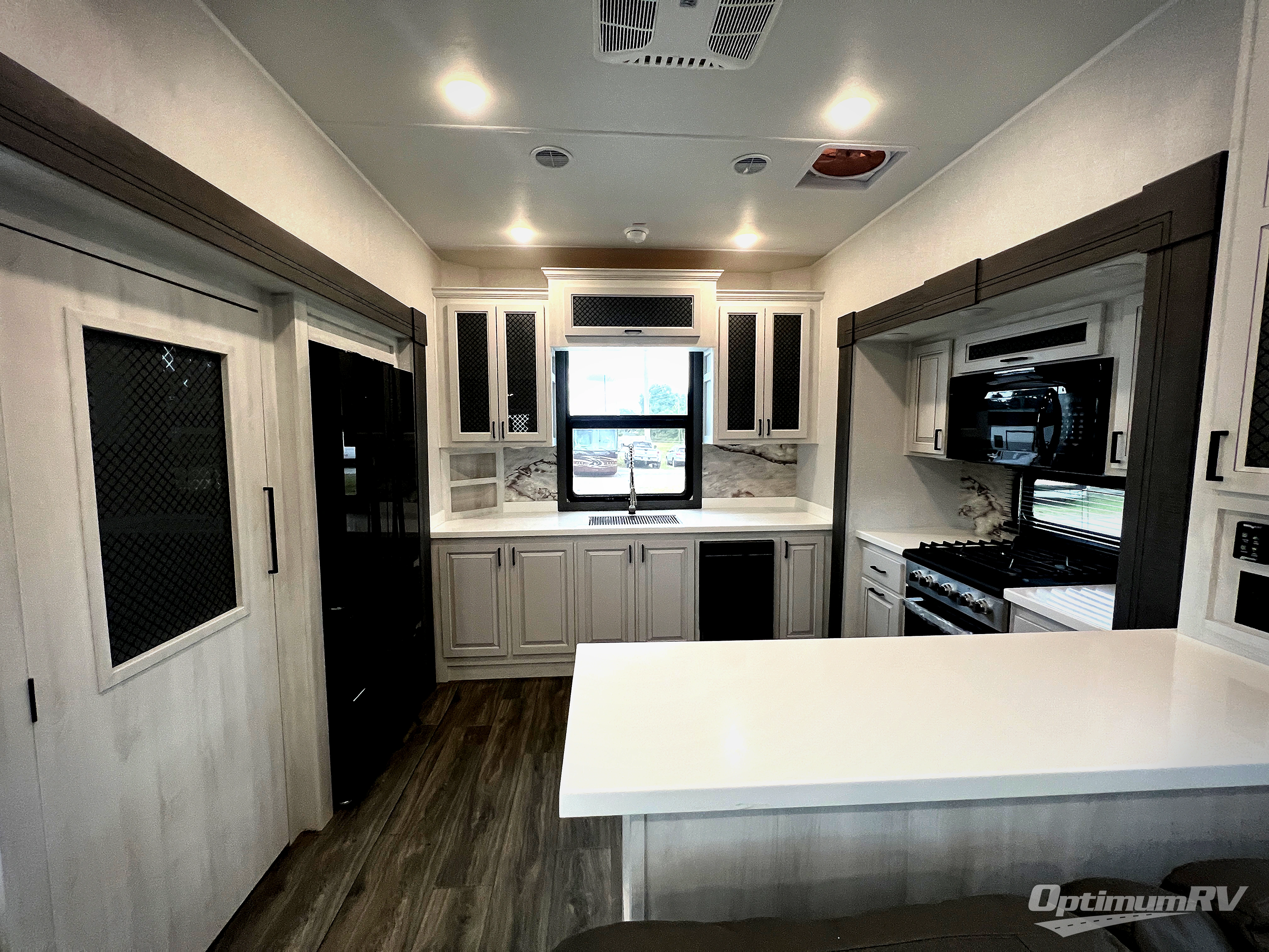 There is just too much luxury to name on the EAST TO WEST Ahara fifth wheel! These units are quite impressive, and once you see them, you'll know what we mean. The Ahara first grabs your attention with its fully painted aerodynamic fiberglass front cap, 102" wide-body chassis, and deep tint square frameless windows. For towing, you'll find a MORryde CRE 3000 suspension, LED marker lights, LED taillights with back-up lights, and rear view camera prep. Traveling in different climates is also made easy with the high-efficiency triple A/C system, 40,000 BTU high-capacity furnace, plus heated, insulated, and enclosed underbelly found within the Climate Package. Head inside to enjoy Slow Rise roller shades, a flush floor kitchen slide to help prevent trips, and solid surface countertops in the kitchen and bath to name a few luxuries!