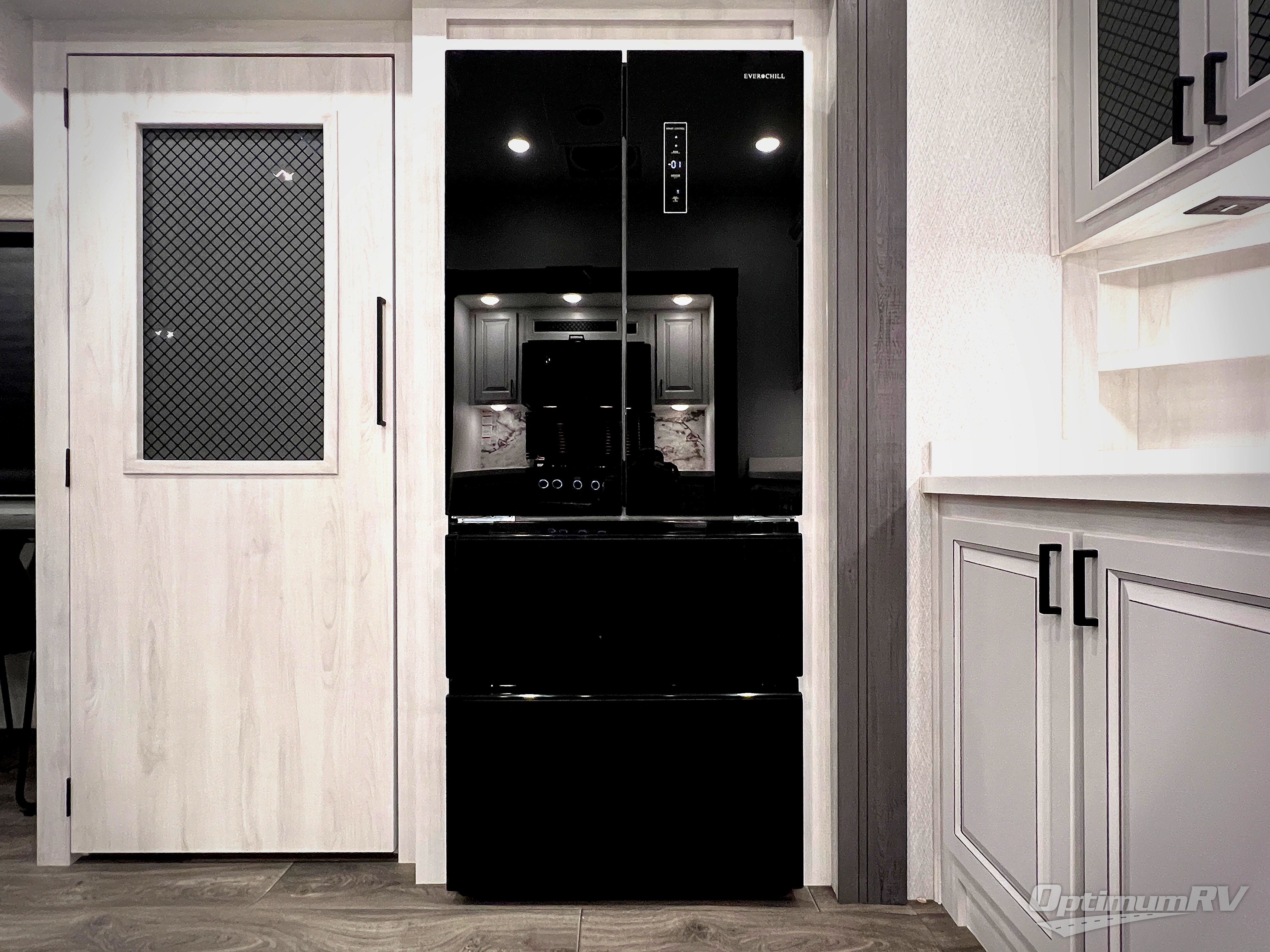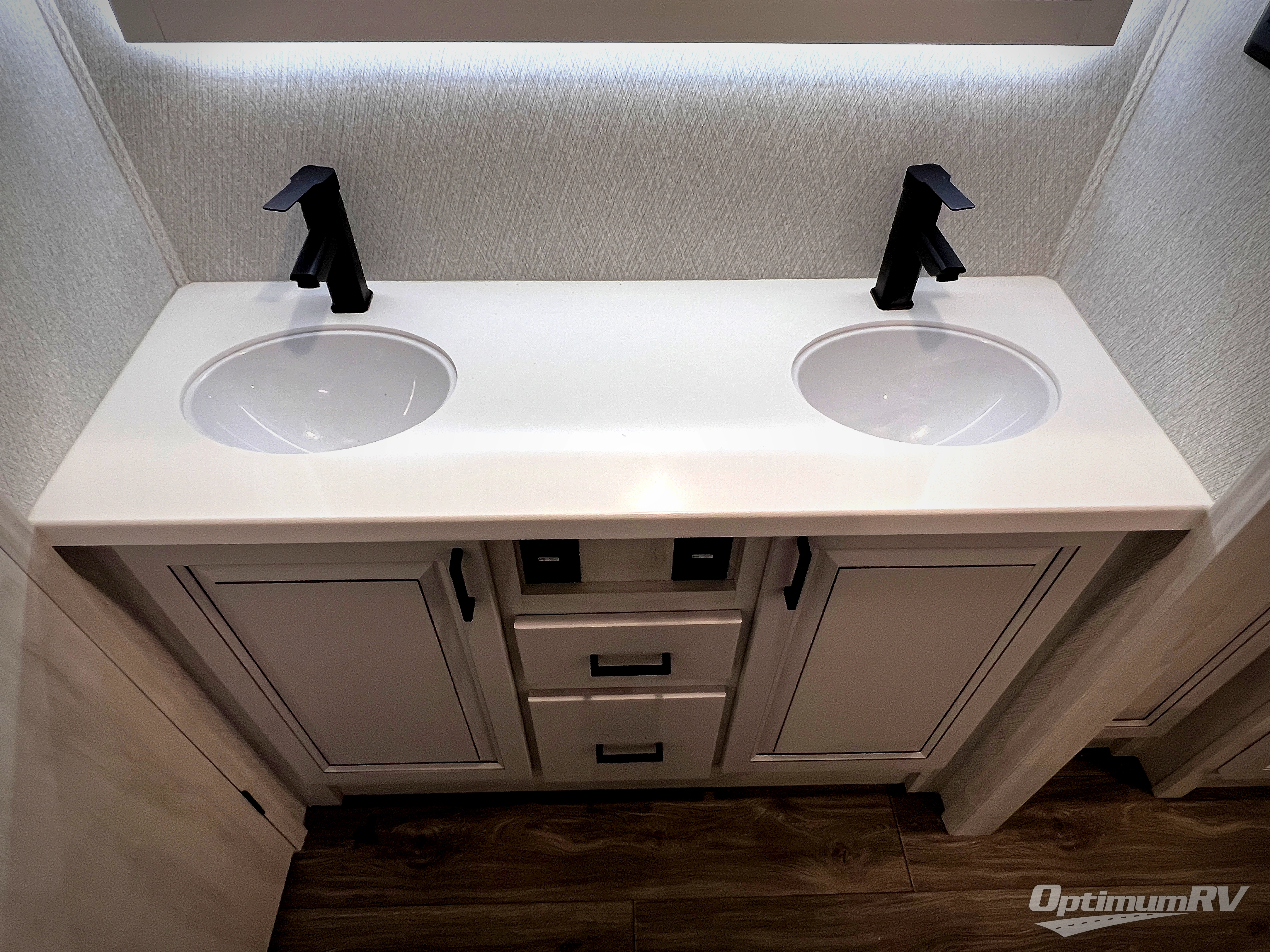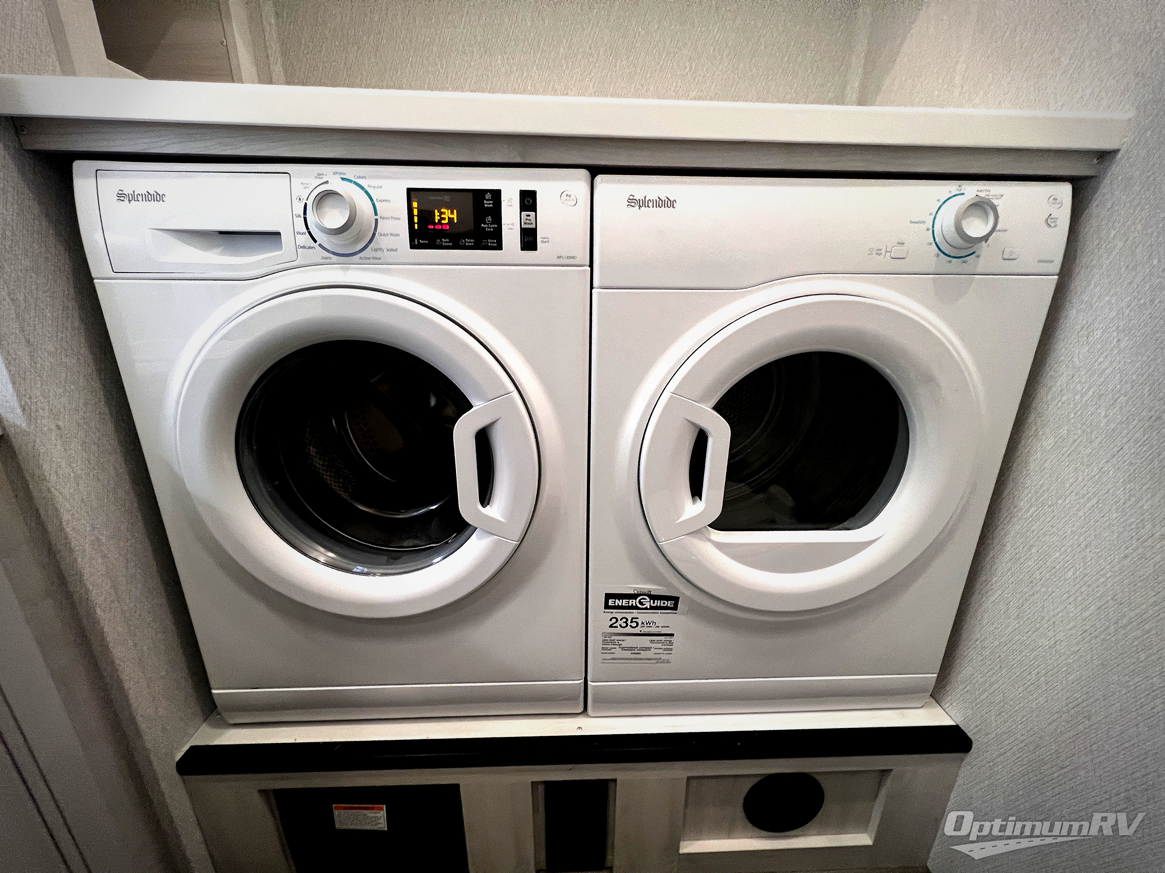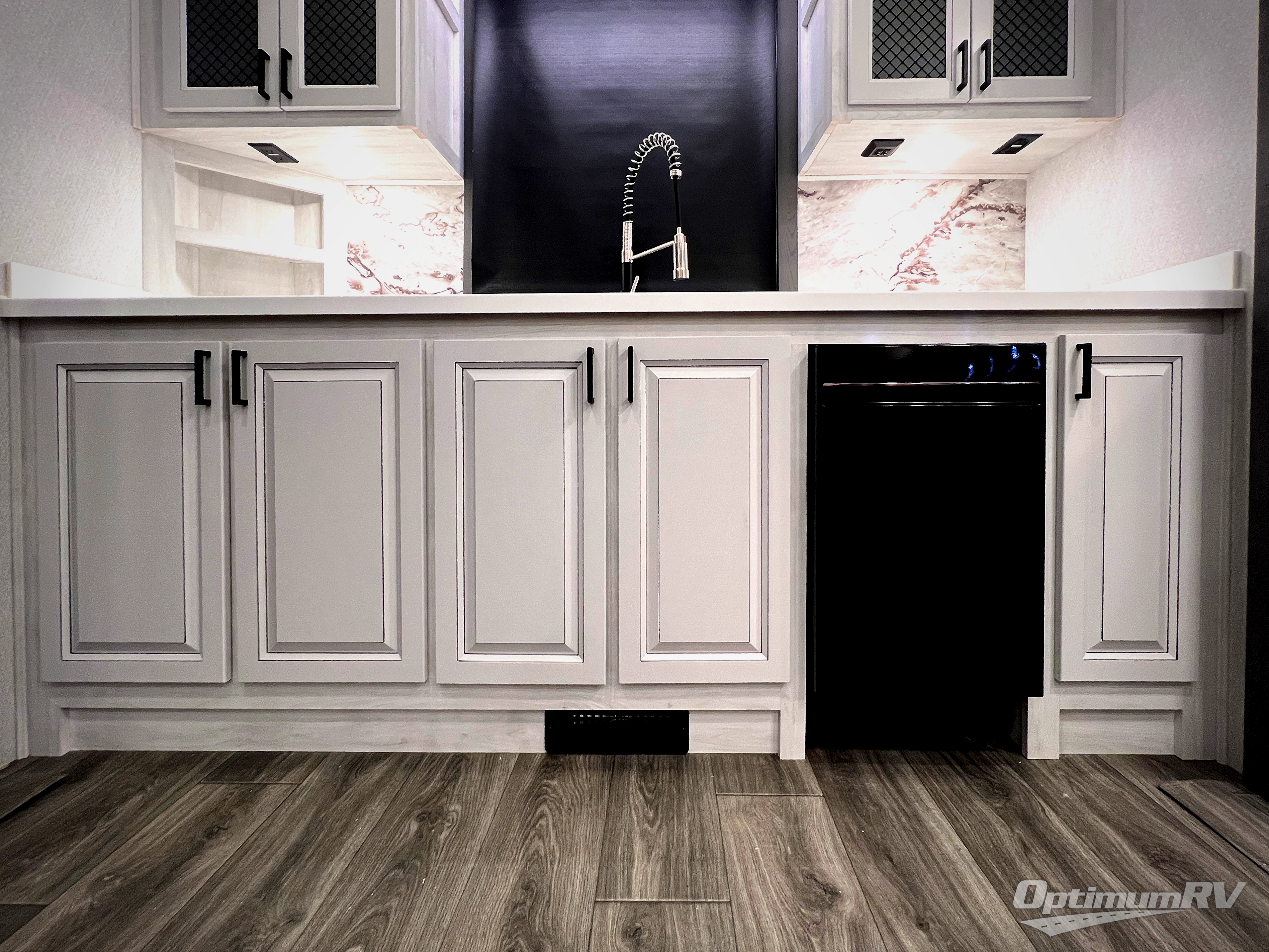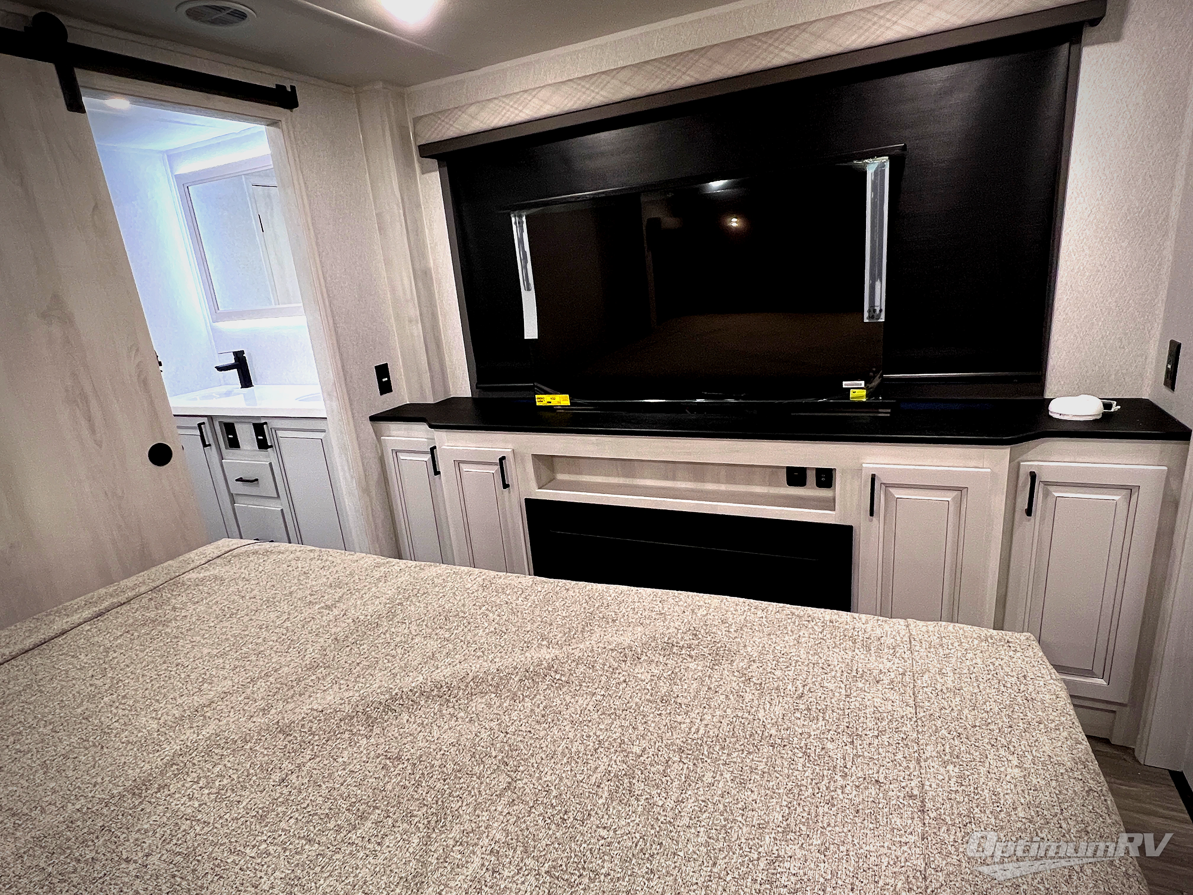 The spacious rear kitchen is equipped with a 30” microwave, 24” residential oven, overhead cabinets, breakfast bar with bar stools, walk-in pantry, and 16 cu. ft. refrigerator, perfect for cooking all your favorite dishes with the greatest convenience The living room is the heart of the home, featuring a desk with chairs, theater seating, two 60” trifold sofas, a TV with fireplace, and more. And when nature calls, you'll appreciate the convenient half bath with overhead cabinets and washer and dryer prep. The main bedroom is a serene retreat, featuring a king bed, drawers under the bed, a bedroom fireplace, and more. This is the perfect place to relax and recharge after a long day of adventure, and with a front full bathroom featuring a 30” x 40” shower, dual sink vanity, walk-in closet, dresser/drawers, you'll have everything you need to stay clean and comfortable on the go. Outside, you'll find not one, but two awnings to providing plenty of shade and protection from the elements.