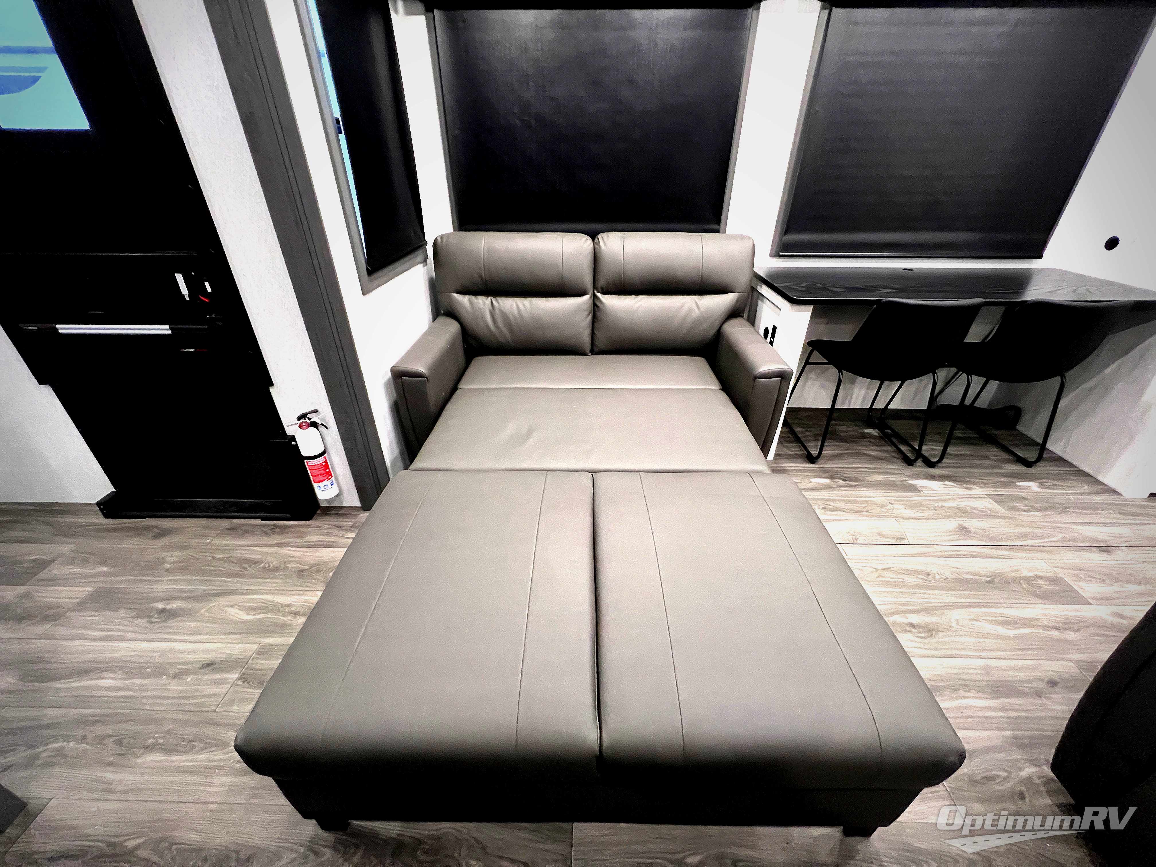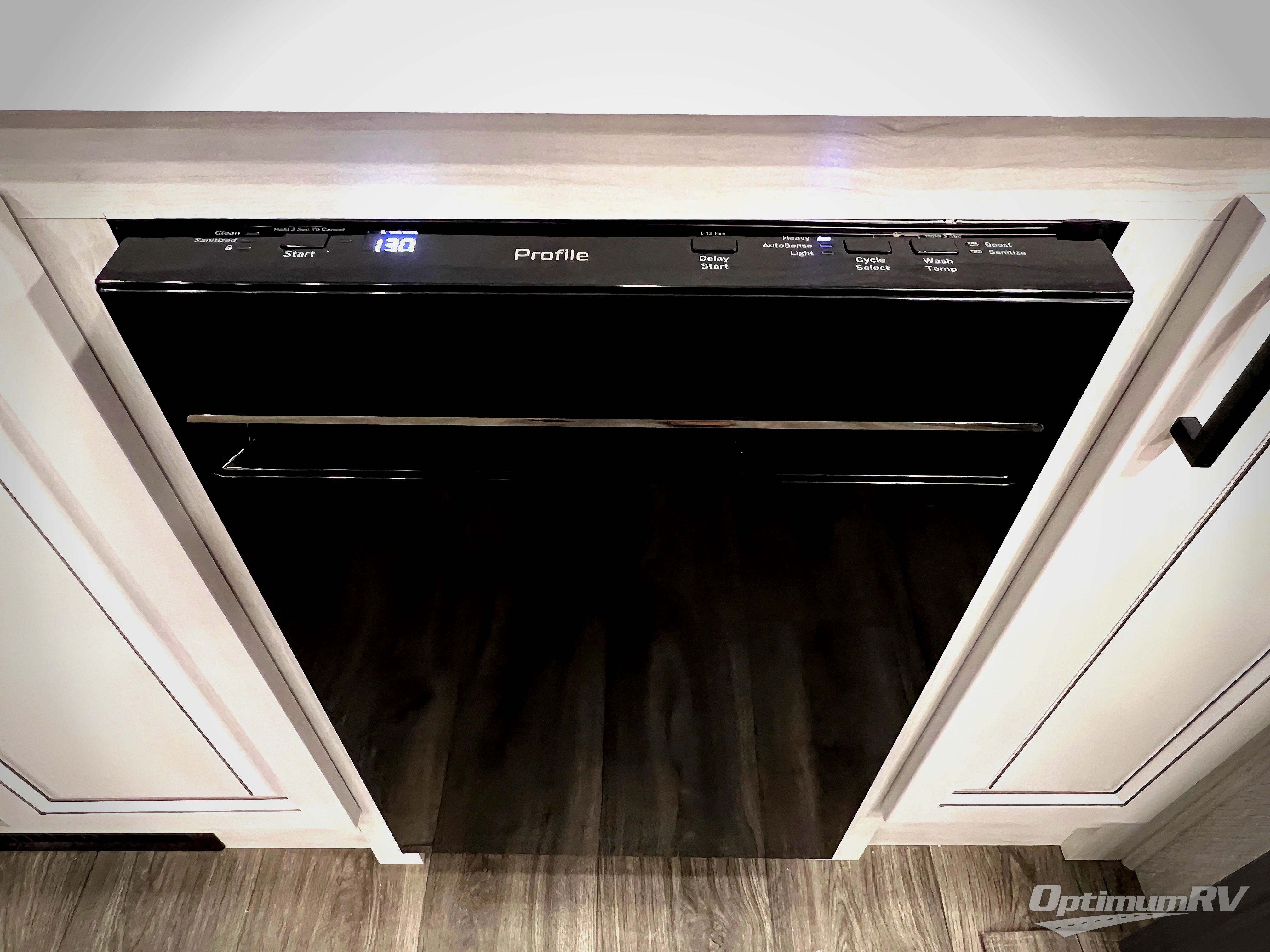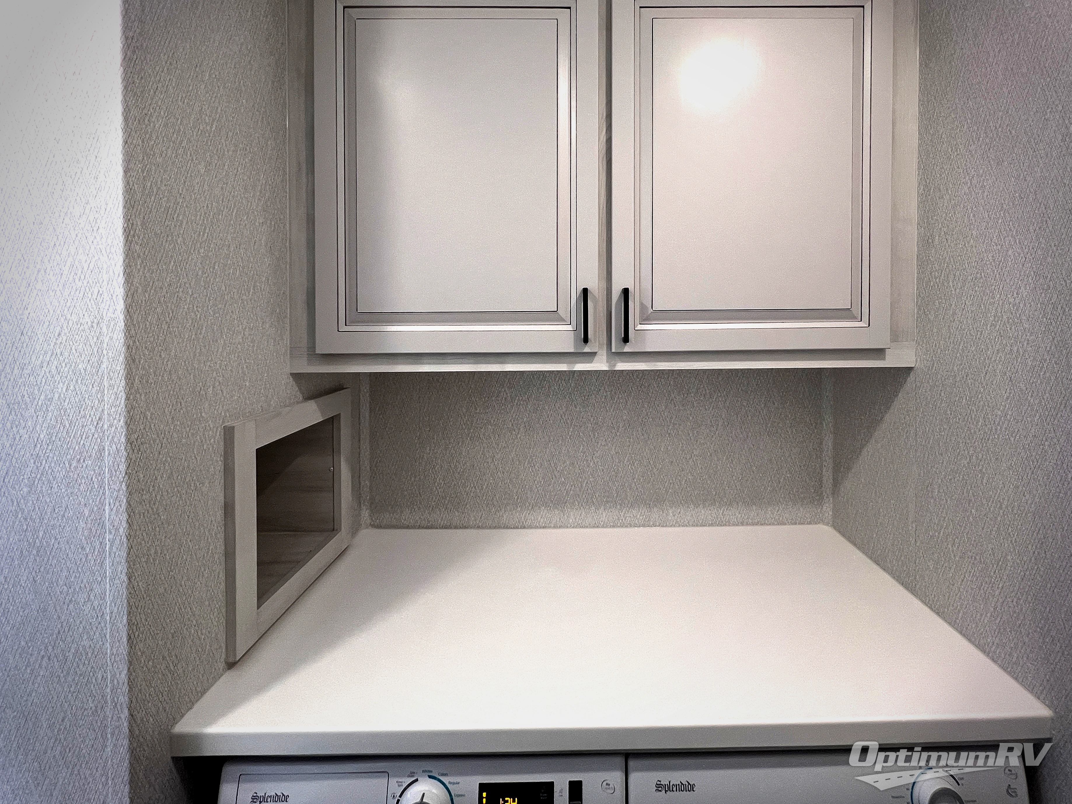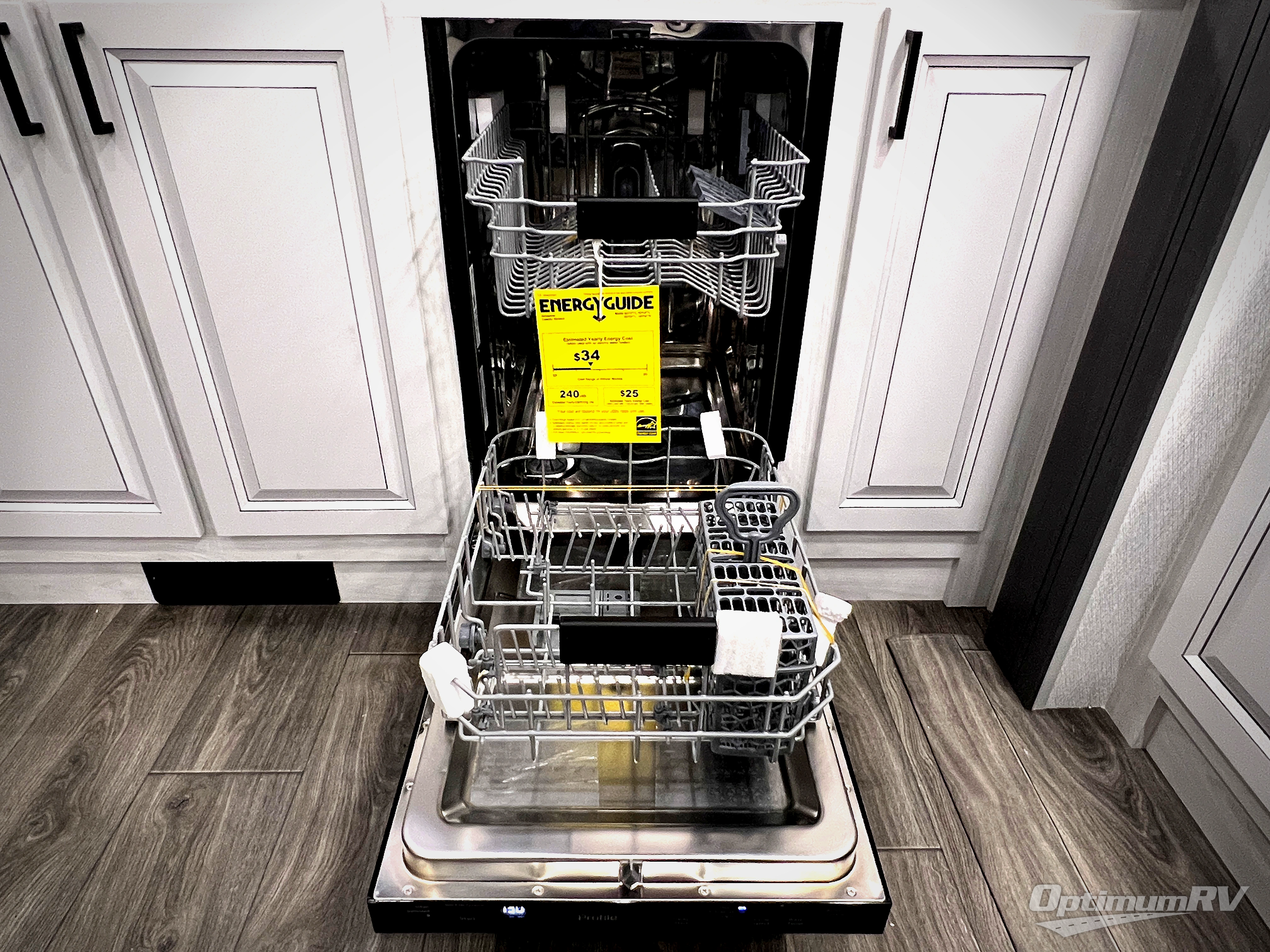 The spacious rear kitchen is equipped with a 30” microwave, 24” residential oven, overhead cabinets, breakfast bar with bar stools, walk-in pantry, and 16 cu. ft. refrigerator, perfect for cooking all your favorite dishes with the greatest convenience The living room is the heart of the home, featuring a desk with chairs, theater seating, two 60” trifold sofas, a TV with fireplace, and more. And when nature calls, you'll appreciate the convenient half bath with overhead cabinets and washer and dryer prep. The main bedroom is a serene retreat, featuring a king bed, drawers under the bed, a bedroom fireplace, and more. This is the perfect place to relax and recharge after a long day of adventure, and with a front full bathroom featuring a 30” x 40” shower, dual sink vanity, walk-in closet, dresser/drawers, you'll have everything you need to stay clean and comfortable on the go. Outside, you'll find not one, but two awnings to providing plenty of shade and protection from the elements.