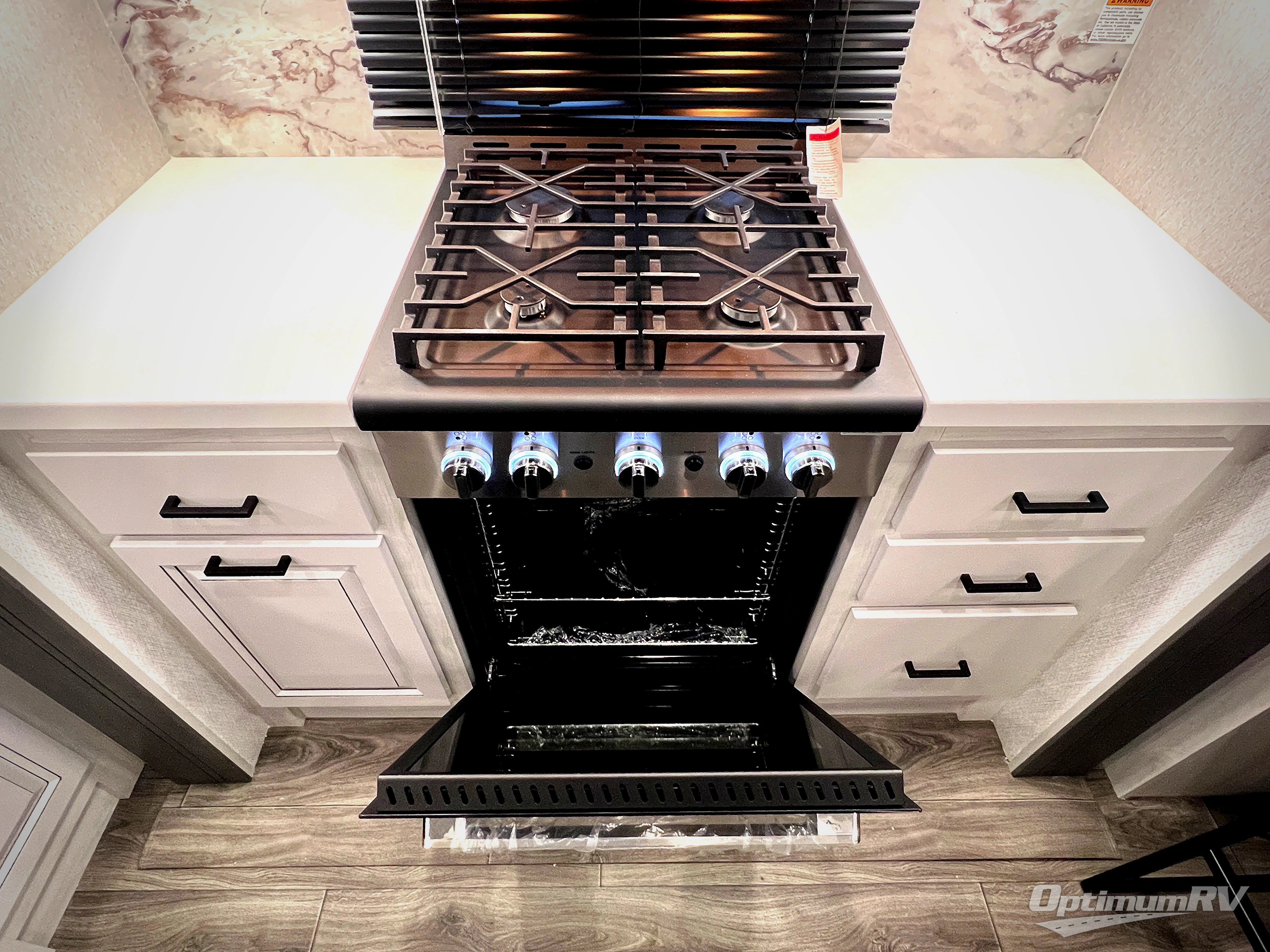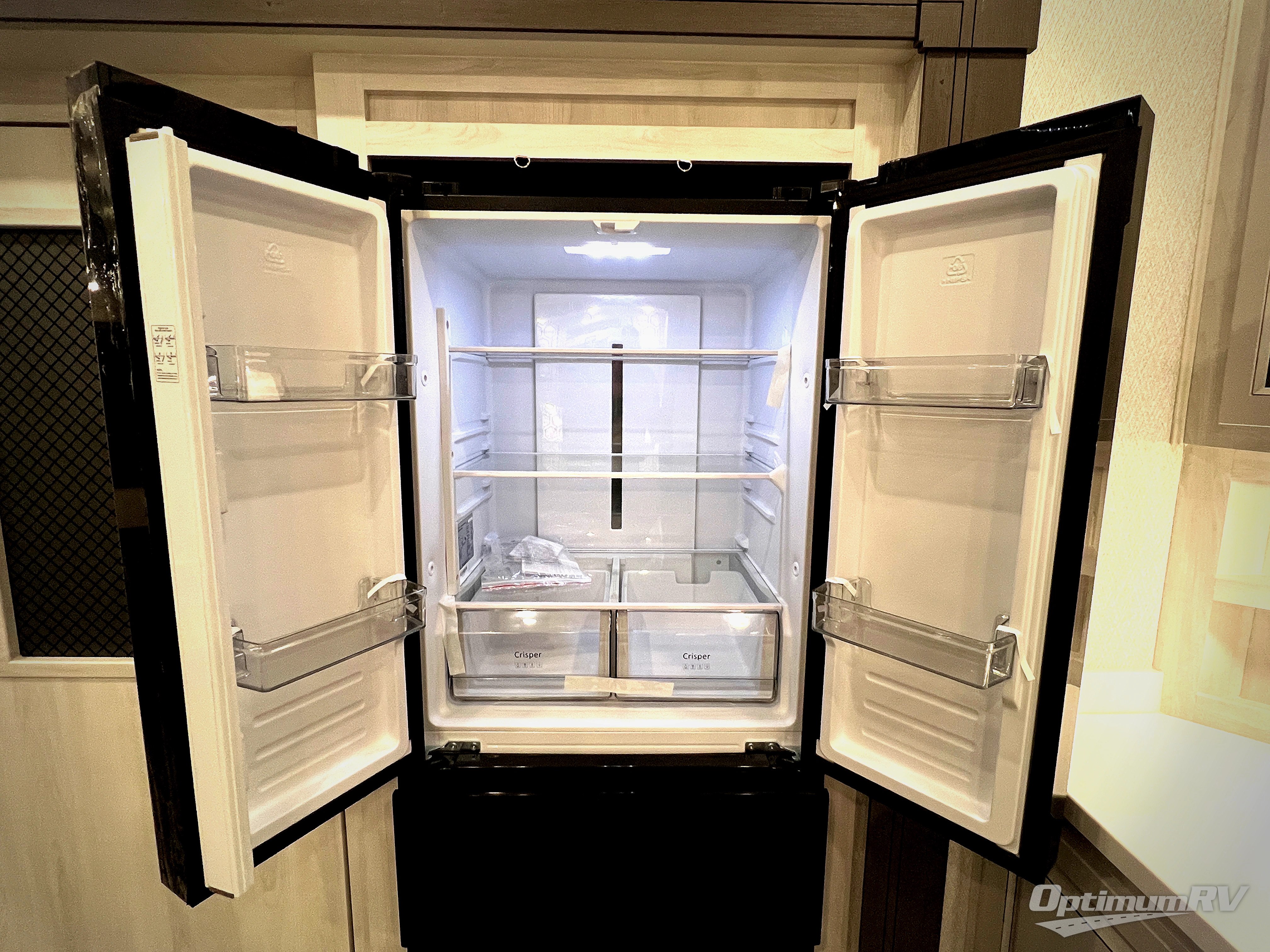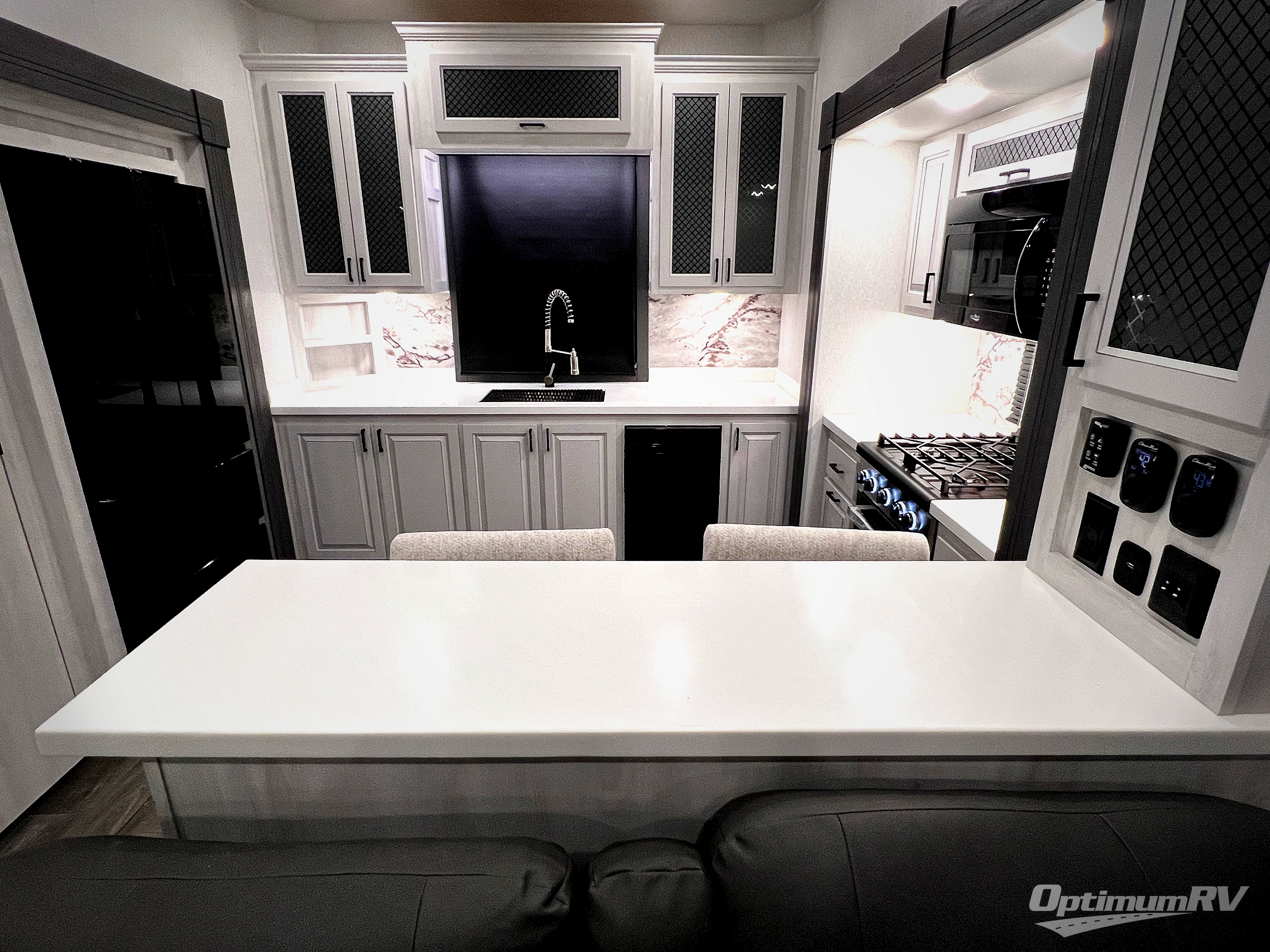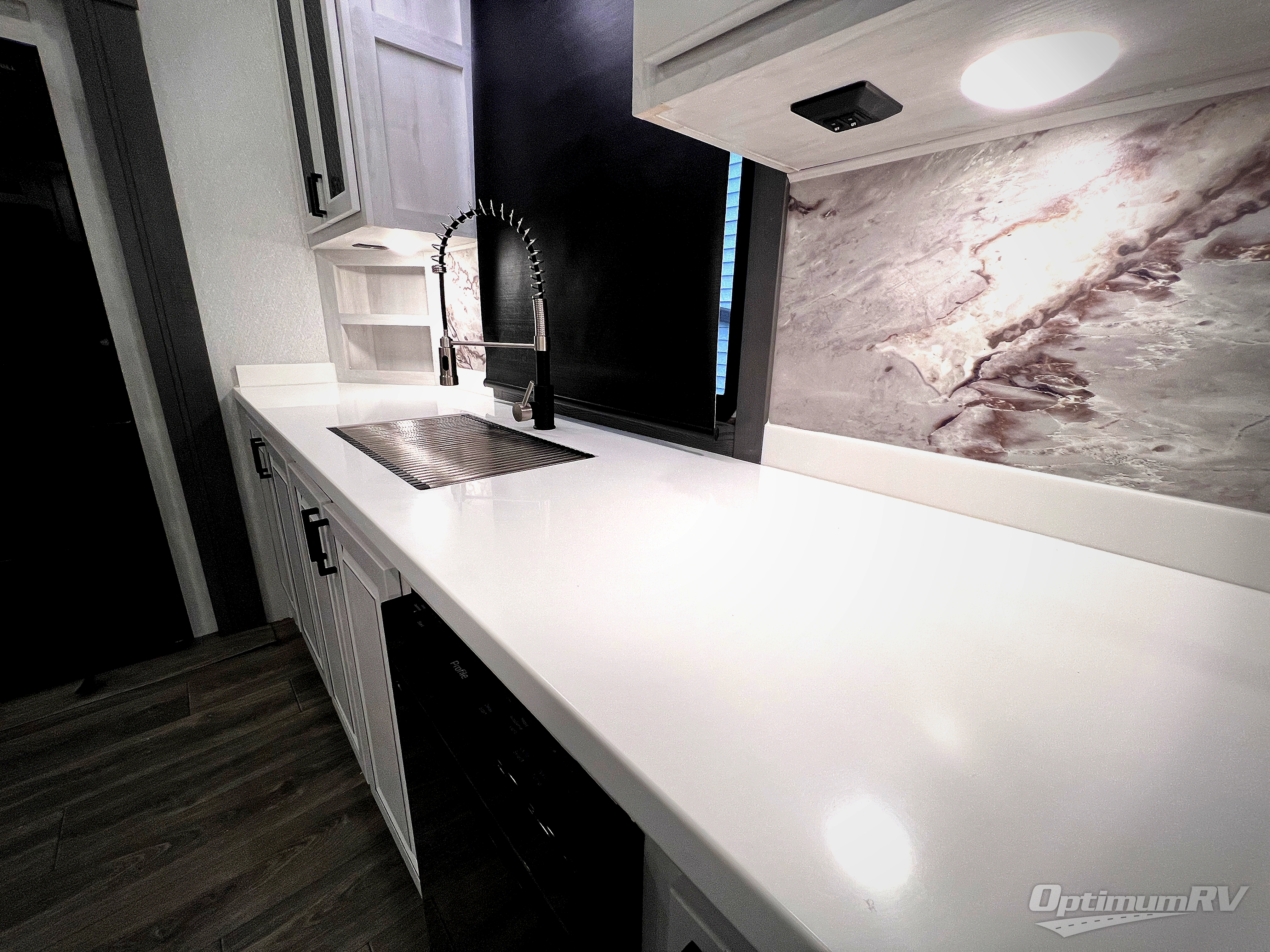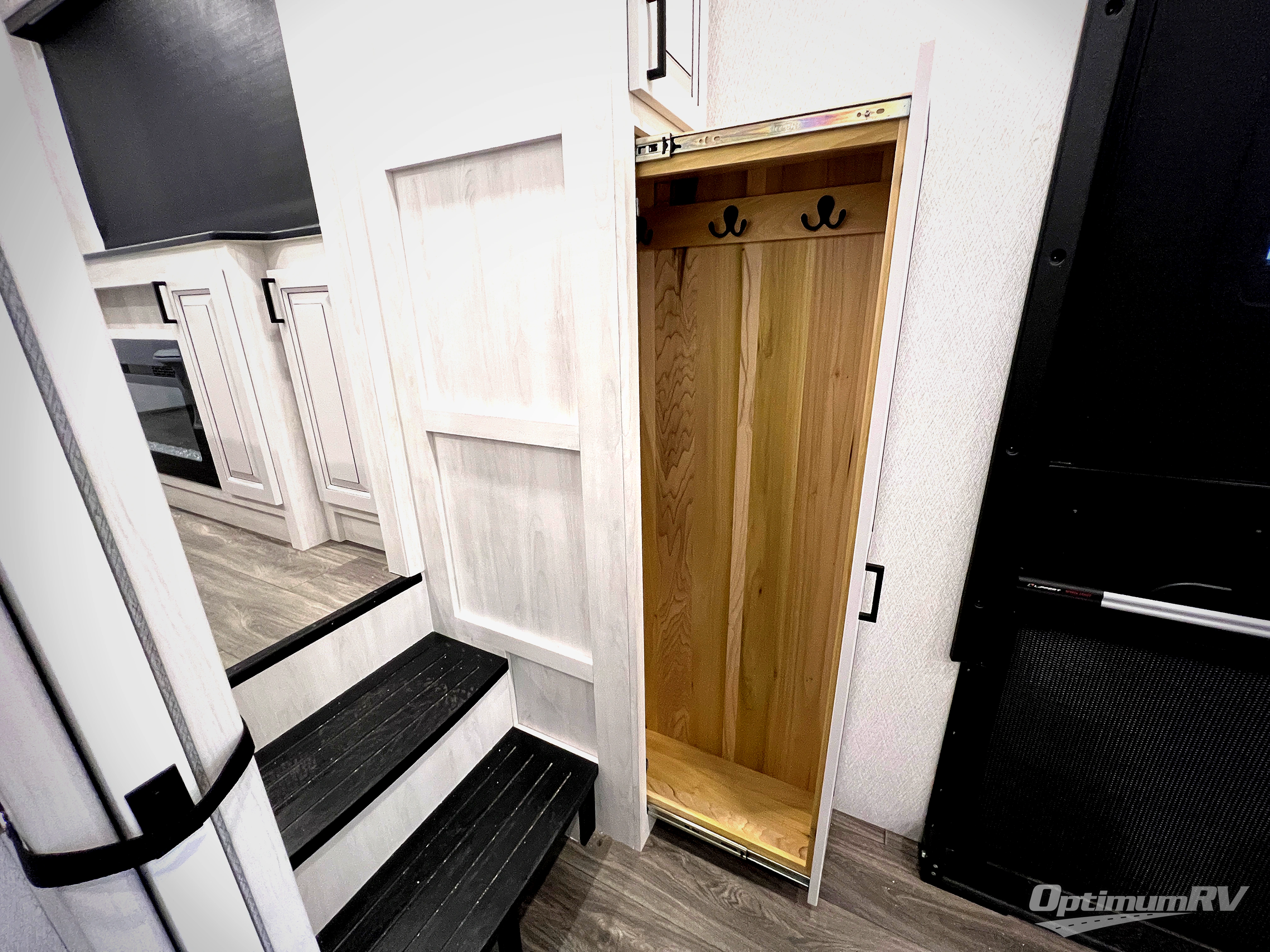 The spacious rear kitchen is equipped with a 30” microwave, 24” residential oven, overhead cabinets, breakfast bar with bar stools, walk-in pantry, and 16 cu. ft. refrigerator, perfect for cooking all your favorite dishes with the greatest convenience The living room is the heart of the home, featuring a desk with chairs, theater seating, two 60” trifold sofas, a TV with fireplace, and more. And when nature calls, you'll appreciate the convenient half bath with overhead cabinets and washer and dryer prep. The main bedroom is a serene retreat, featuring a king bed, drawers under the bed, a bedroom fireplace, and more. This is the perfect place to relax and recharge after a long day of adventure, and with a front full bathroom featuring a 30” x 40” shower, dual sink vanity, walk-in closet, dresser/drawers, you'll have everything you need to stay clean and comfortable on the go. Outside, you'll find not one, but two awnings to providing plenty of shade and protection from the elements.