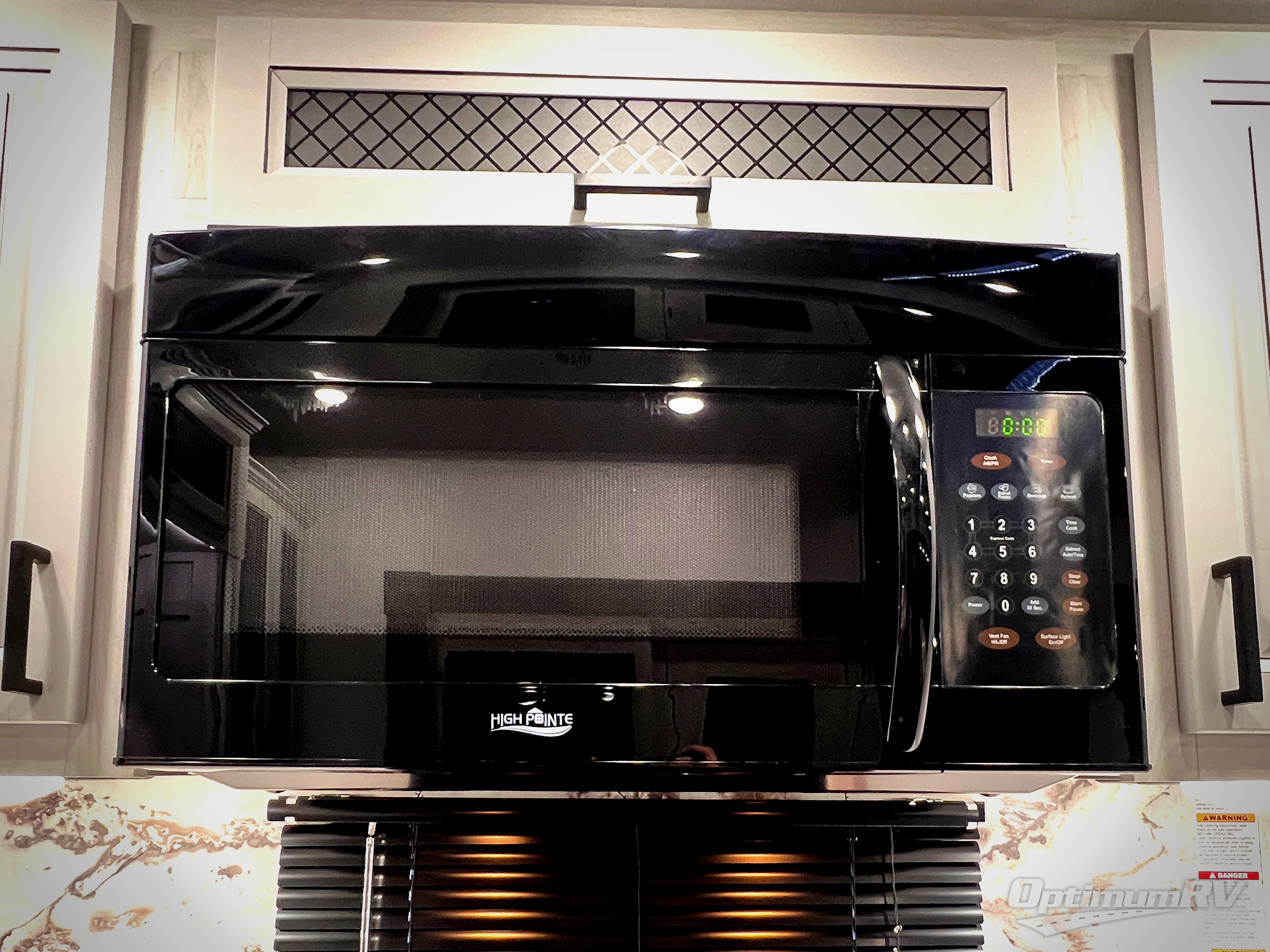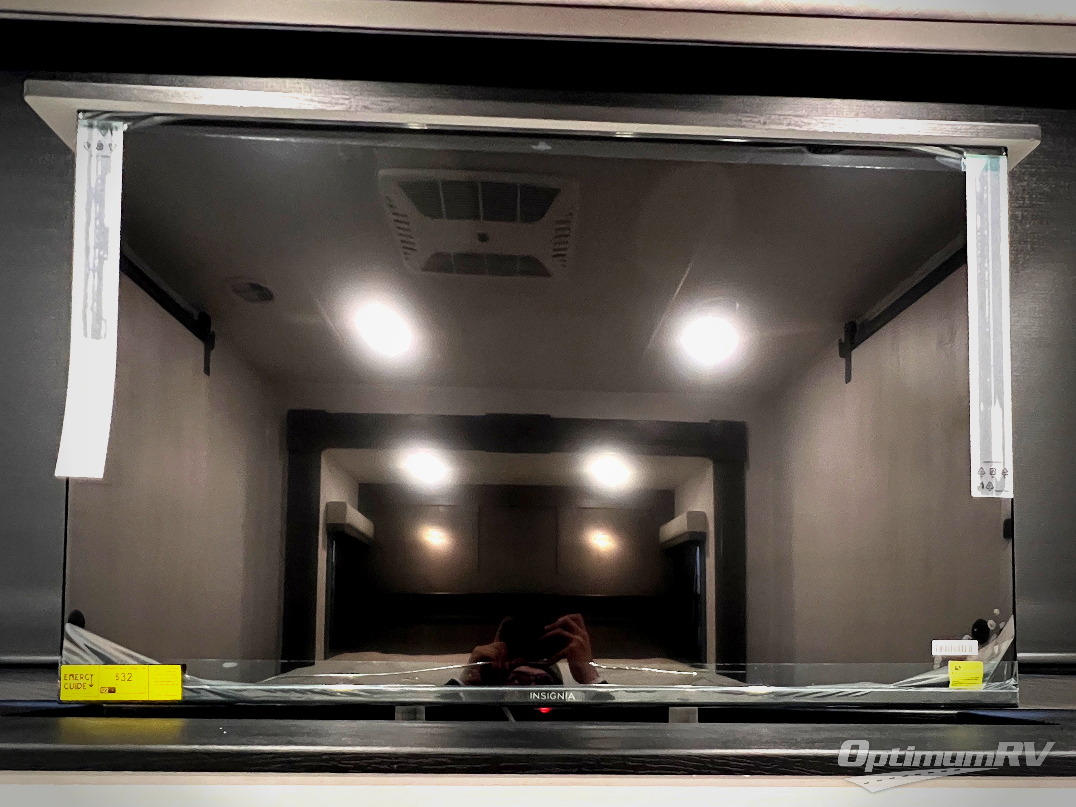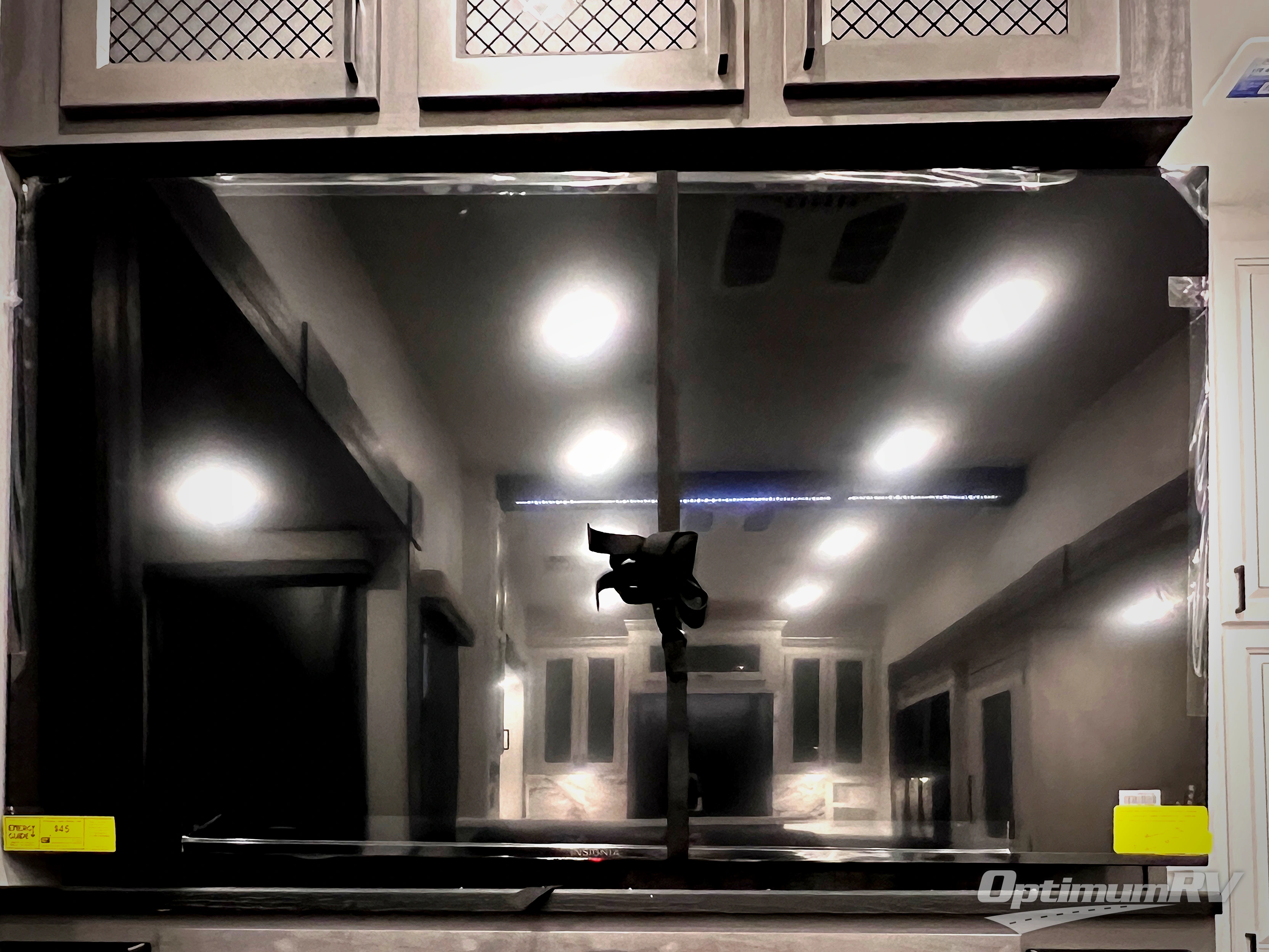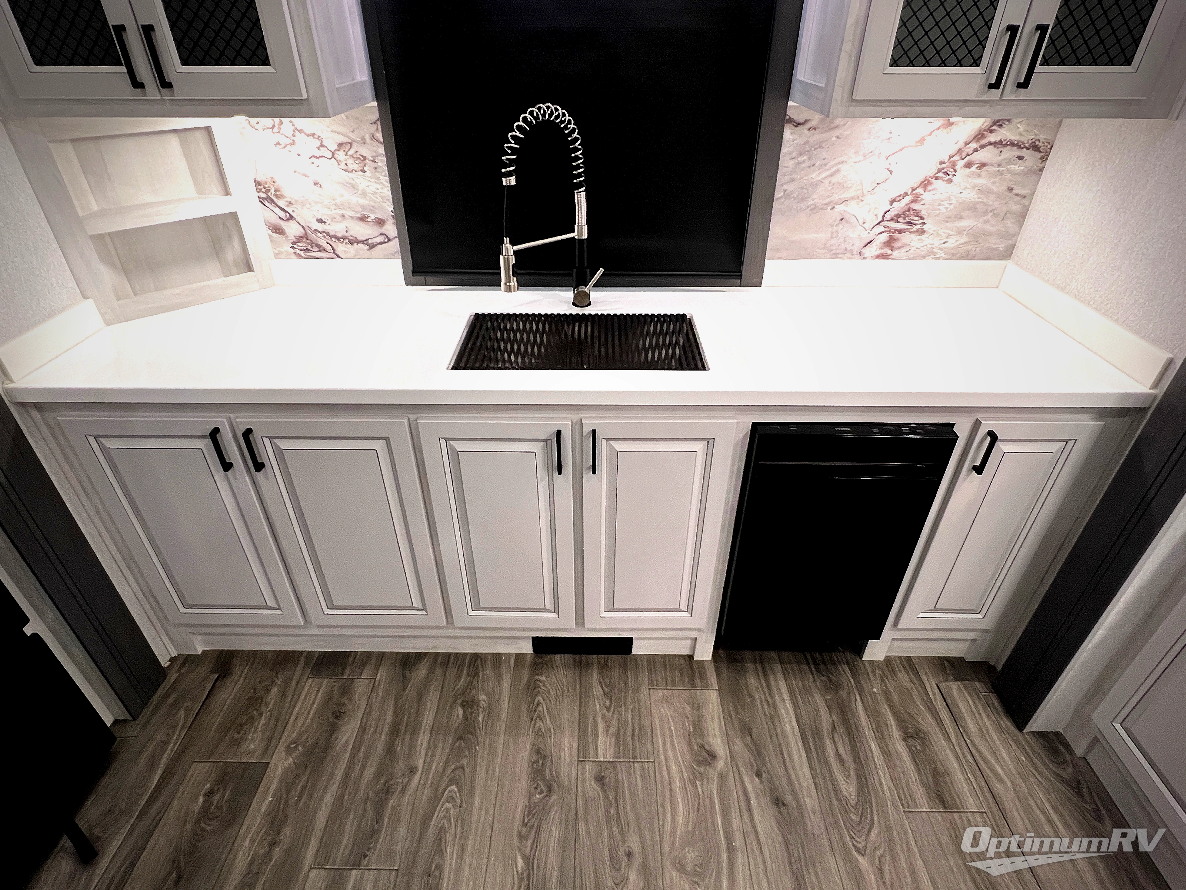 The spacious rear kitchen is equipped with a 30” microwave, 24” residential oven, overhead cabinets, breakfast bar with bar stools, walk-in pantry, and 16 cu. ft. refrigerator, perfect for cooking all your favorite dishes with the greatest convenience The living room is the heart of the home, featuring a desk with chairs, theater seating, two 60” trifold sofas, a TV with fireplace, and more. And when nature calls, you'll appreciate the convenient half bath with overhead cabinets and washer and dryer prep. The main bedroom is a serene retreat, featuring a king bed, drawers under the bed, a bedroom fireplace, and more. This is the perfect place to relax and recharge after a long day of adventure, and with a front full bathroom featuring a 30” x 40” shower, dual sink vanity, walk-in closet, dresser/drawers, you'll have everything you need to stay clean and comfortable on the go. Outside, you'll find not one, but two awnings to providing plenty of shade and protection from the elements.