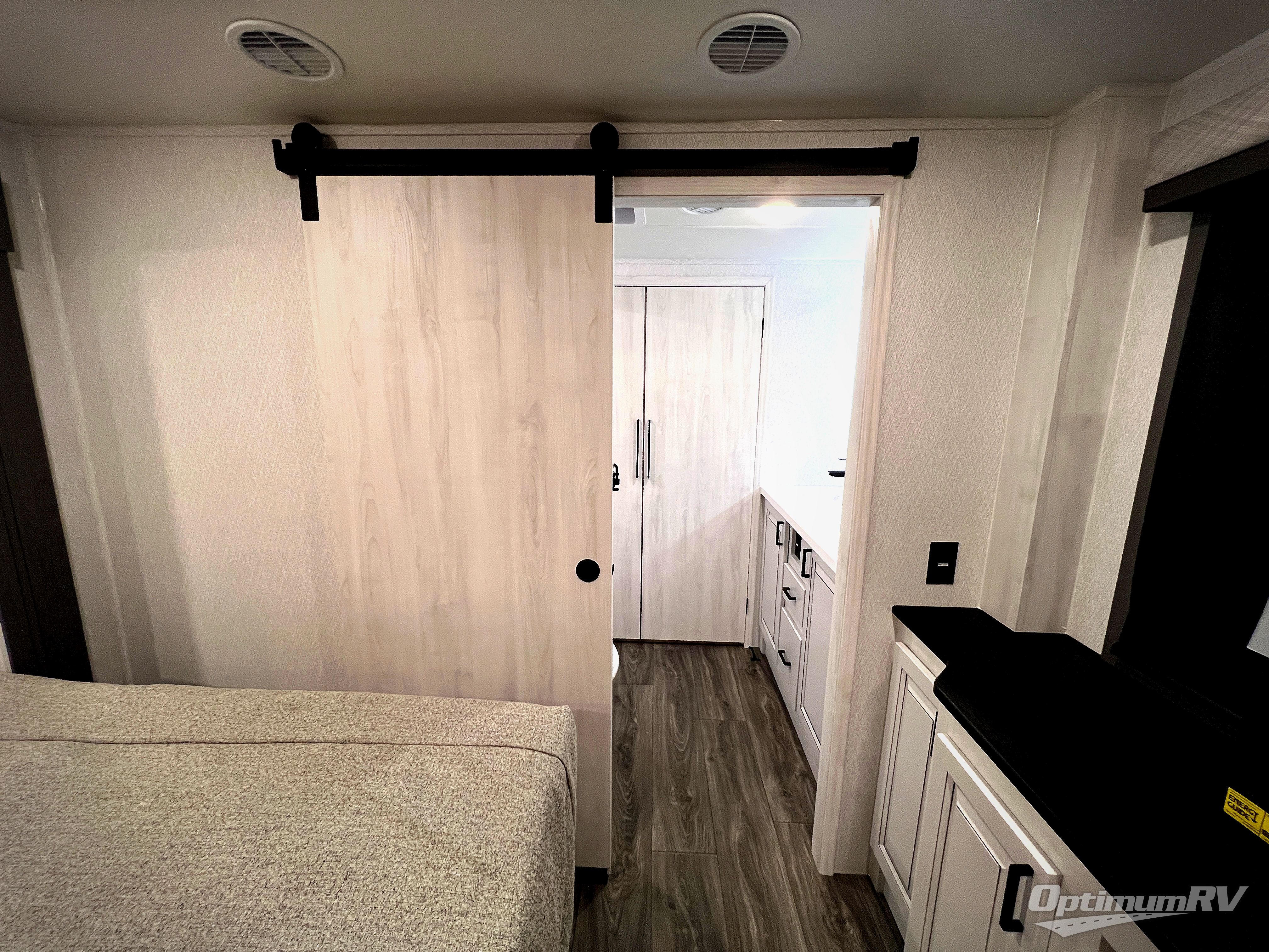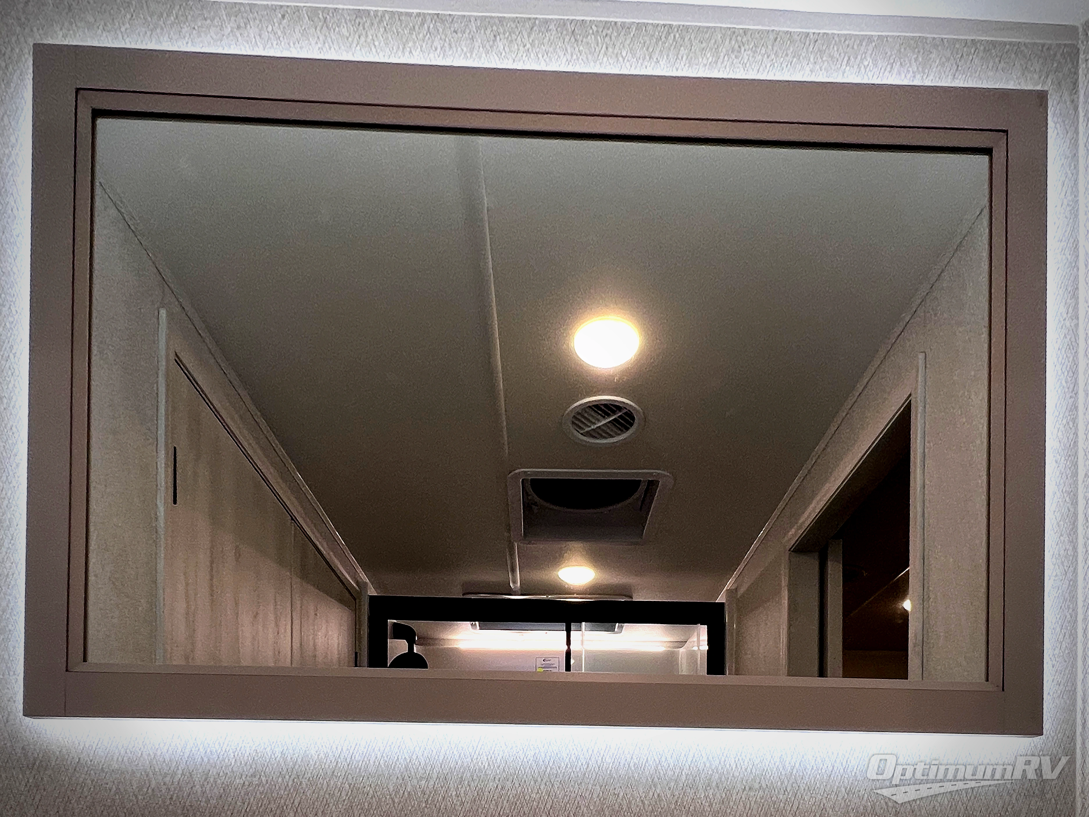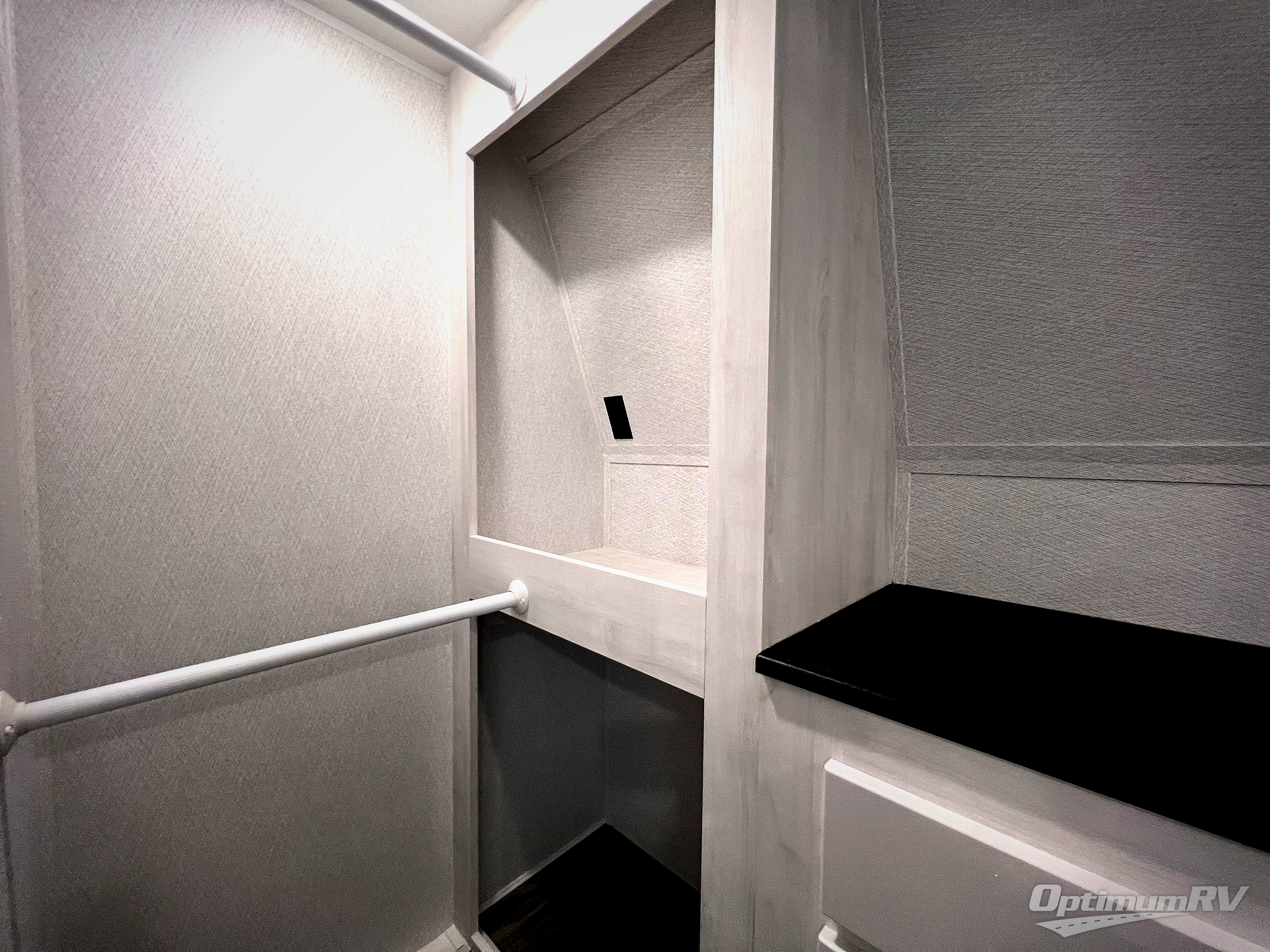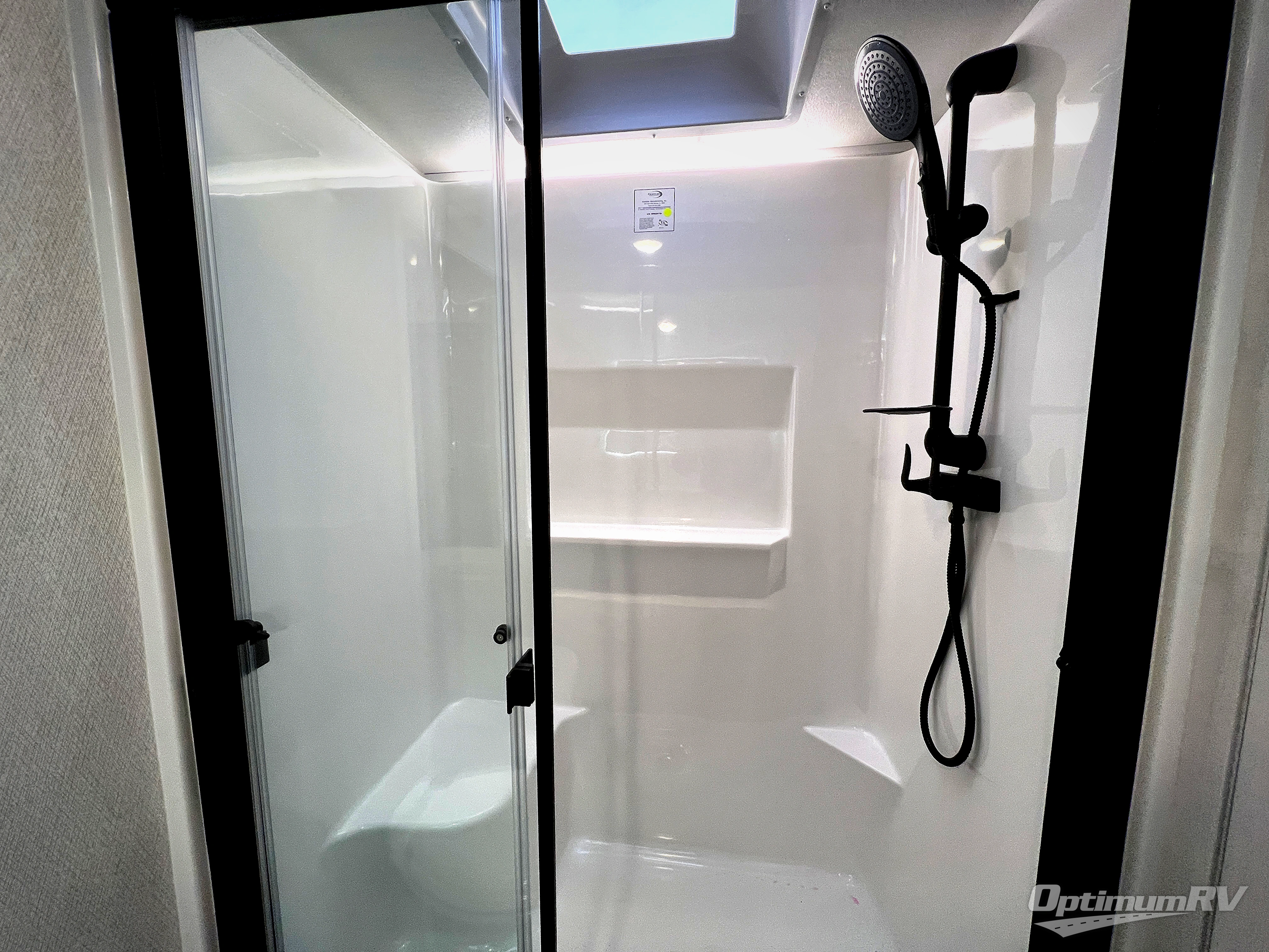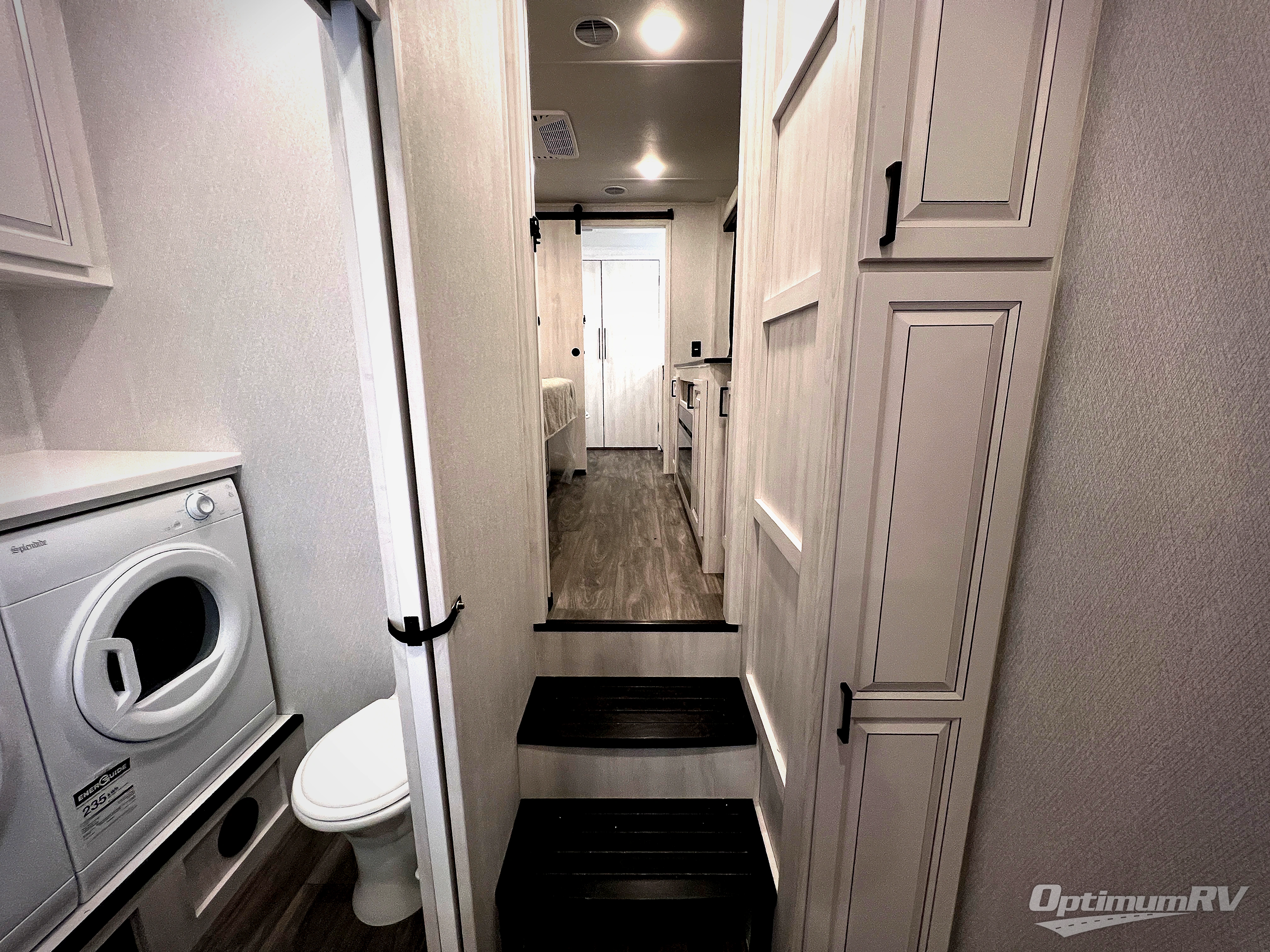 The spacious rear kitchen is equipped with a 30” microwave, 24” residential oven, overhead cabinets, breakfast bar with bar stools, walk-in pantry, and 16 cu. ft. refrigerator, perfect for cooking all your favorite dishes with the greatest convenience The living room is the heart of the home, featuring a desk with chairs, theater seating, two 60” trifold sofas, a TV with fireplace, and more. And when nature calls, you'll appreciate the convenient half bath with overhead cabinets and washer and dryer prep. The main bedroom is a serene retreat, featuring a king bed, drawers under the bed, a bedroom fireplace, and more. This is the perfect place to relax and recharge after a long day of adventure, and with a front full bathroom featuring a 30” x 40” shower, dual sink vanity, walk-in closet, dresser/drawers, you'll have everything you need to stay clean and comfortable on the go. Outside, you'll find not one, but two awnings to providing plenty of shade and protection from the elements.