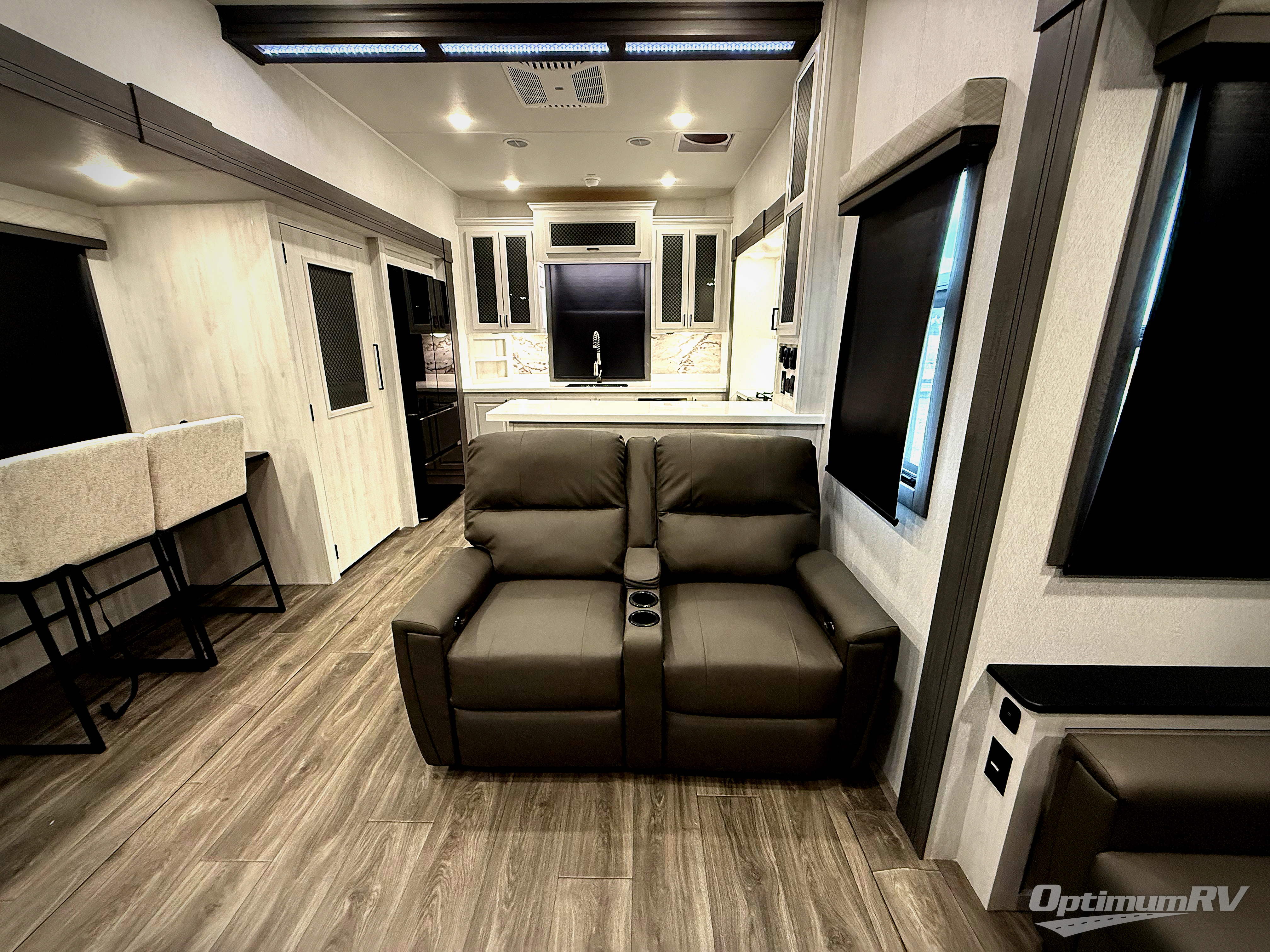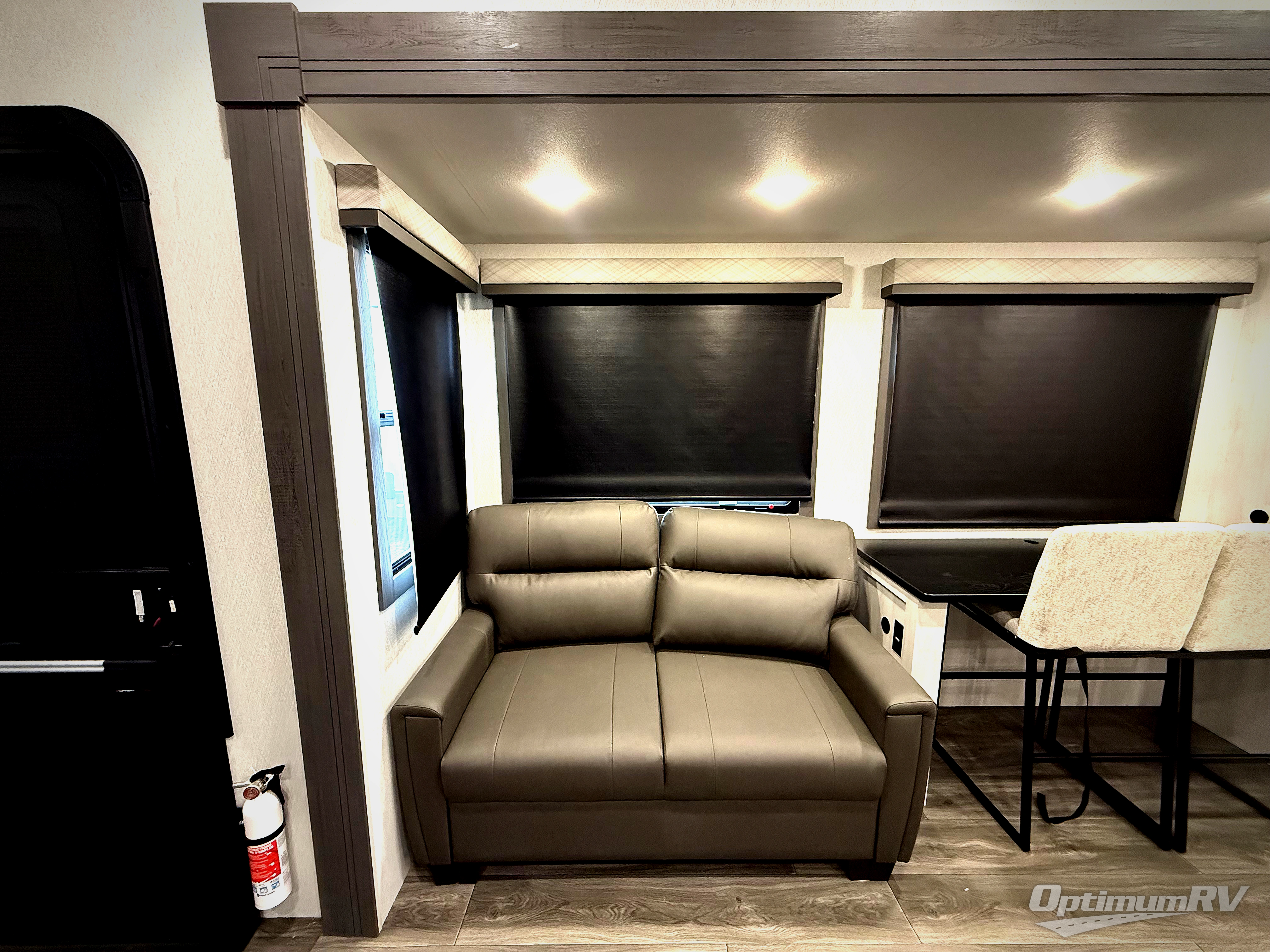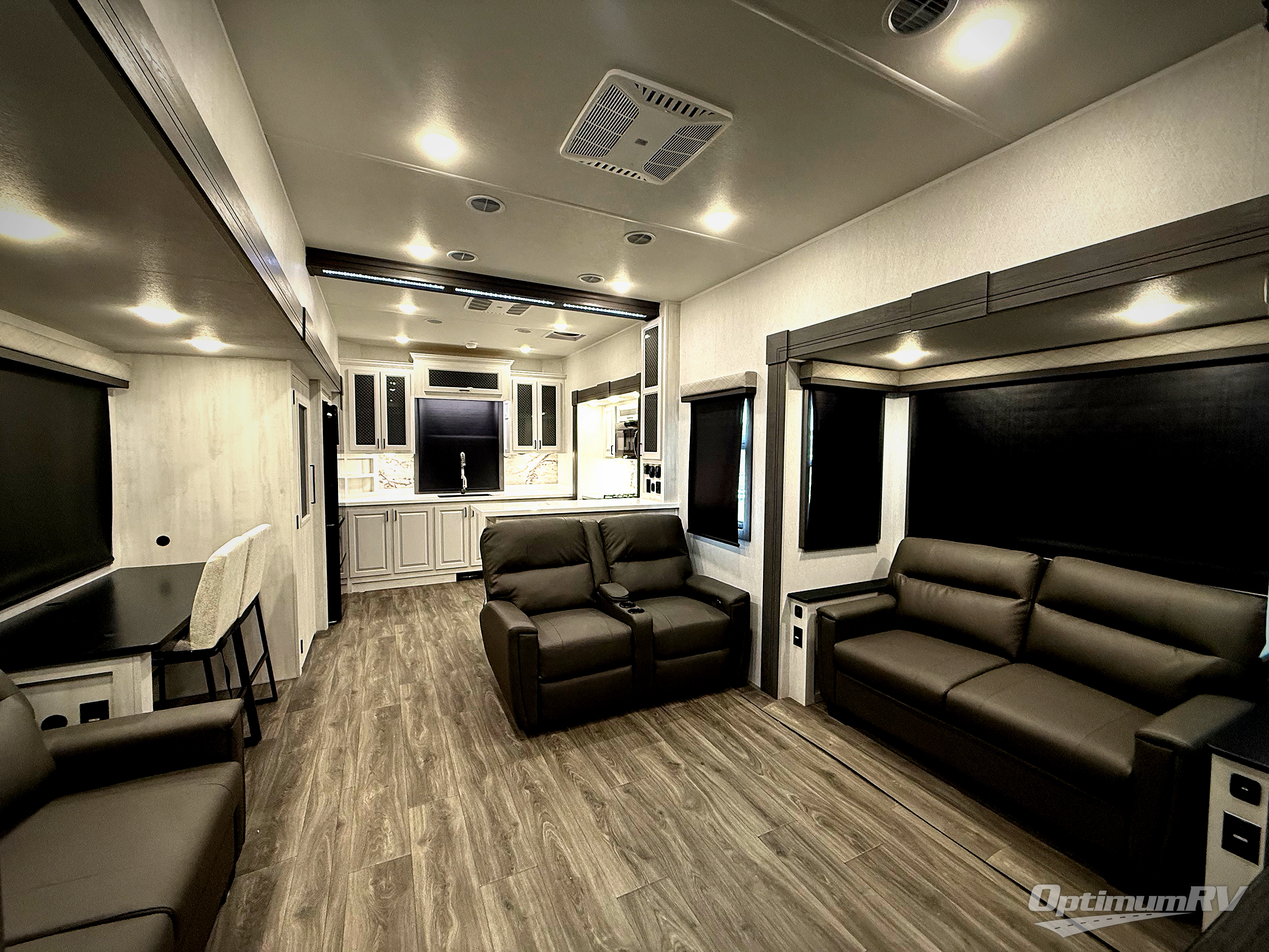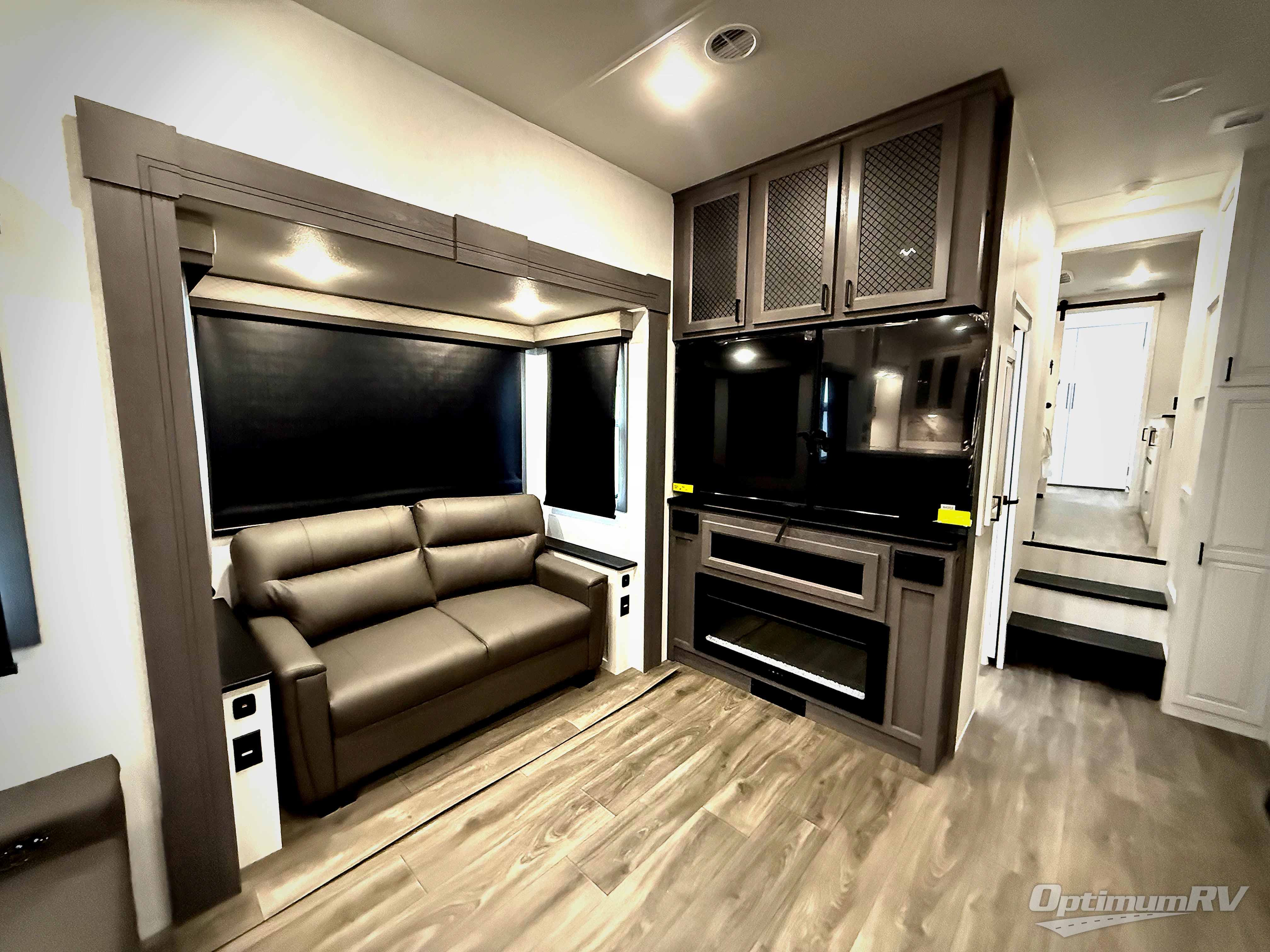 The spacious rear kitchen is equipped with a 30” microwave, 24” residential oven, overhead cabinets, breakfast bar with bar stools, walk-in pantry, and 16 cu. ft. refrigerator, perfect for cooking all your favorite dishes with the greatest convenience The living room is the heart of the home, featuring a desk with chairs, theater seating, two 60” trifold sofas, a TV with fireplace, and more. And when nature calls, you'll appreciate the convenient half bath with overhead cabinets and washer and dryer prep. The main bedroom is a serene retreat, featuring a king bed, drawers under the bed, a bedroom fireplace, and more. This is the perfect place to relax and recharge after a long day of adventure, and with a front full bathroom featuring a 30” x 40” shower, dual sink vanity, walk-in closet, dresser/drawers, you'll have everything you need to stay clean and comfortable on the go. Outside, you'll find not one, but two awnings to providing plenty of shade and protection from the elements.