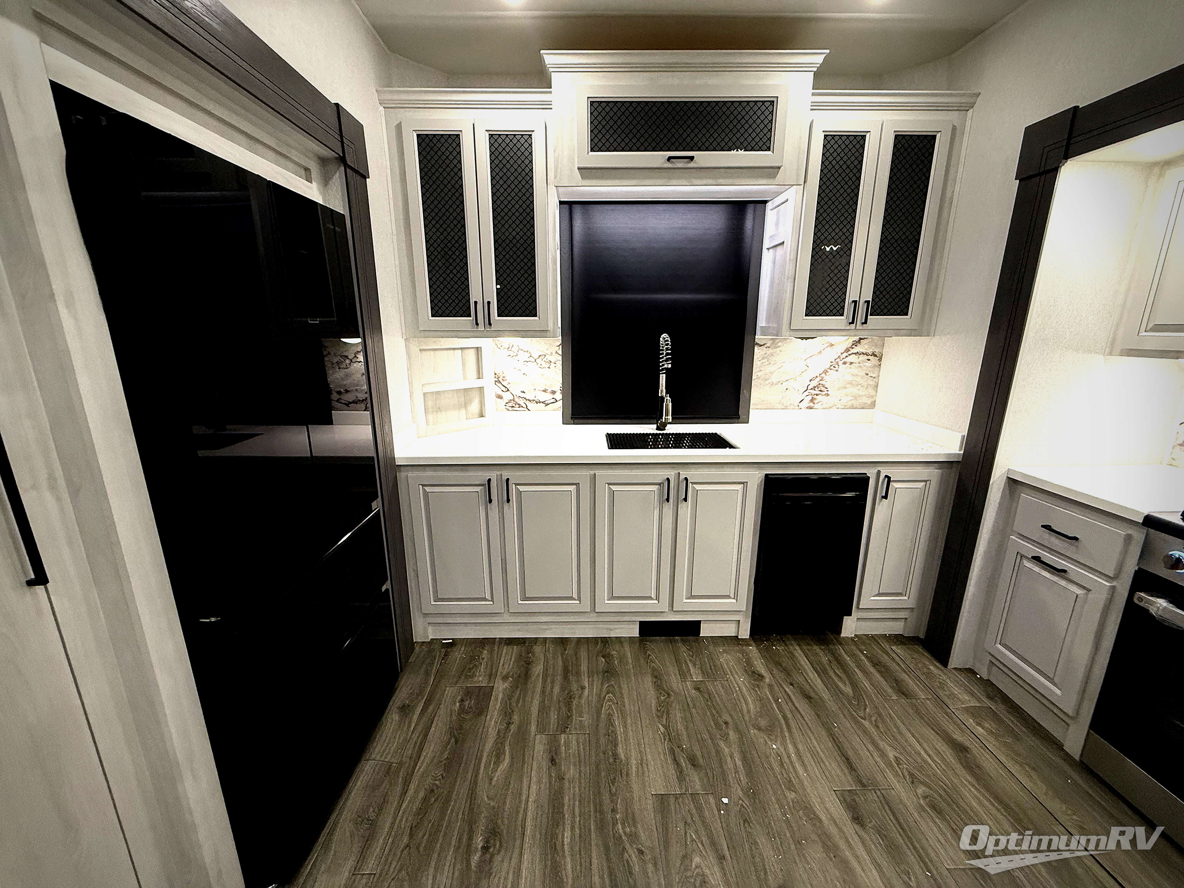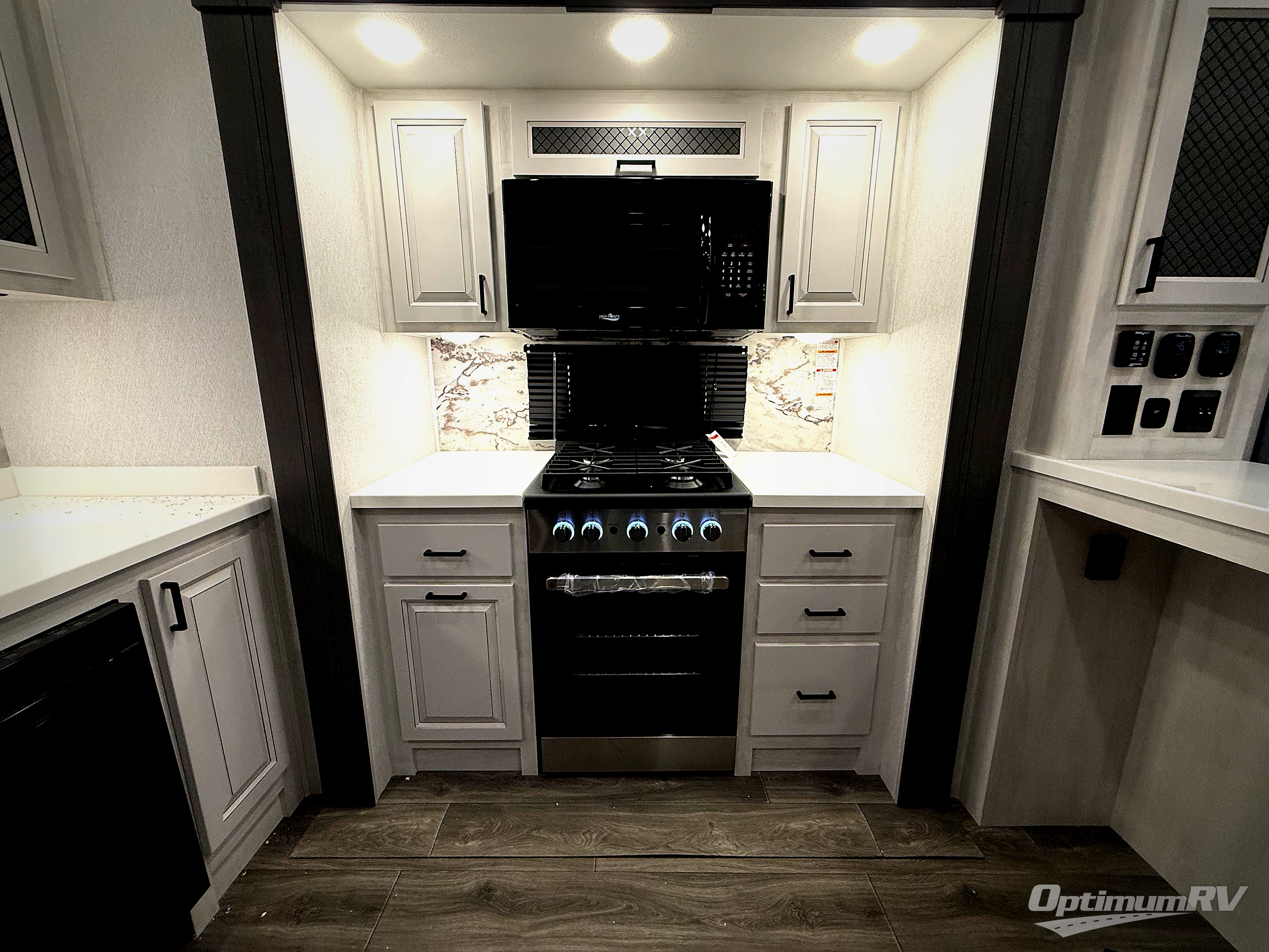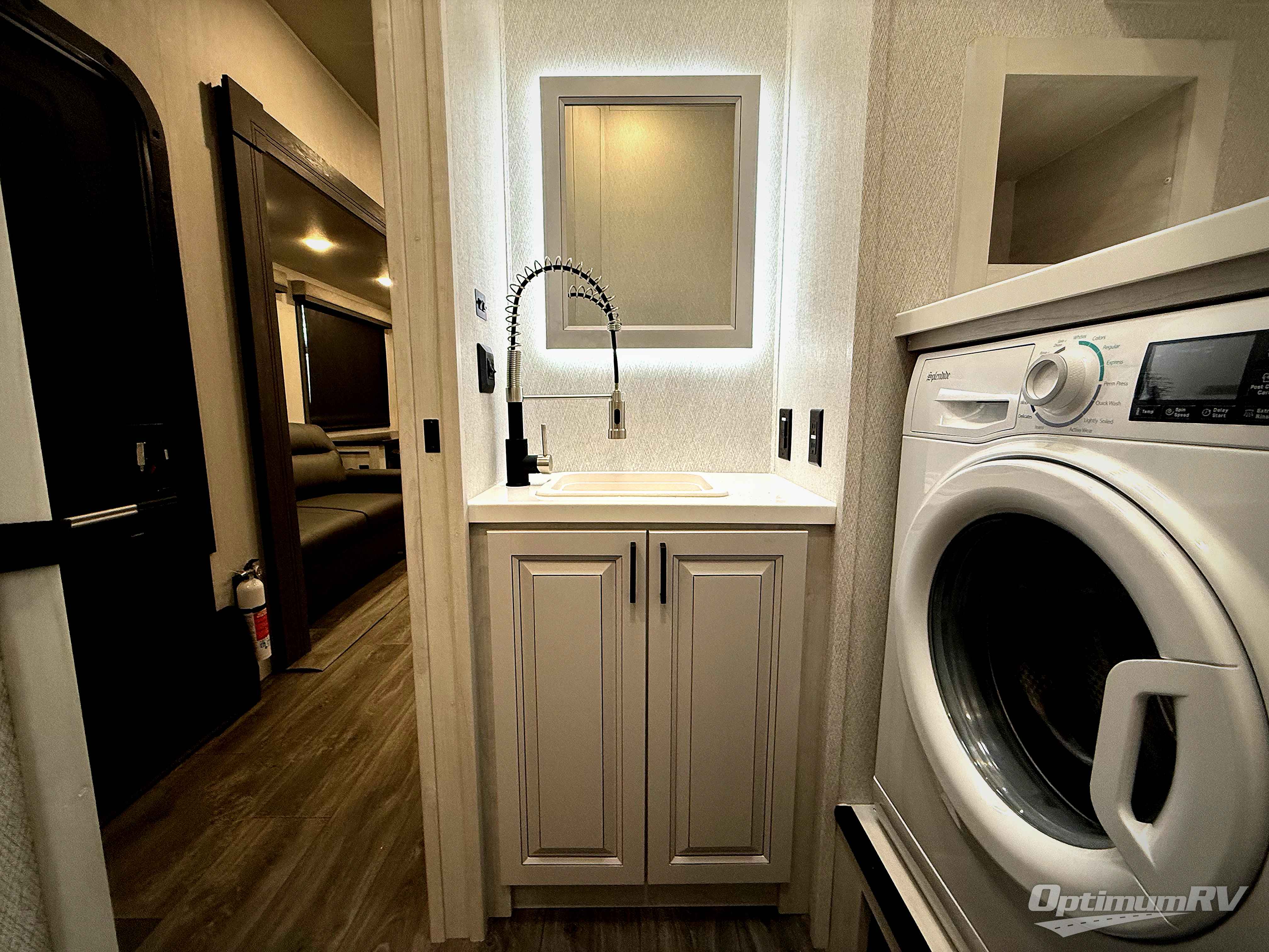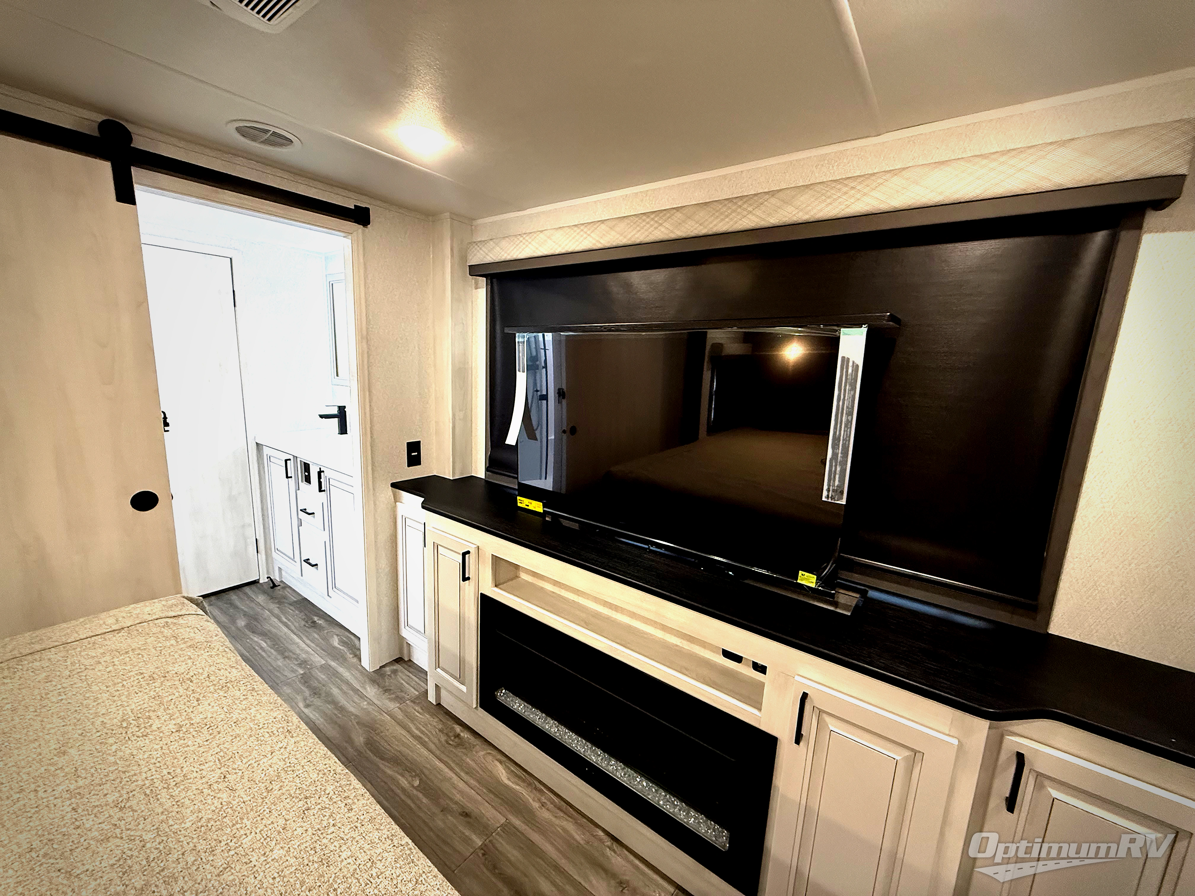 The spacious rear kitchen is equipped with a 30” microwave, 24” residential oven, overhead cabinets, breakfast bar with bar stools, walk-in pantry, and 16 cu. ft. refrigerator, perfect for cooking all your favorite dishes with the greatest convenience The living room is the heart of the home, featuring a desk with chairs, theater seating, two 60” trifold sofas, a TV with fireplace, and more. And when nature calls, you'll appreciate the convenient half bath with overhead cabinets and washer and dryer prep. The main bedroom is a serene retreat, featuring a king bed, drawers under the bed, a bedroom fireplace, and more. This is the perfect place to relax and recharge after a long day of adventure, and with a front full bathroom featuring a 30” x 40” shower, dual sink vanity, walk-in closet, dresser/drawers, you'll have everything you need to stay clean and comfortable on the go. Outside, you'll find not one, but two awnings to providing plenty of shade and protection from the elements.