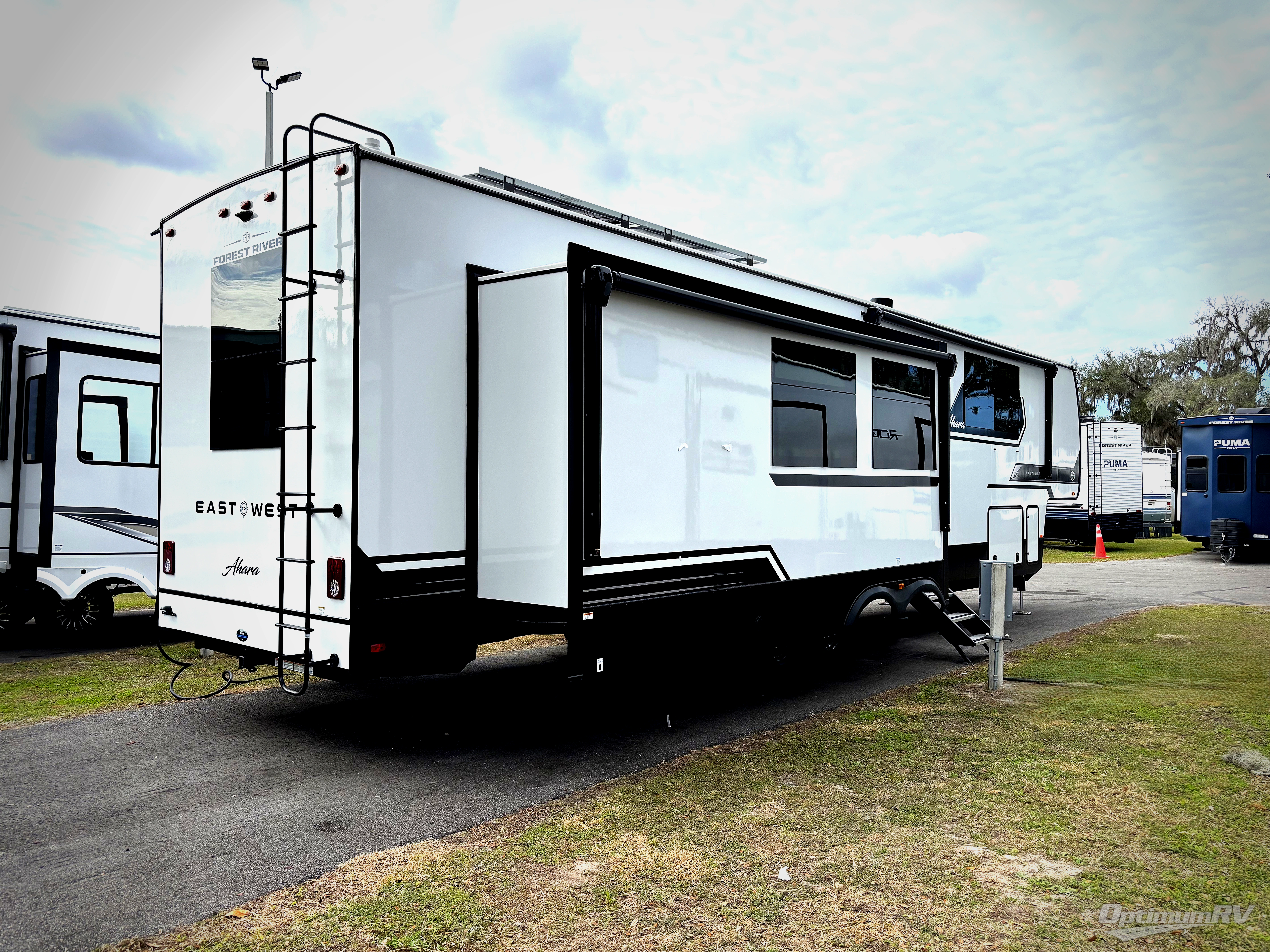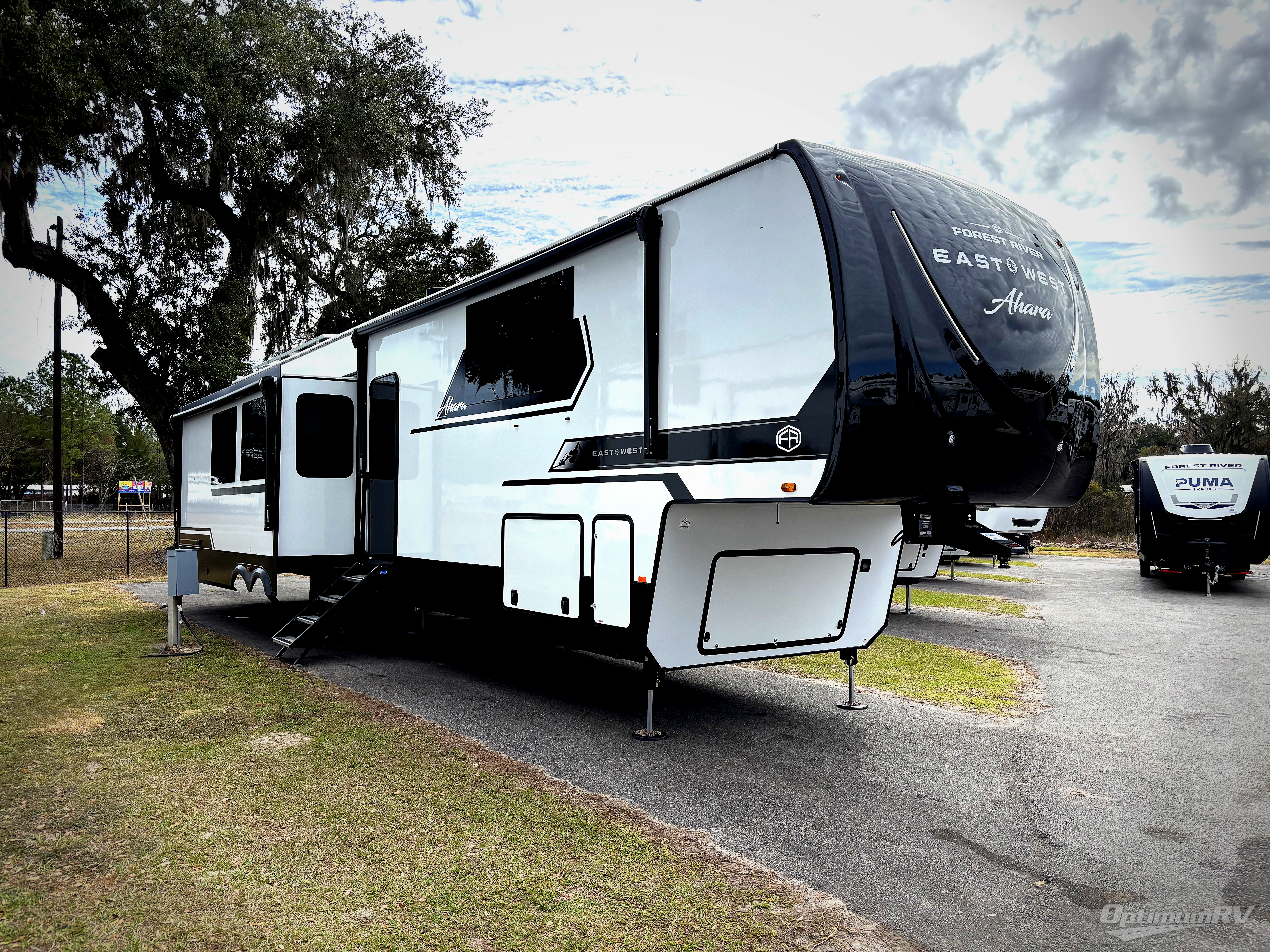 There is just too much luxury to name on the EAST TO WEST Ahara fifth wheel! These units are quite impressive, and once you see them, you'll know what we mean. The Ahara first grabs your attention with its fully painted aerodynamic fiberglass front cap, 102" wide-body chassis, and deep tint square frameless windows. For towing, you'll find a MORryde CRE 3000 suspension, LED marker lights, LED taillights with back-up lights, and rear view camera prep. Traveling in different climates is also made easy with the high-efficiency triple A/C system, 40,000 BTU high-capacity furnace, plus heated, insulated, and enclosed underbelly found within the Climate Package. Head inside to enjoy Slow Rise roller shades, a flush floor kitchen slide to help prevent trips, and solid surface countertops in the kitchen and bath to name a few luxuries!