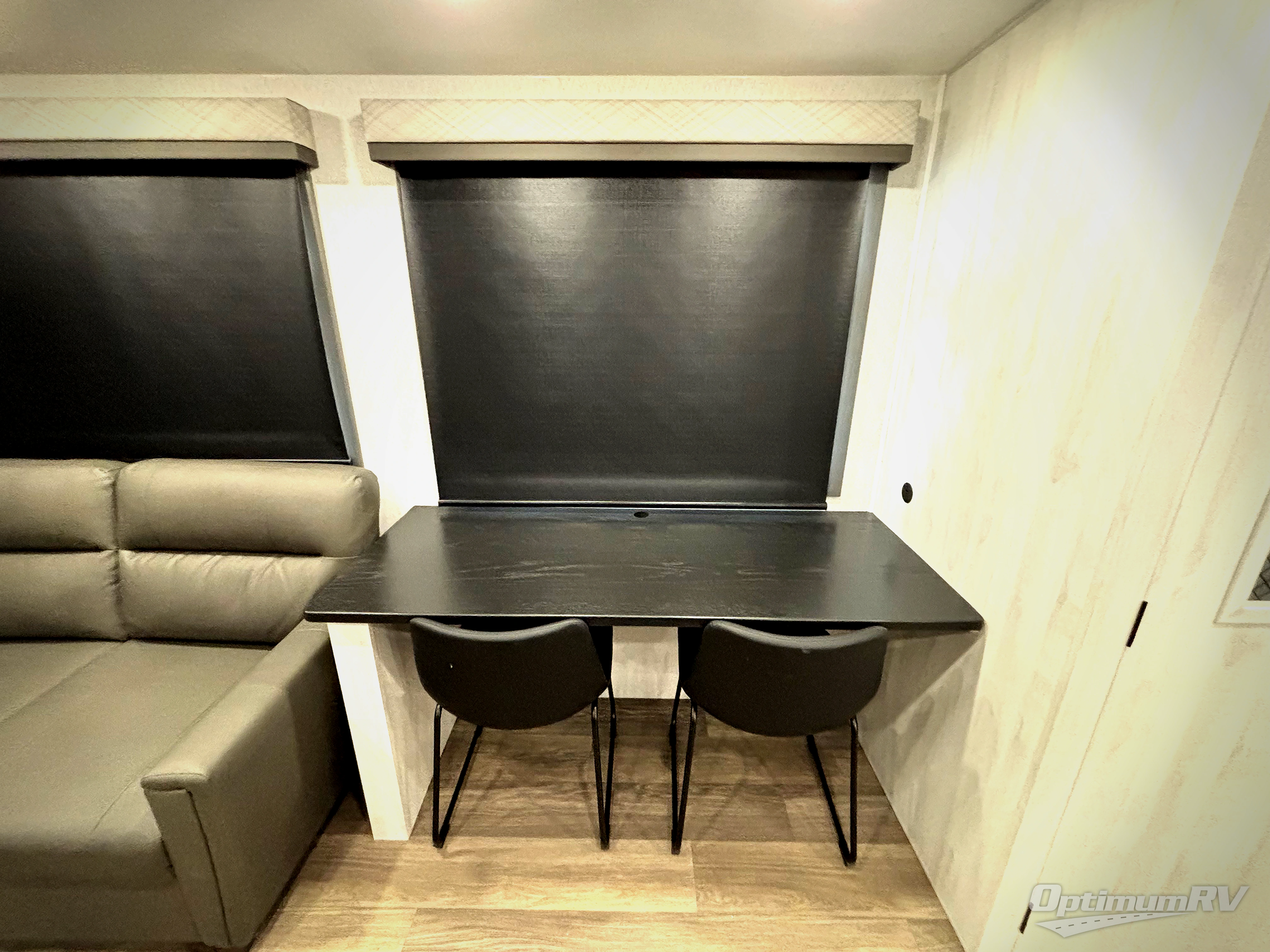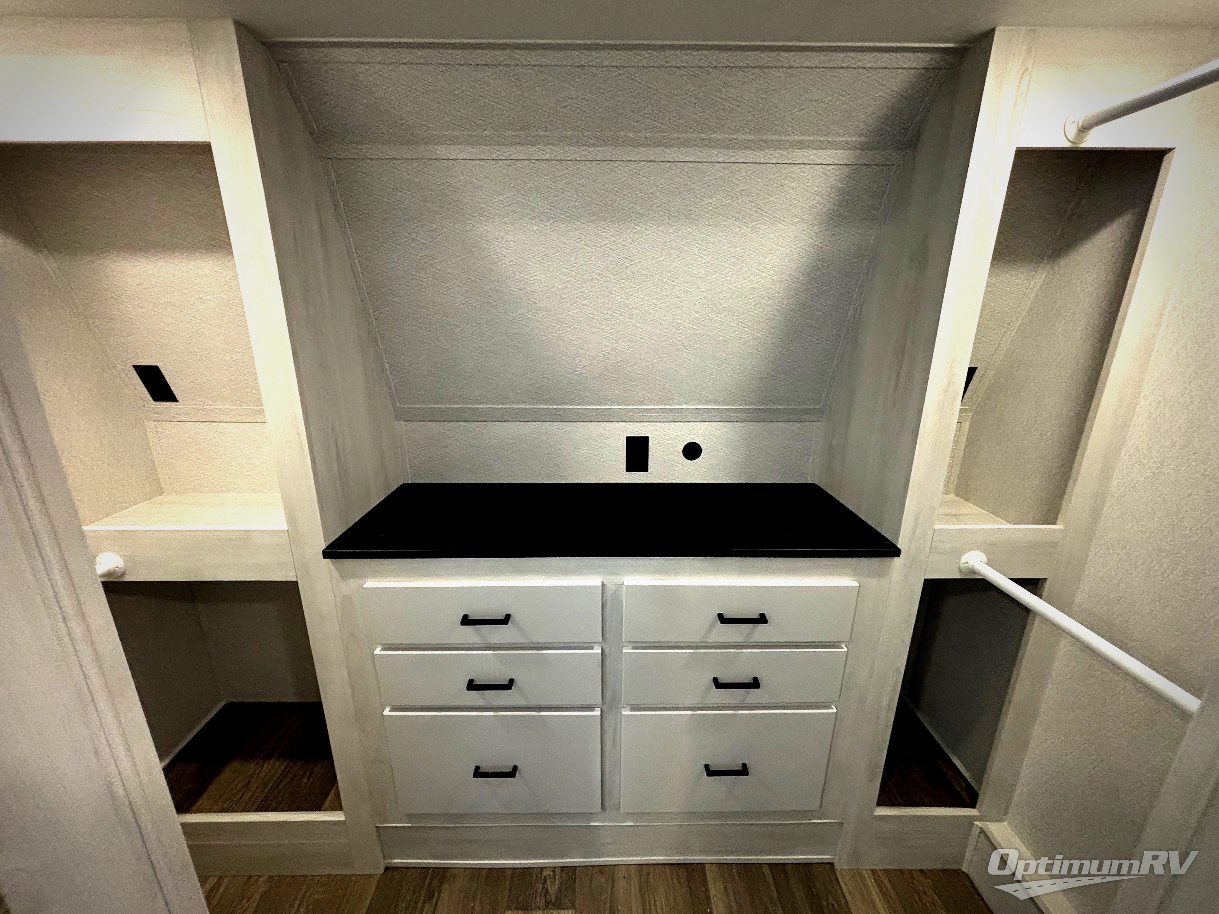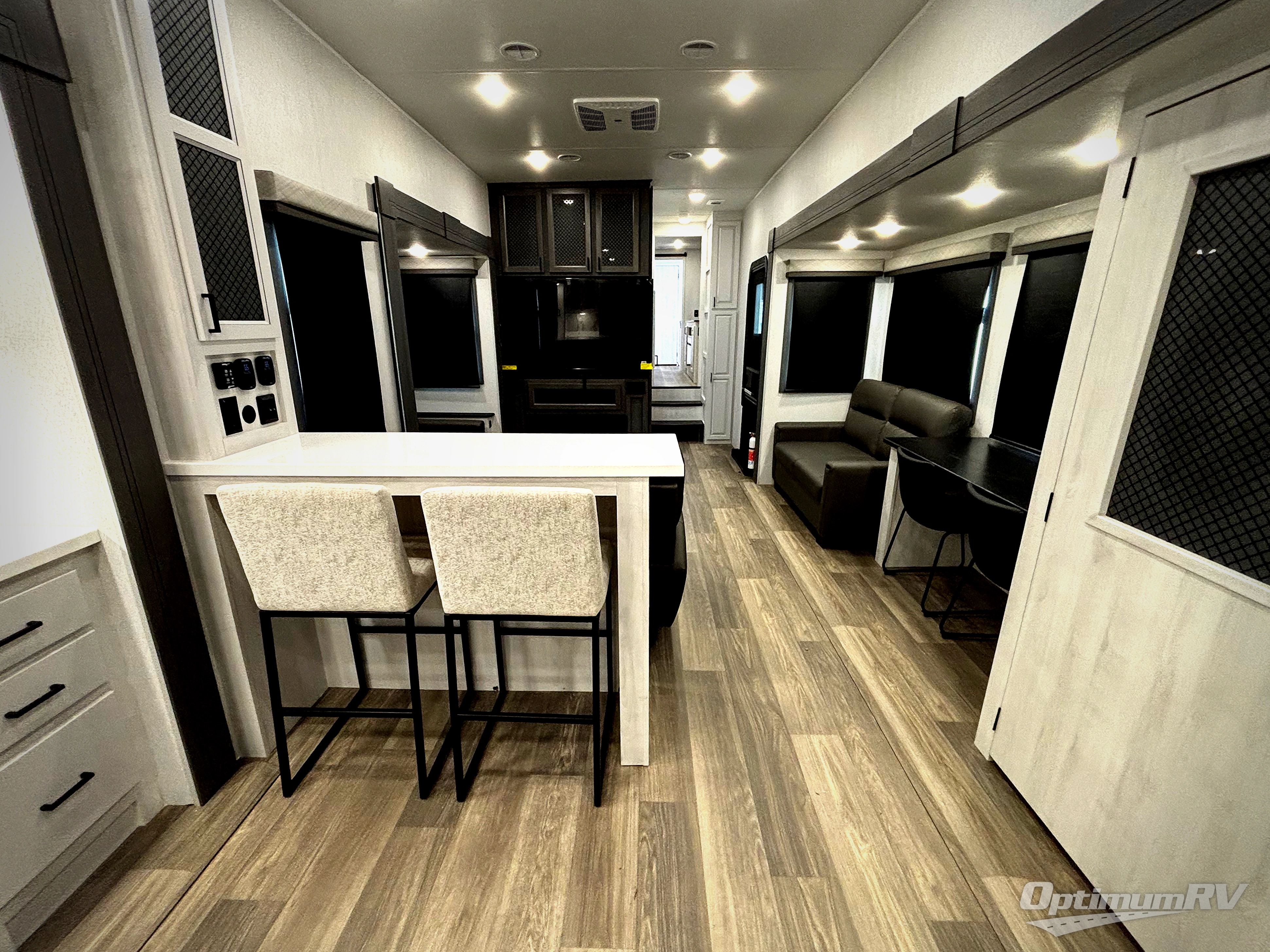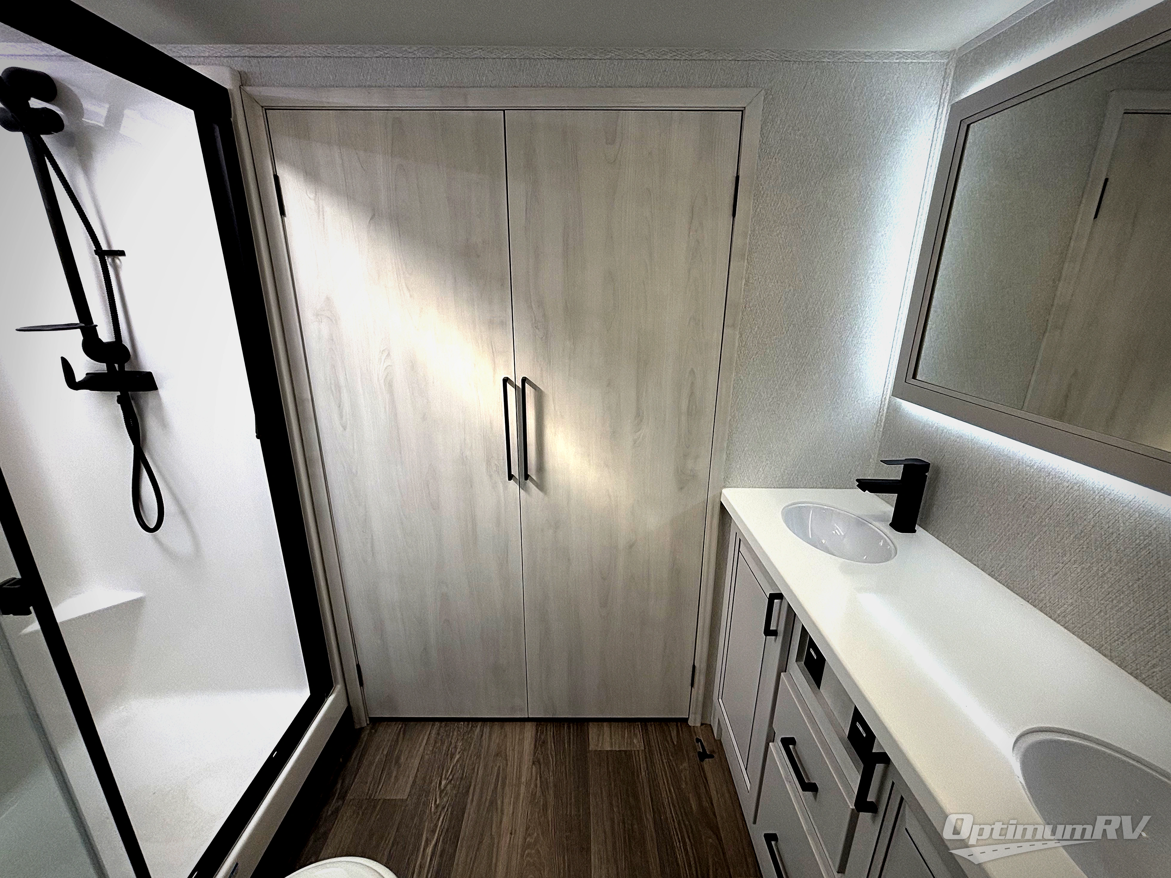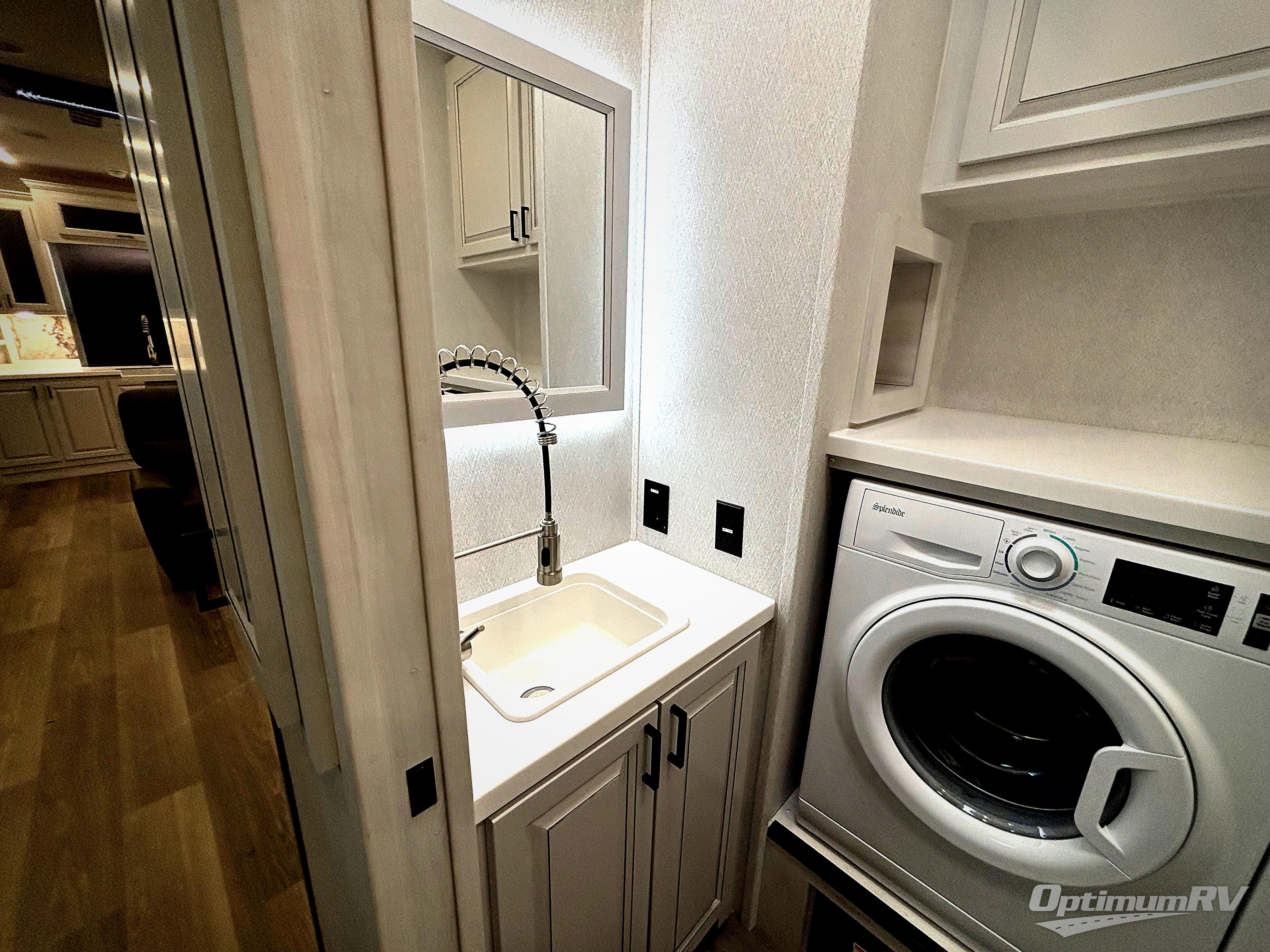 The spacious rear kitchen is equipped with a 30” microwave, 24” residential oven, overhead cabinets, breakfast bar with bar stools, walk-in pantry, and 16 cu. ft. refrigerator, perfect for cooking all your favorite dishes with the greatest convenience The living room is the heart of the home, featuring a desk with chairs, theater seating, two 60” trifold sofas, a TV with fireplace, and more. And when nature calls, you'll appreciate the convenient half bath with overhead cabinets and washer and dryer prep. The main bedroom is a serene retreat, featuring a king bed, drawers under the bed, a bedroom fireplace, and more. This is the perfect place to relax and recharge after a long day of adventure, and with a front full bathroom featuring a 30” x 40” shower, dual sink vanity, walk-in closet, dresser/drawers, you'll have everything you need to stay clean and comfortable on the go. Outside, you'll find not one, but two awnings to providing plenty of shade and protection from the elements.