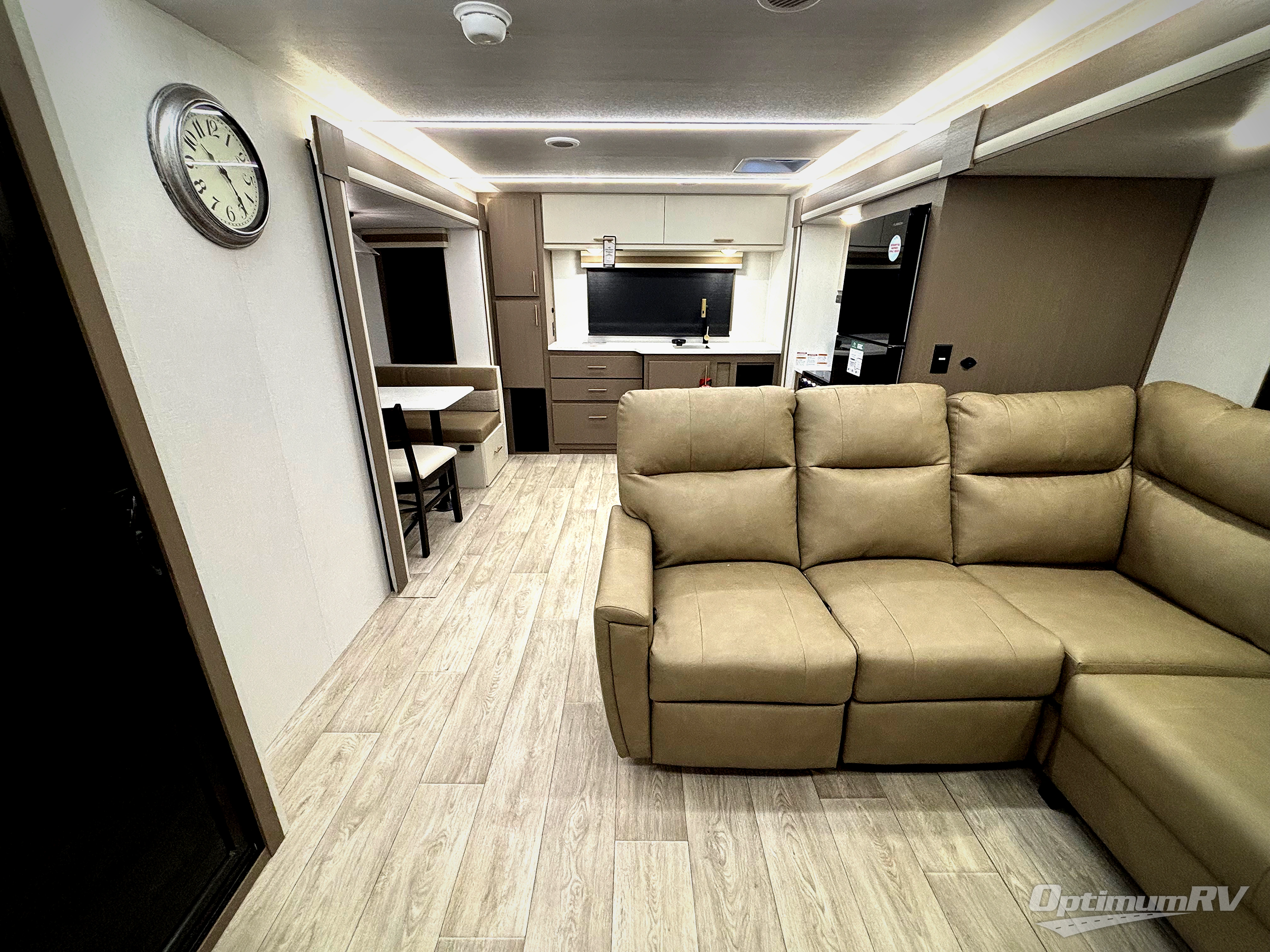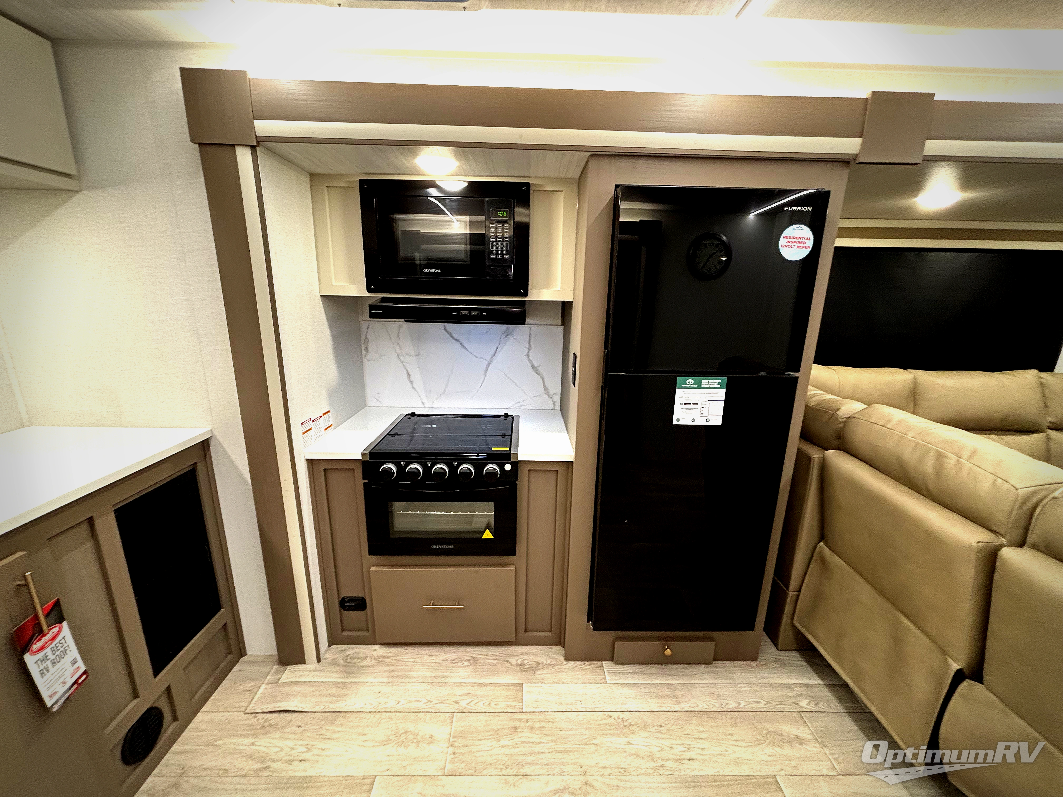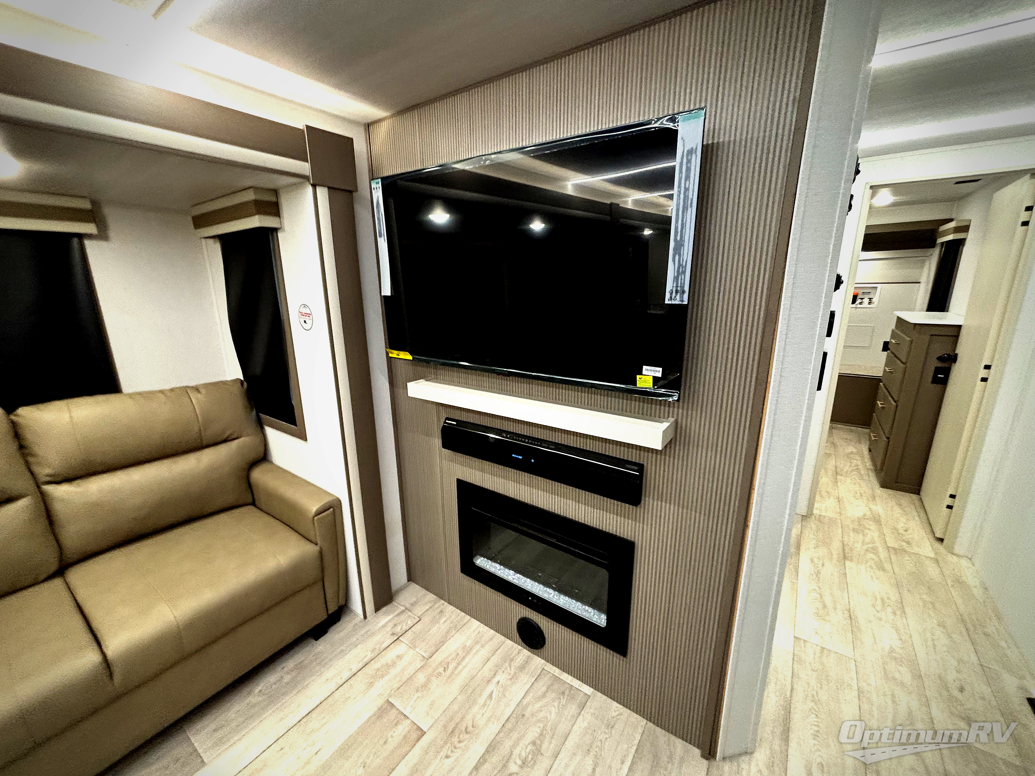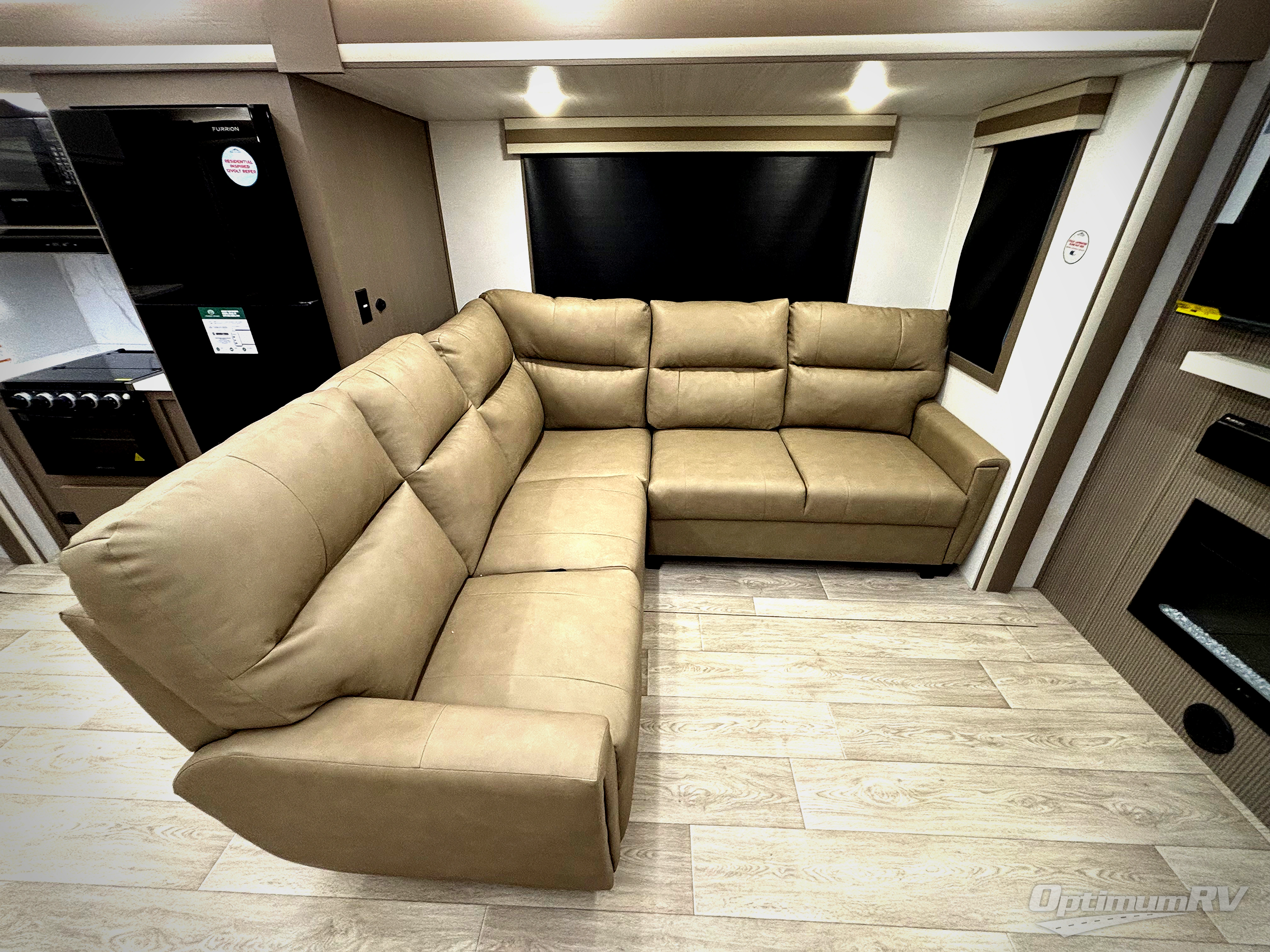 Experience a luxurious ride in this travel trailer. The rear kitchen is equipped with everything you need to whip up a culinary masterpiece. Enjoy ample storage in the pantry, a 12V refrigerator for keeping your favorite drinks and snacks chilled, a three-burner cooktop for cooking up a storm, and a microwave for quick reheating. The sink provides a convenient spot for washing up, and the spacious countertops offer plenty of room for food preparation. Relax and unwind in the heart of the trailer, a comfortable living area features a tri-fold sofa and a sofa with recliners. Gather around the fireplace on chilly evenings, or enjoy your favorite shows on the TV. Further, the full bathroom is equipped with everything you need for a comfortable stay, and the front bedroom boasts a queen-sized bed, large wardrobe, dresser, and overhead cabinets. Finally, take your living space outdoors with the fold-down patio, perfect for alfresco dining or simply enjoying the fresh air.