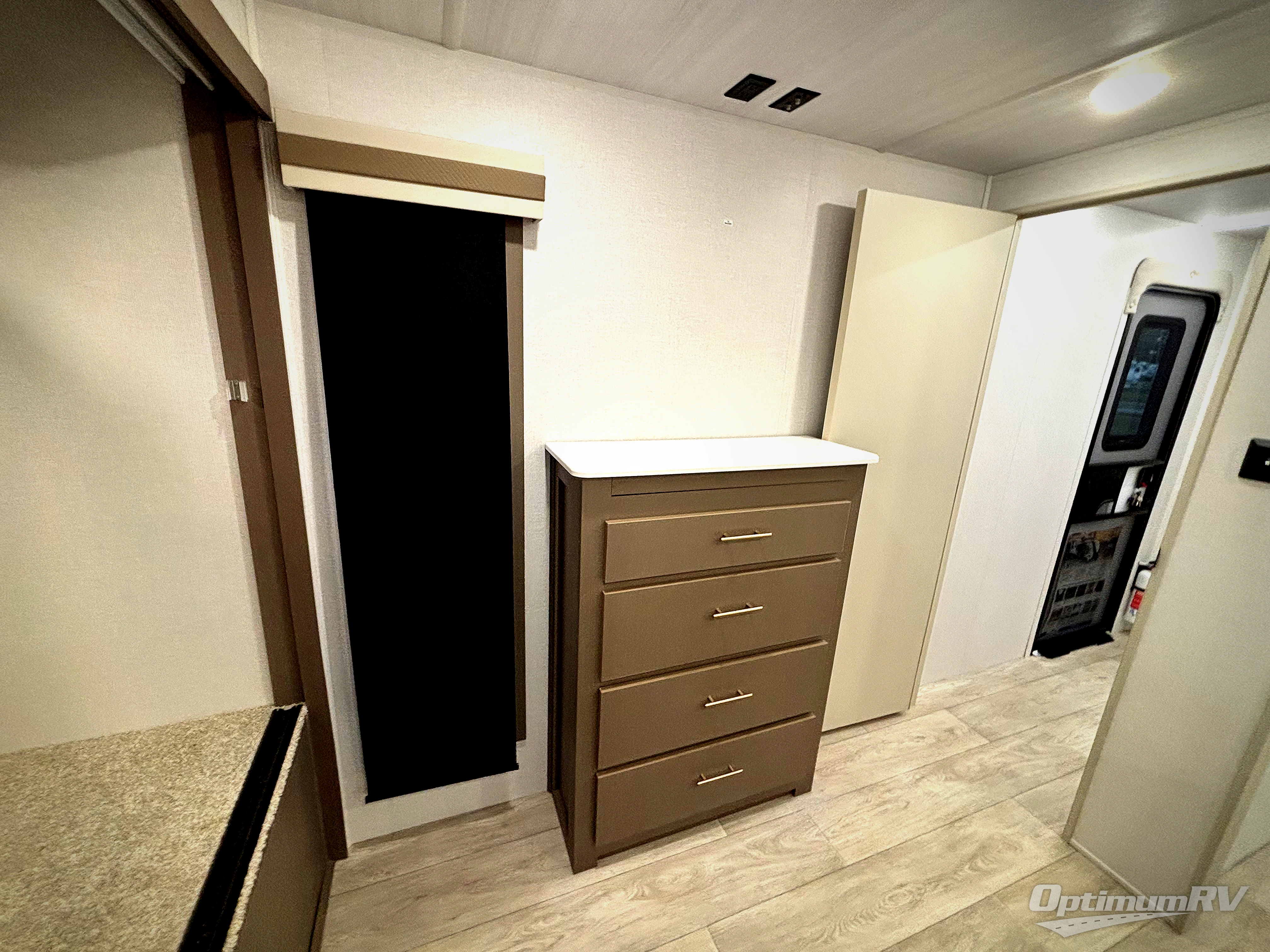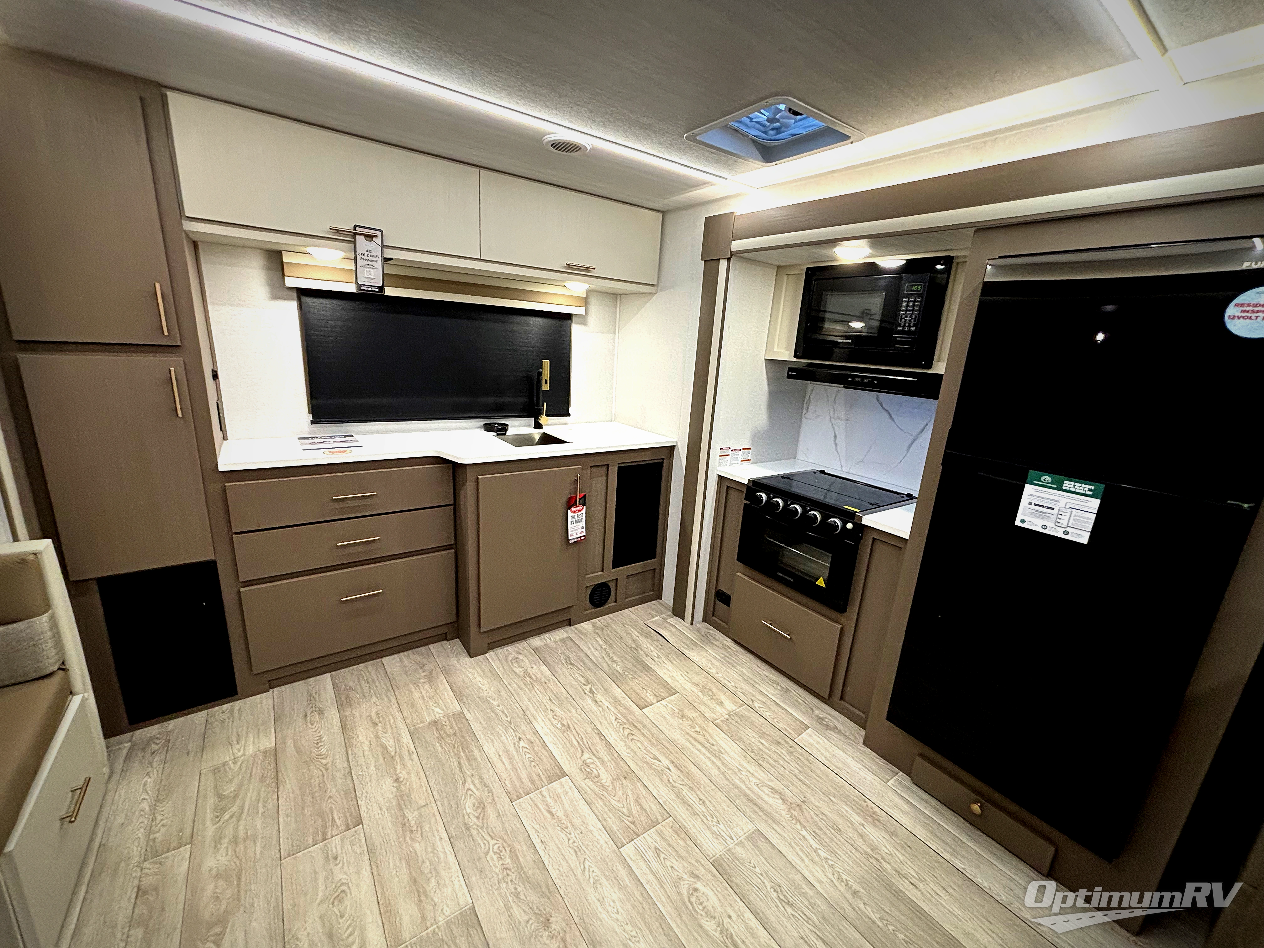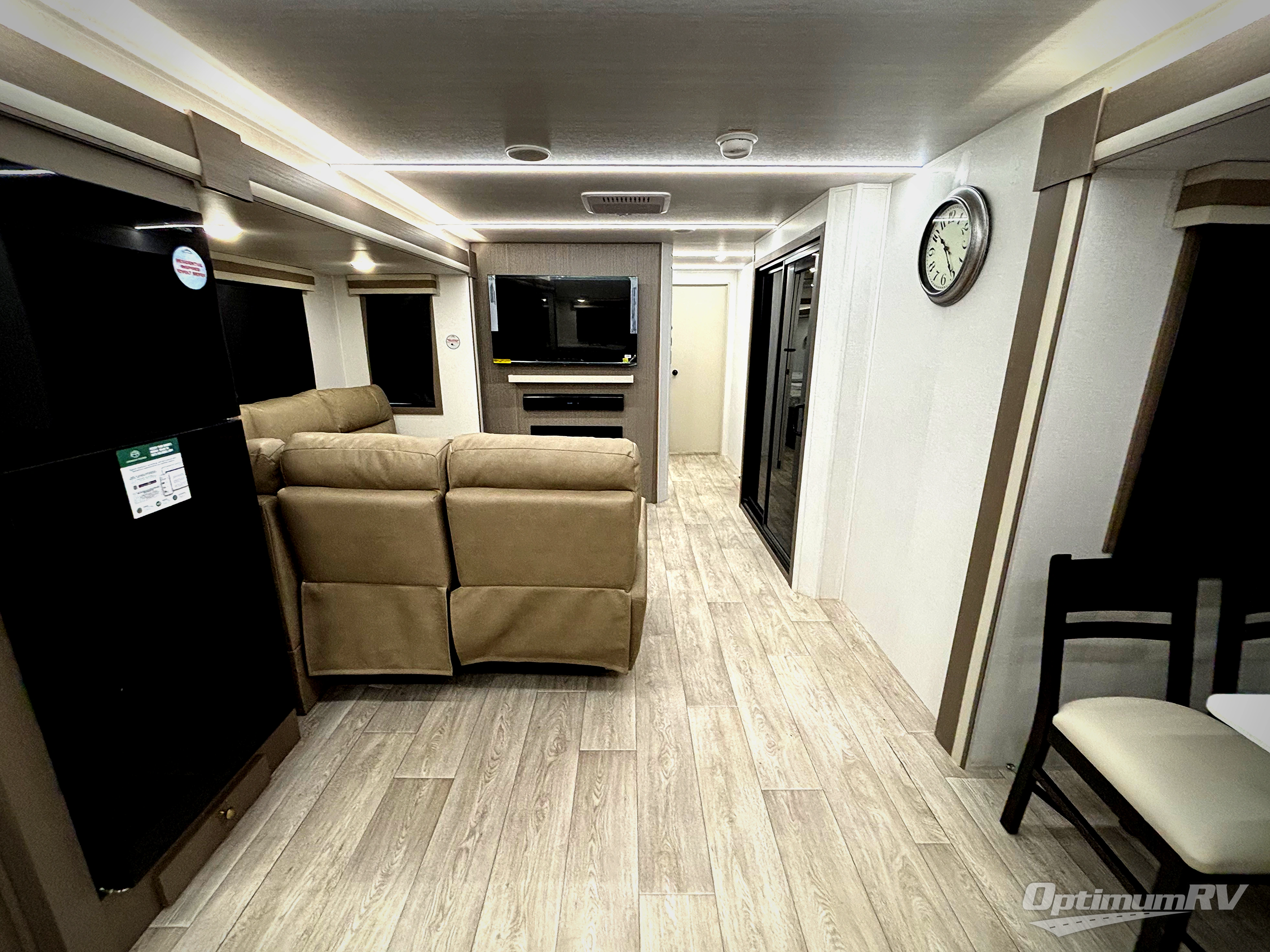Experience a luxurious ride in this travel trailer. The rear kitchen is equipped with everything you need to whip up a culinary masterpiece. Enjoy ample storage in the pantry, a 12V refrigerator for keeping your favorite drinks and snacks chilled, a three-burner cooktop for cooking up a storm, and a microwave for quick reheating. The sink provides a convenient spot for washing up, and the spacious countertops offer plenty of room for food preparation. Relax and unwind in the heart of the trailer, a comfortable living area features a tri-fold sofa and a sofa with recliners. Gather around the fireplace on chilly evenings, or enjoy your favorite shows on the TV. Further, the full bathroom is equipped with everything you need for a comfortable stay, and the front bedroom boasts a queen-sized bed, large wardrobe, dresser, and overhead cabinets. Finally, take your living space outdoors with the fold-down patio, perfect for alfresco dining or simply enjoying the fresh air.