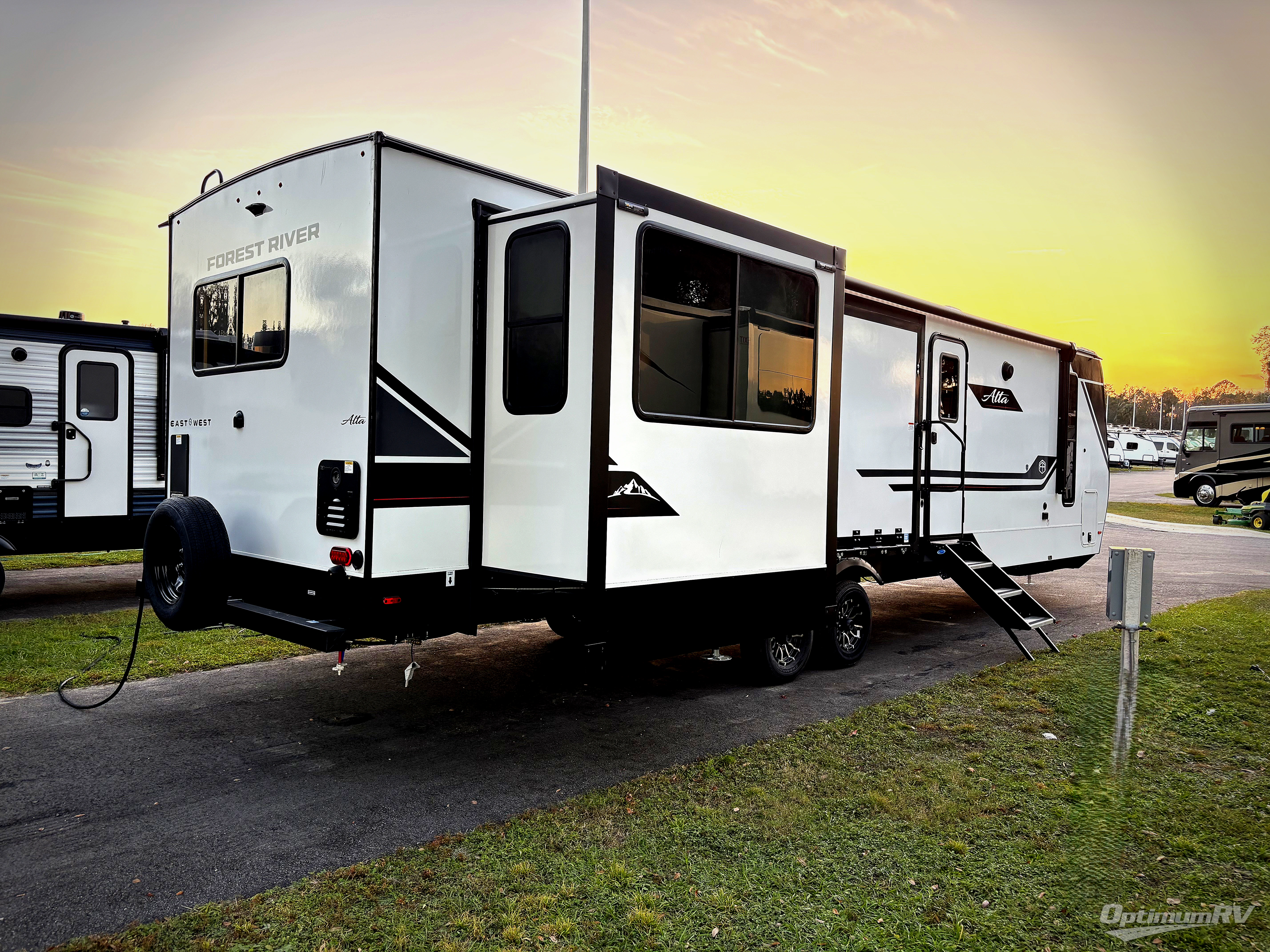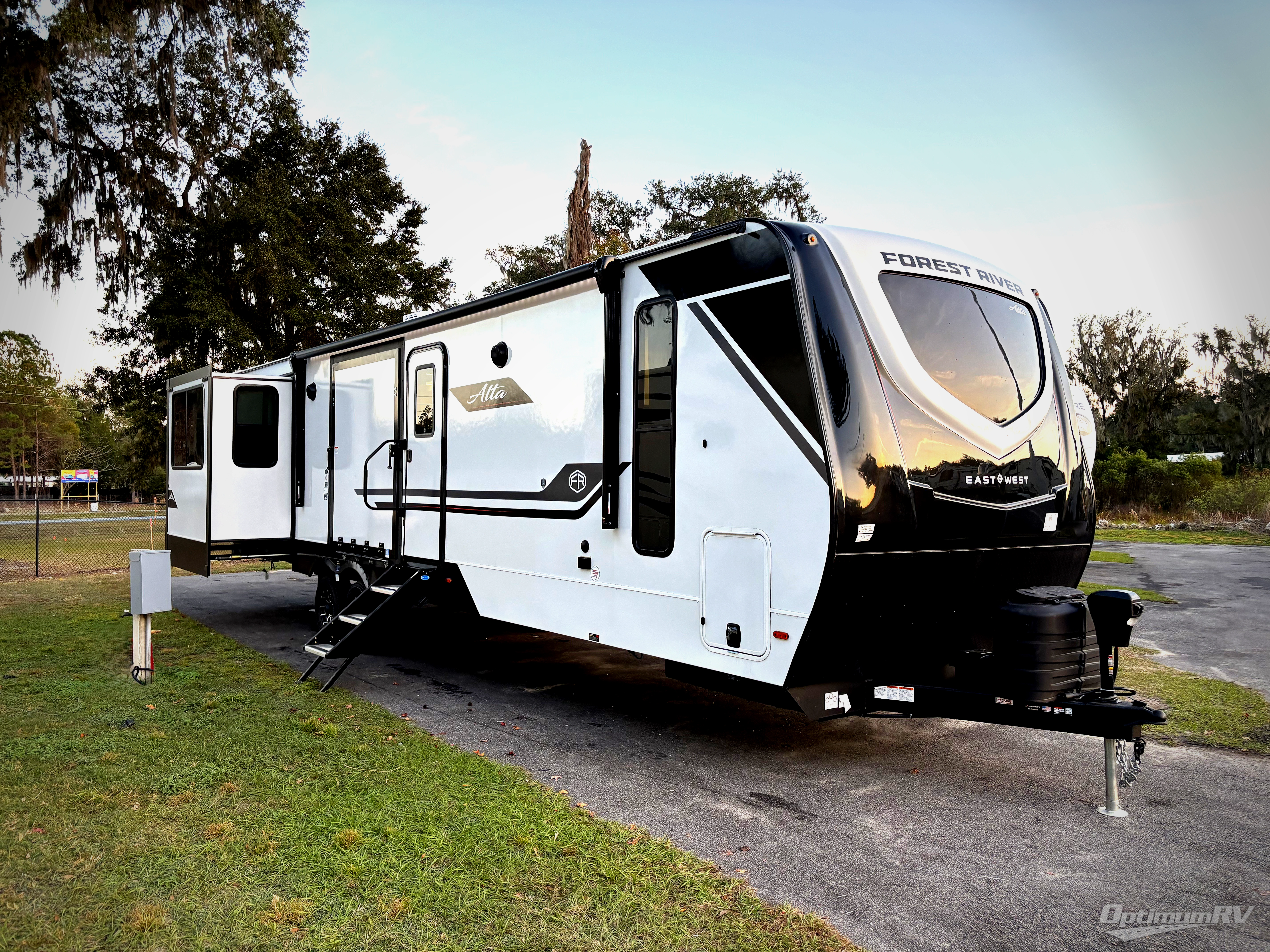 Each Alta travel trailer or toy hauler by EAST TO WEST is constructed with a 5" vacuum bonded roof, an enclosed and heated underbelly, and diamond plate front rock guard for added protection. Outside, you'll find marine-grade exterior speakers, a universal docking station, and back-up camera prep that can be added to make maneuvering in and out of campgrounds easier than ever. Inside, there are 4k interior LED lights, solid pressed membrane countertops, black roller shades, and many more interior comforts you are sure to love.