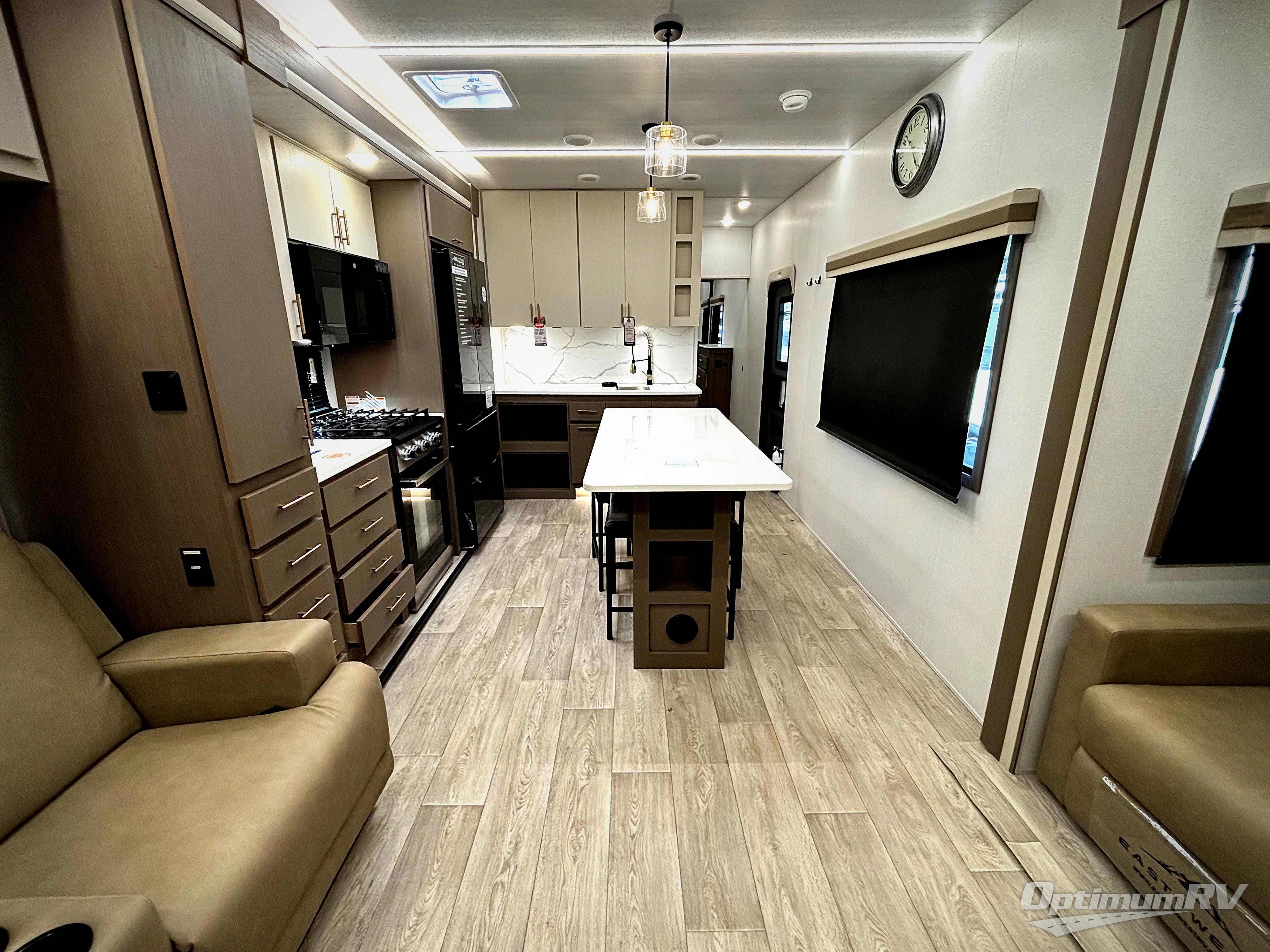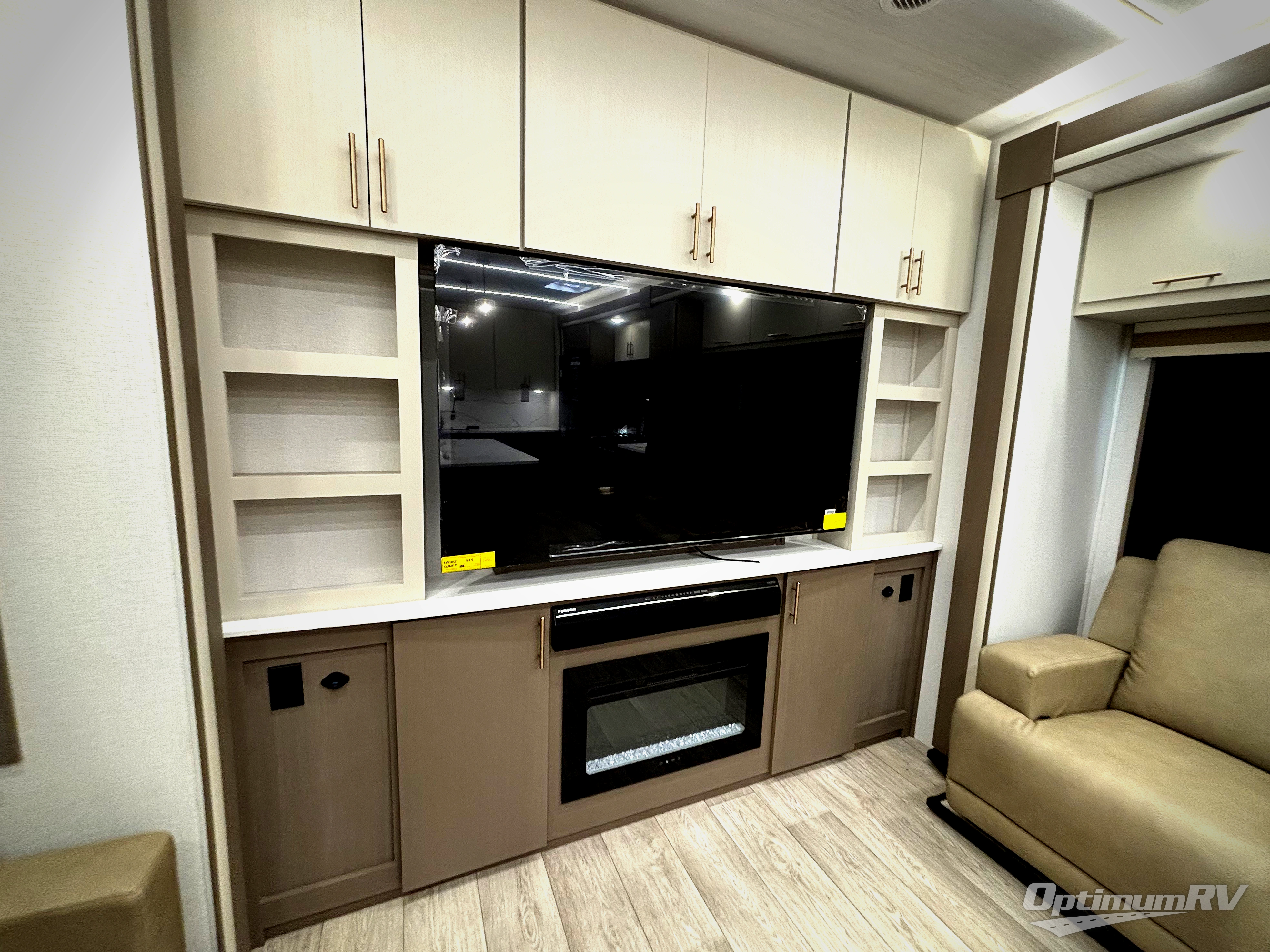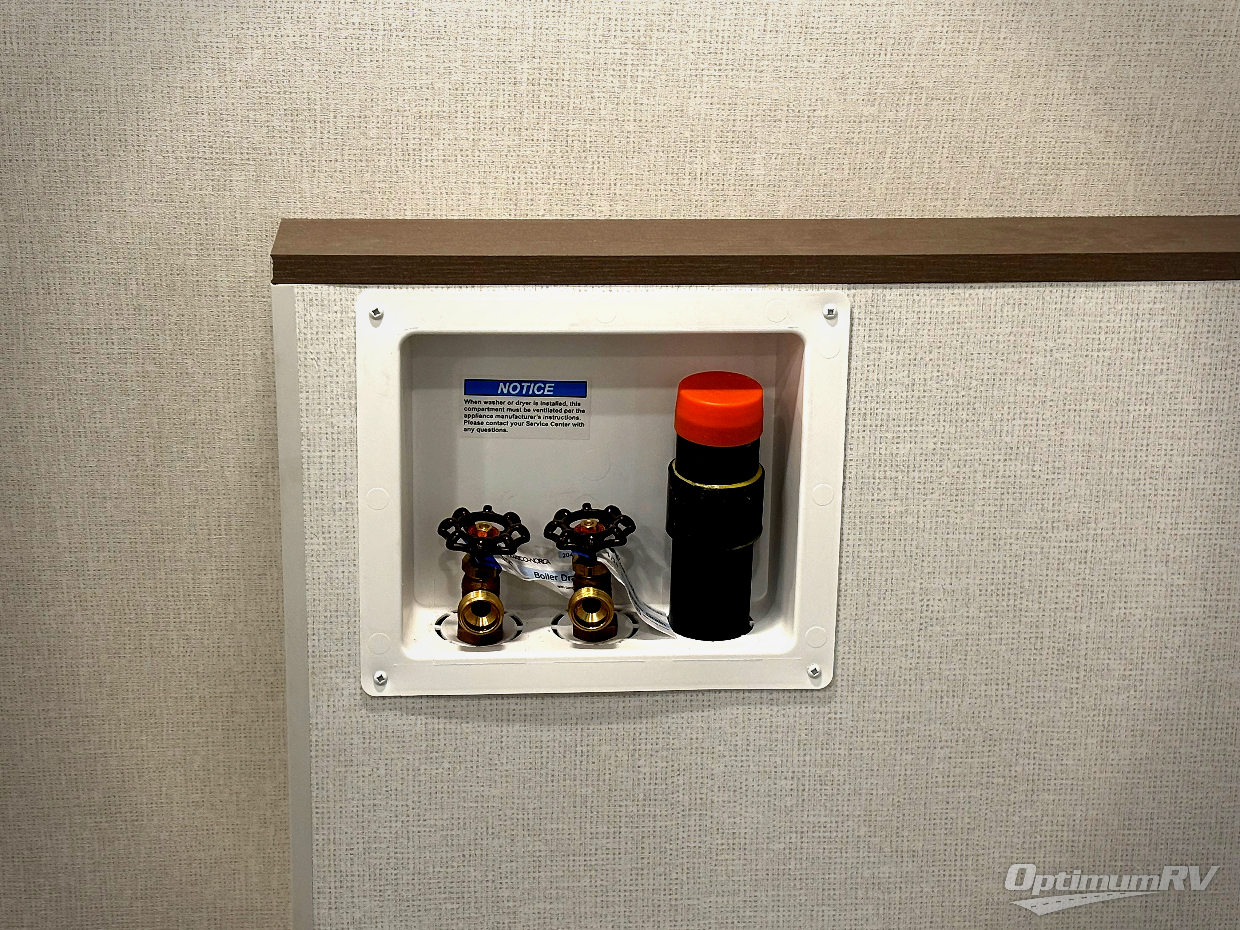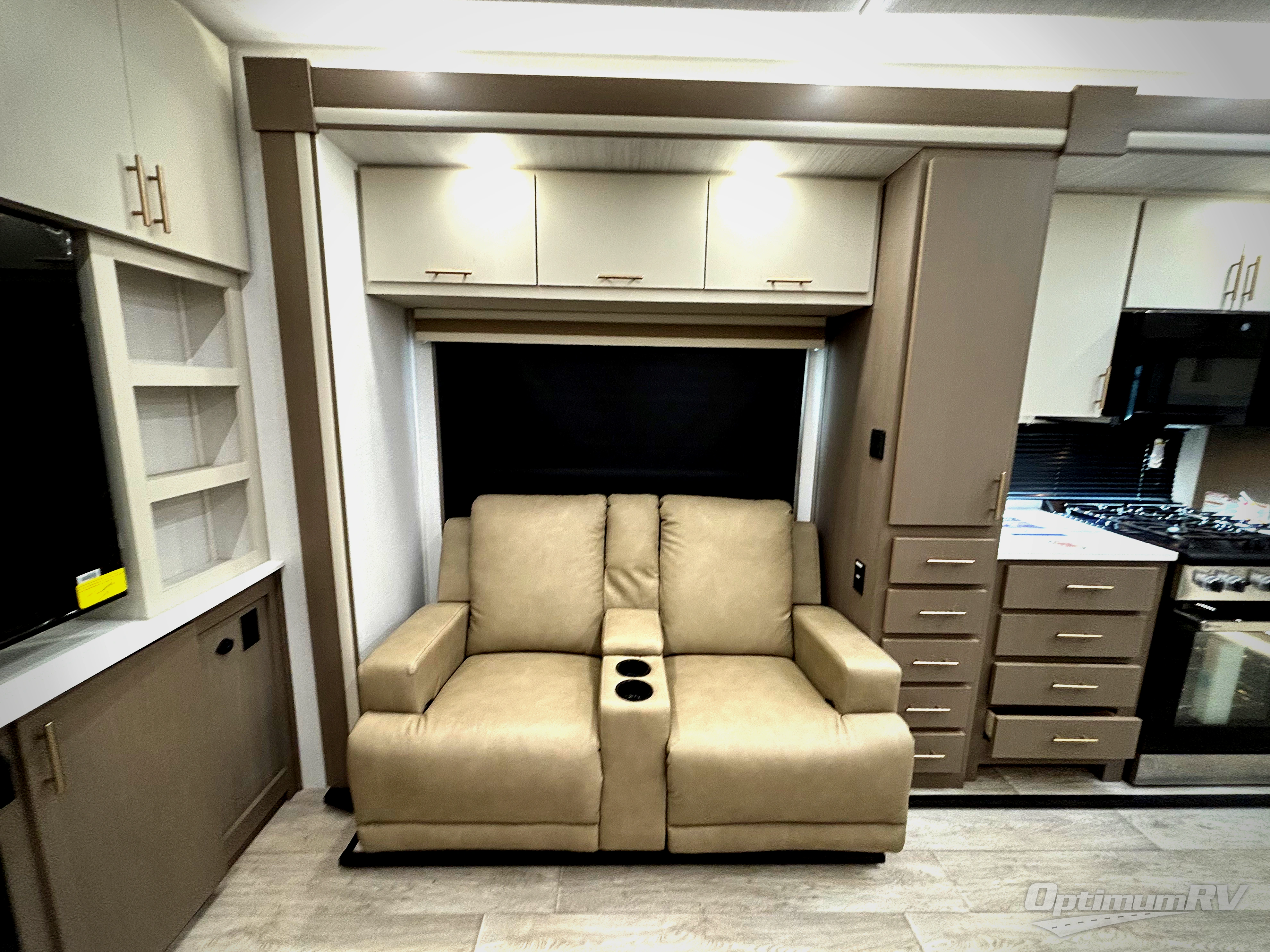 You will feel right at home in this travel trailer! After you've unloaded the pass-through storage and set up the 21' power awning, start preparing lunch will all of the countertop space next to the kitchen sink. You can get a good night's rest on the king bed slide in the front private bedroom and store your clothes in the large front wardrobe. There is even a sliding door washer and dryer prep here if you want the option to add these appliances. The adjustable free standing table offers a comfortable place to enjoy your meals and play card games. Inside the rear living area, you will find opposing slides with a tri-fold sofa and theater seats, as well as a second set of theater seats directly across from the rear entertainment center and fireplace!
