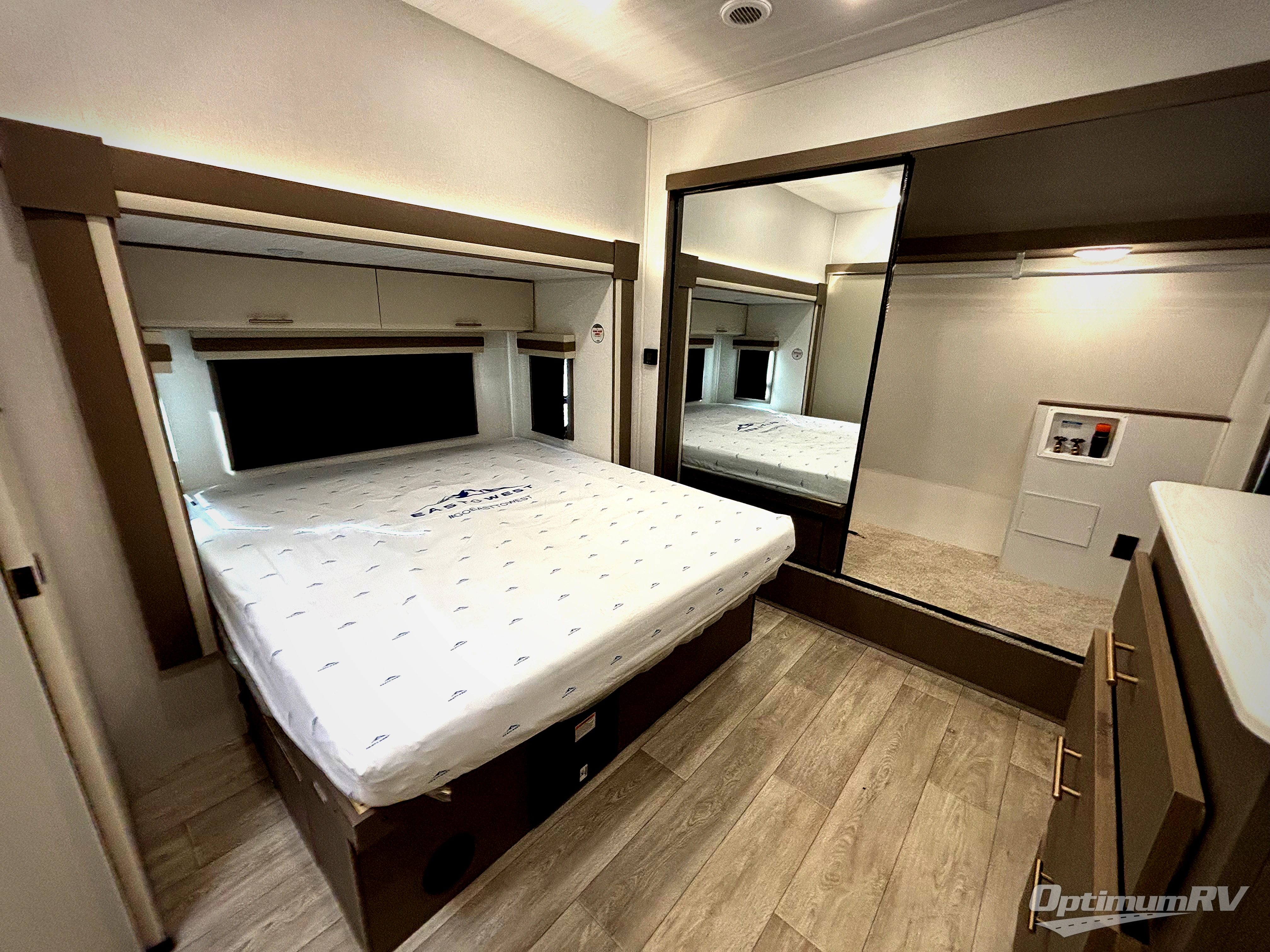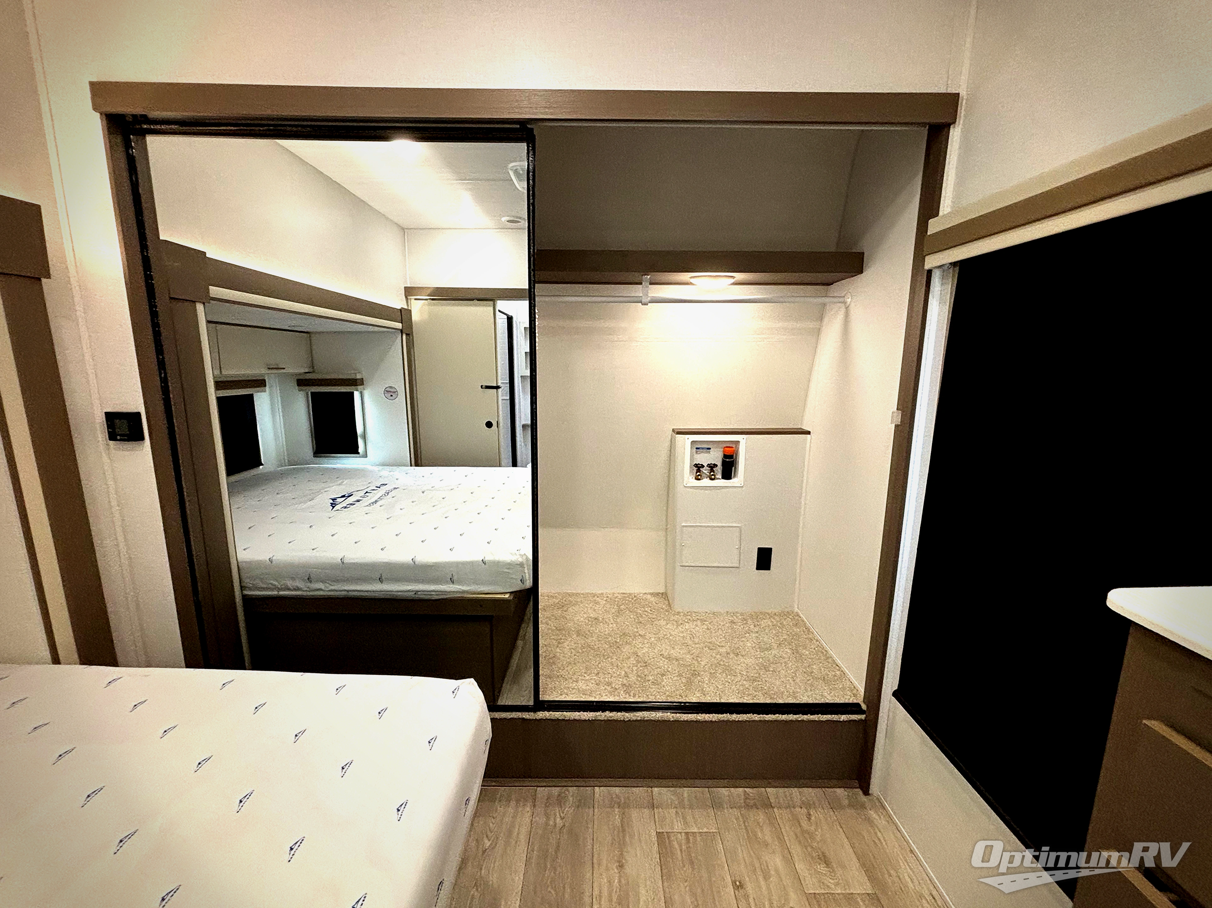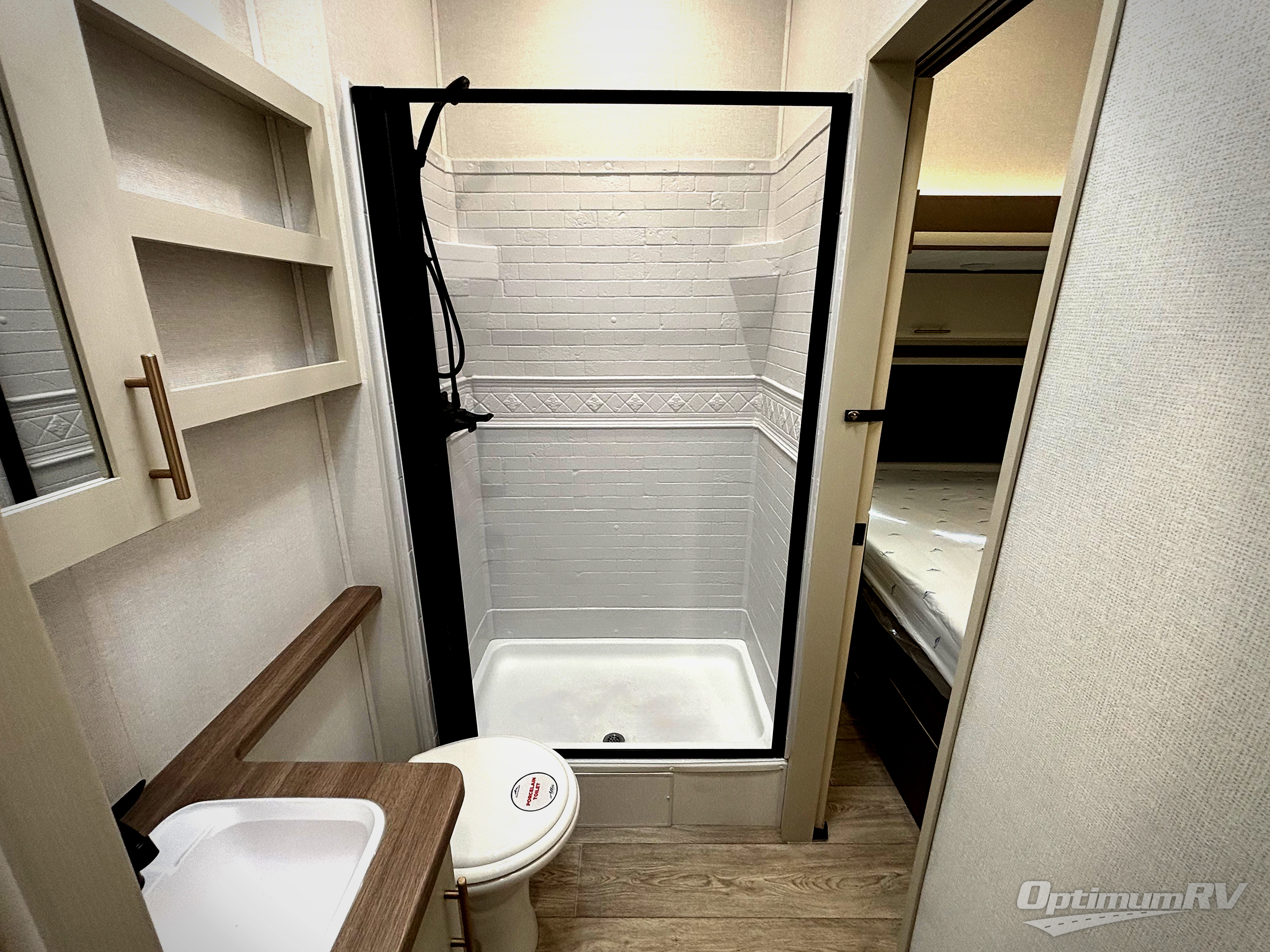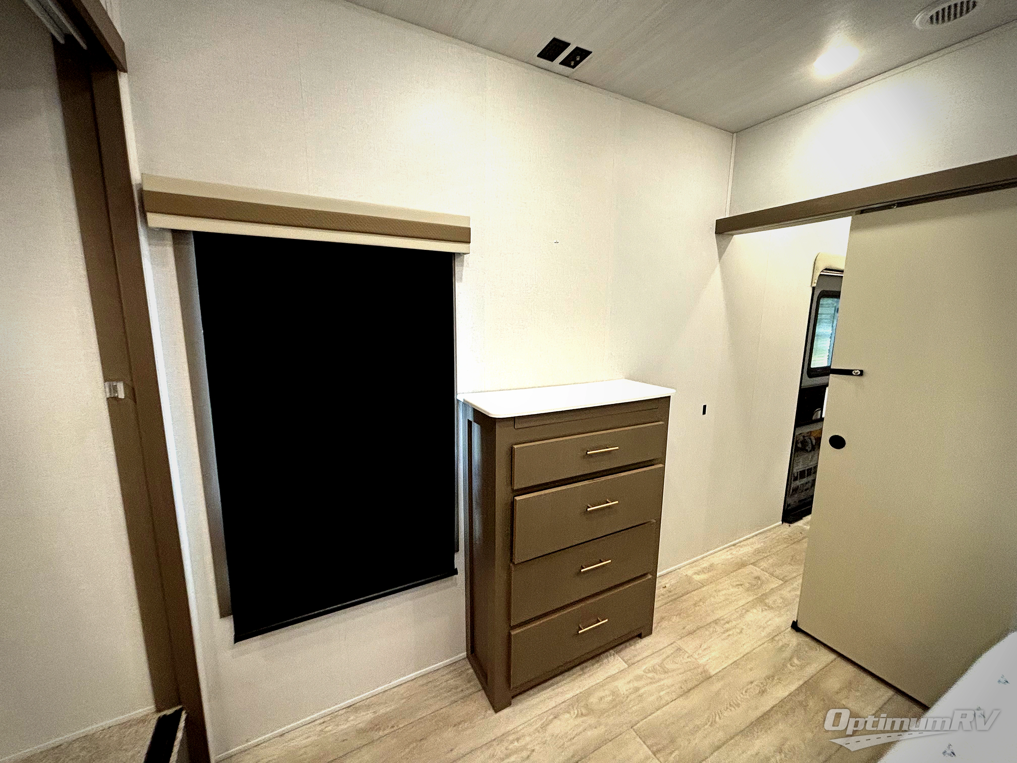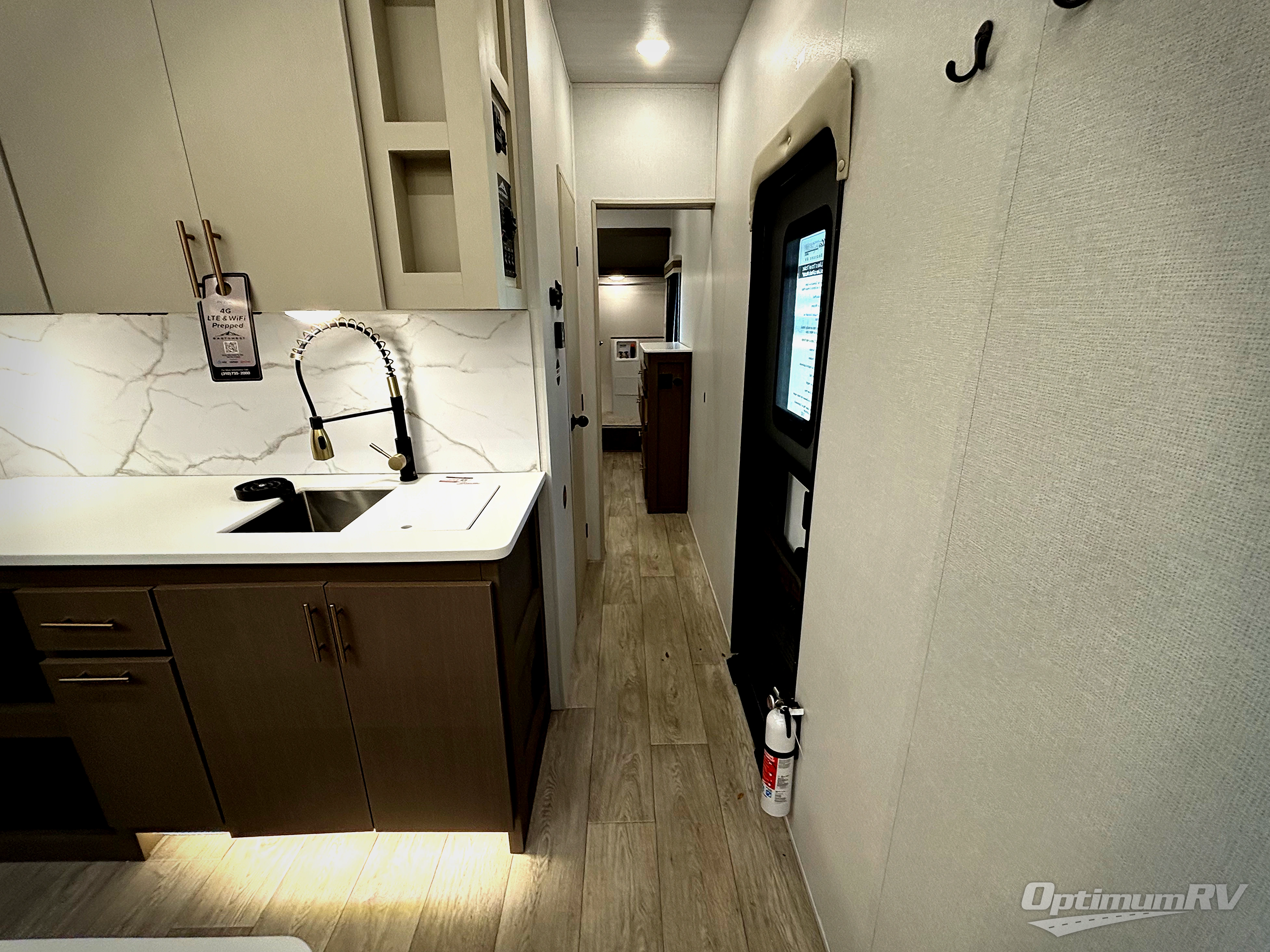 You will feel right at home in this travel trailer! After you've unloaded the pass-through storage and set up the 21' power awning, start preparing lunch will all of the countertop space next to the kitchen sink. You can get a good night's rest on the king bed slide in the front private bedroom and store your clothes in the large front wardrobe. There is even a sliding door washer and dryer prep here if you want the option to add these appliances. The adjustable free standing table offers a comfortable place to enjoy your meals and play card games. Inside the rear living area, you will find opposing slides with a tri-fold sofa and theater seats, as well as a second set of theater seats directly across from the rear entertainment center and fireplace!