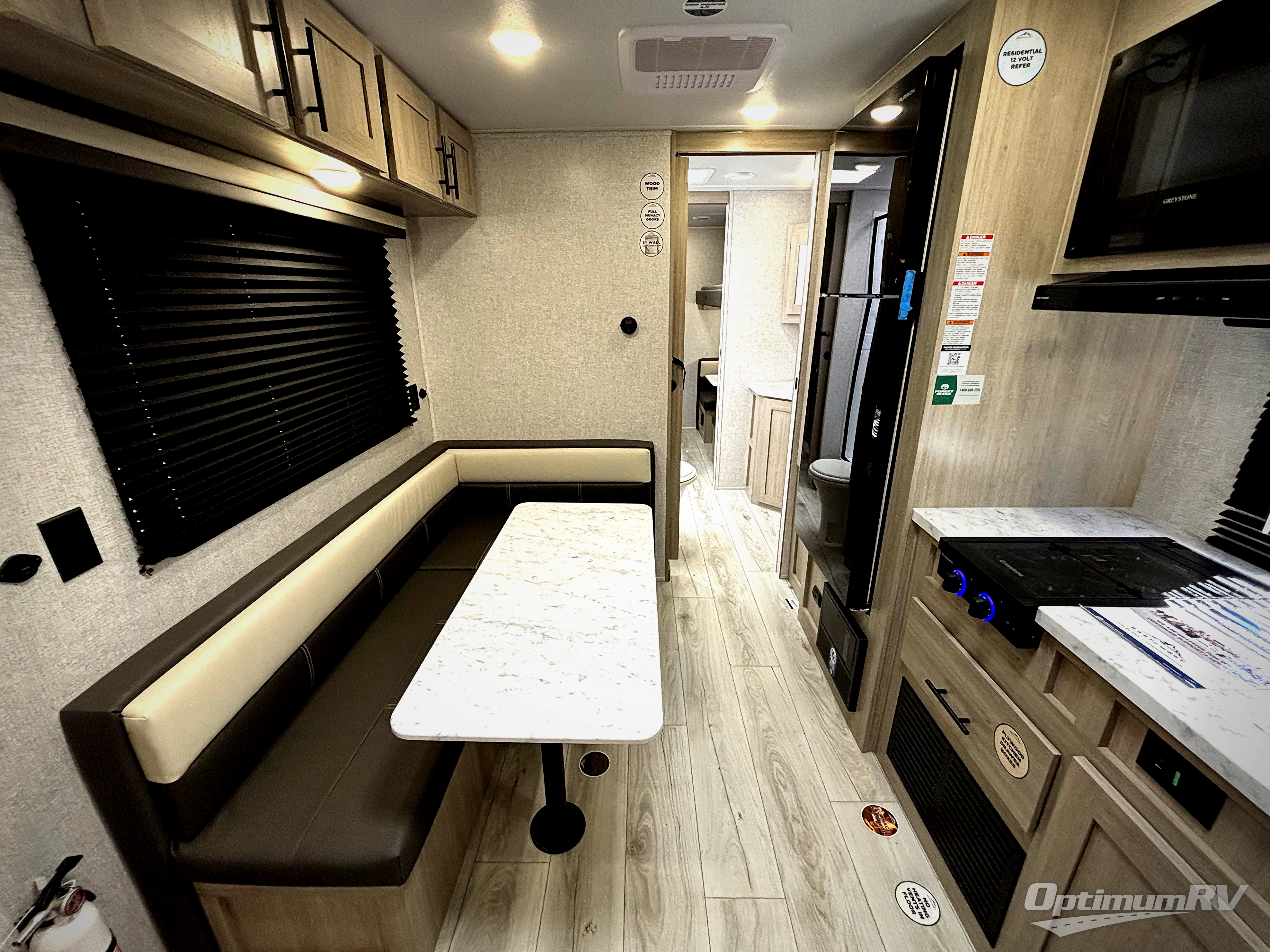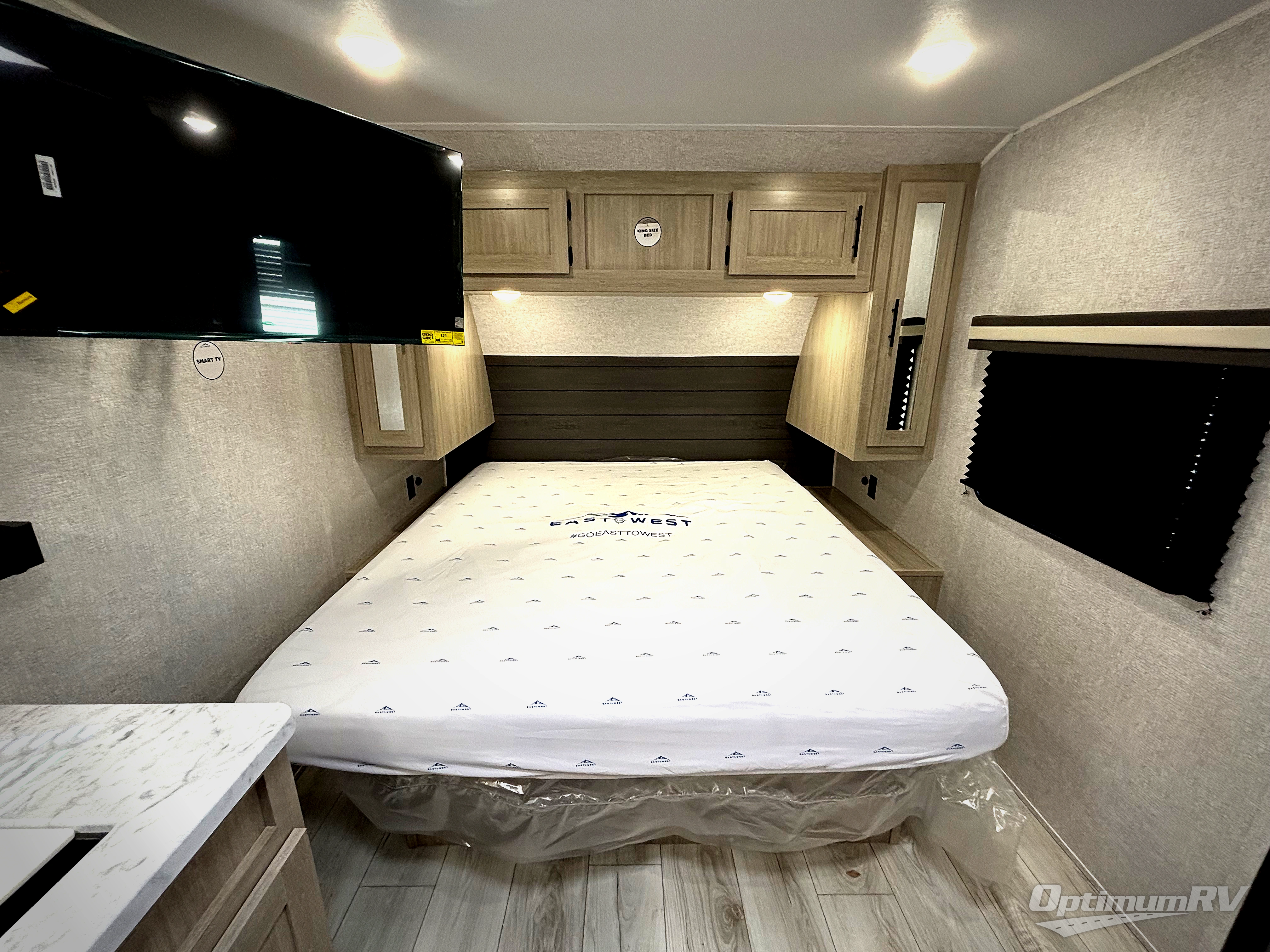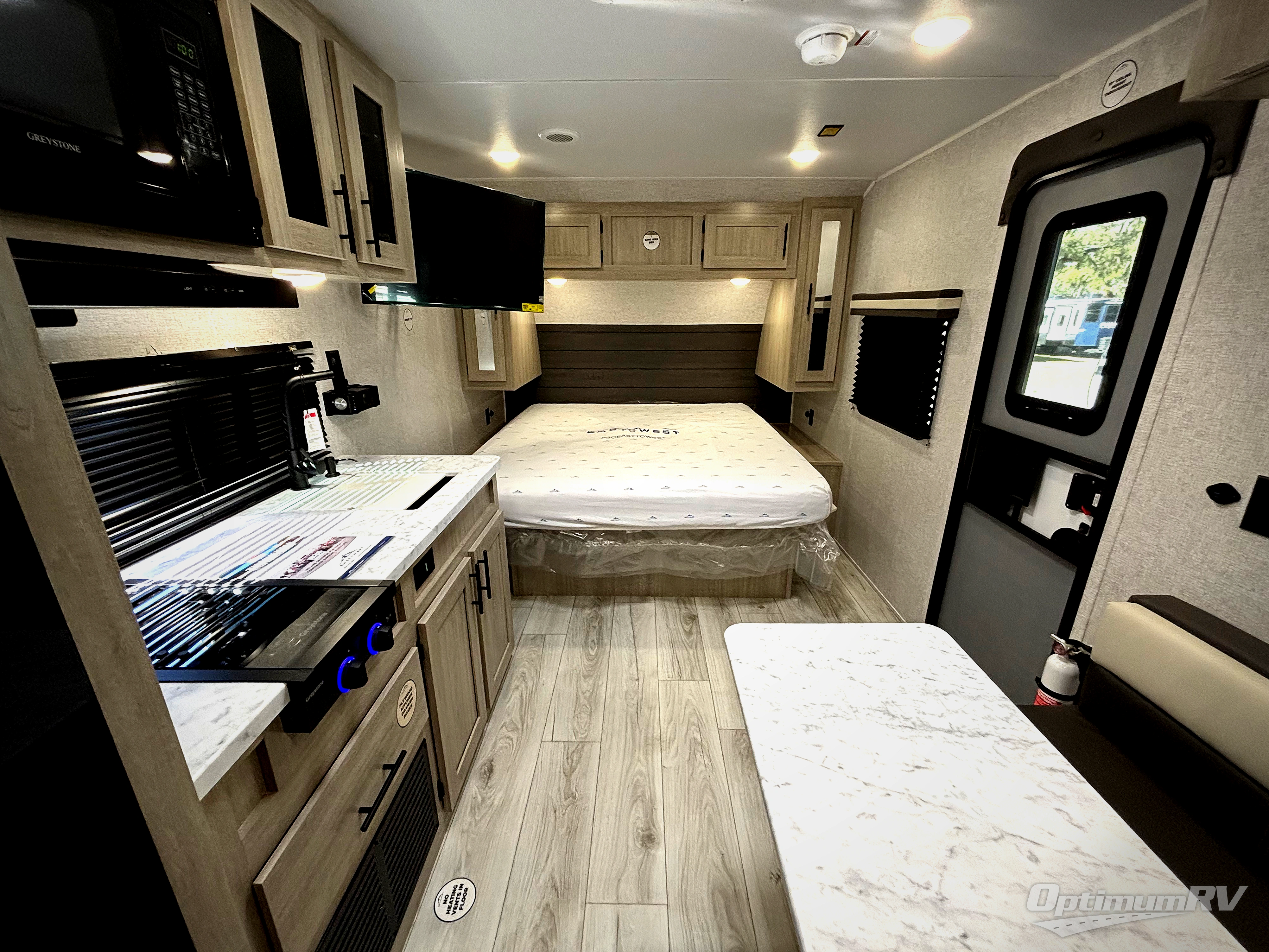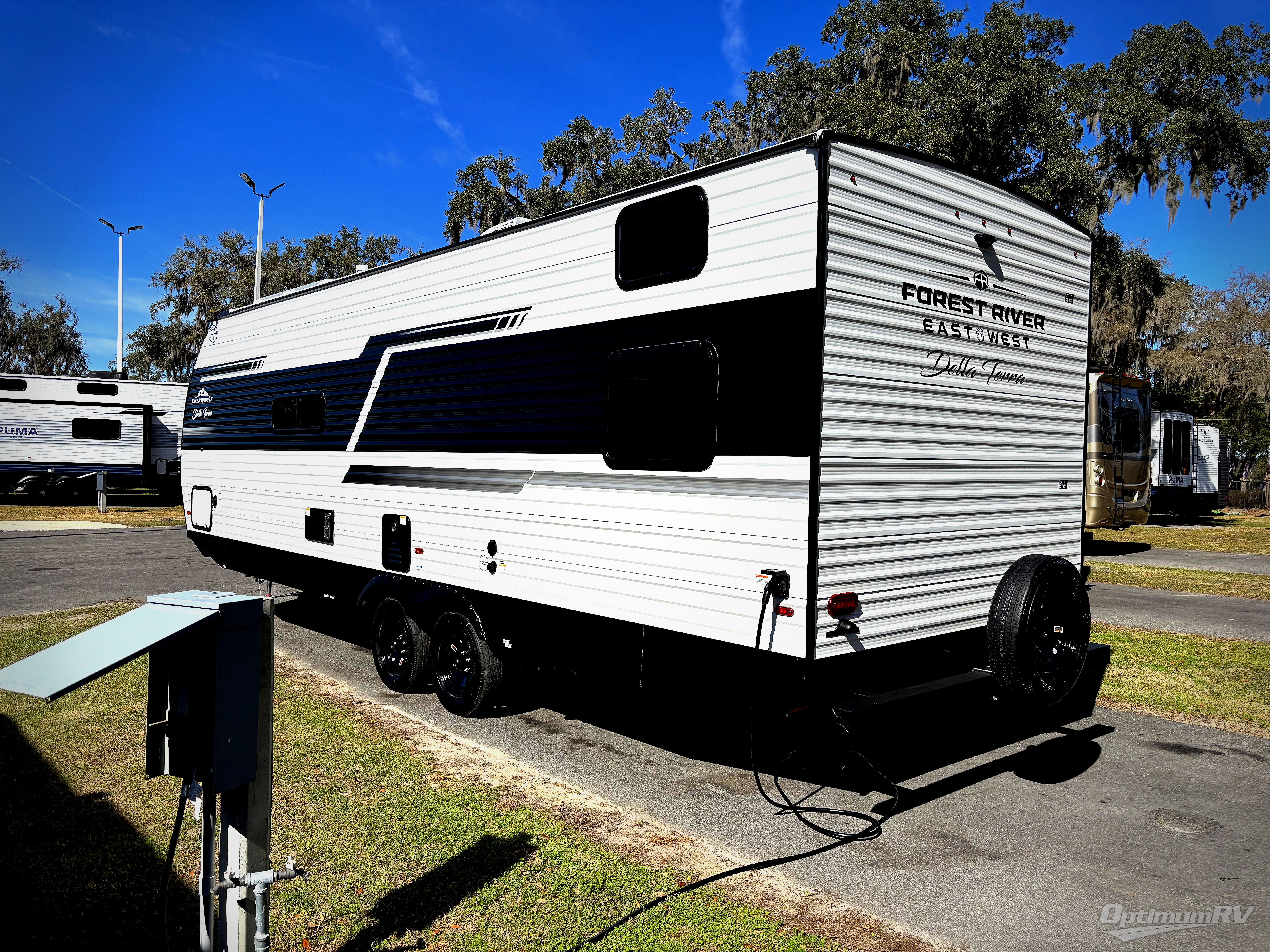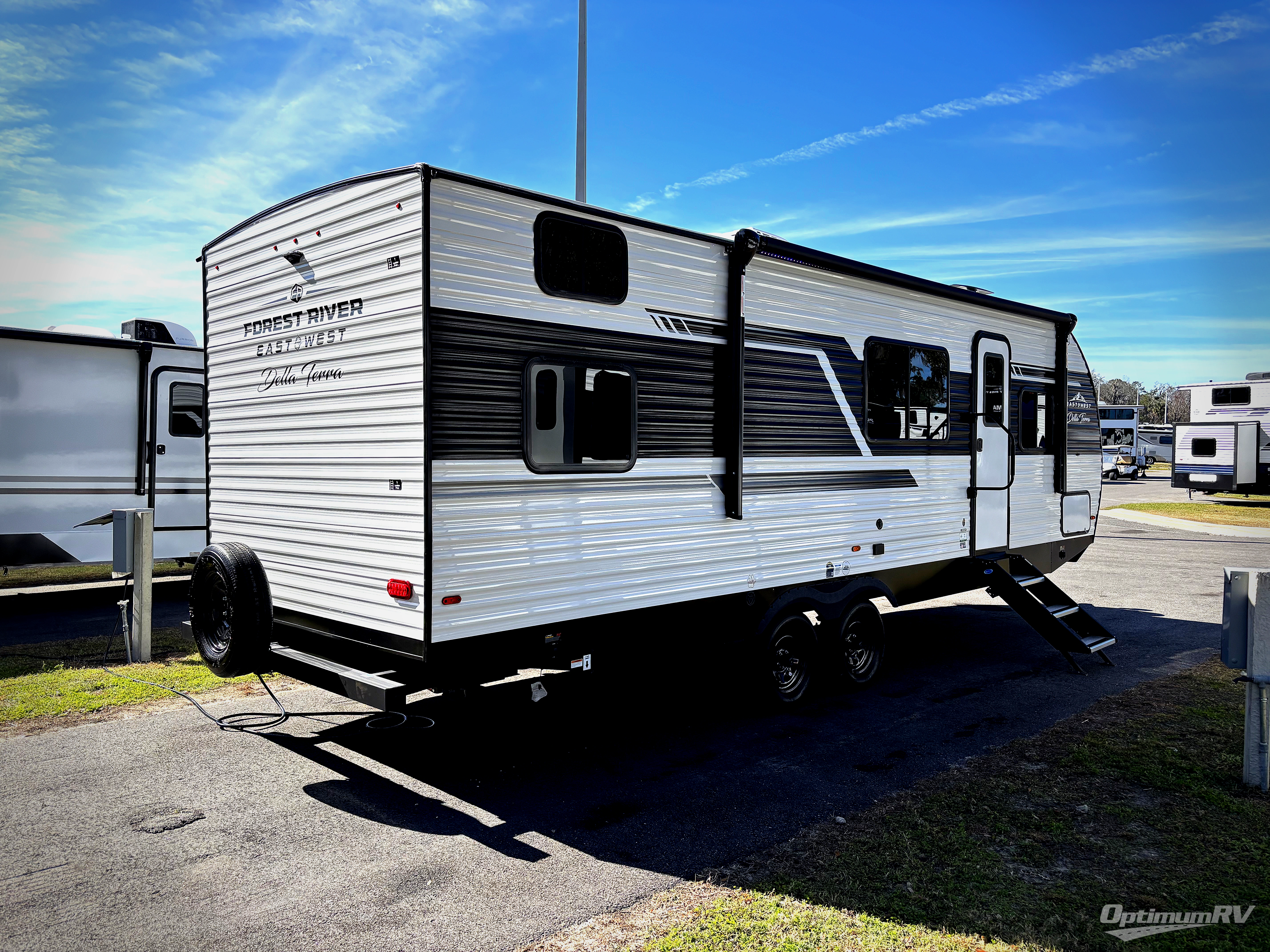 Each Della Terra travel trailer by EAST TO WEST is constructed with an enclosed and heated underbelly and enclosed holding tanks for added protection against the elements. There is also a power tongue jack with an LED light for easy set up and a power awning with LED lights you can rest under after you've unpacked. The Explore Comfort Package comes seamless pressed countertops, kitchen backsplash, window valance package with black night shades, and many more comforts. You will also appreciate the Adventure Outdoor Package with backup camera prep and solar prep, a tankless water heater, an RV grill quick disconnect, and a universal docking station with battery disconnect.