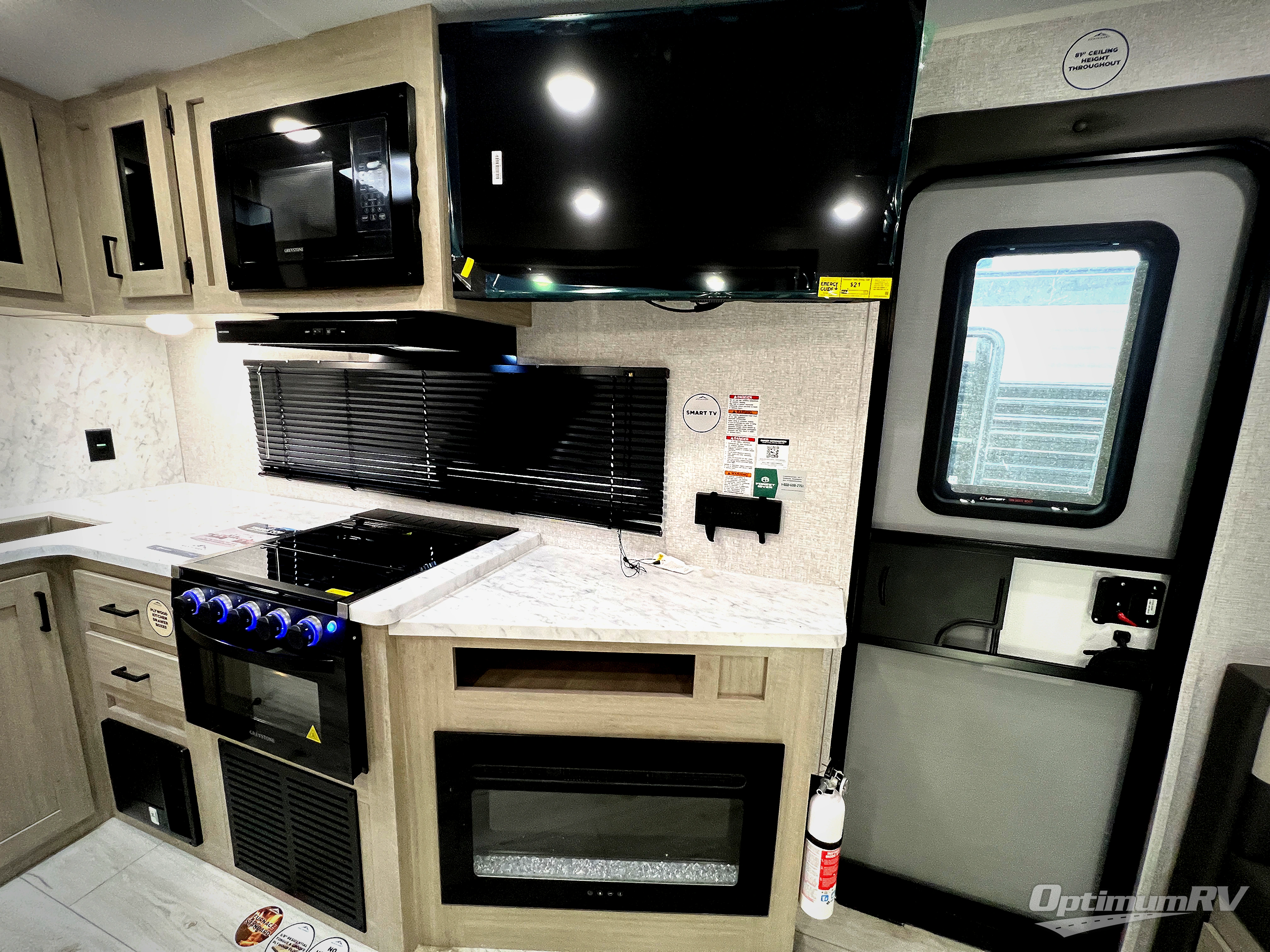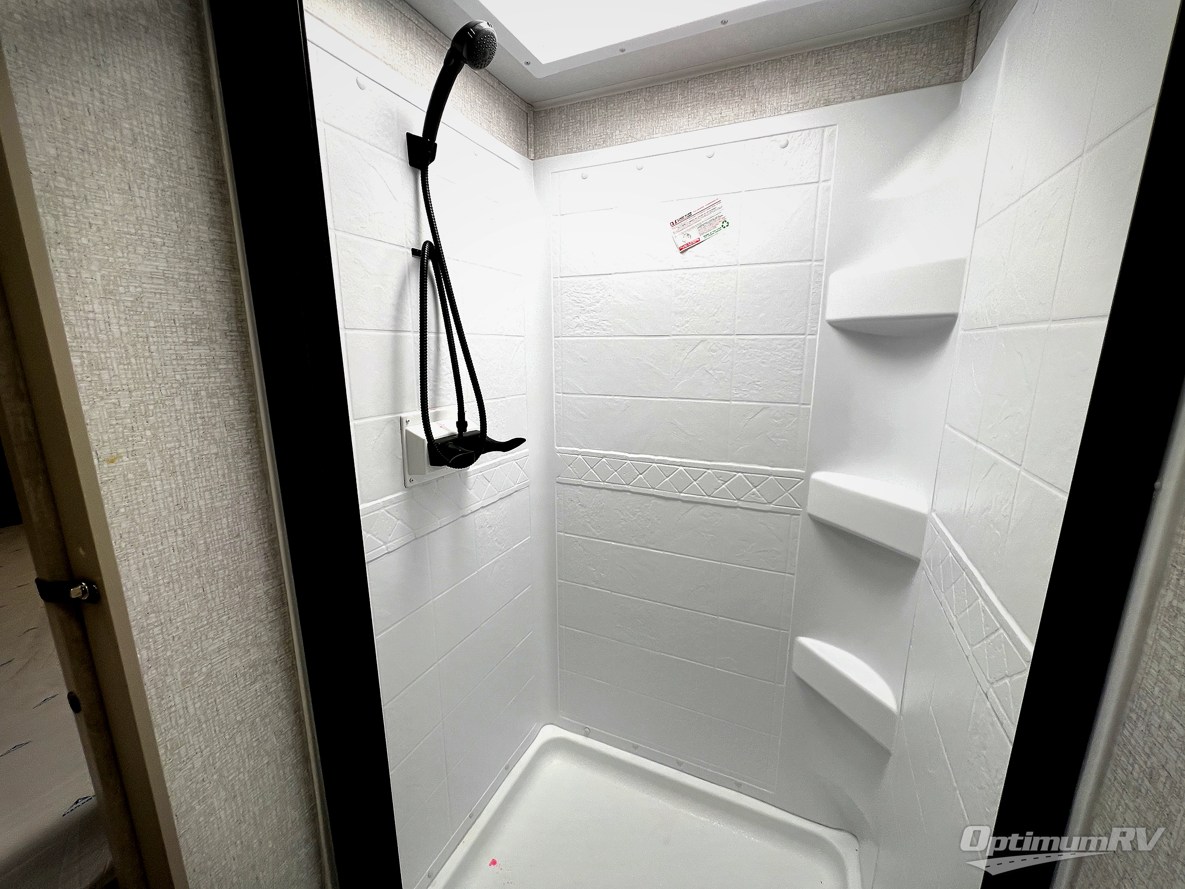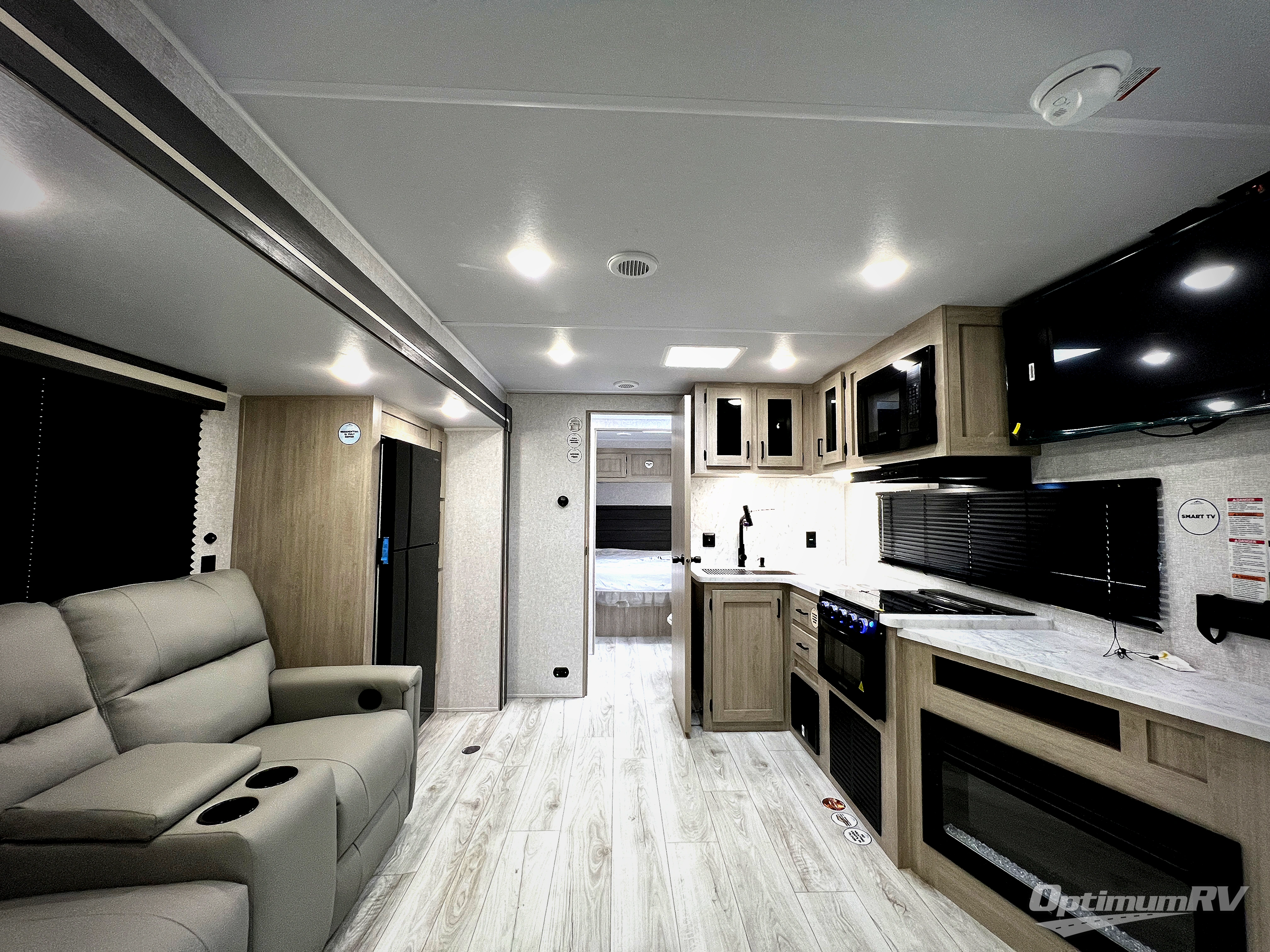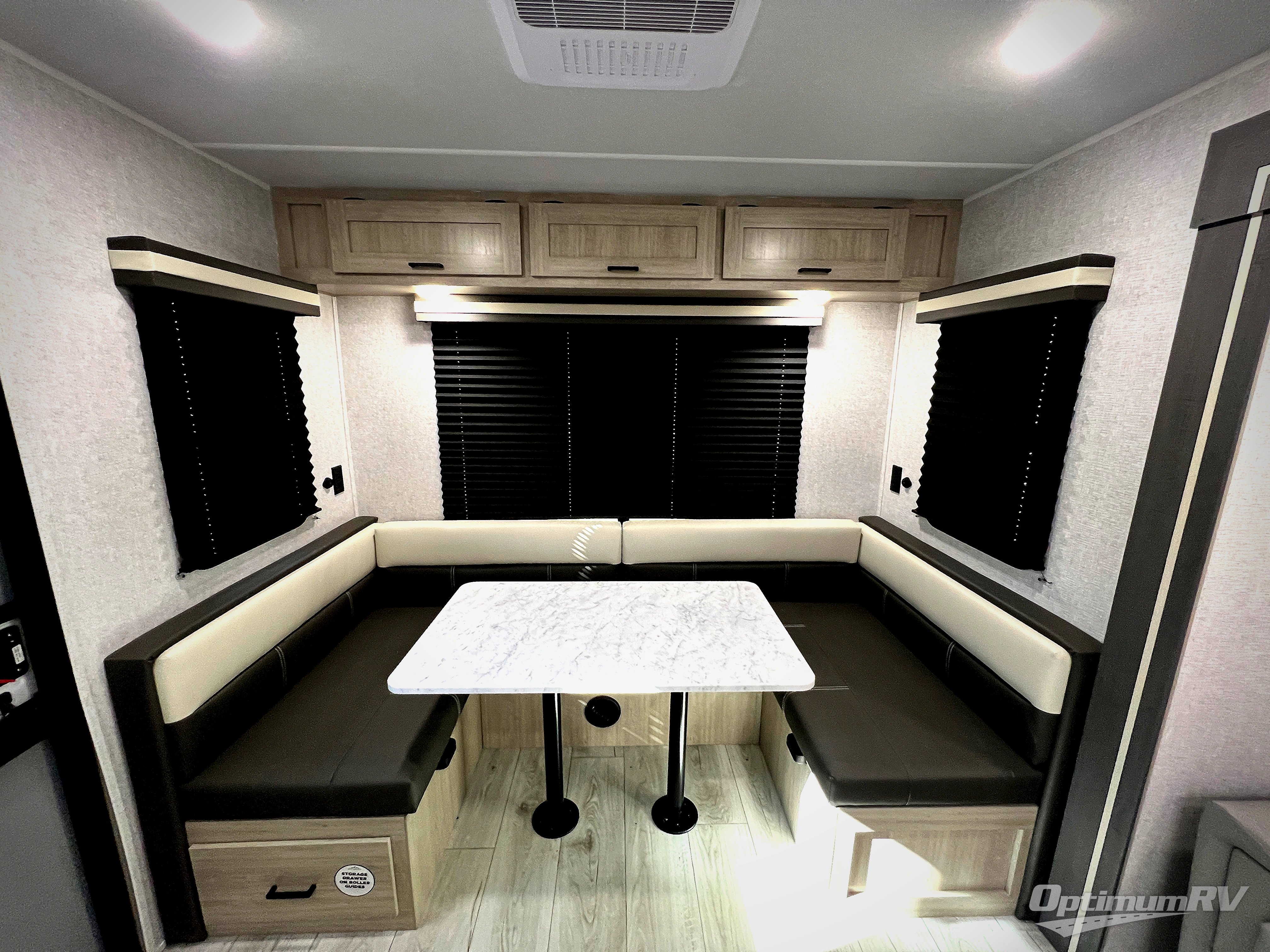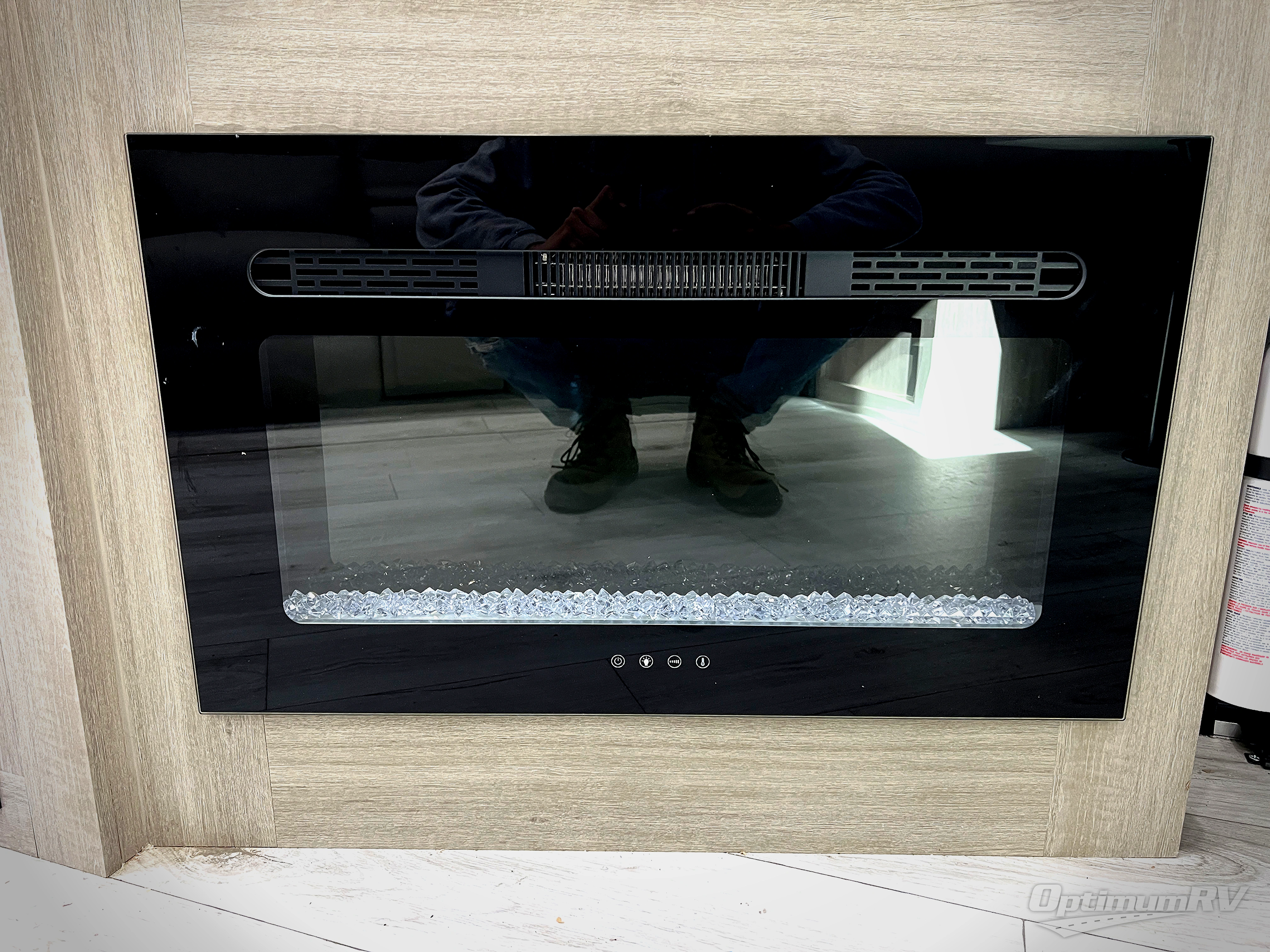 When you are wanting a little more interior space in your next travel trailer, take a look inside! This large slide out widens the main living space so you can easily make meals using full amenities without having to move for someone walking from the front bedroom and walk-through bath to the U-shaped dinette in the back. For sleeping, there is a king-size bed with storage on both sides at the very front of this unit giving you privacy from the rest, and even a private second entry/exit door from within the bedroom. You will find storage beneath the bed for larger items or extra blankets, plus a space saving sliding door. The U-shaped dinette and jackknife sofa offer comfortable seating as well as extra sleeping space for overnight guests, and the fireplace is just a nice feature to enjoy. On the outside, an 18' awning provides a large outdoor living area protected from the elements, and the oversized pass-through will house all of your exterior gear like lawn chairs, outdoor games and rugs, plus so much more!