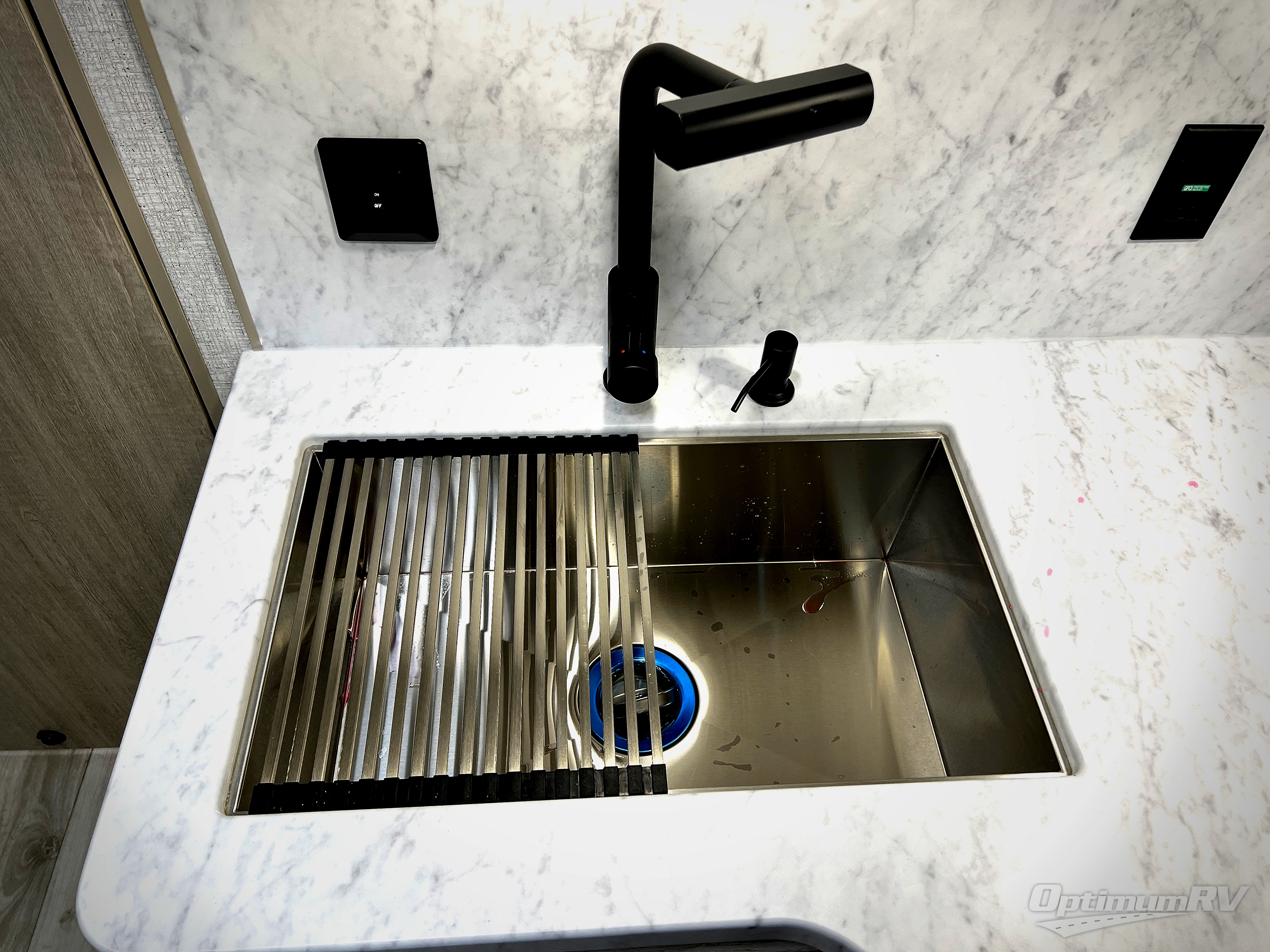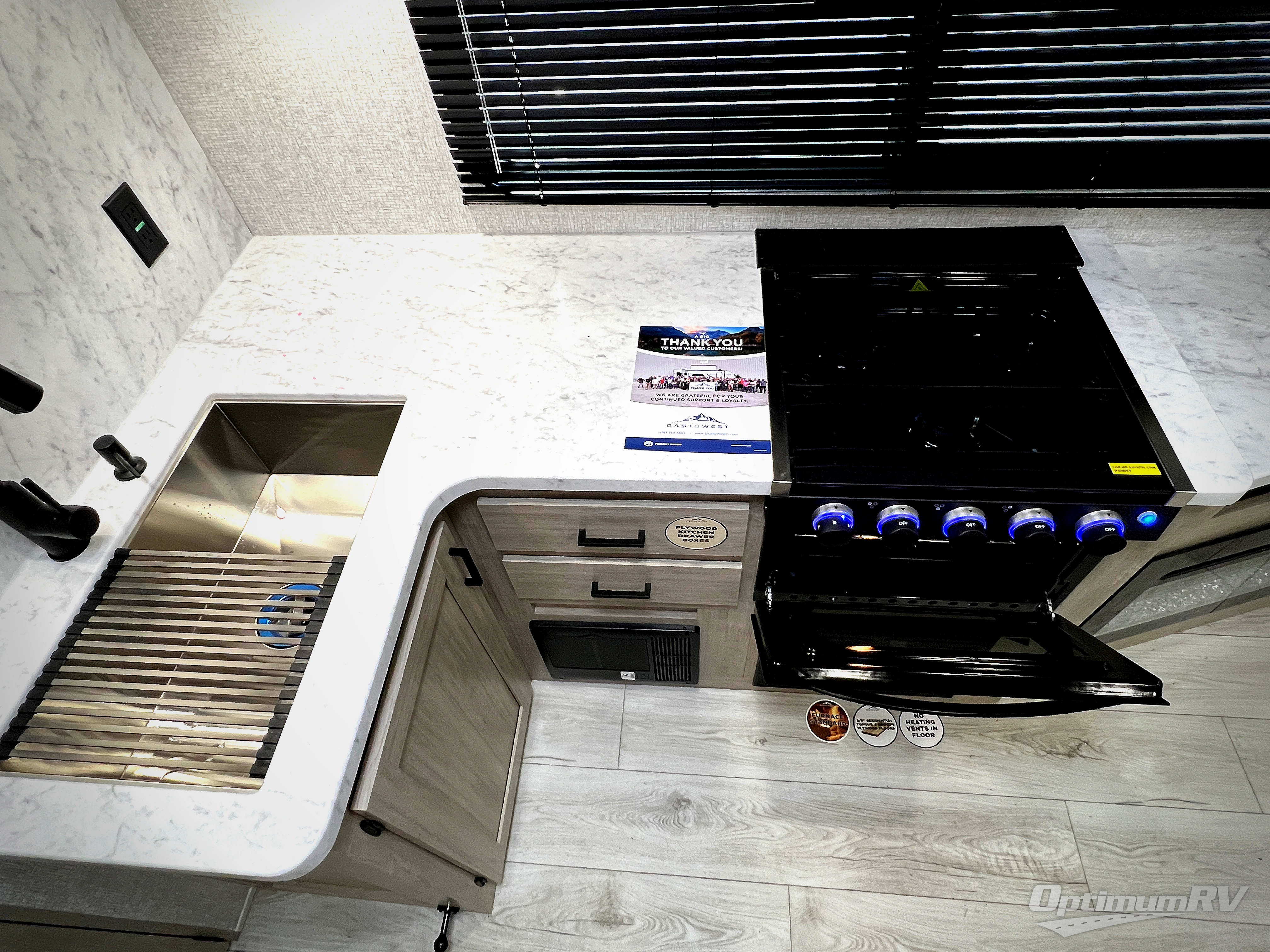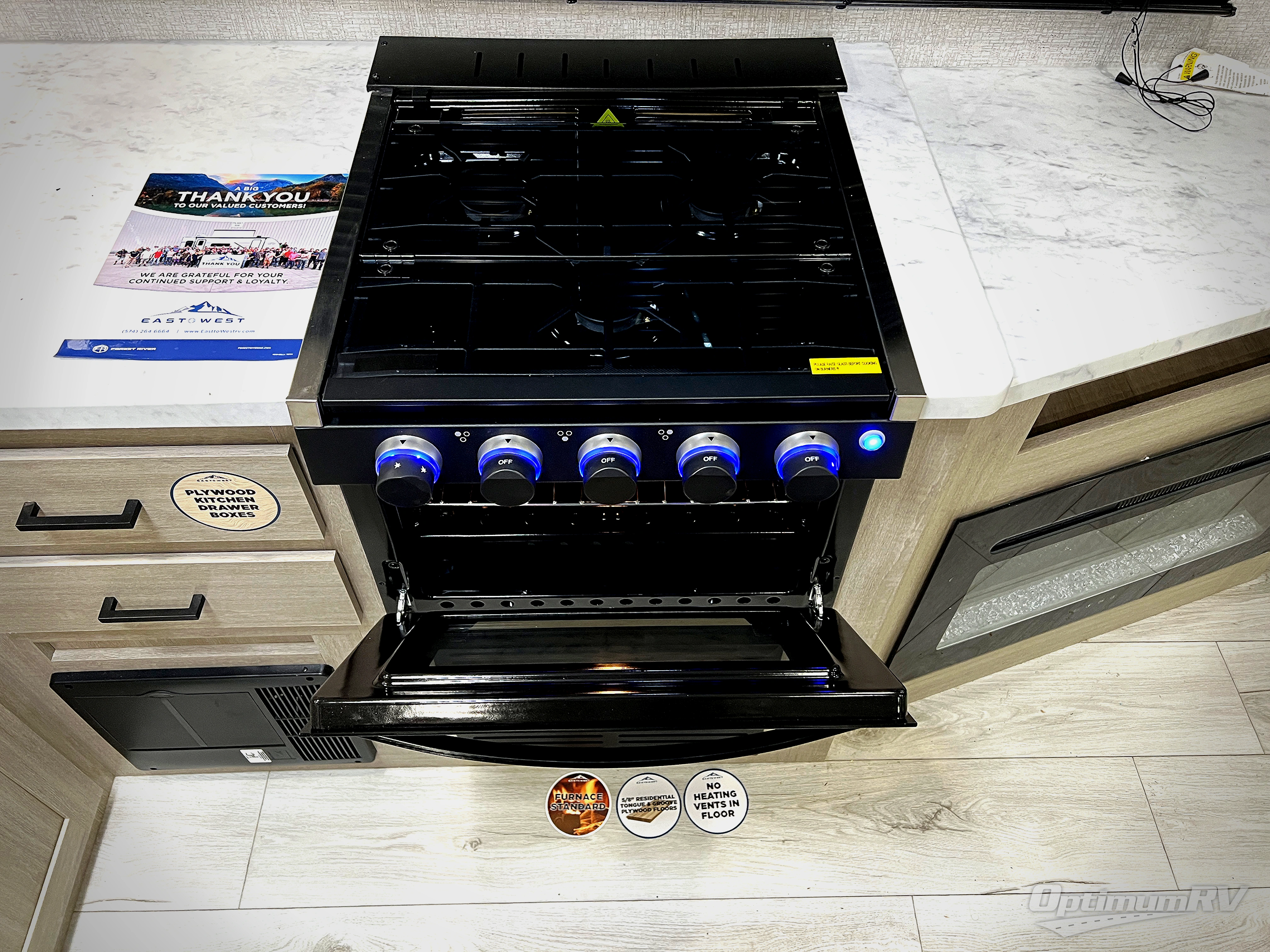 Each Della Terra travel trailer by EAST TO WEST is constructed with an enclosed and heated underbelly and enclosed holding tanks so you can camp all year long. There is also a power tongue jack with an LED light for easy set up and a power awning with LED lights you can rest under after you've unpacked. The Explore Comfort Package comes seamless pressed countertops, kitchen backsplash, window valance package with black night shades, and many more comforts. You will also appreciate the Adventure Outdoor Package with backup camera prep and solar prep, a tankless water heater, an RV grill quick disconnect, and a universal docking station with battery disconnect.