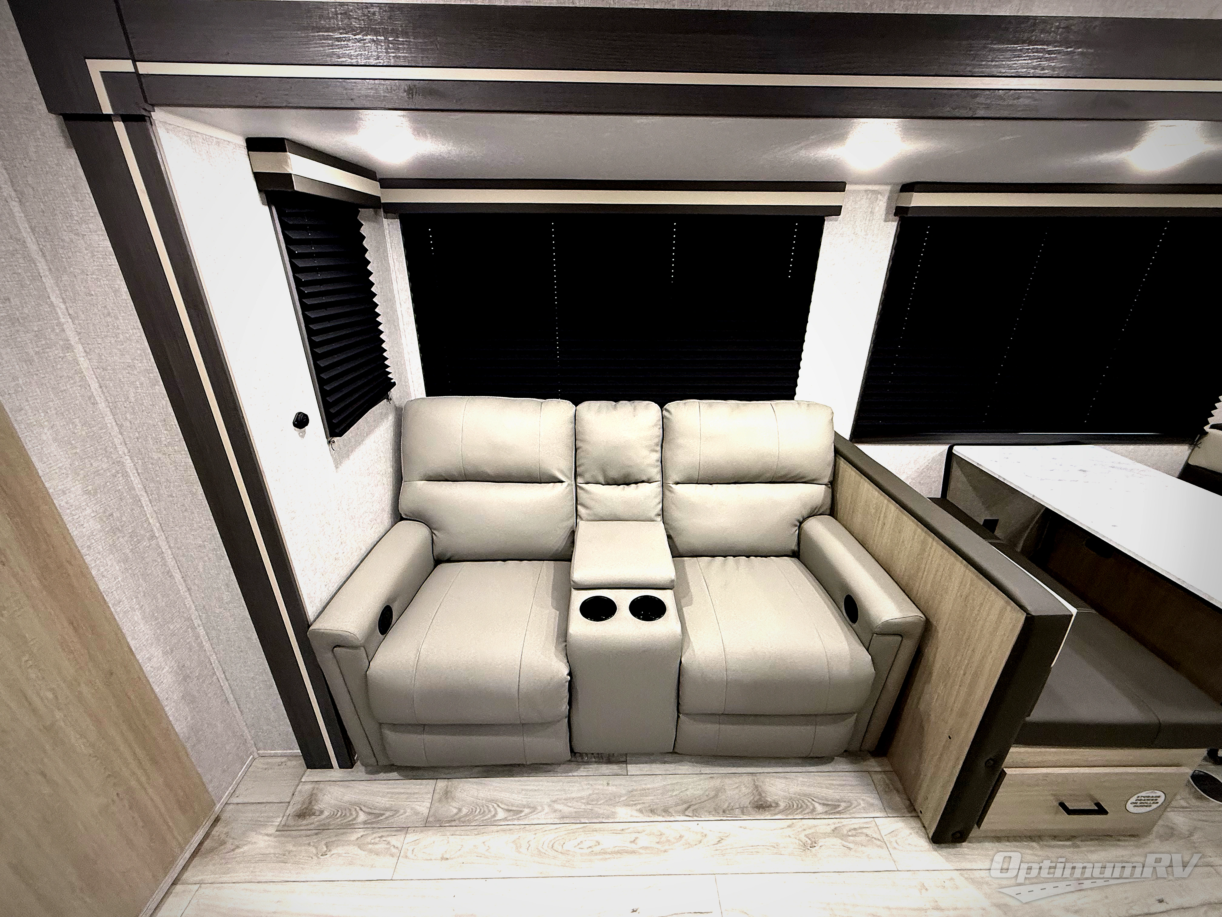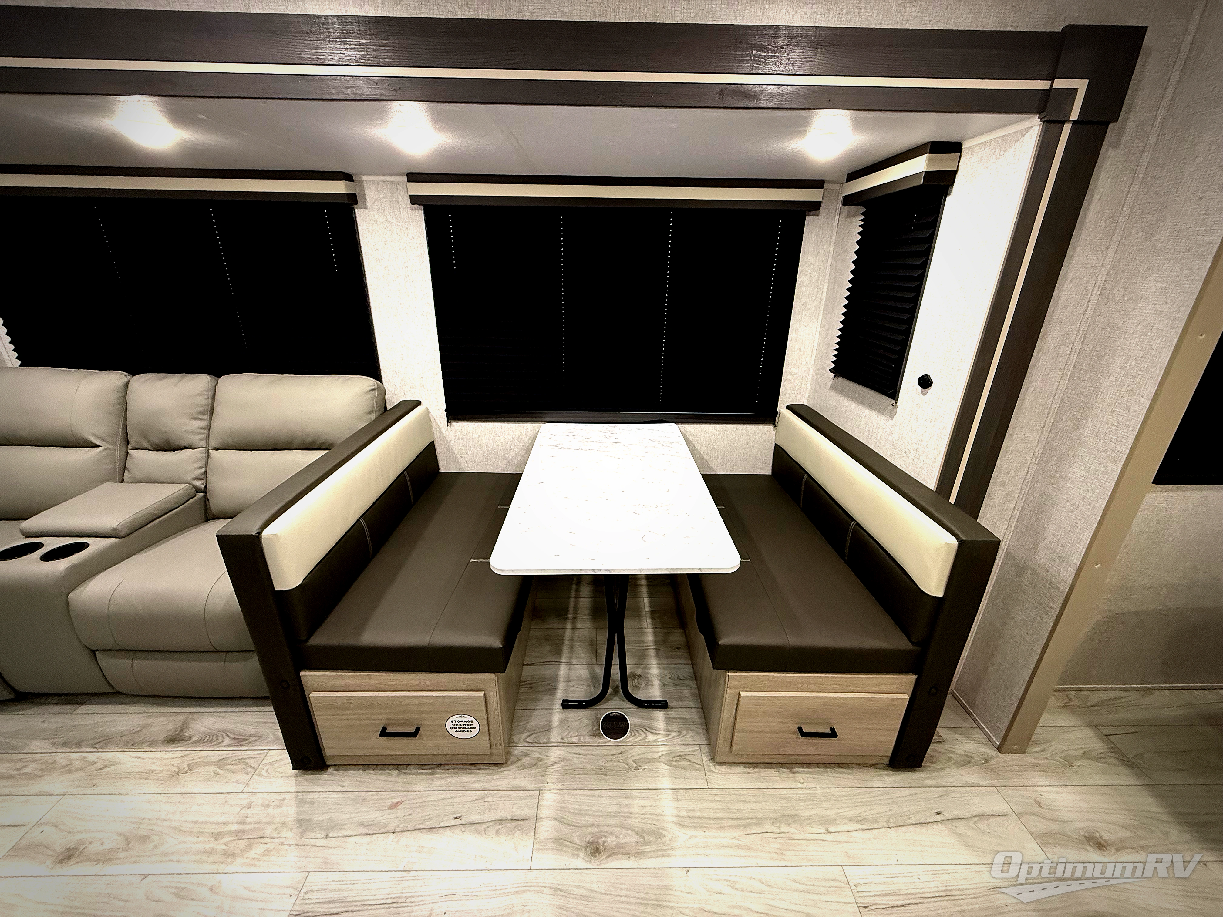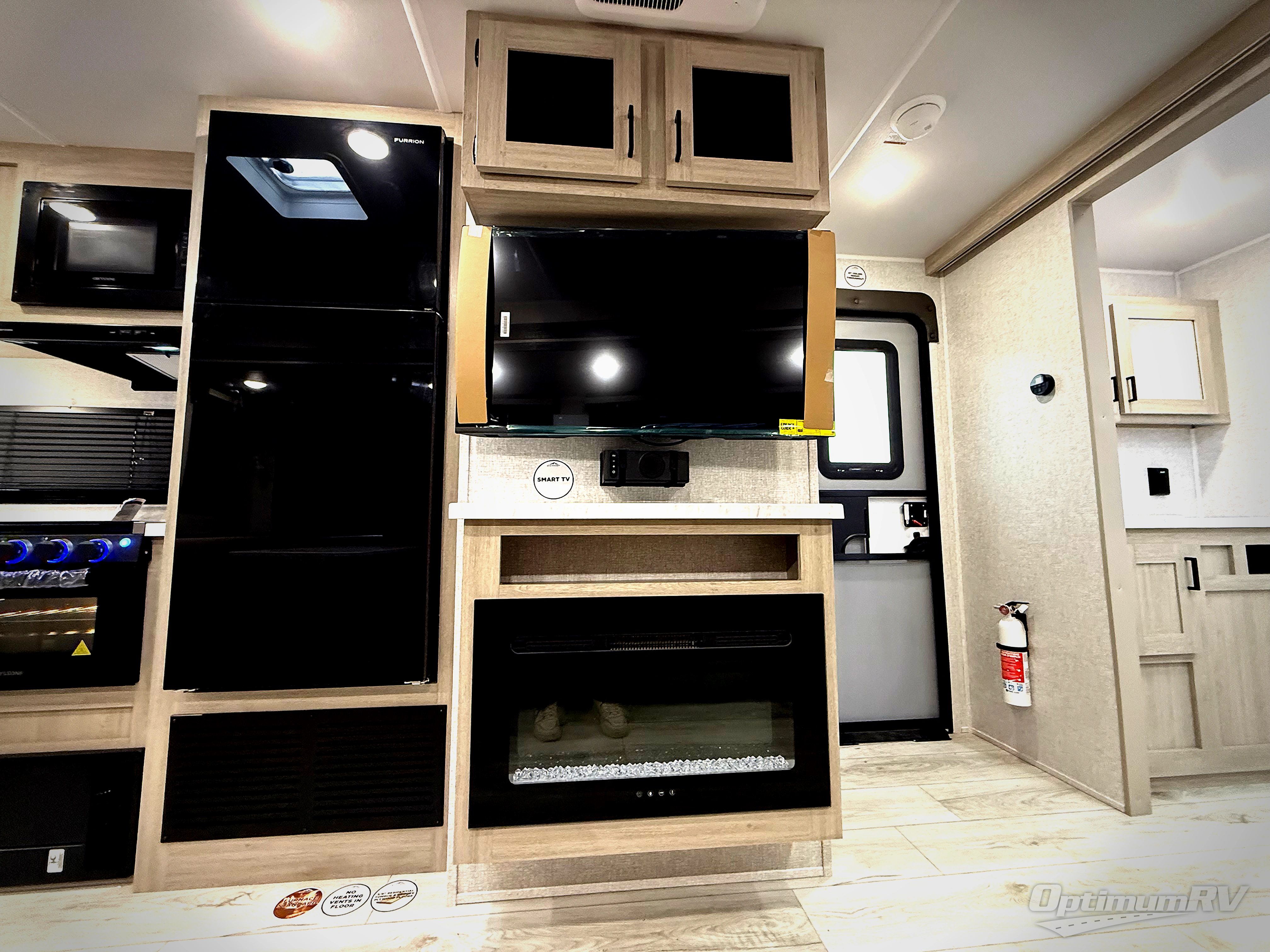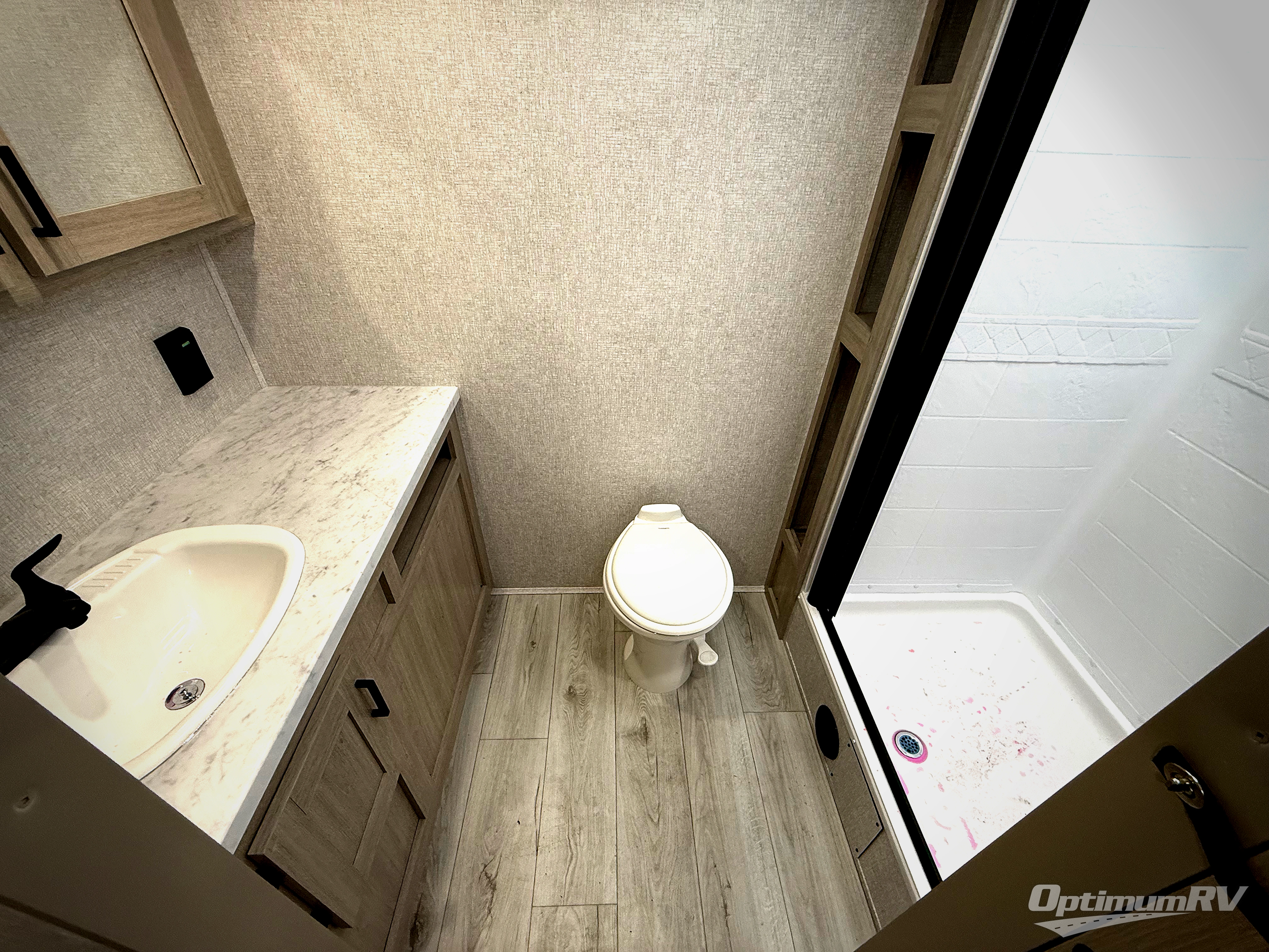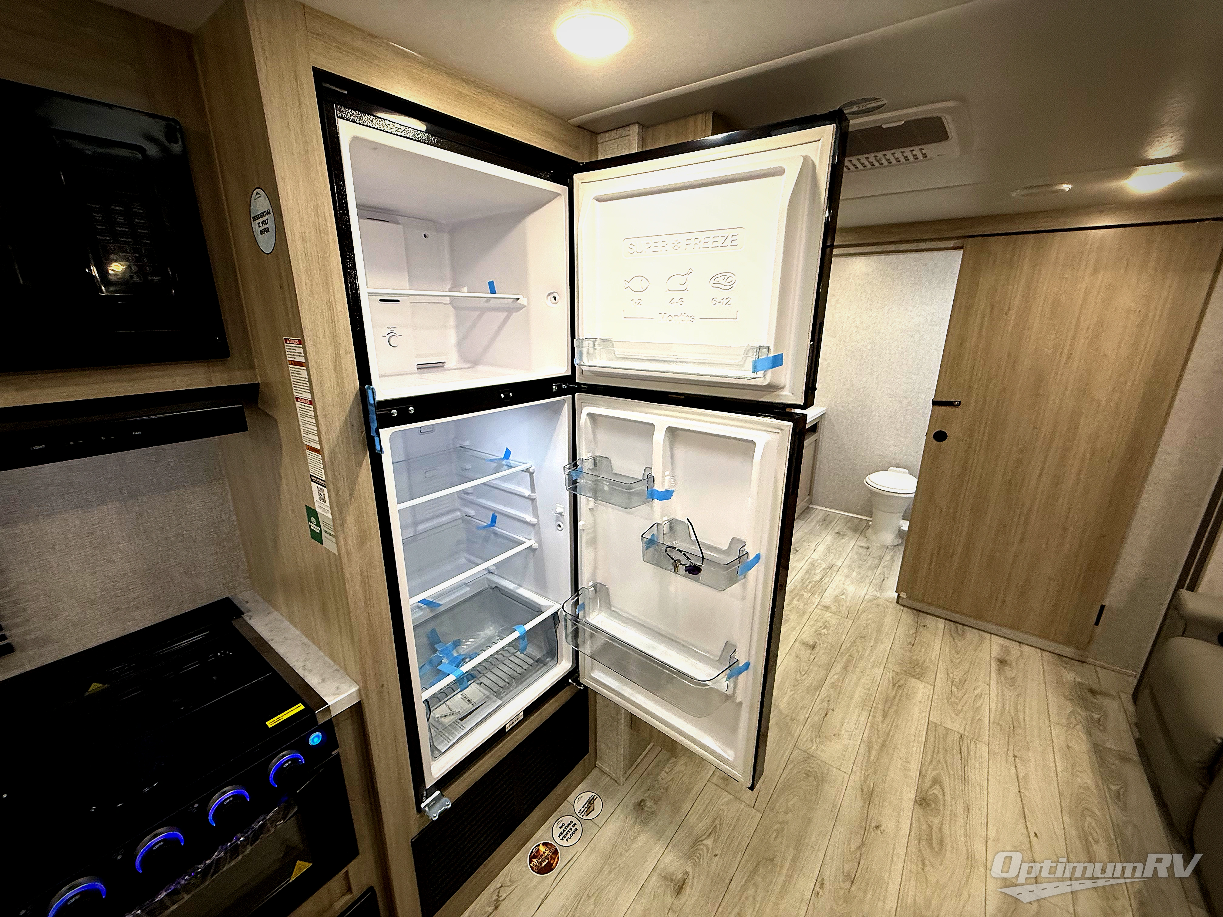 When you are wanting a little more interior space in your next travel trailer, take a look inside! This large slide out widens the center so you can easily make meals using full amenities without having to move for someone walking from the front private bedroom to the rear spacious bathroom. There is a king-size bed with storage on both sides, underneath and above, plus a space saving sliding door. The booth dinette and jiffy sofa offer comfortable seating as well as extra sleeping space for overnight guests. The fireplace is just a nice feature to enjoy, and the large pantry with washer/dryer prep gives you the option to make laundry day easier!