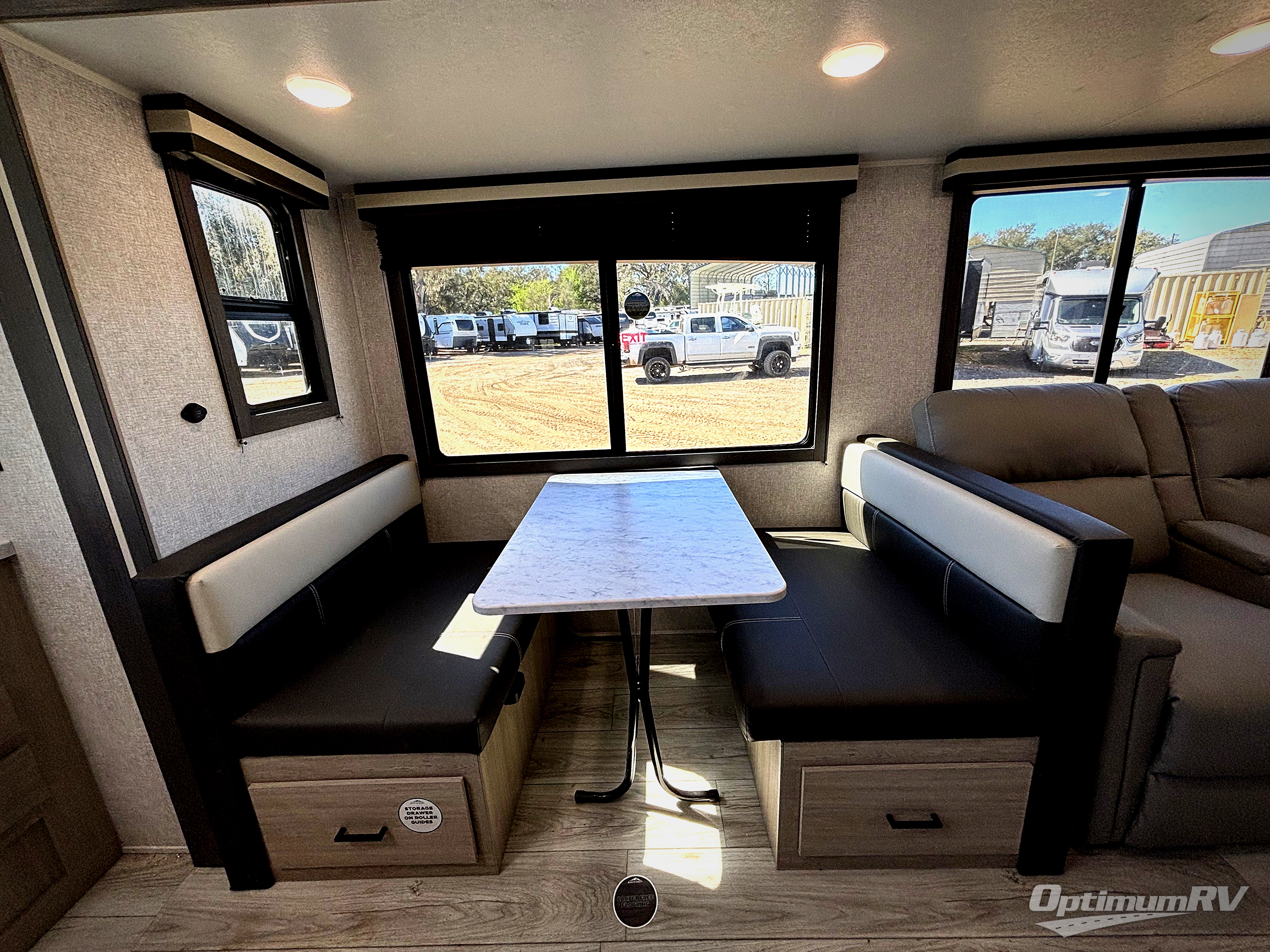 This travel trailer will feel just like home with its spacious interior and at-home comforts. Since there are dual entry doors, you can enter in through the front bedroom or the rear kitchen and living area. A king bed slide in the bedroom is sure to bring comfort, and there is a closet to keep your clothes wrinkle-free, plus washer and dryer prep. The second slide out is found in the living room, and here you can relax on the jiffy sofa or dine at the booth dinette. The chef of your group will love cooking in the rear kitchen, and there is generous counter space here to set out snacks. An entryway pantry and closet will provide additional storage for snacks, jackets, and more!