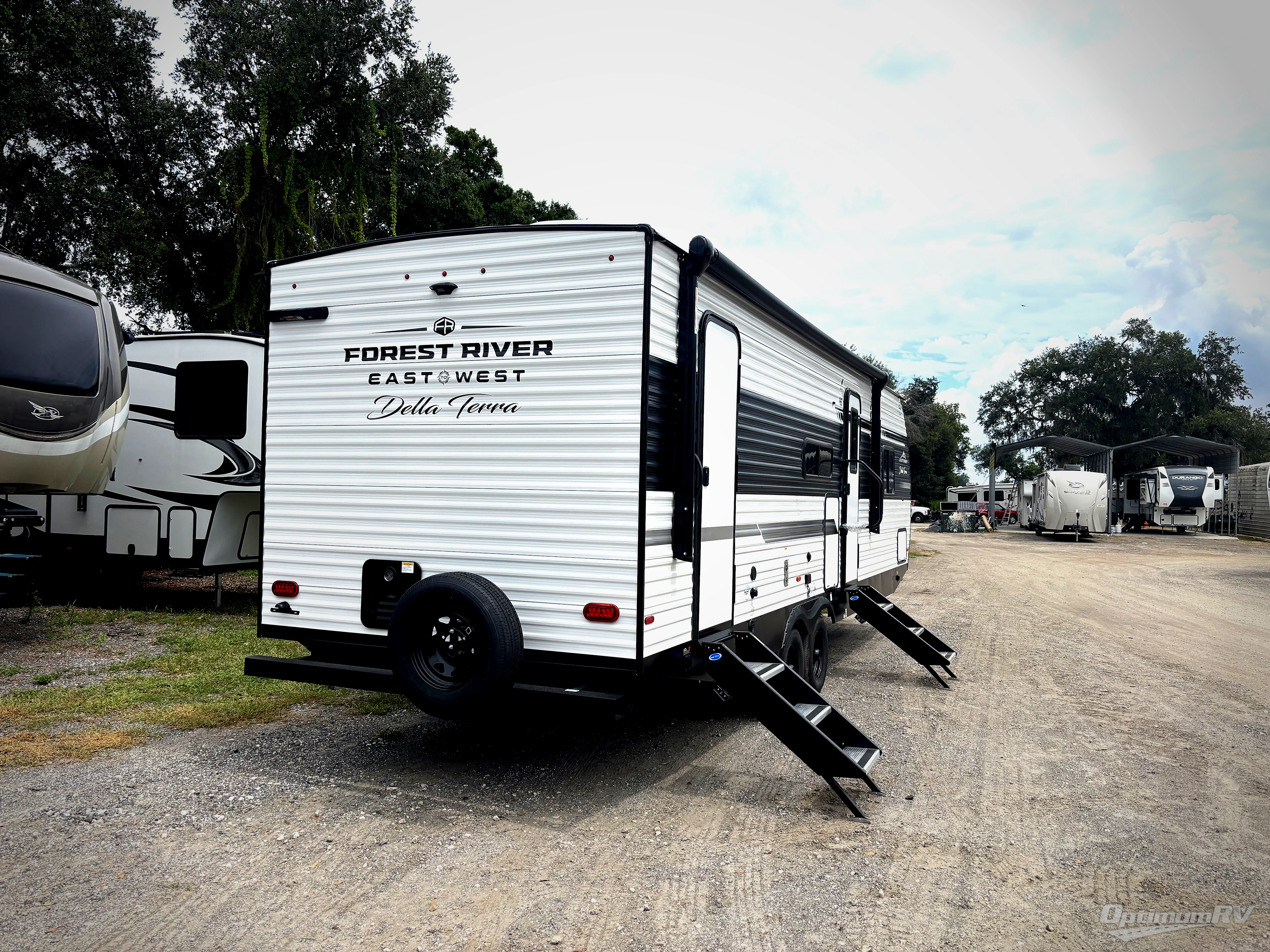 Each Della Terra travel trailer by EAST TO WEST is constructed with an enclosed and heated underbelly and enclosed holding tanks so you can camp all year long. There is also a power tongue jack with an LED light for easy set up and a power awning with LED lights you can rest under after you've unpacked. The Explore Comfort Package comes seamless pressed countertops, kitchen backsplash, window valance package with black night shades, and many more comforts. You will also appreciate the Adventure Outdoor Package with backup camera prep and solar prep, a tankless water heater, an RV grill quick disconnect, and a universal docking station with battery disconnect.