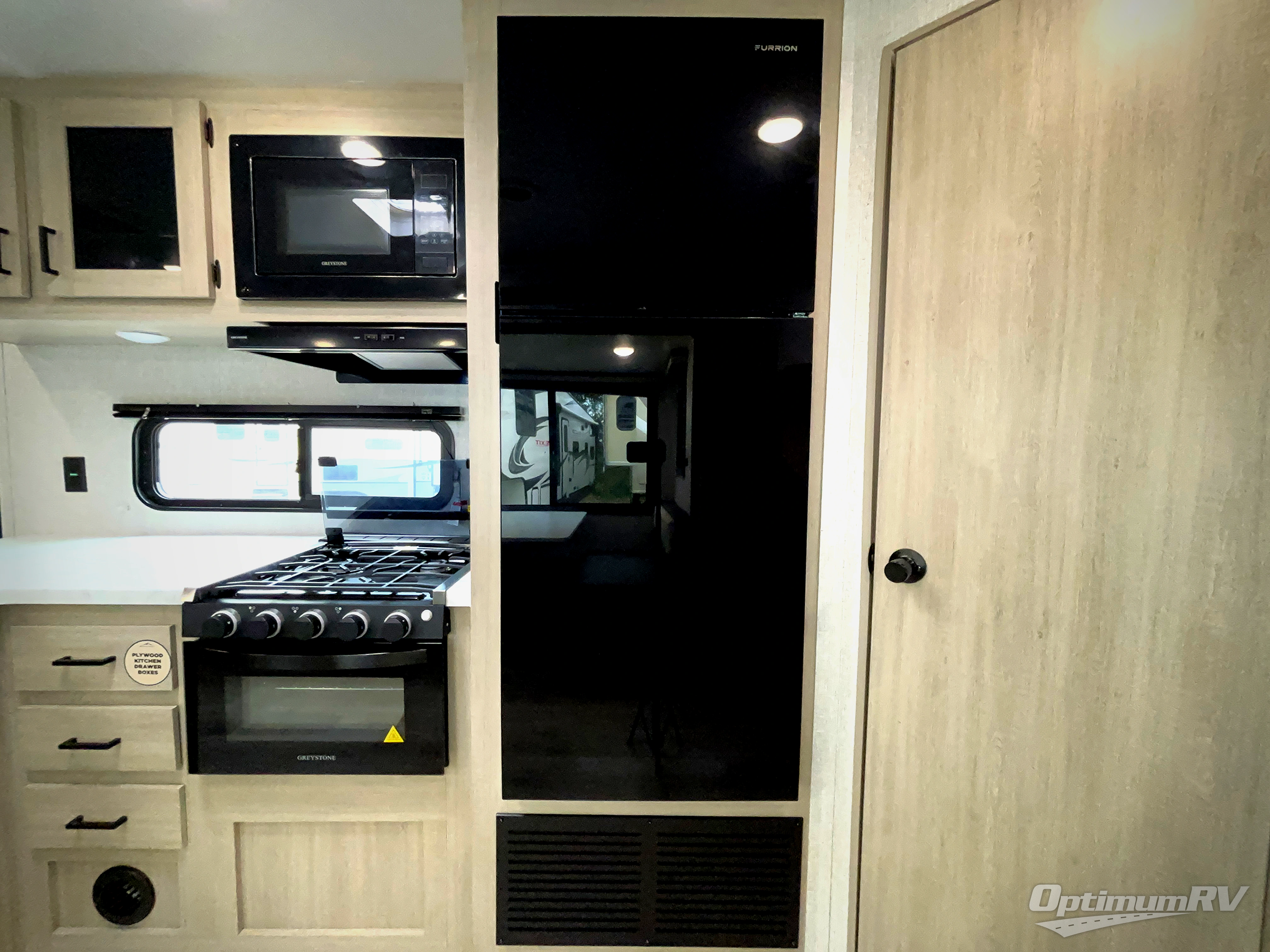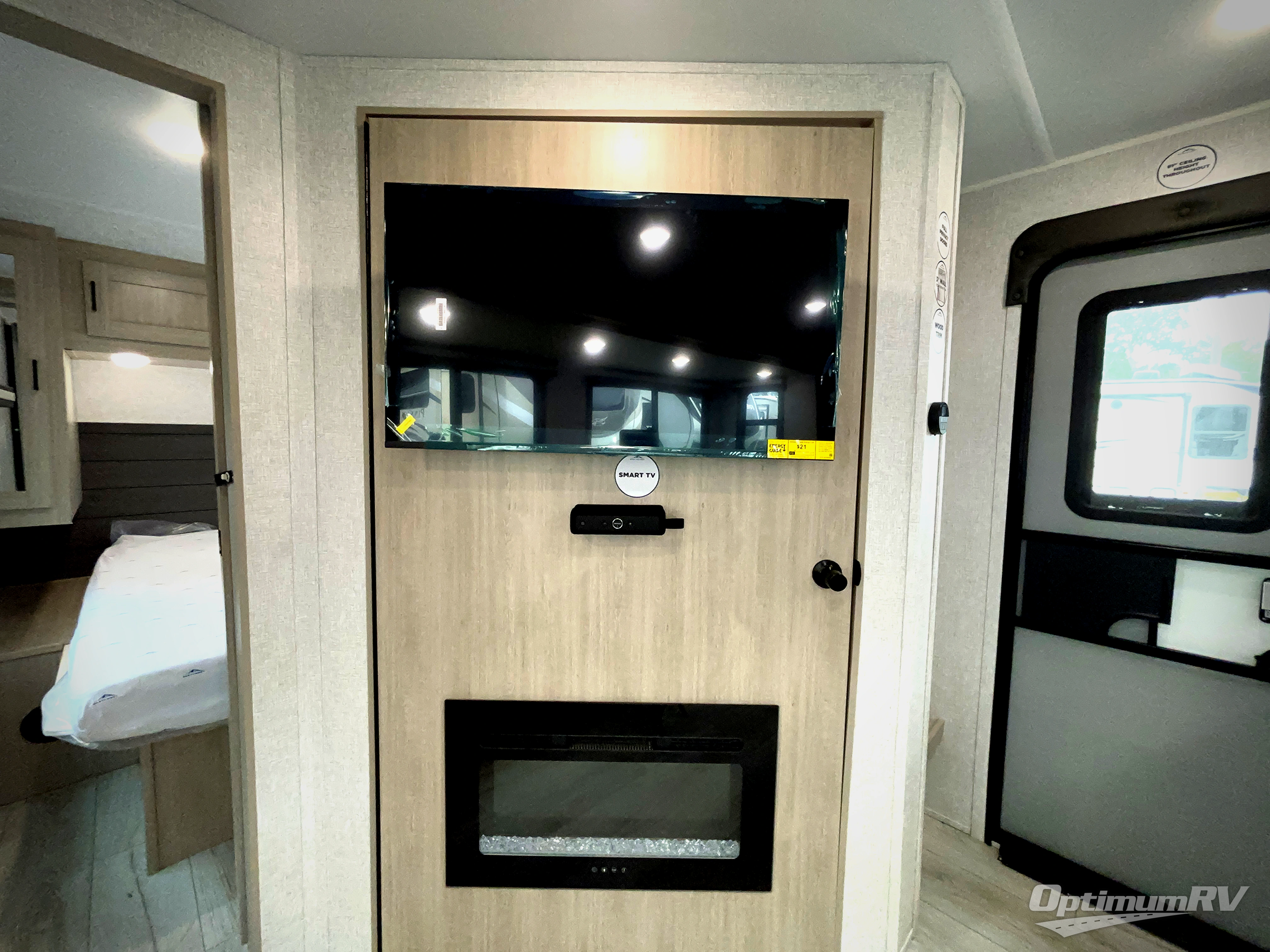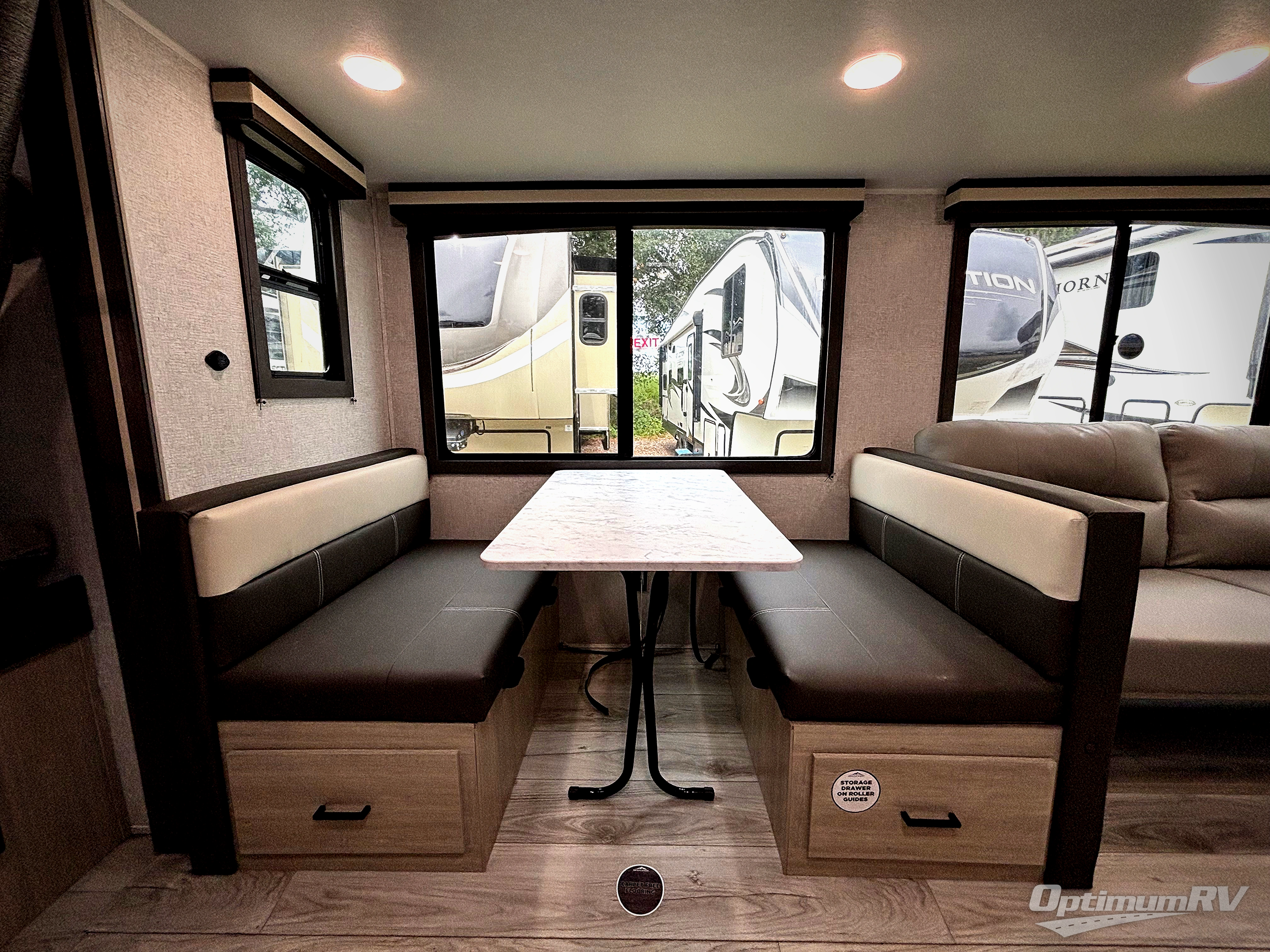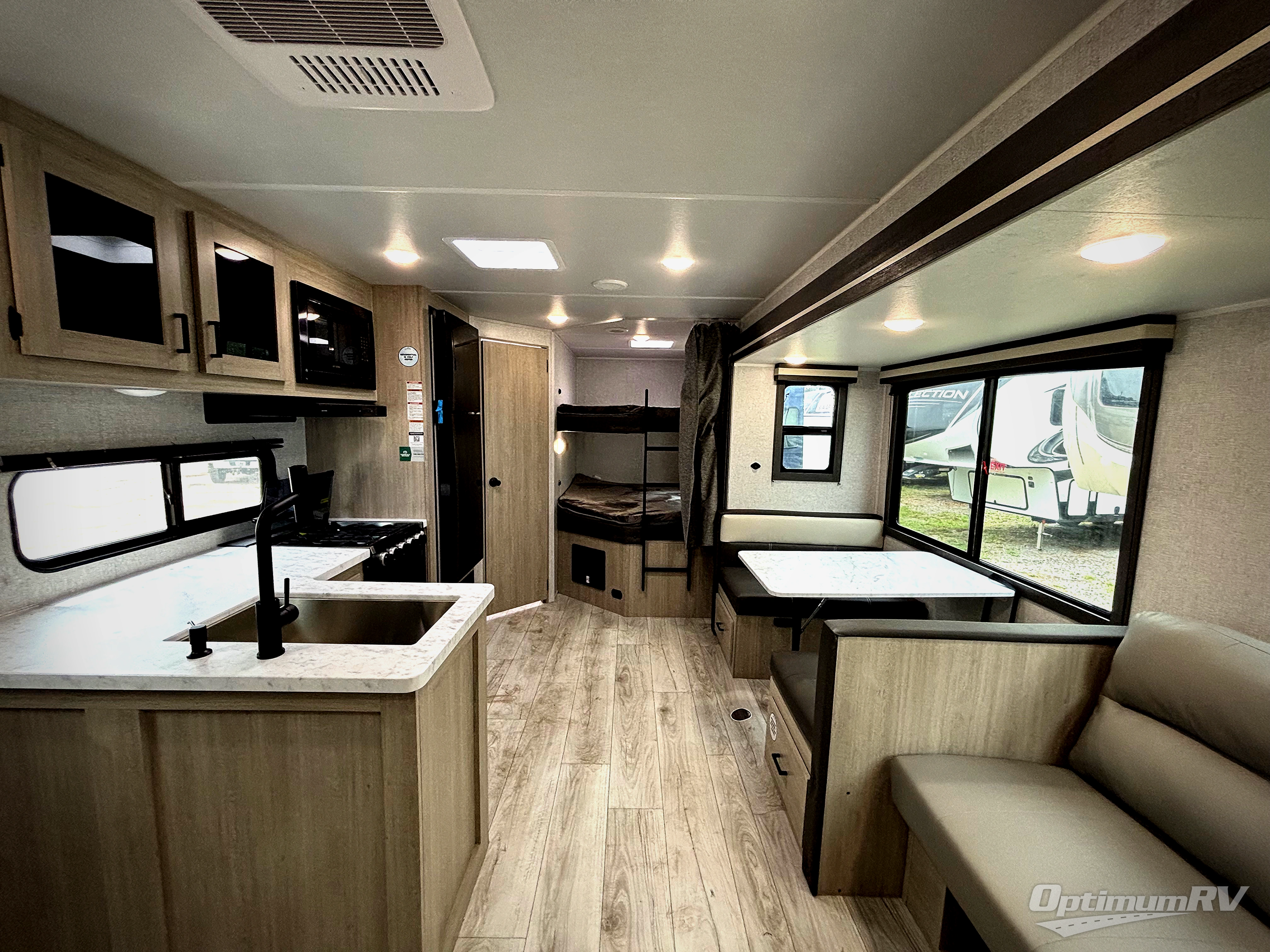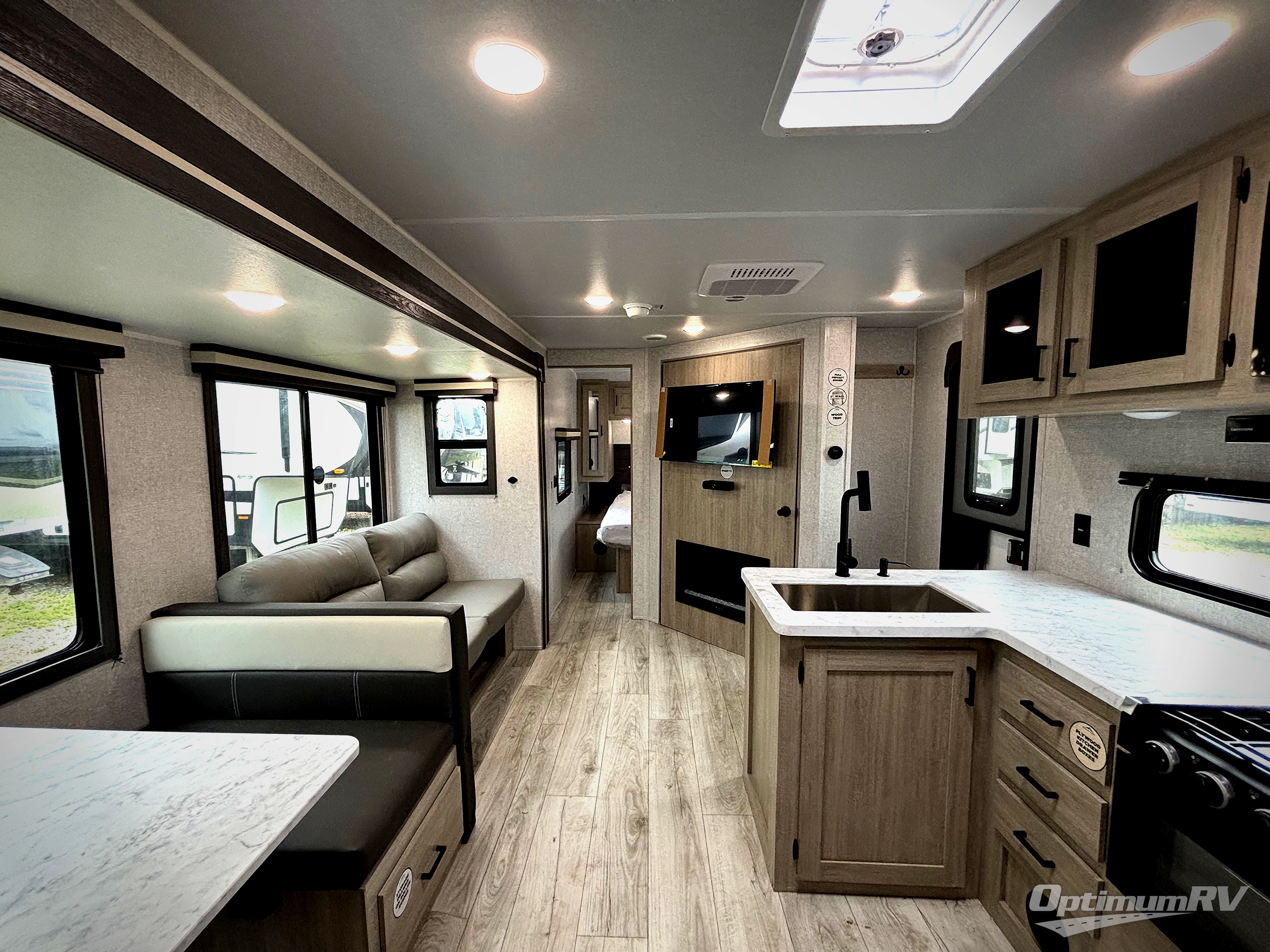 Pack your bags and hitch up this travel trailer for a fun family adventure! You will get a good night's rest on the front king bed in the front private bedroom, and the kids can sleep on the double bunk beds with storage. You could even transform the booth dinette with storage underneath it and the jiffy sofa which can be switched out for the optional theater seat or optional tri-fold sofa. The entertainment center has a fireplace for a cozy evening indoors and a hidden pantry behind it for all of your movie night snacks. With dual entry doors, it will be easy to enter and exit this unit especially from the rear corner bathroom which has one of the entry/exit doors to the unit. Enjoy cooking breakfast outside at the outdoor kitchen complete with a pull-out griddle and fridge!
