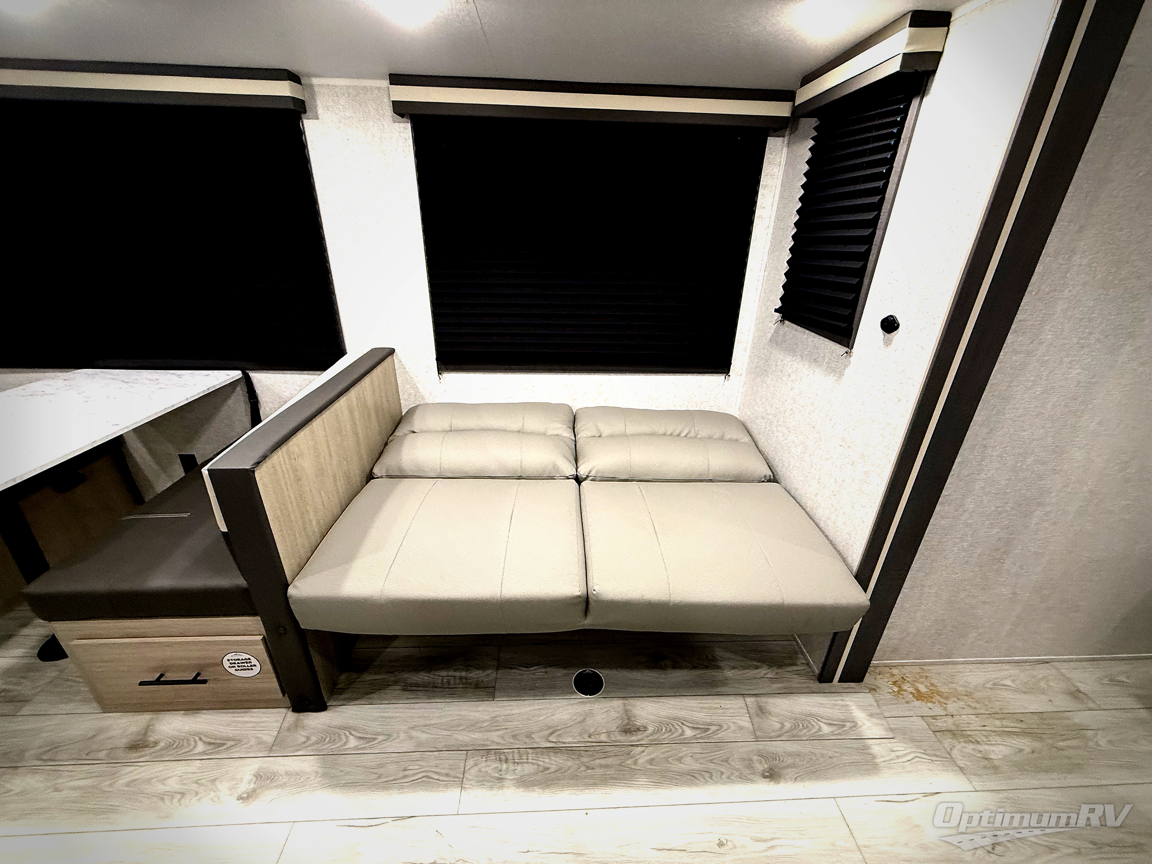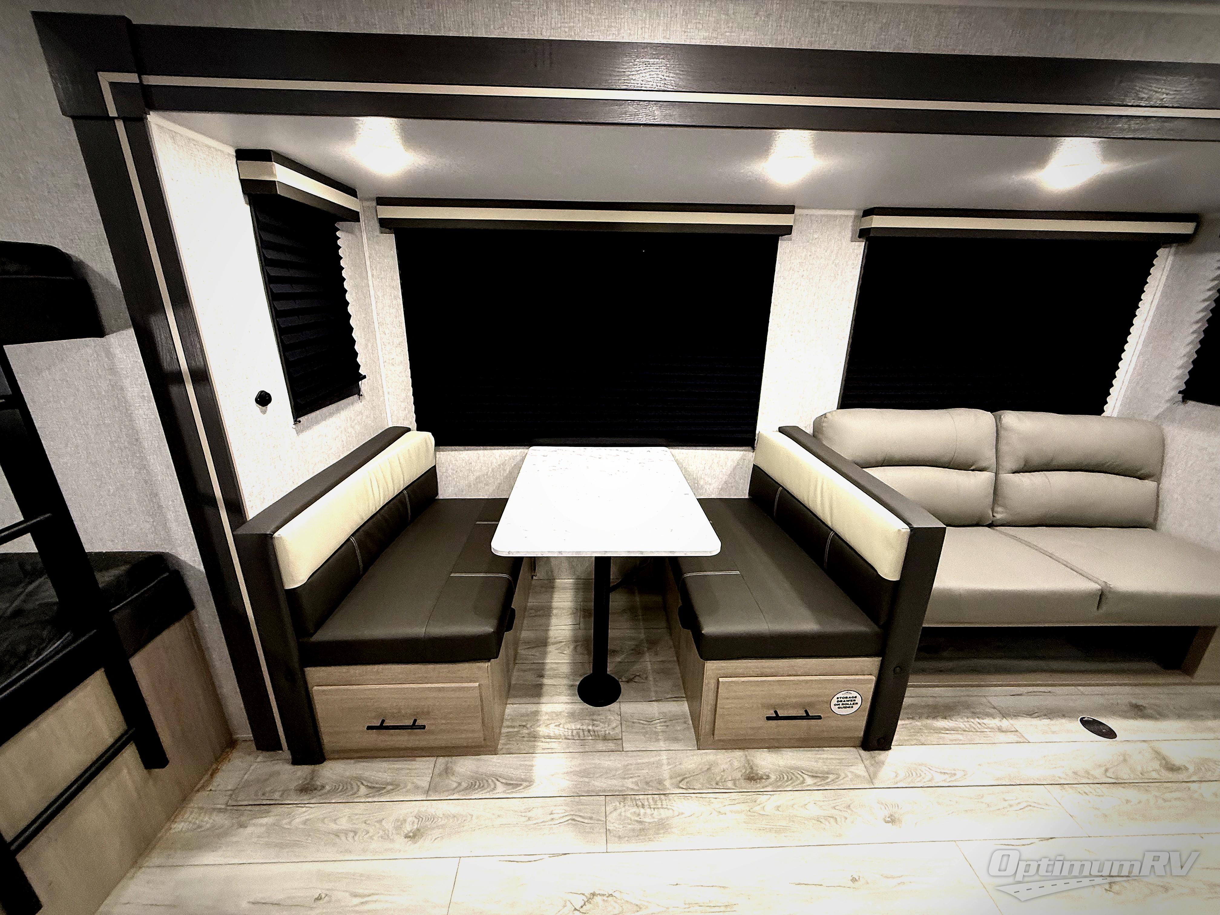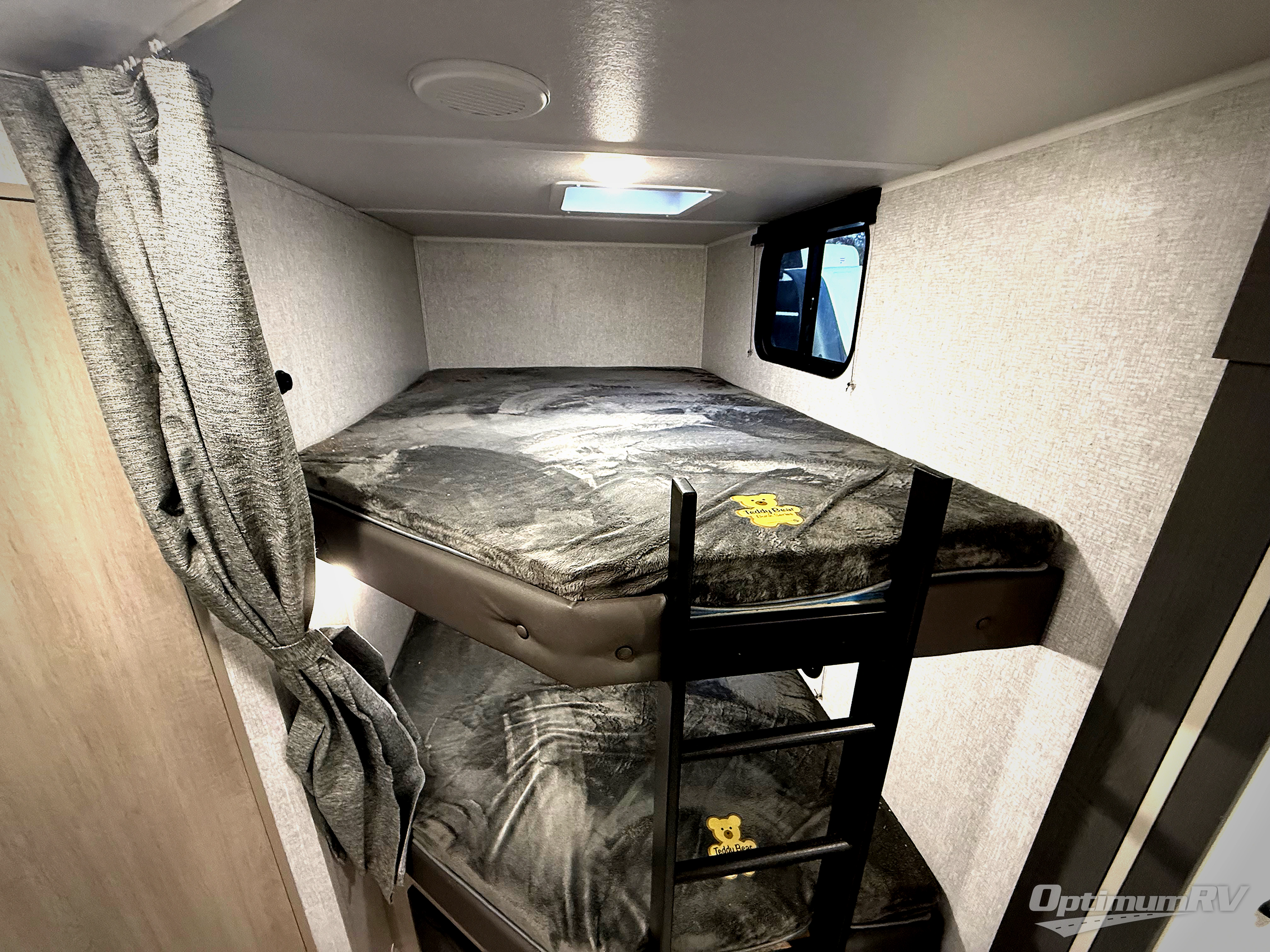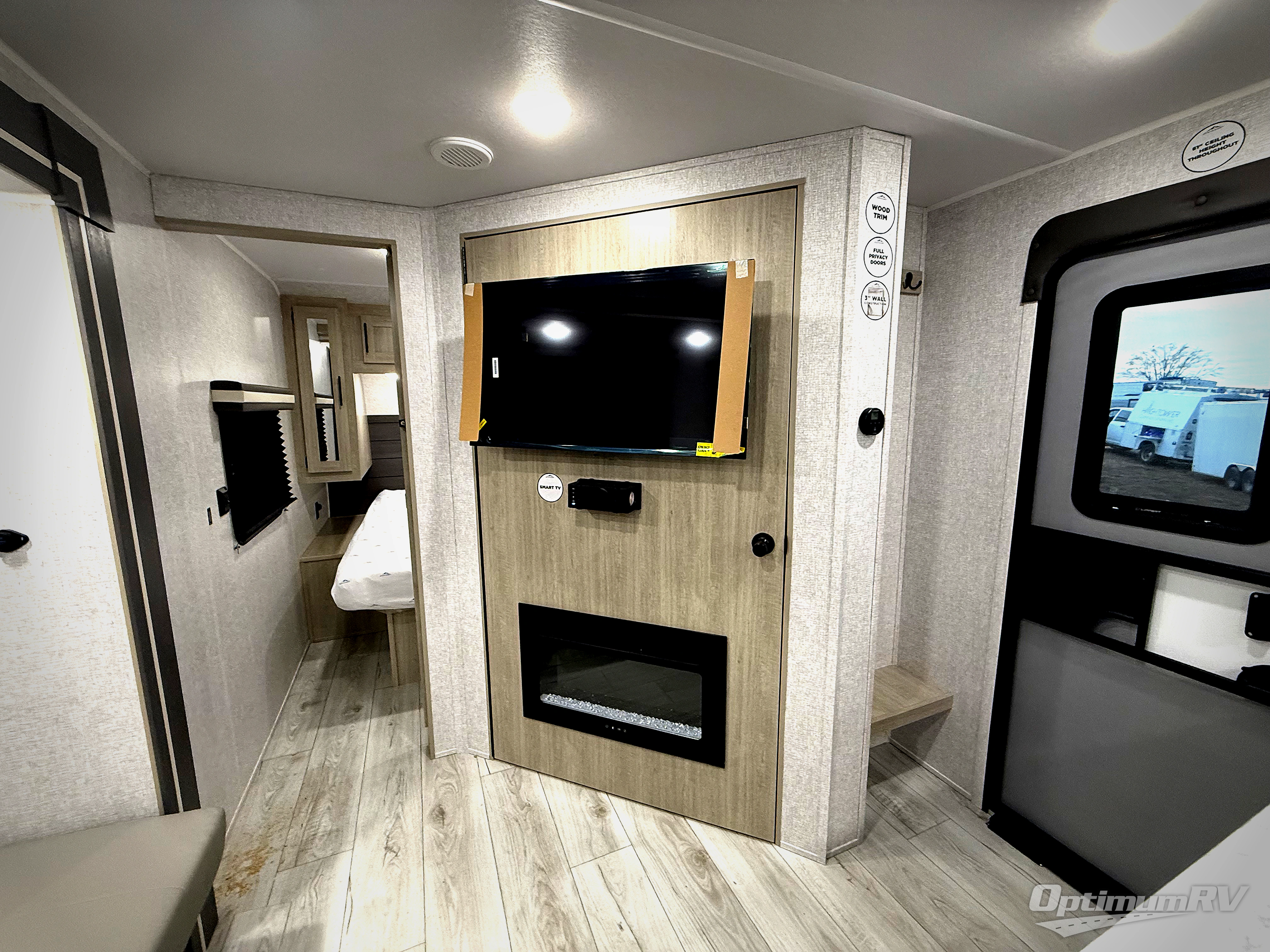 Pack your bags and hitch up this travel trailer for a fun family adventure! You will get a good night's rest on the front king bed in the front private bedroom, and the kids can sleep on the double bunk beds with storage. You could even transform the booth dinette with storage underneath it and the jiffy sofa which can be switched out for the optional theater seat or optional tri-fold sofa. The entertainment center has a fireplace for a cozy evening indoors and a hidden pantry behind it for all of your movie night snacks. With dual entry doors, it will be easy to enter and exit this unit especially from the rear corner bathroom which has one of the entry/exit doors to the unit. Enjoy cooking breakfast outside at the outdoor kitchen complete with a pull-out griddle and fridge!
