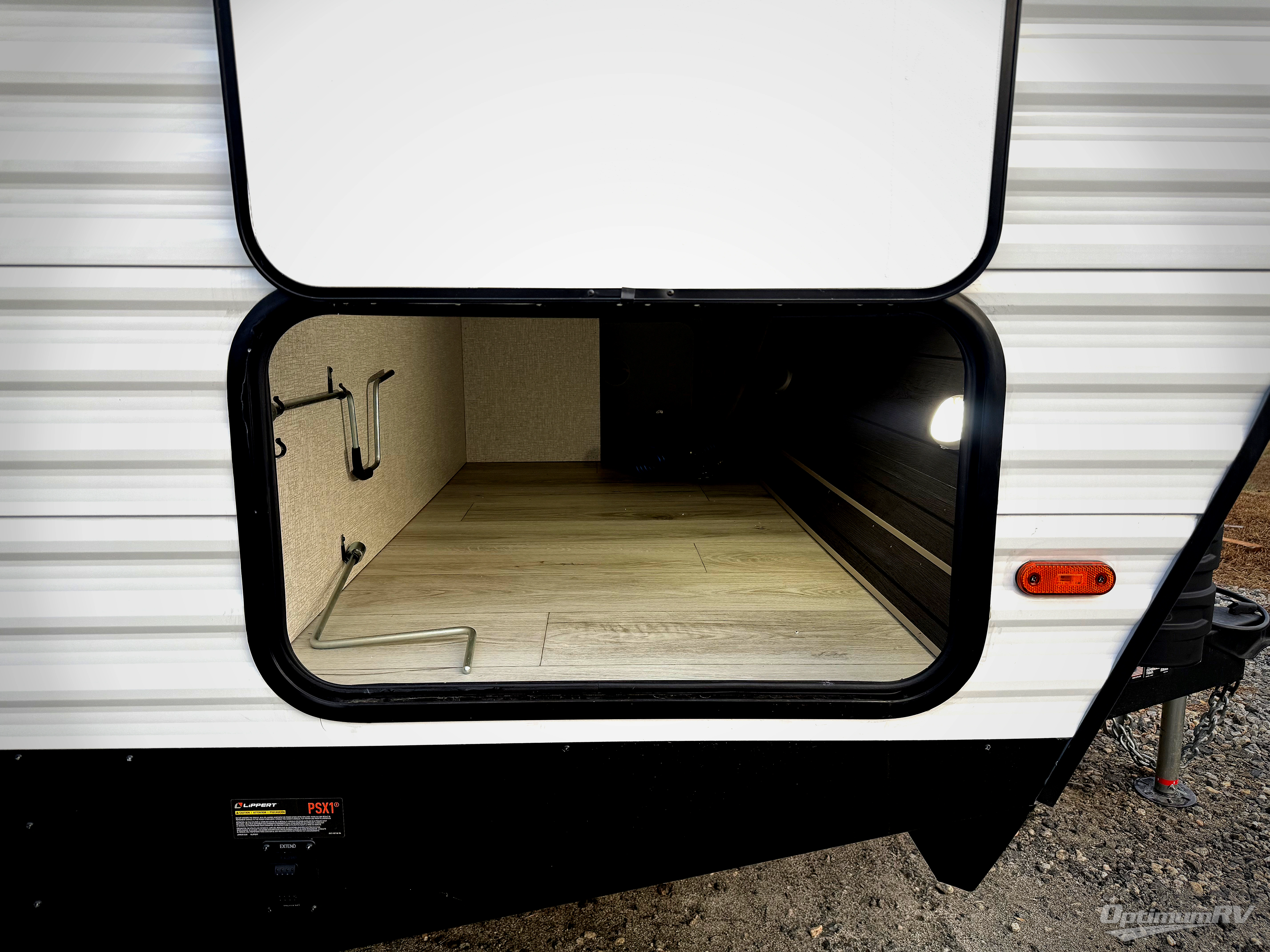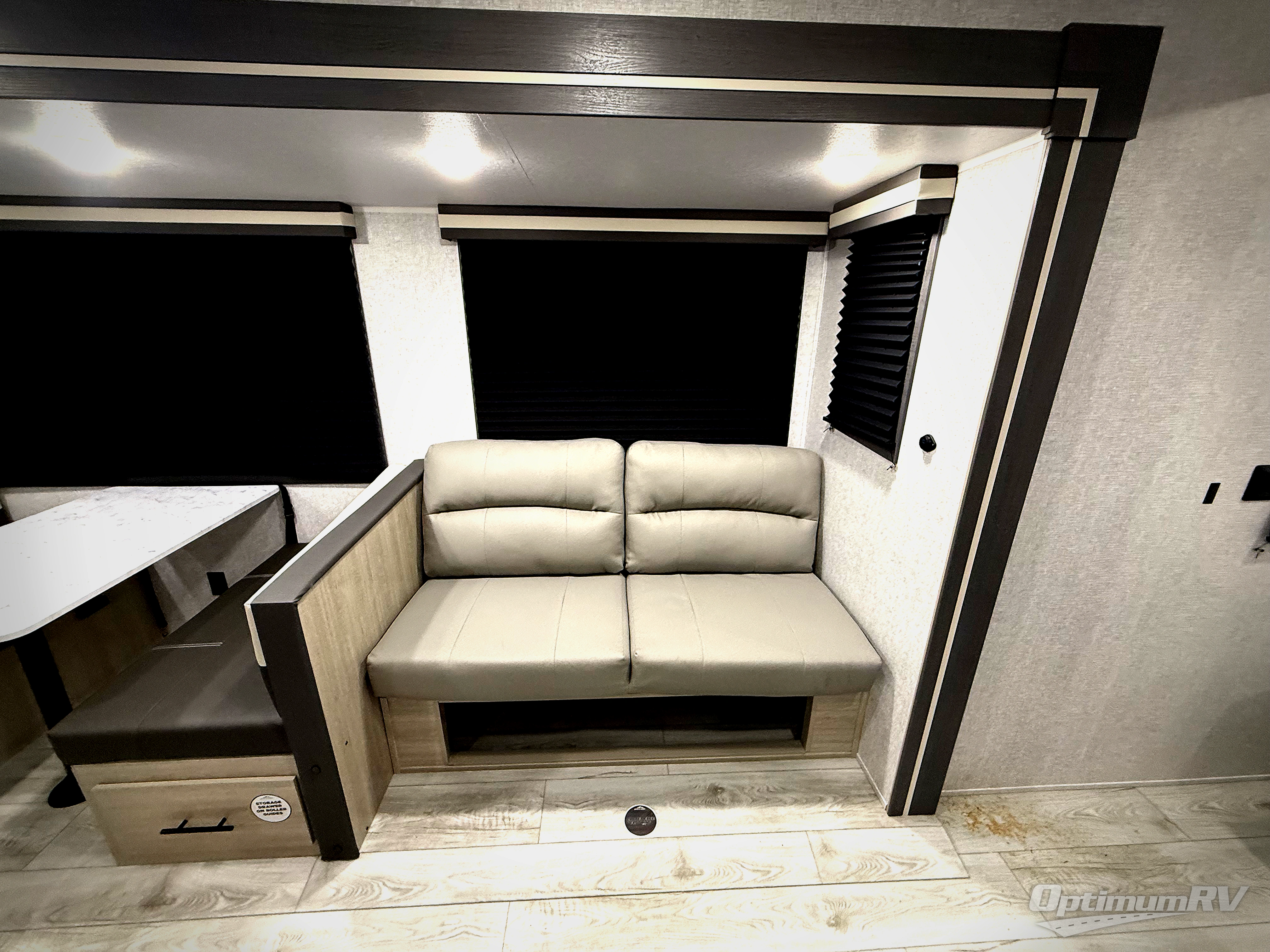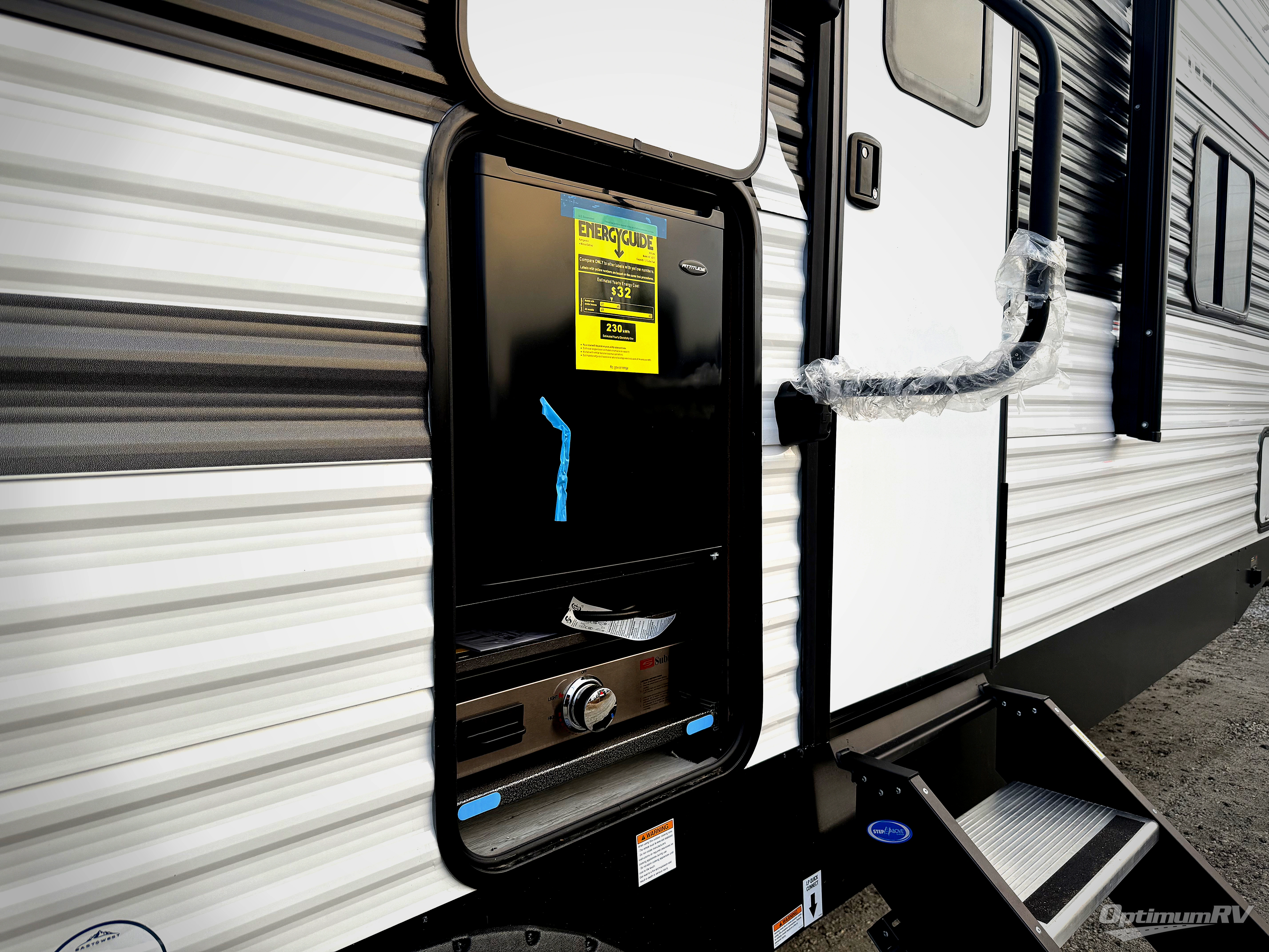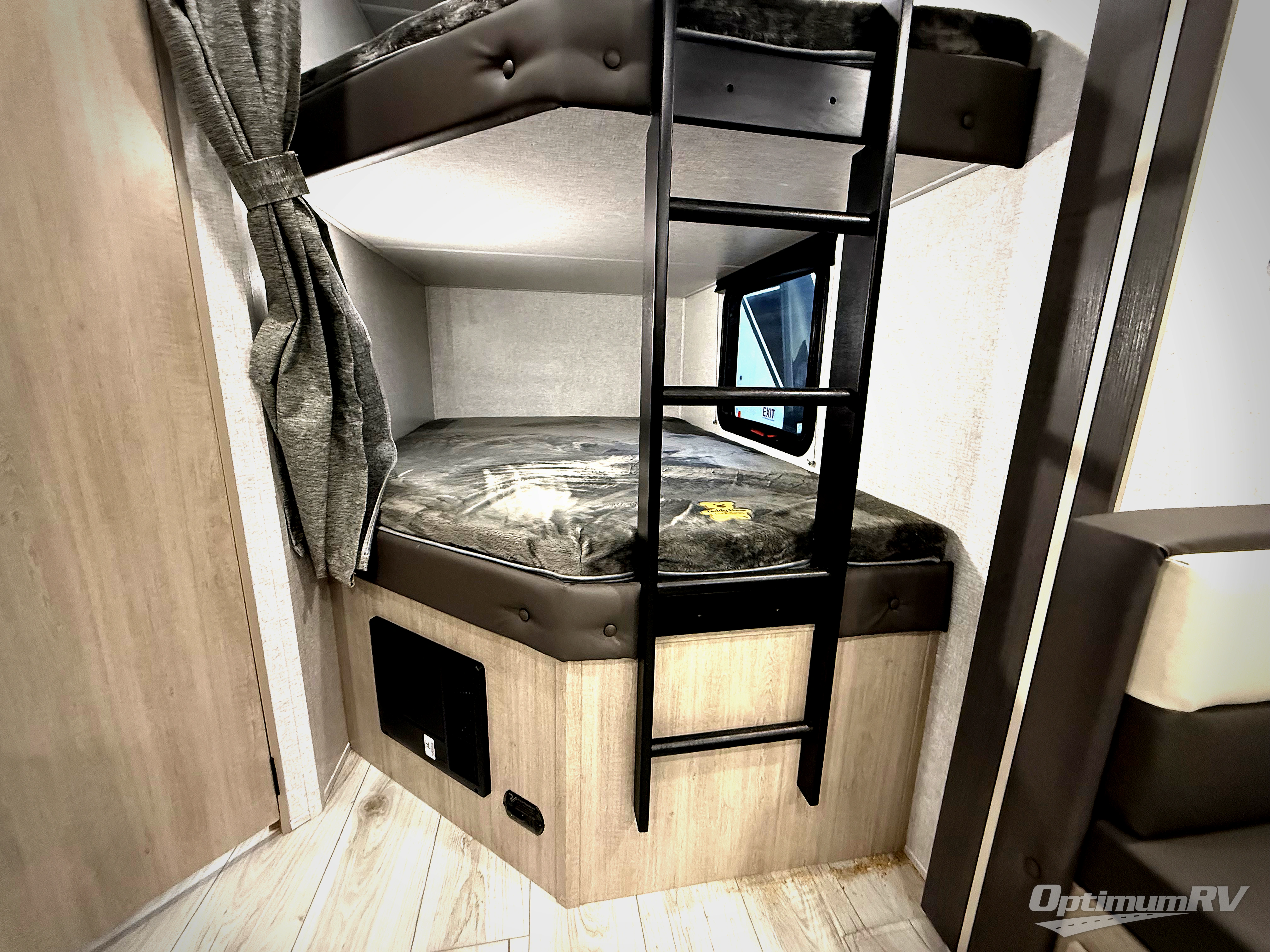 Pack your bags and hitch up this travel trailer for a fun family adventure! You will get a good night's rest on the front king bed in the front private bedroom, and the kids can sleep on the double bunk beds with storage. You could even transform the booth dinette with storage underneath it and the jiffy sofa which can be switched out for the optional theater seat or optional tri-fold sofa. The entertainment center has a fireplace for a cozy evening indoors and a hidden pantry behind it for all of your movie night snacks. With dual entry doors, it will be easy to enter and exit this unit especially from the rear corner bathroom which has one of the entry/exit doors to the unit. Enjoy cooking breakfast outside at the outdoor kitchen complete with a pull-out griddle and fridge!