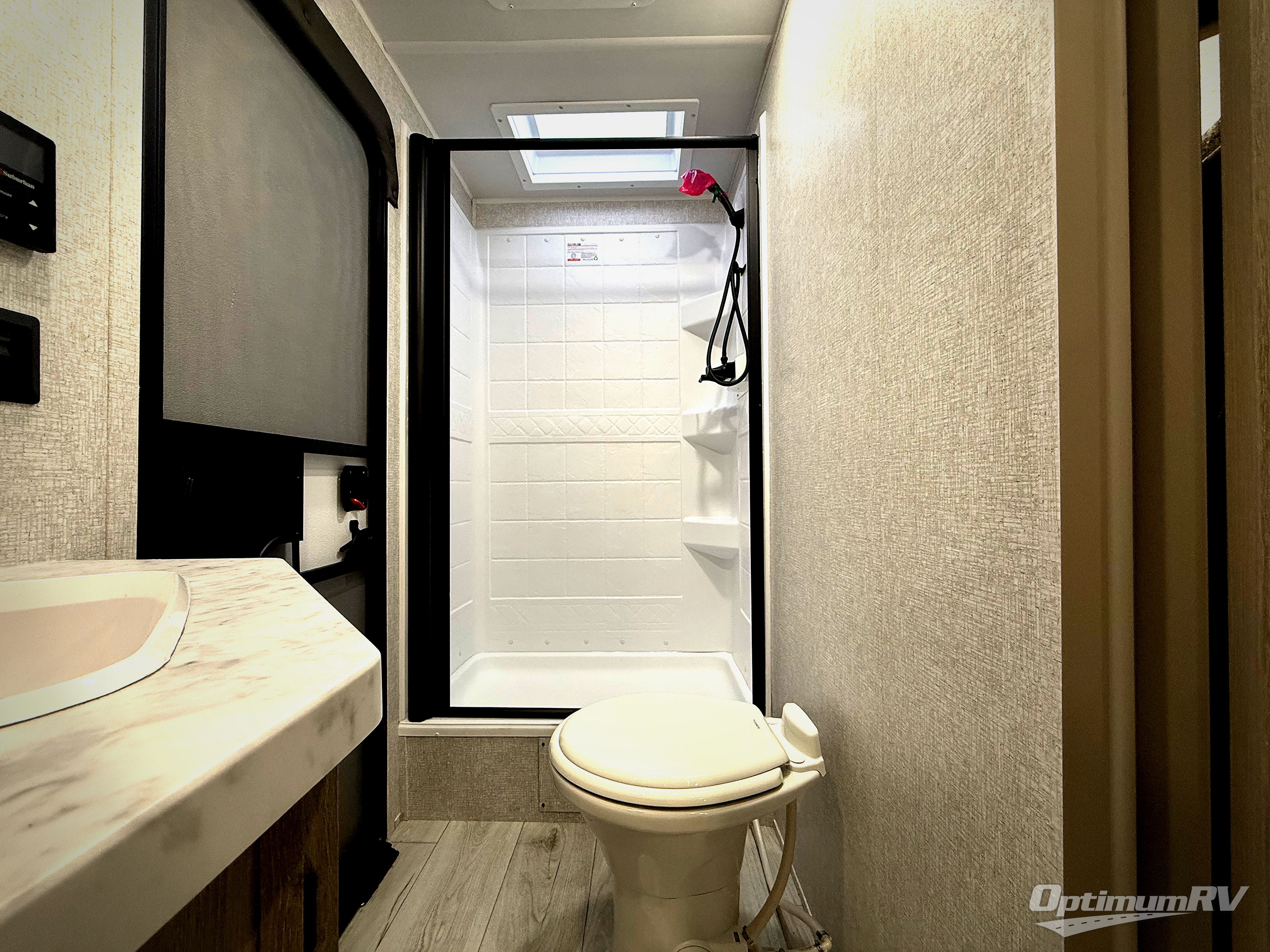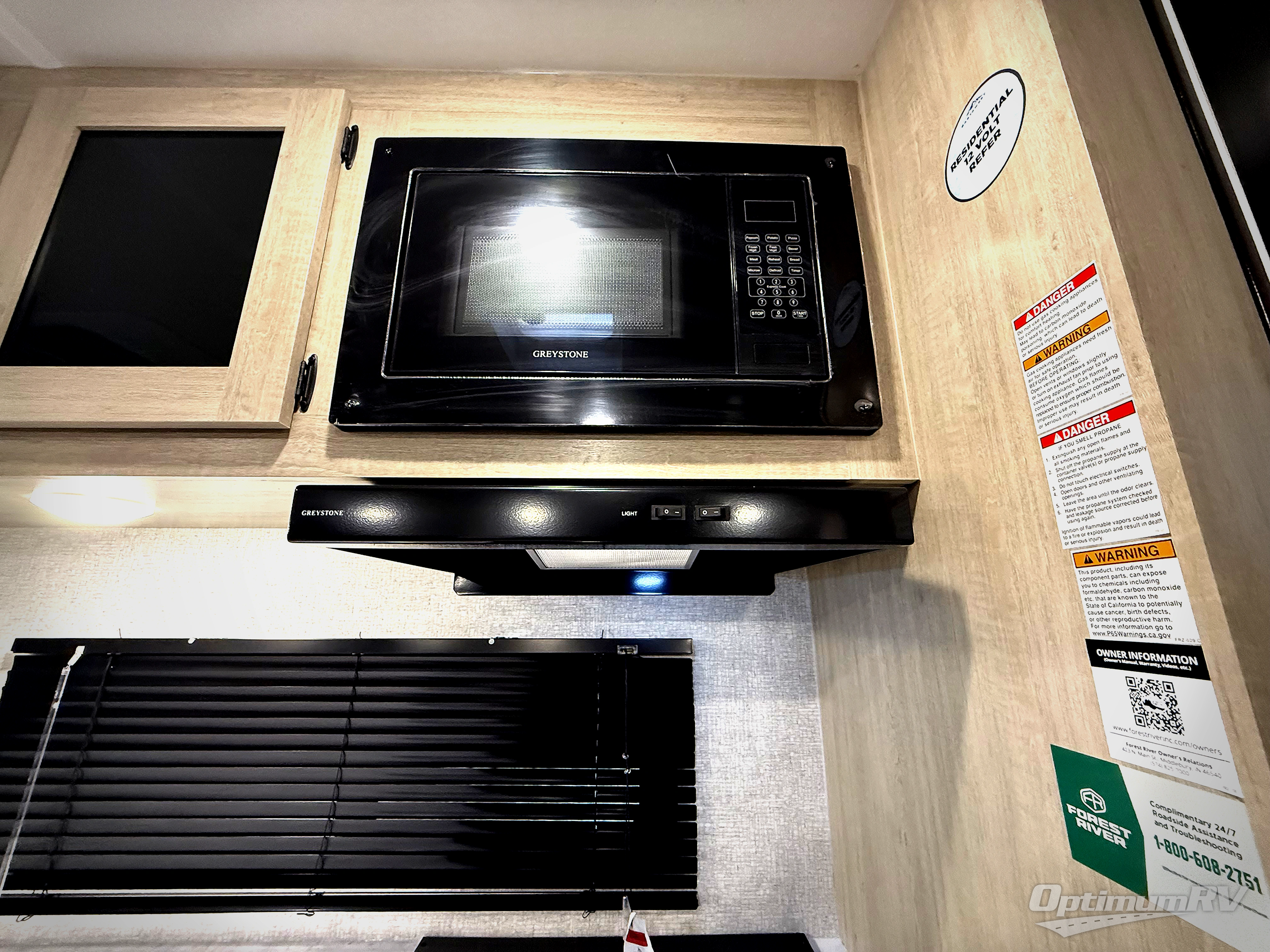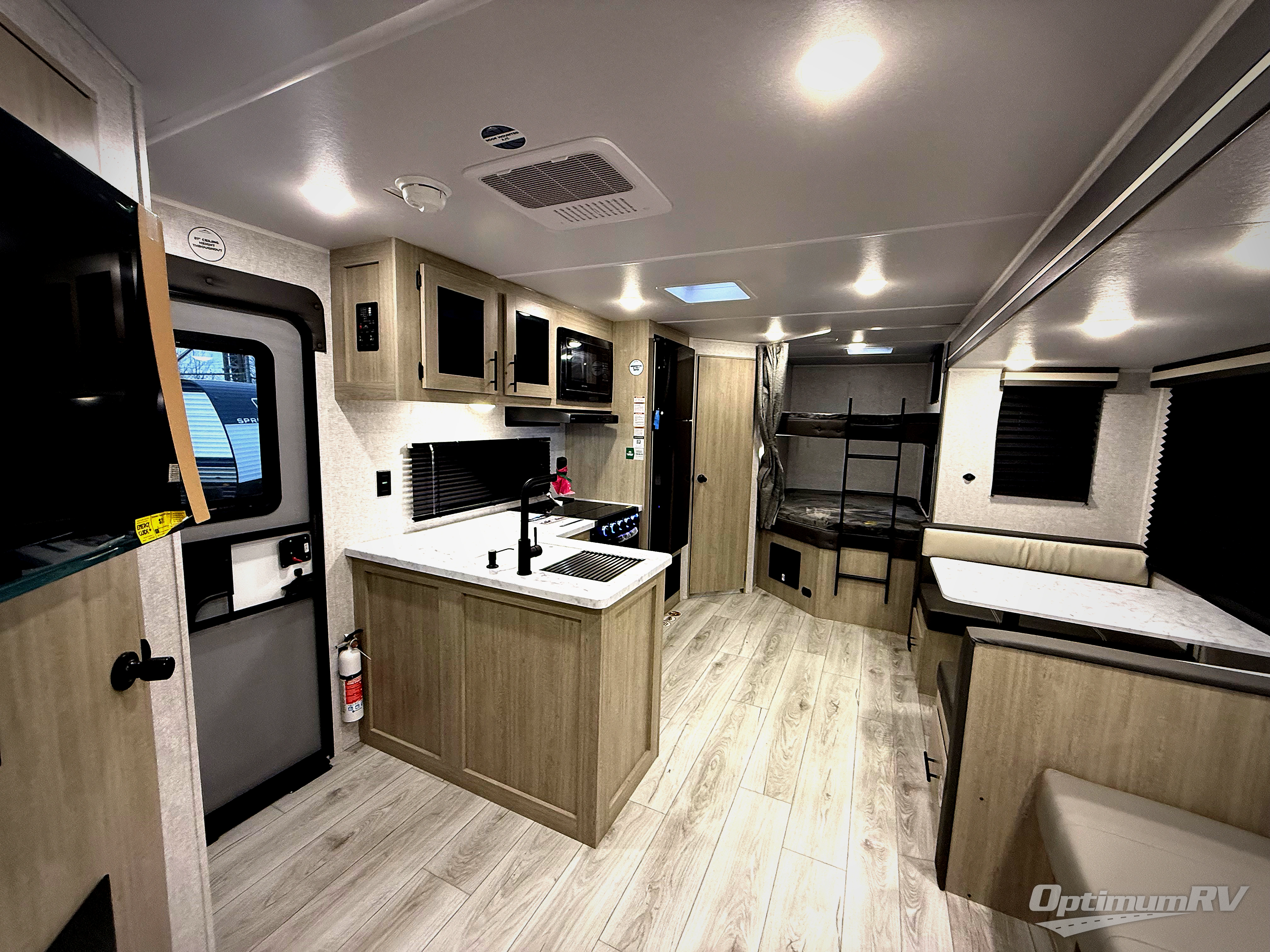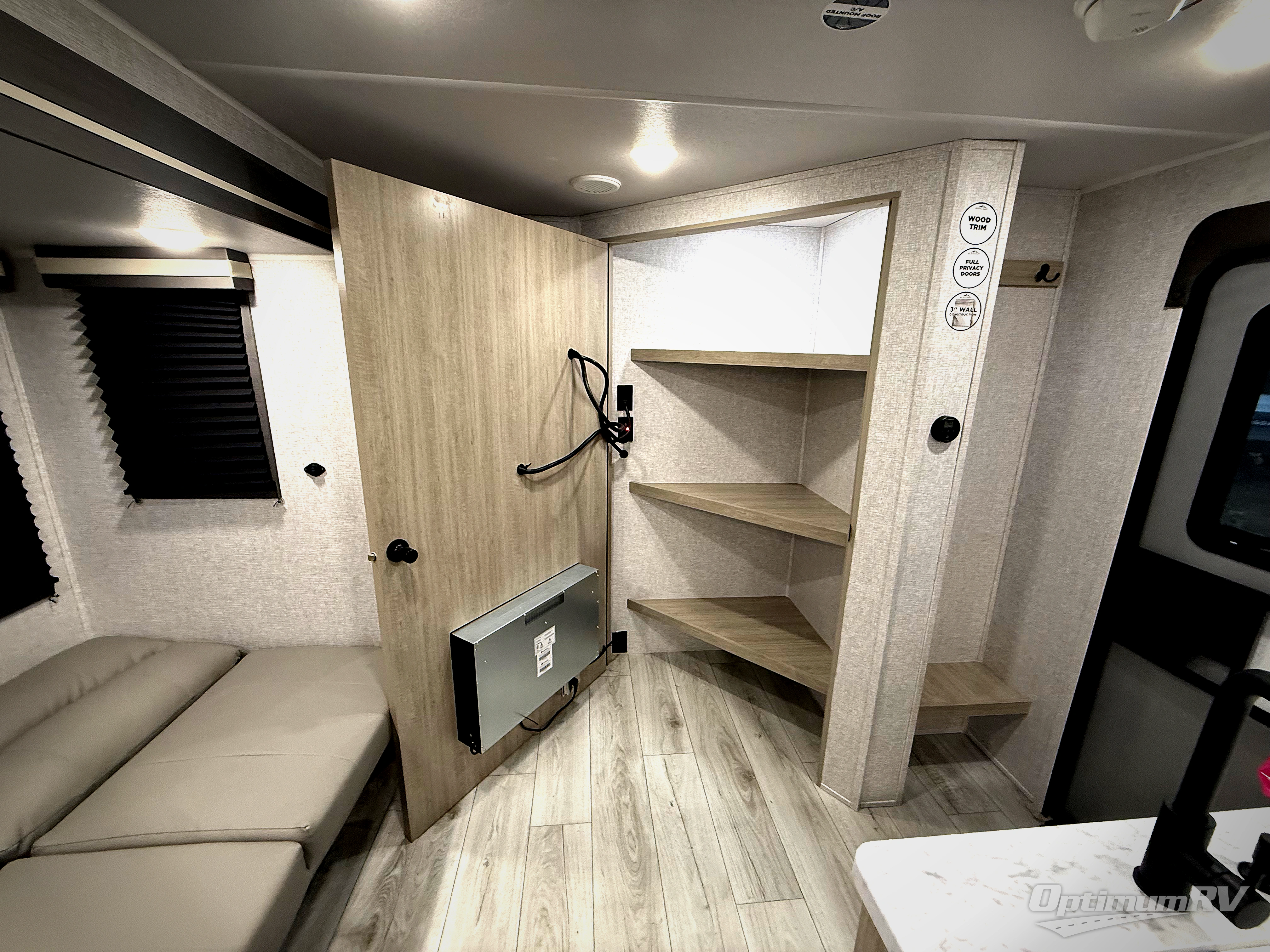 Pack your bags and hitch up this travel trailer for a fun family adventure! You will get a good night's rest on the front king bed in the front private bedroom, and the kids can sleep on the double bunk beds with storage. You could even transform the booth dinette with storage underneath it and the jiffy sofa which can be switched out for the optional theater seat or optional tri-fold sofa. The entertainment center has a fireplace for a cozy evening indoors and a hidden pantry behind it for all of your movie night snacks. With dual entry doors, it will be easy to enter and exit this unit especially from the rear corner bathroom which has one of the entry/exit doors to the unit. Enjoy cooking breakfast outside at the outdoor kitchen complete with a pull-out griddle and fridge!