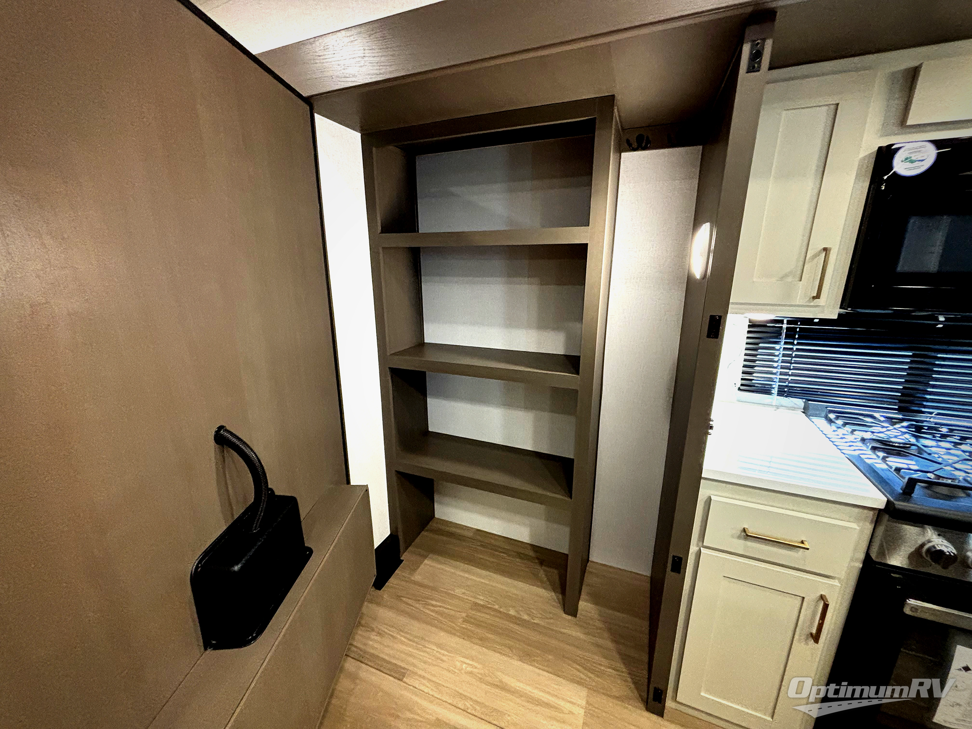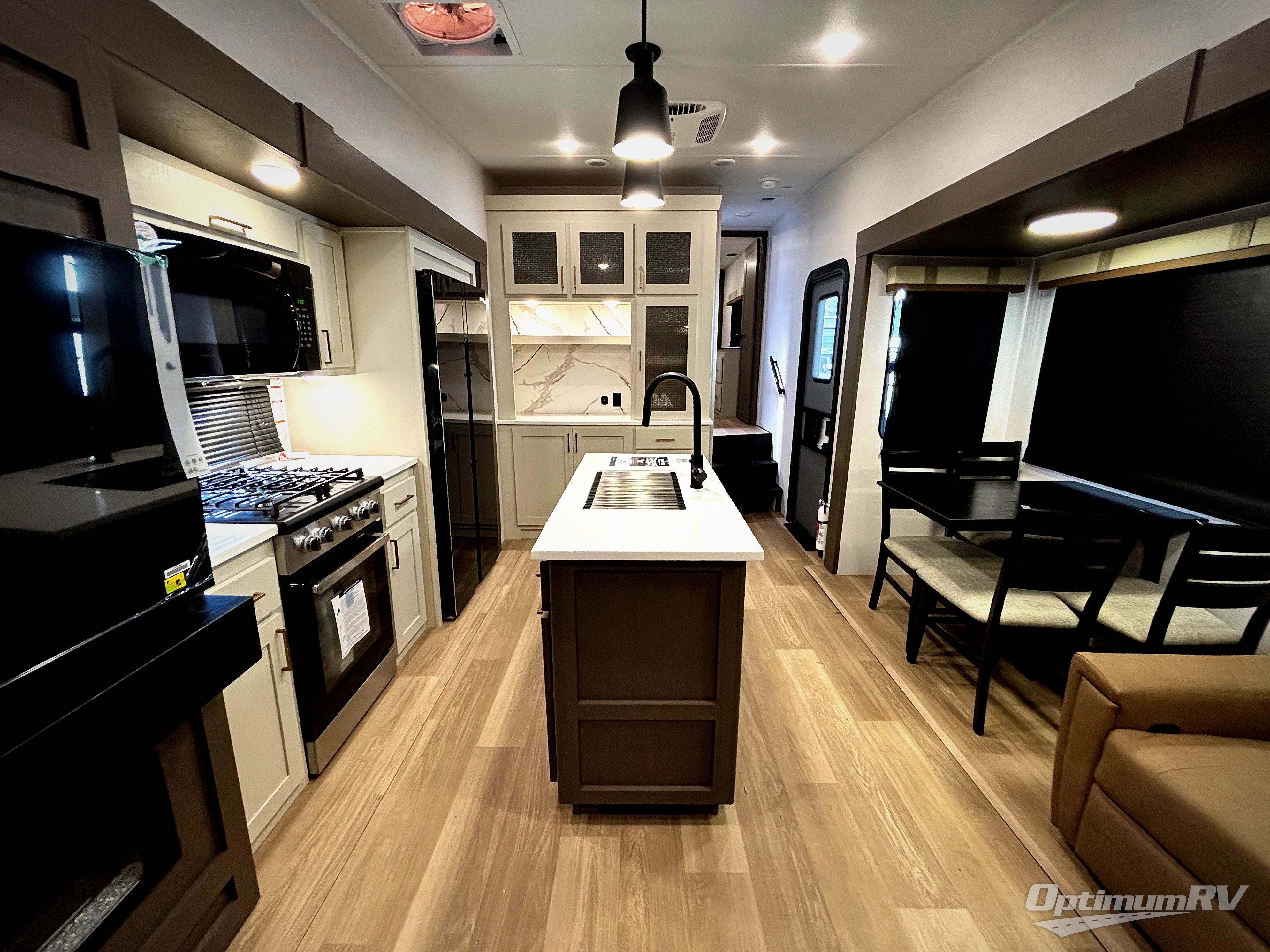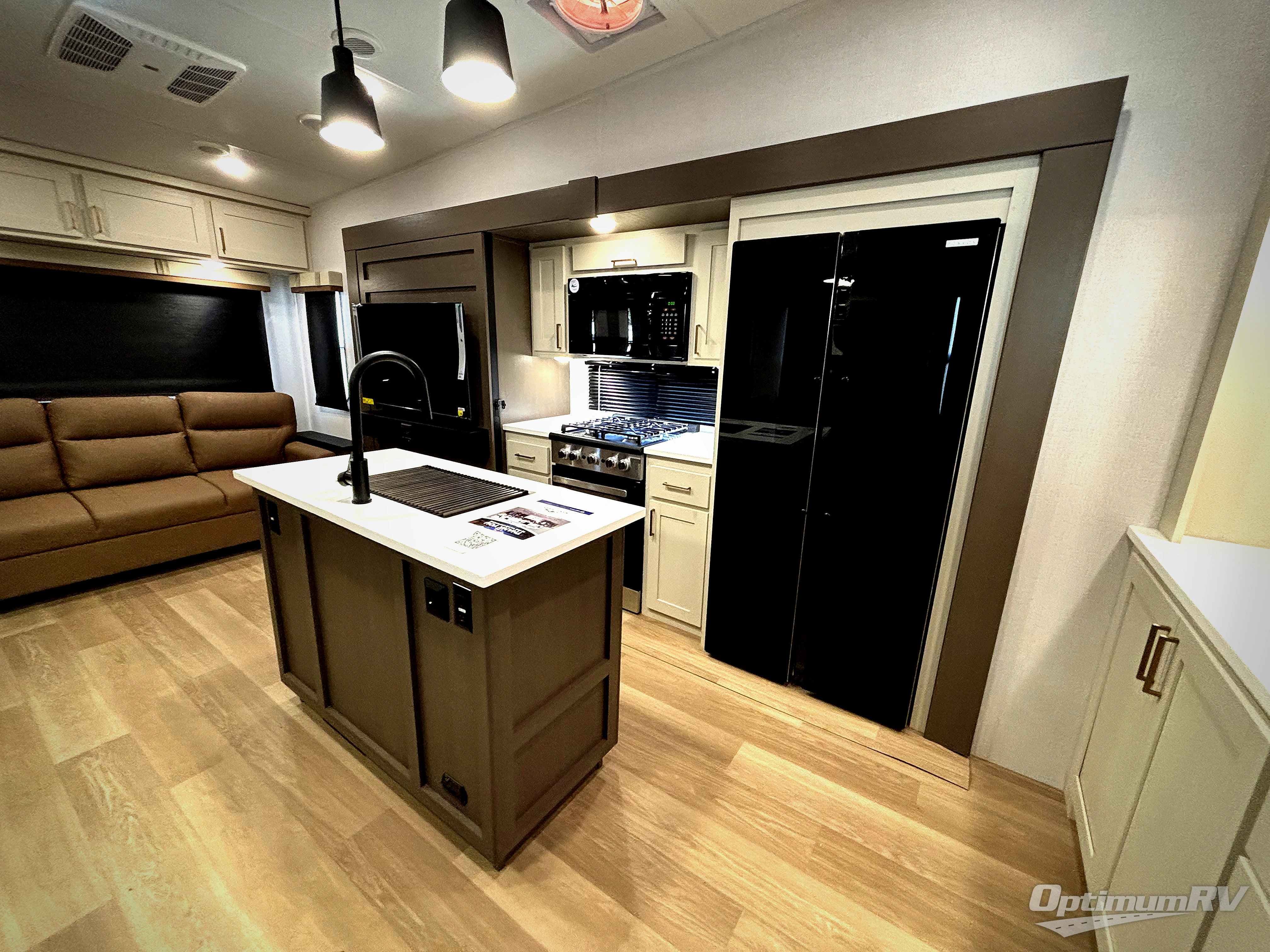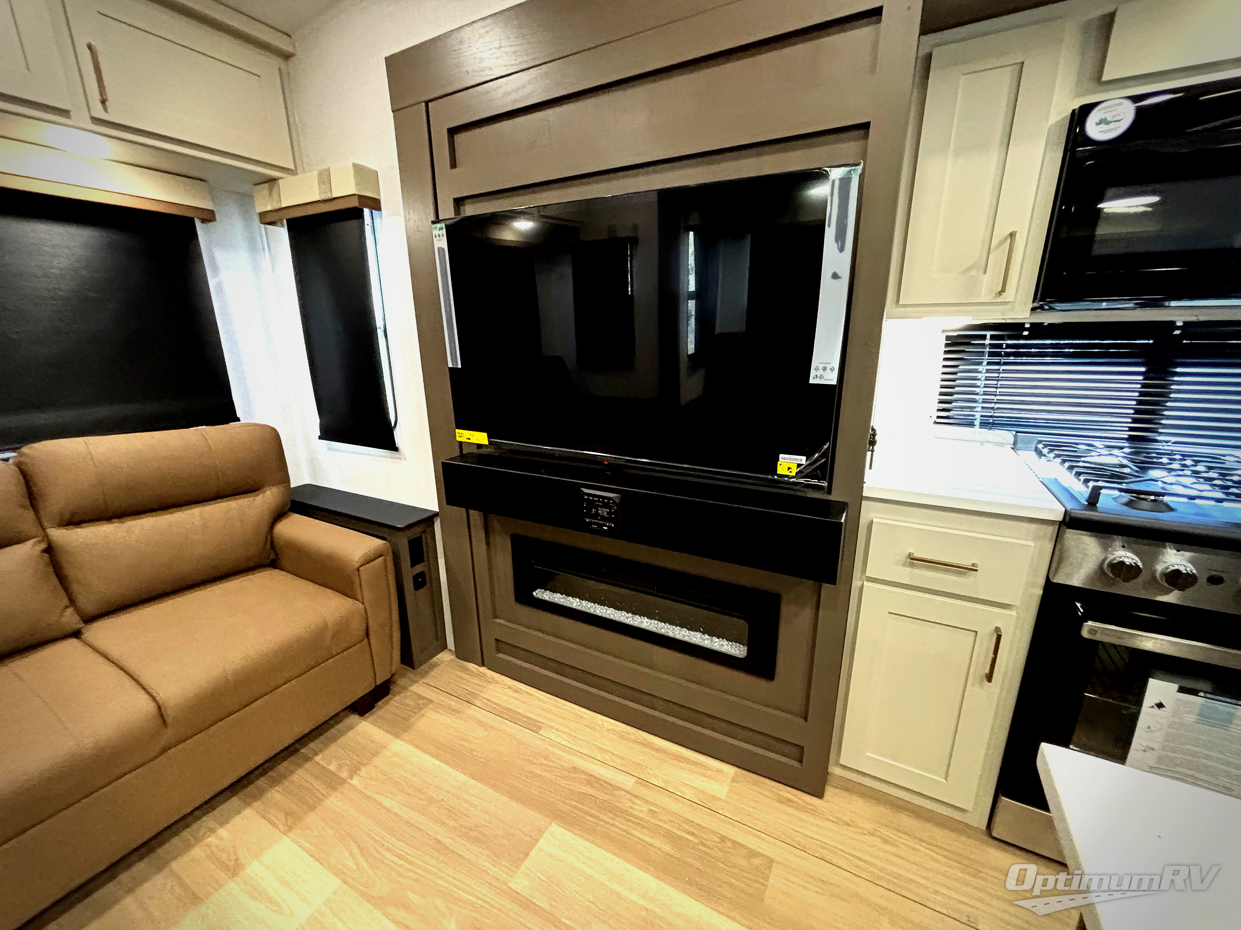 Enjoy luxury camping trips in this triple slide out fifth wheel! Once you've unloaded your gear, you can make lunch on the four burner 24" range, and the chef is sure to appreciate the kitchen island for more counter space. Your crew can dine at the free-standing dinette and relax on the theater seating across from the 50" TV and fireplace. There is also a hidden pantry behind the TV, and the queen bed hide-a-bed sofa will provide a place for guests to sleep! You'll find your own space up front in the private bedroom, complete with a king bed slide out with storage underneath, a dresser, plus a front wardrobe and stackable washer/dryer prep!
