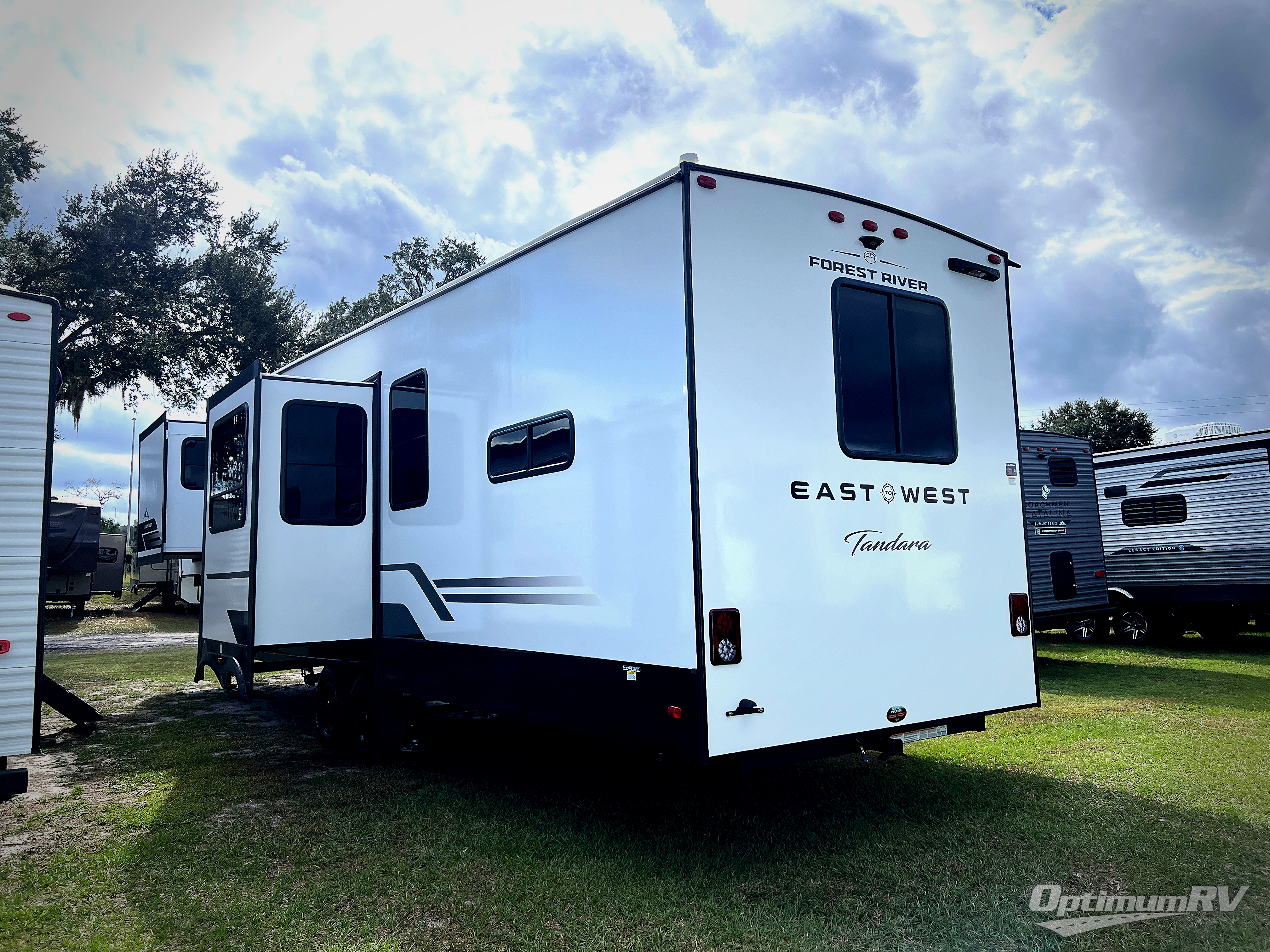 With any Tandara fifth wheel by EAST TO WEST, you will enjoy many standard features to make each trip enjoyable. The Tandara Exterior Luxury Package includes a universal all-in-one docking station, an automatic leveling system, metal slam latch cargo doors, and a 200W solar panel for off-grid capabilities. You will also appreciate the Tandara Climate Package with ductless flooring, dual attic vents, plus a heated and enclosed underbelly for added protection. Inside, you'll find a flush floor kitchen slide, Slow Rise roller shades, solid surface kitchen countertops, and more stand-out features included in the Tandara Interior Luxury Package.