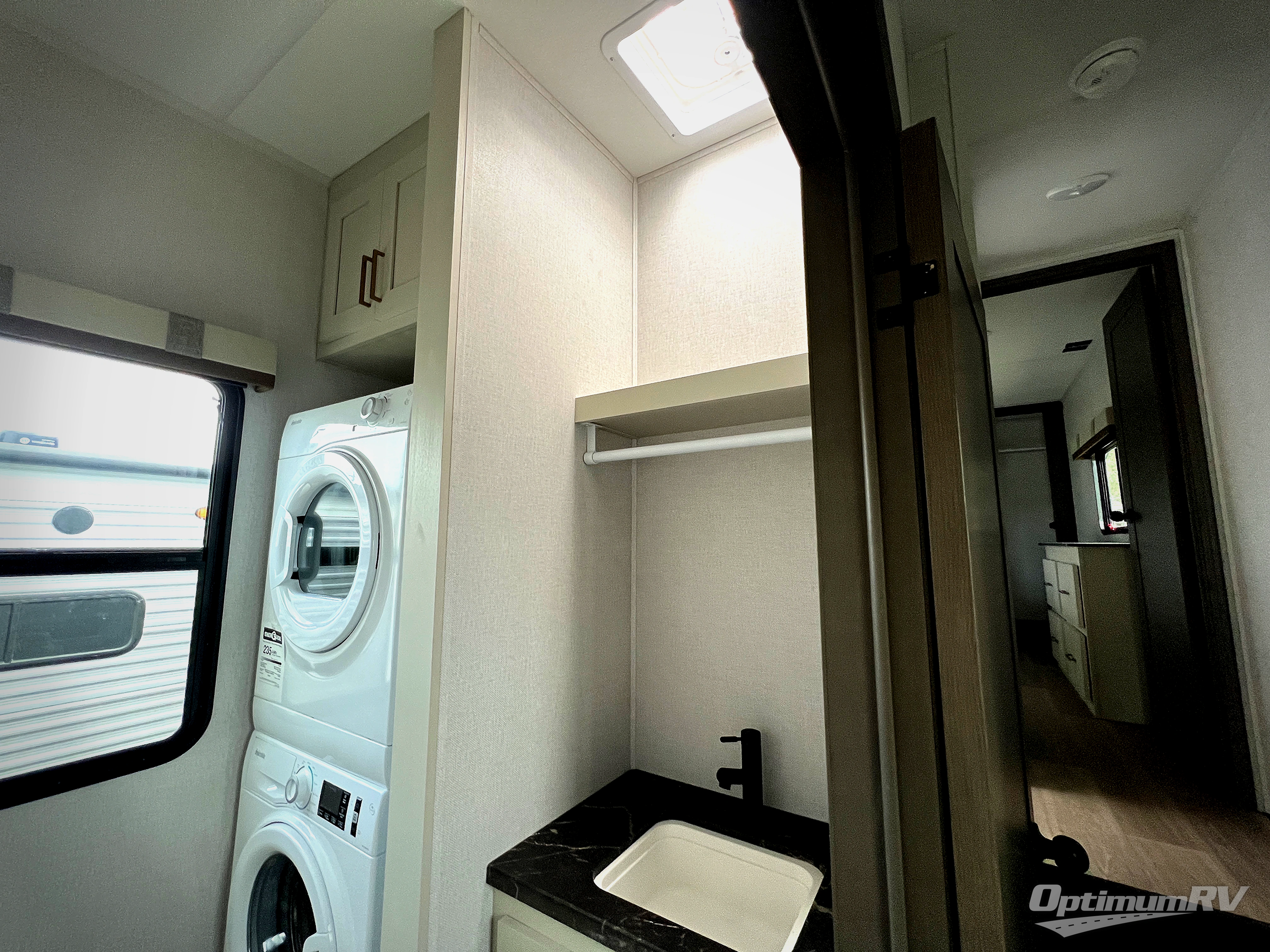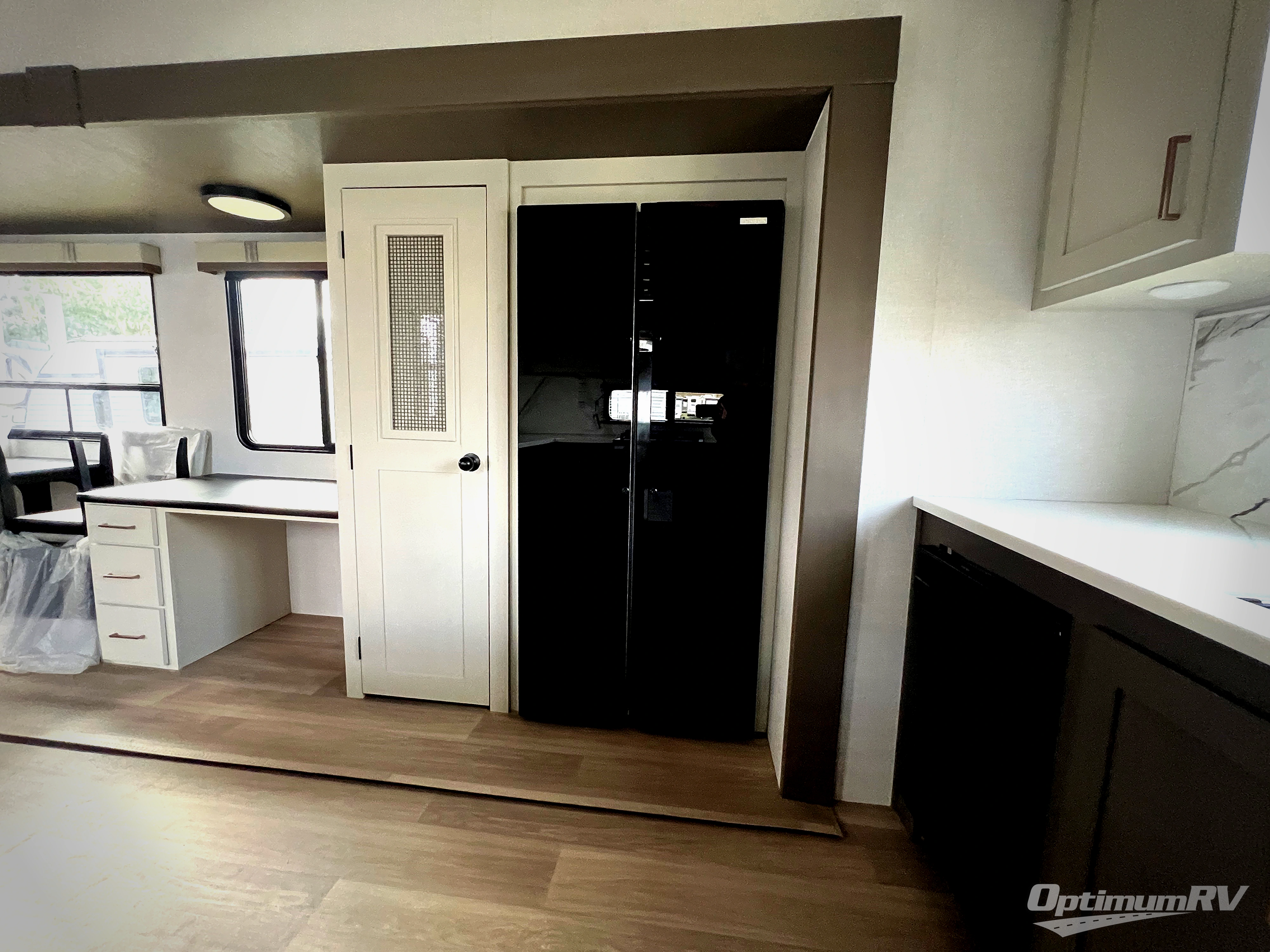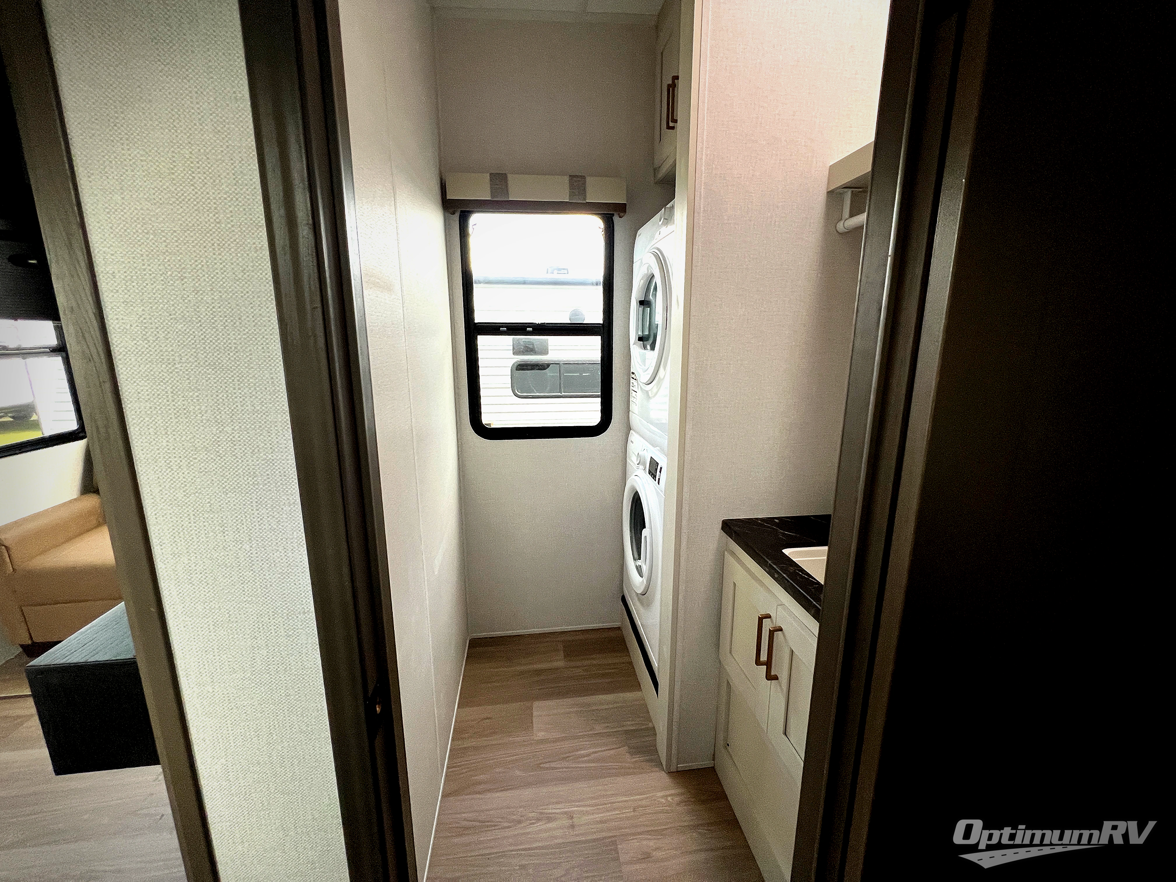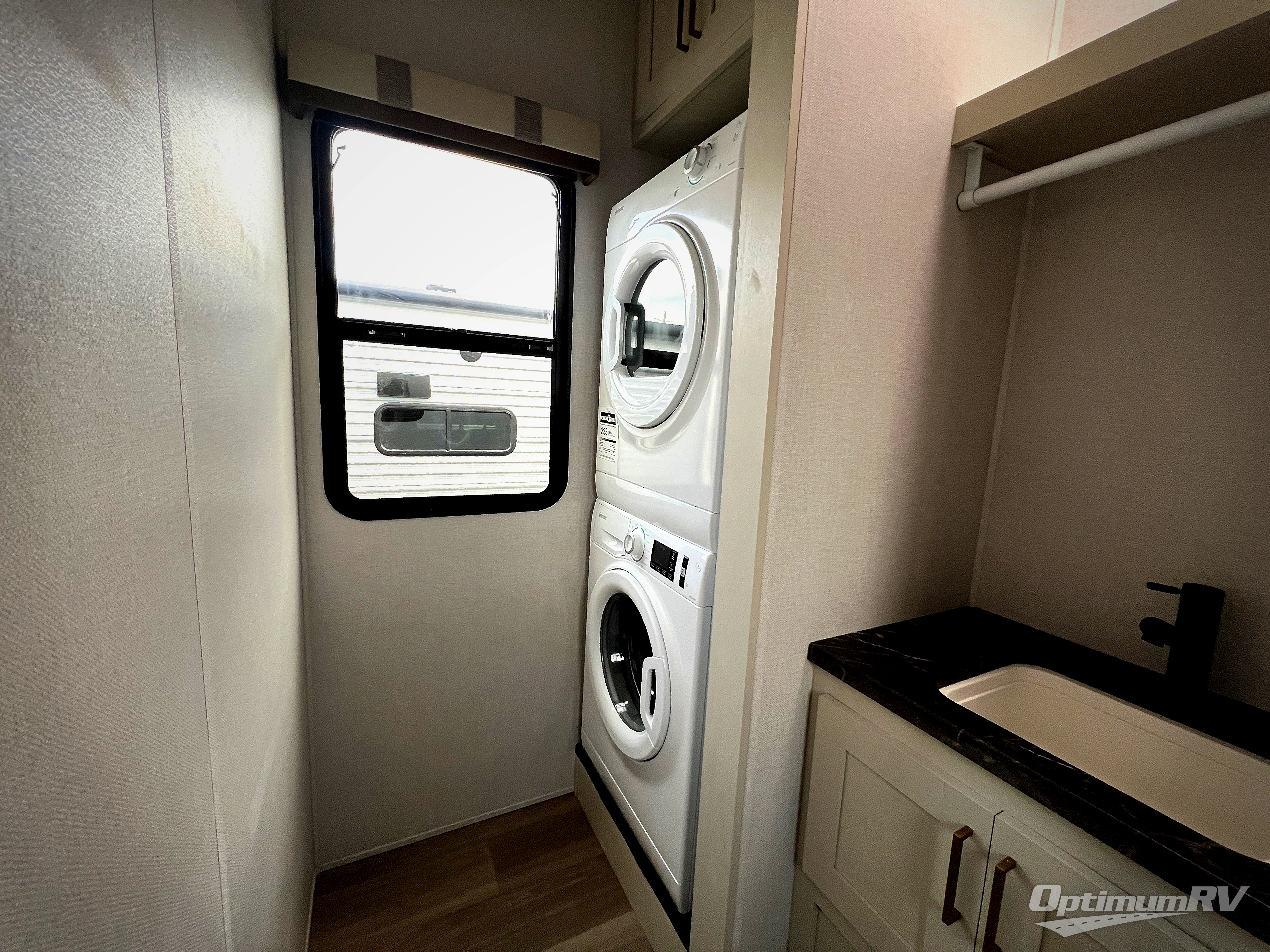 It won't be hard to find comfort and convenience in this spacious fifth wheel! The rear kitchen features ample counter space, a four burner 24" range, plus a 16 cu. ft. 12V refrigerator and pantry for food storage. There is also a desk here if you plan to work while you're away from home, and the coffee station by the pantry will be the perfect place to set up your own Keurig machine. The middle living area includes theater seating across from the 65" TV and fireplace, and there is a hide-a-bed sofa for guests to sleep on. A convenient utility room includes a sink with counter space plus stackable washer/dryer prep to make this an optional laundry room! A full bath will let you freshen up each day, and the front private bedroom will feel just like home with its king bed slide out, dresser and full-width wardrobe!