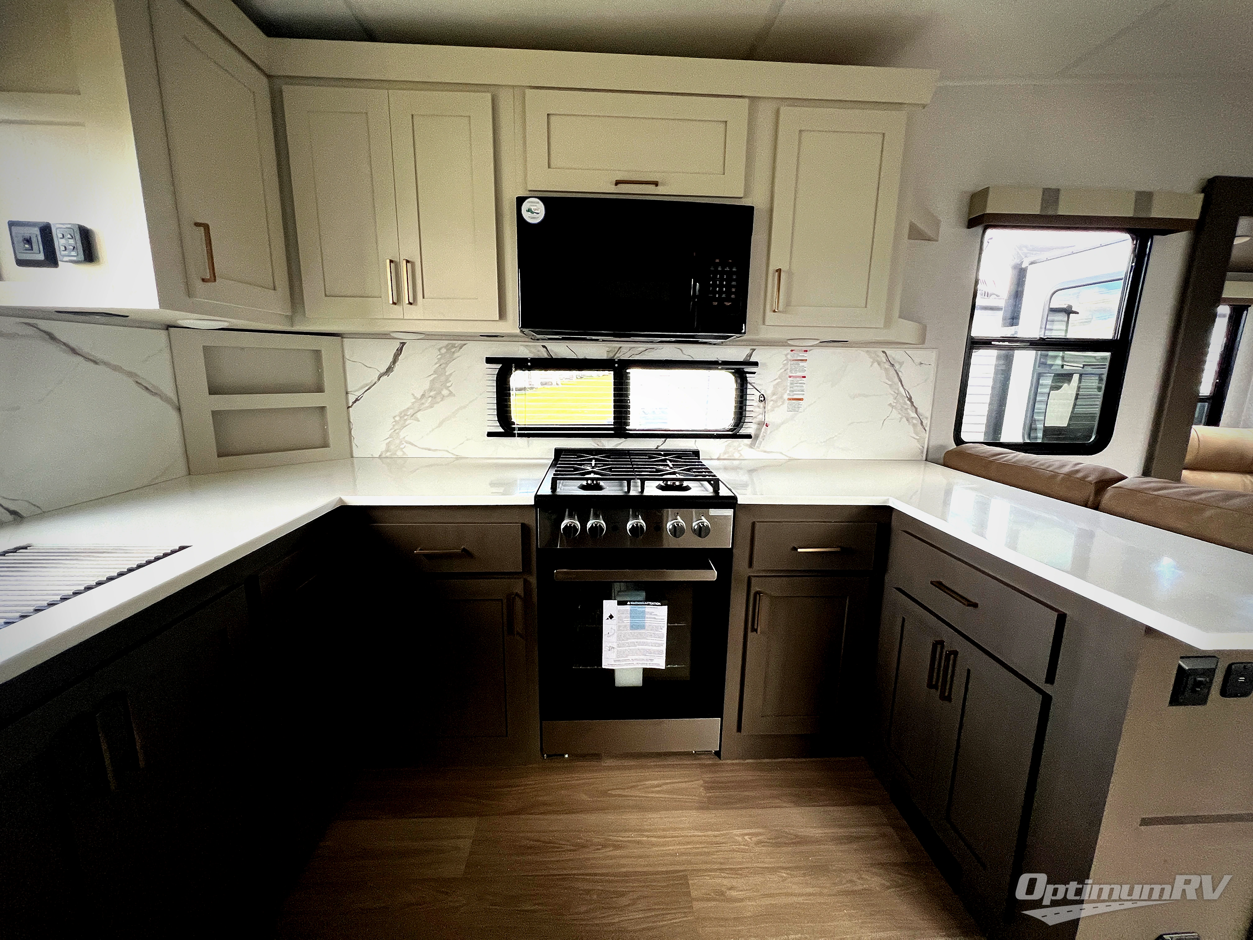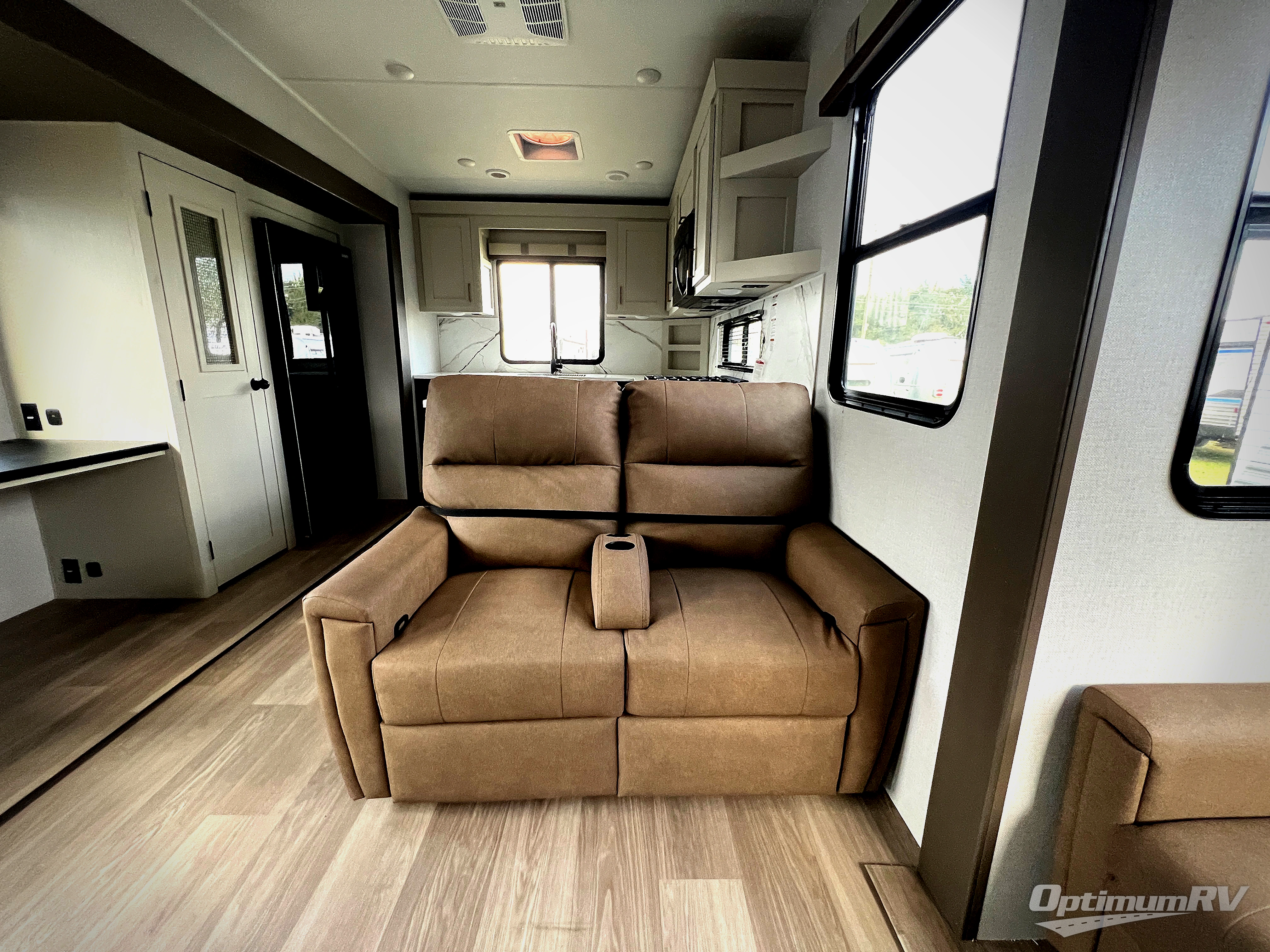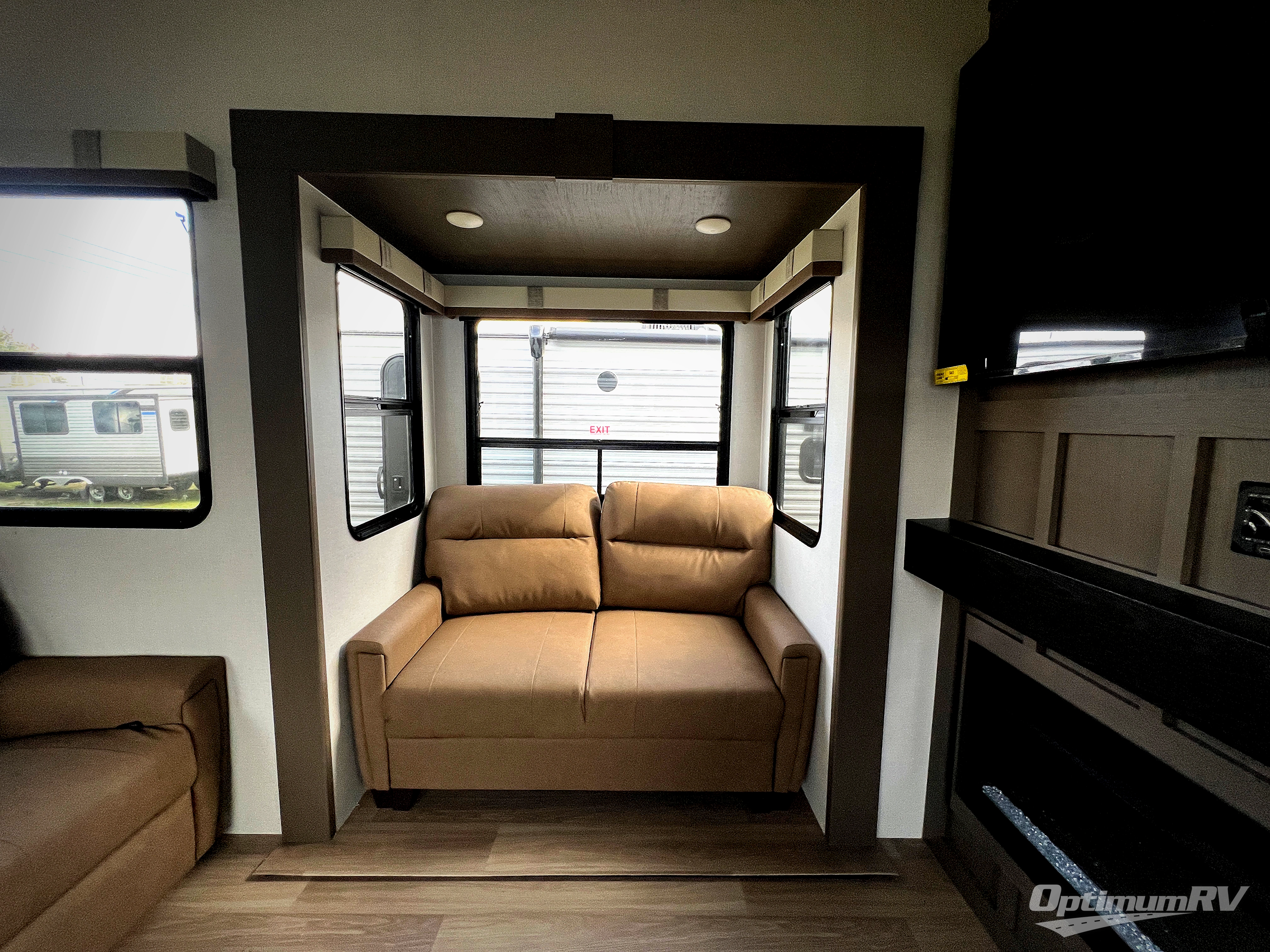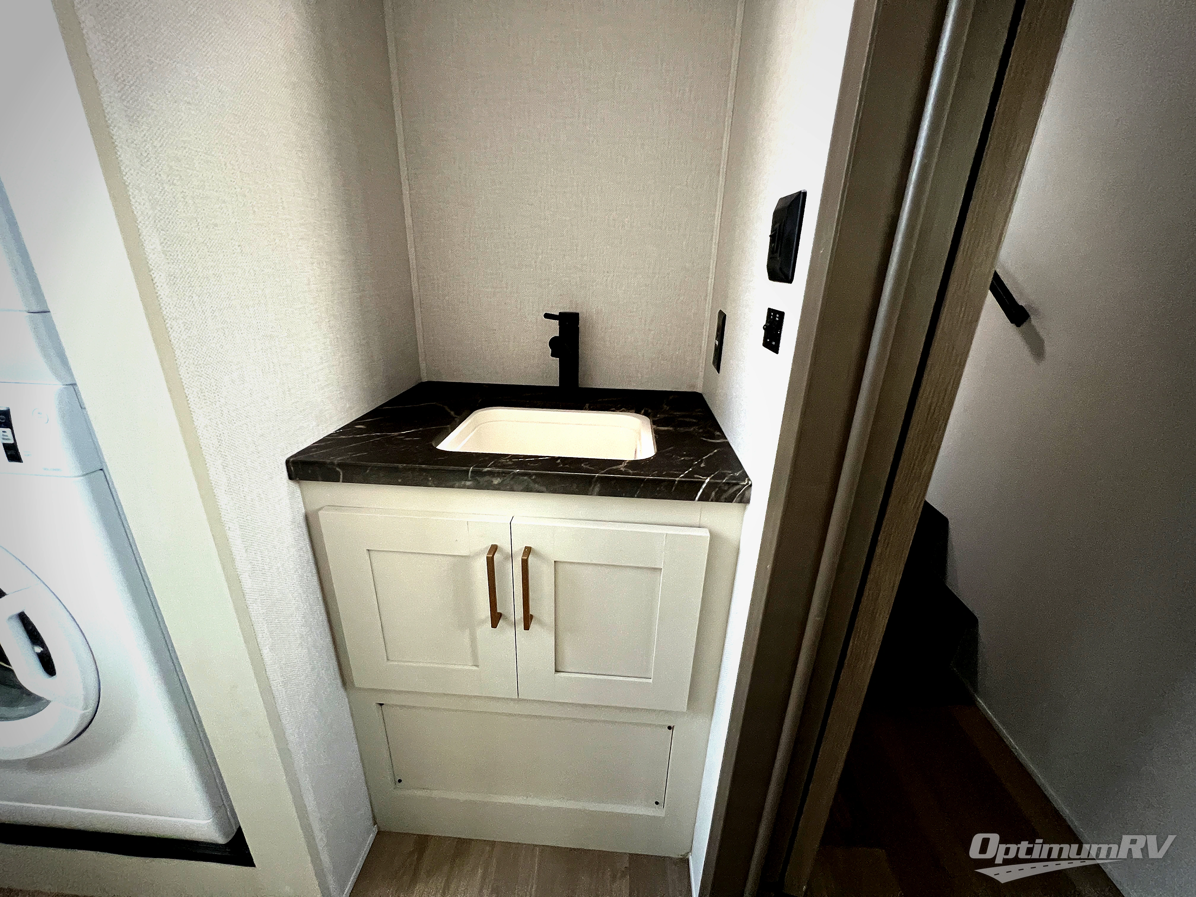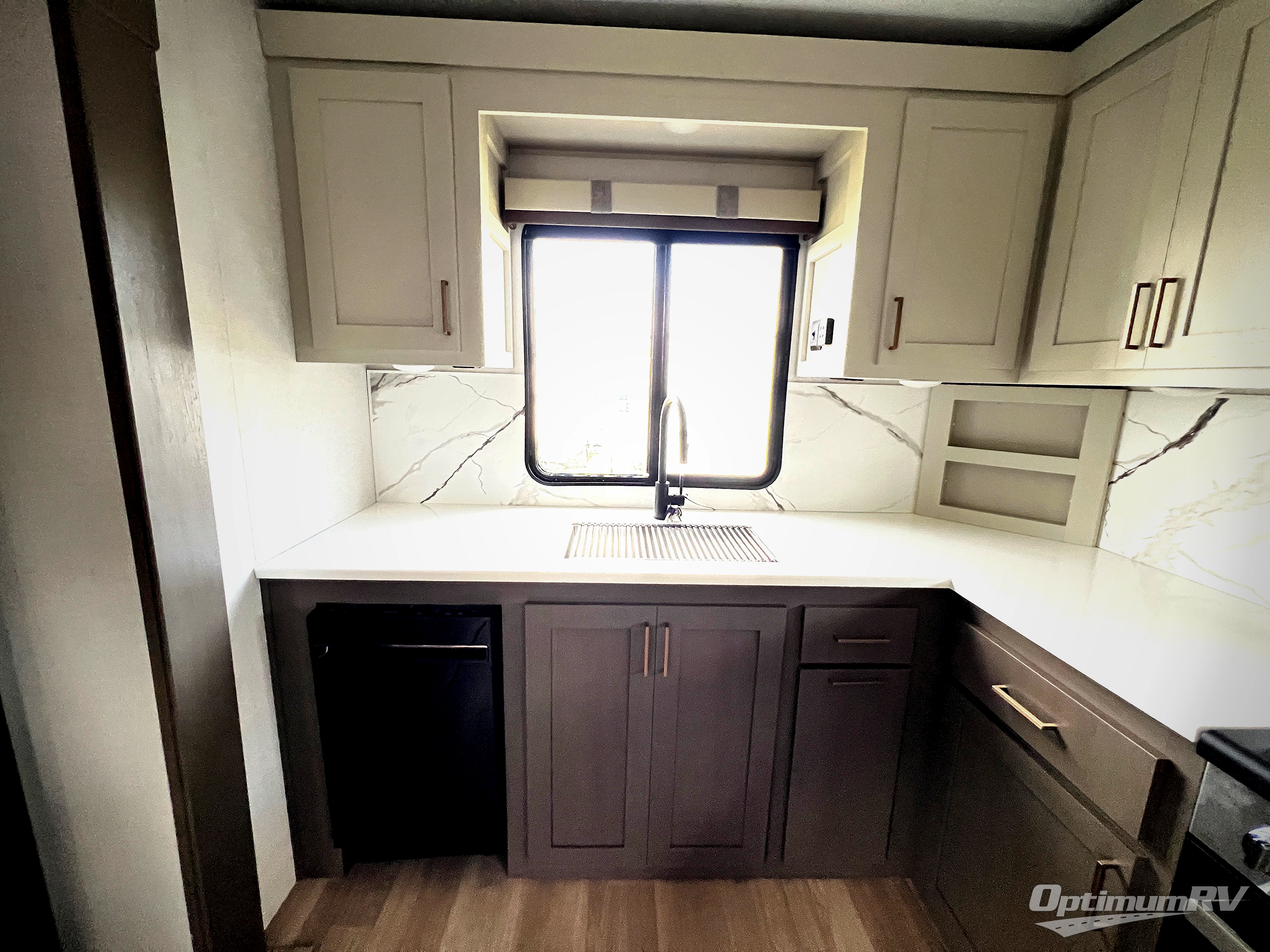 It won't be hard to find comfort and convenience in this spacious fifth wheel! The rear kitchen features ample counter space, a four burner 24" range, plus a 16 cu. ft. 12V refrigerator and pantry for food storage. There is also a desk here if you plan to work while you're away from home, and the coffee station by the pantry will be the perfect place to set up your own Keurig machine. The middle living area includes theater seating across from the 65" TV and fireplace, and there is a hide-a-bed sofa for guests to sleep on. A convenient utility room includes a sink with counter space plus stackable washer/dryer prep to make this an optional laundry room! A full bath will let you freshen up each day, and the front private bedroom will feel just like home with its king bed slide out, dresser and full-width wardrobe!