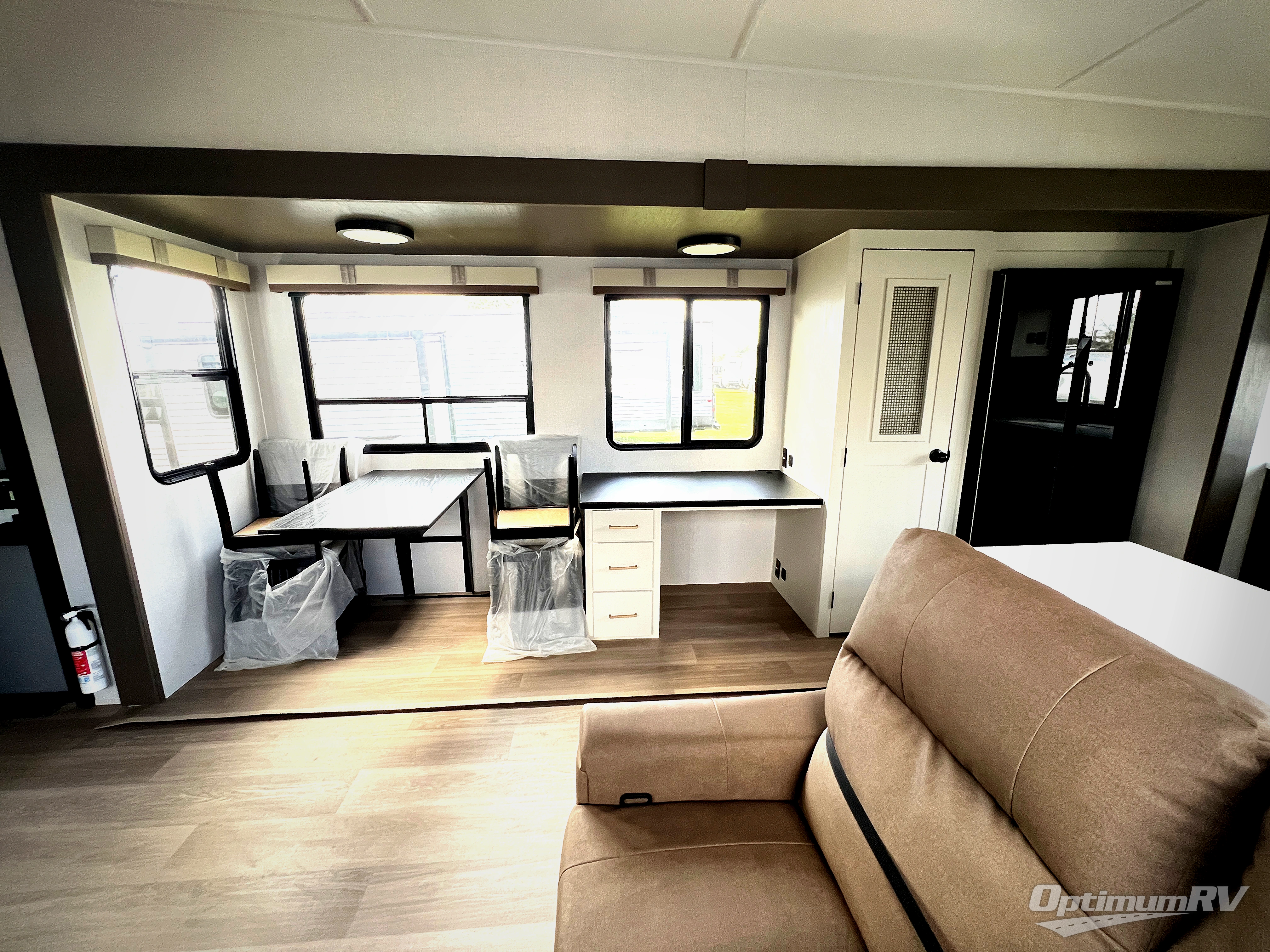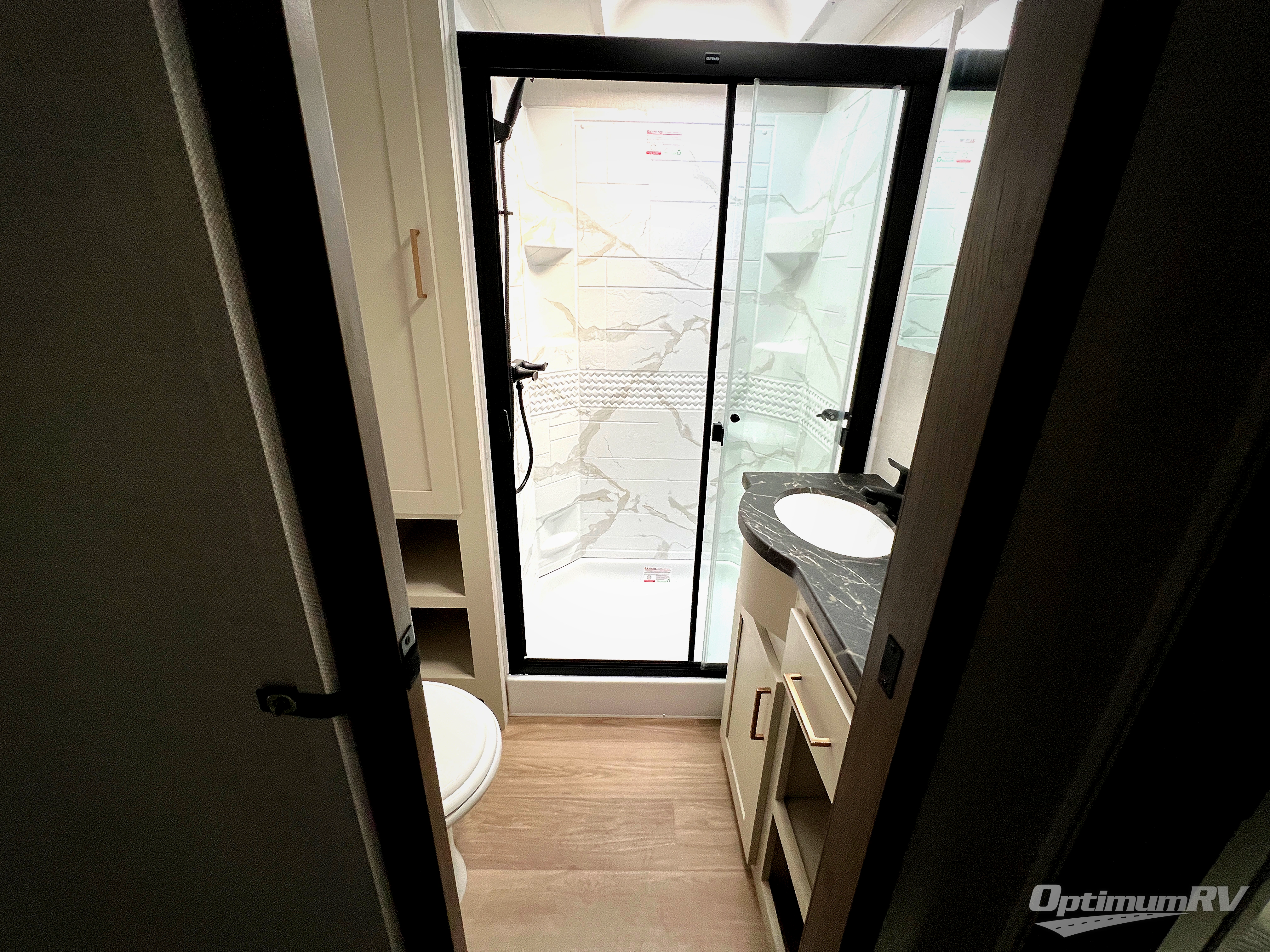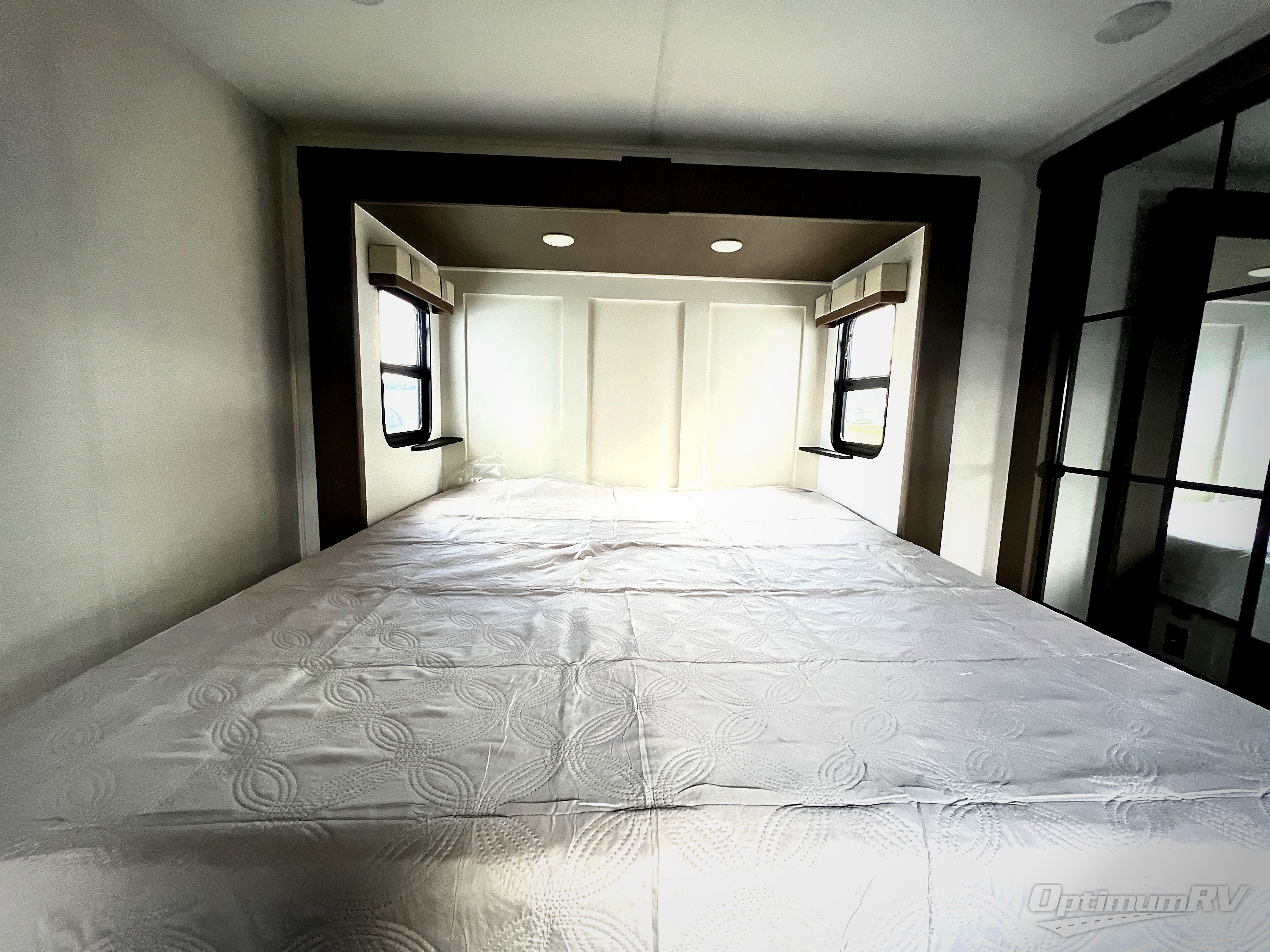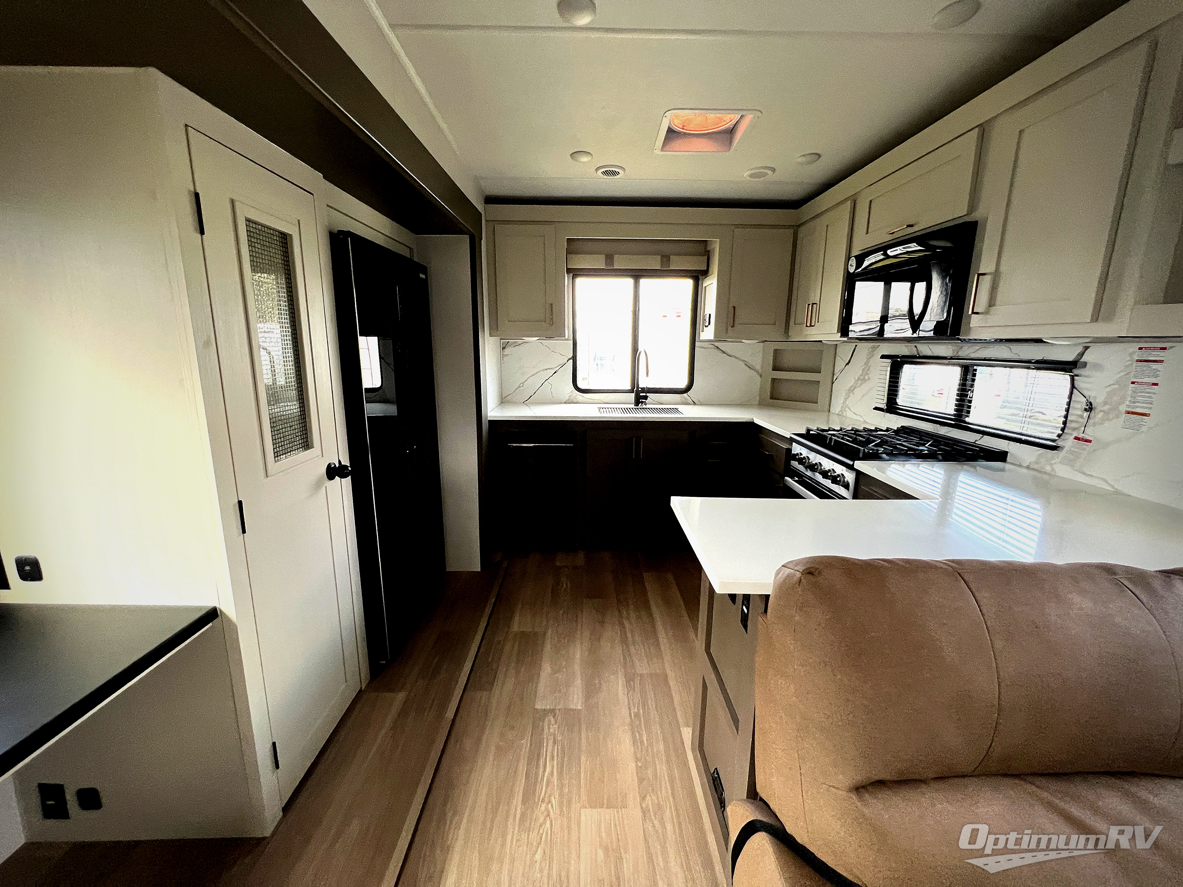 It won't be hard to find comfort and convenience in this spacious fifth wheel! The rear kitchen features ample counter space, a four burner 24" range, plus a 16 cu. ft. 12V refrigerator and pantry for food storage. There is also a desk here if you plan to work while you're away from home, and the coffee station by the pantry will be the perfect place to set up your own Keurig machine. The middle living area includes theater seating across from the 65" TV and fireplace, and there is a hide-a-bed sofa for guests to sleep on. A convenient utility room includes a sink with counter space plus stackable washer/dryer prep to make this an optional laundry room! A full bath will let you freshen up each day, and the front private bedroom will feel just like home with its king bed slide out, dresser and full-width wardrobe!