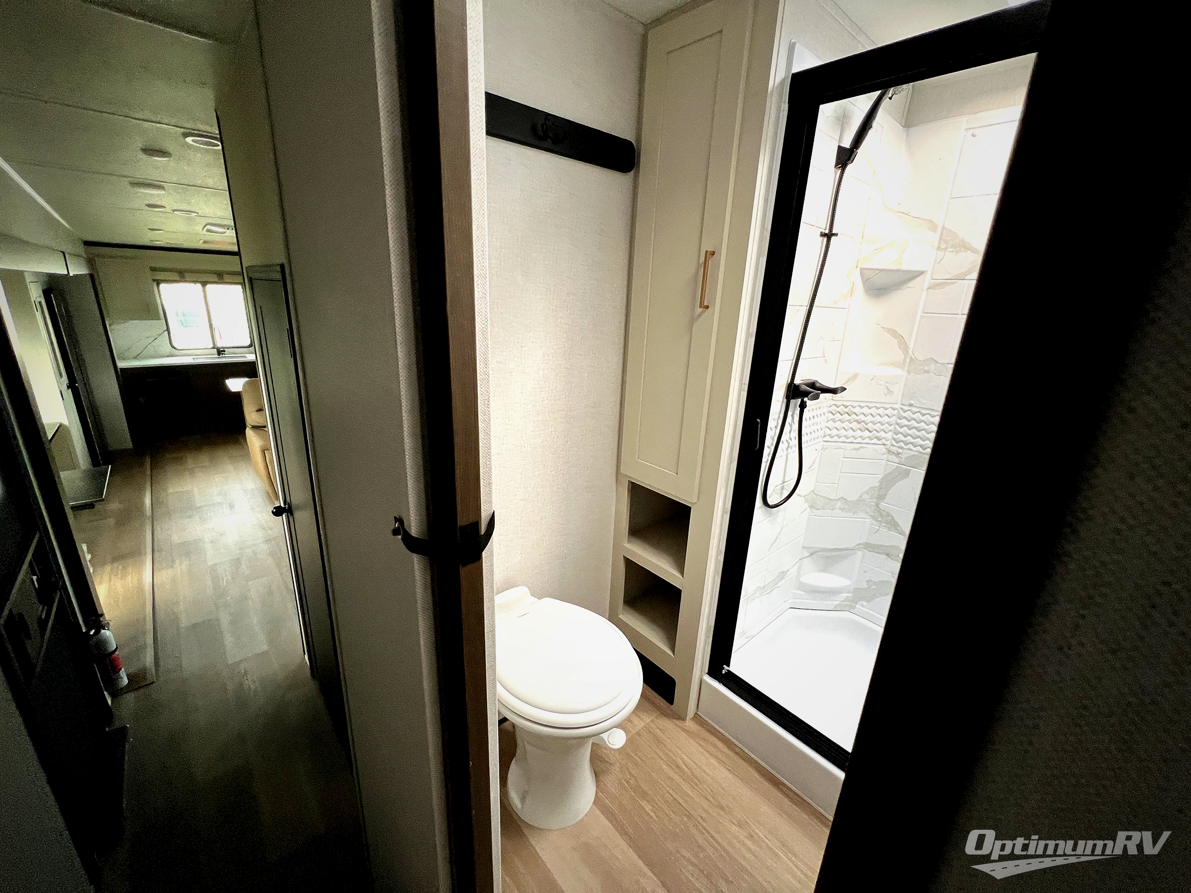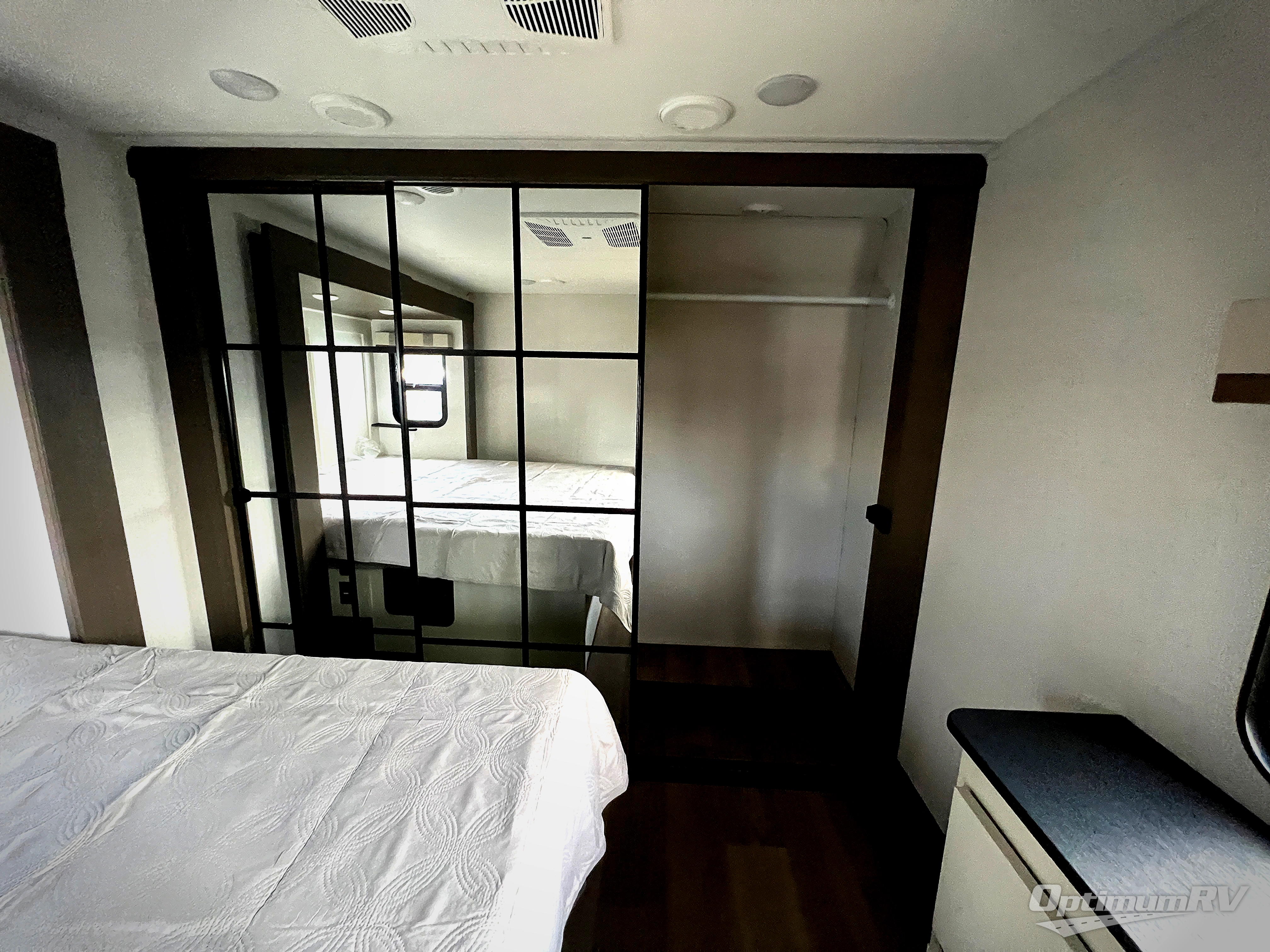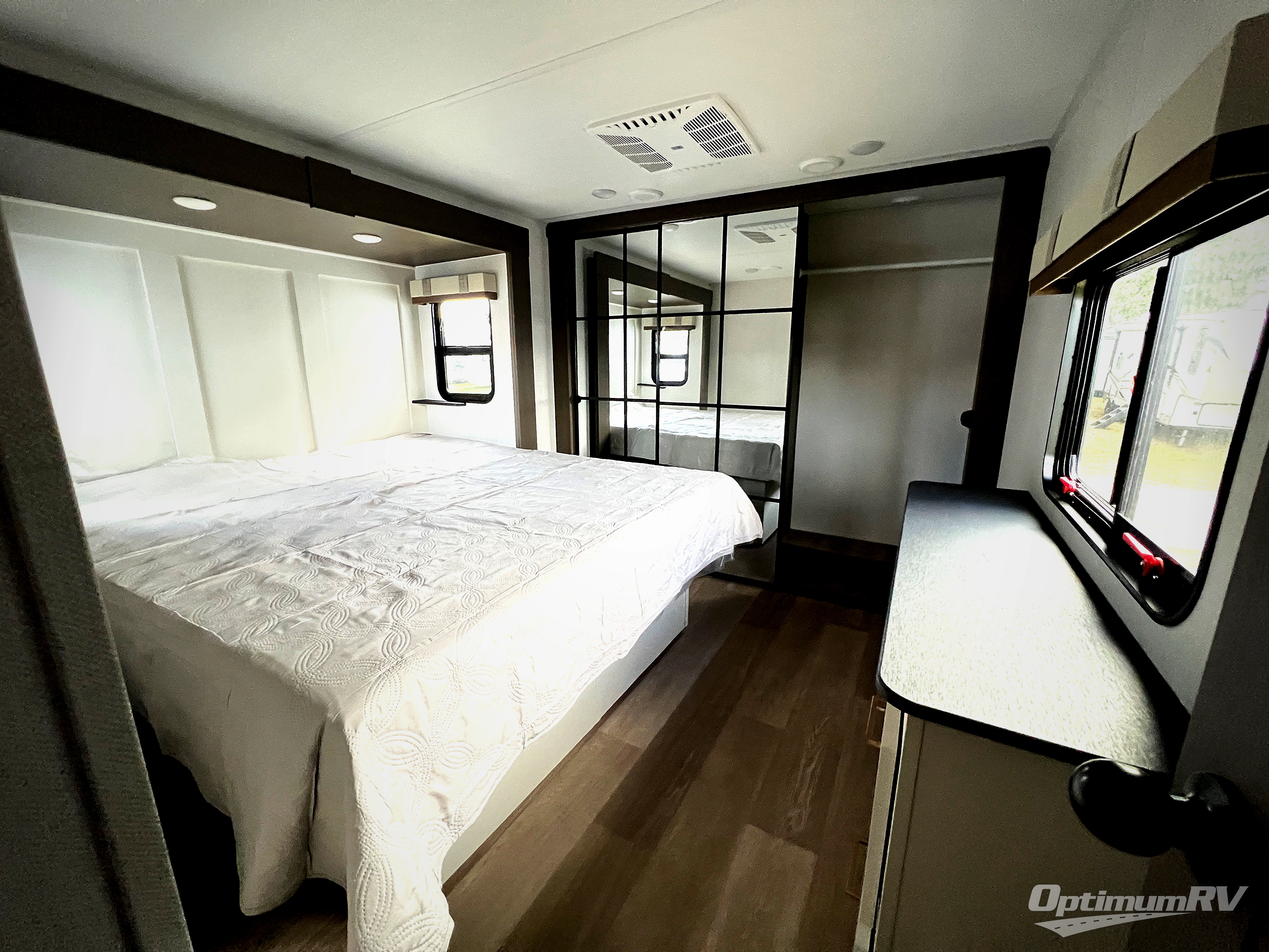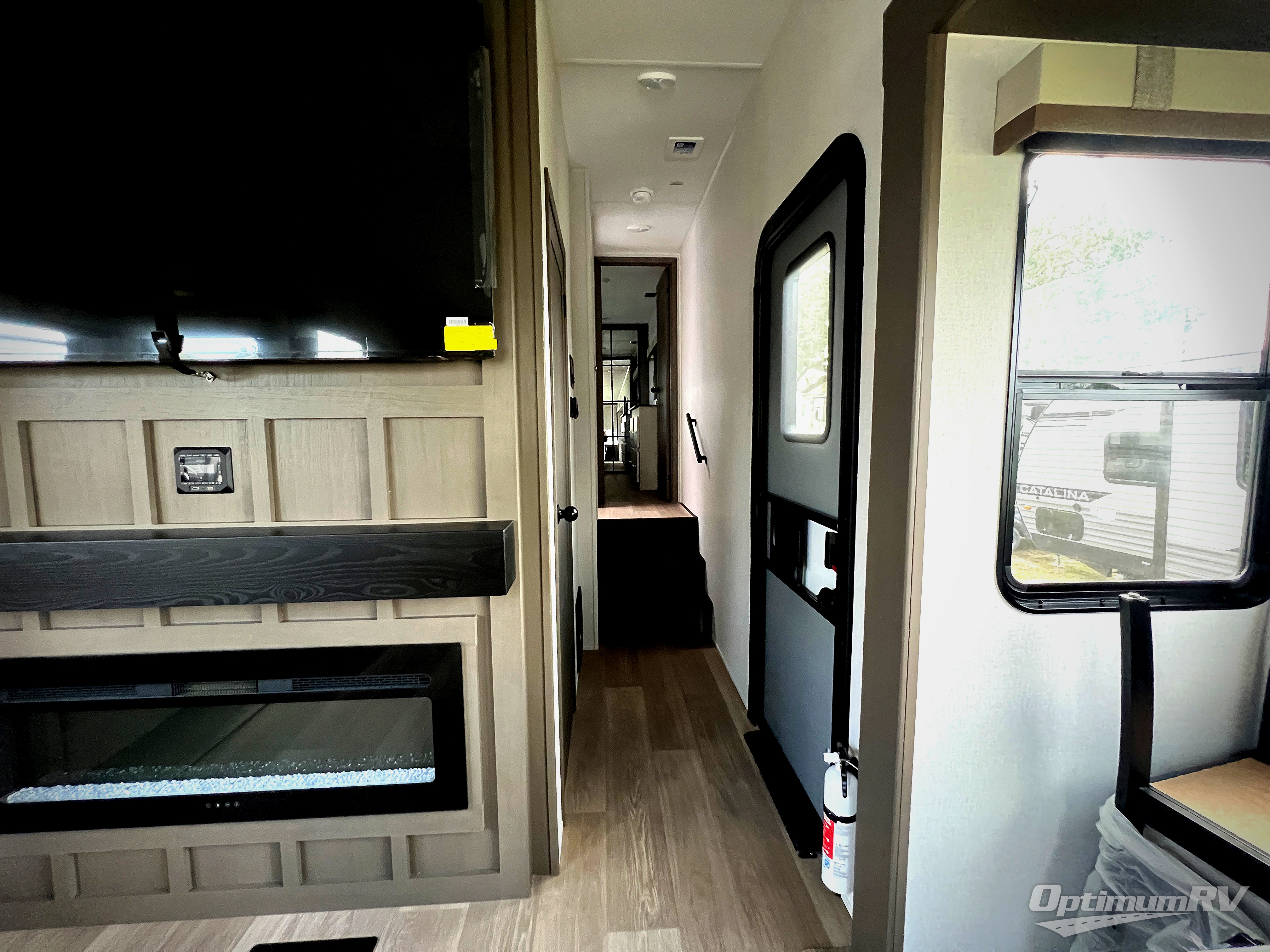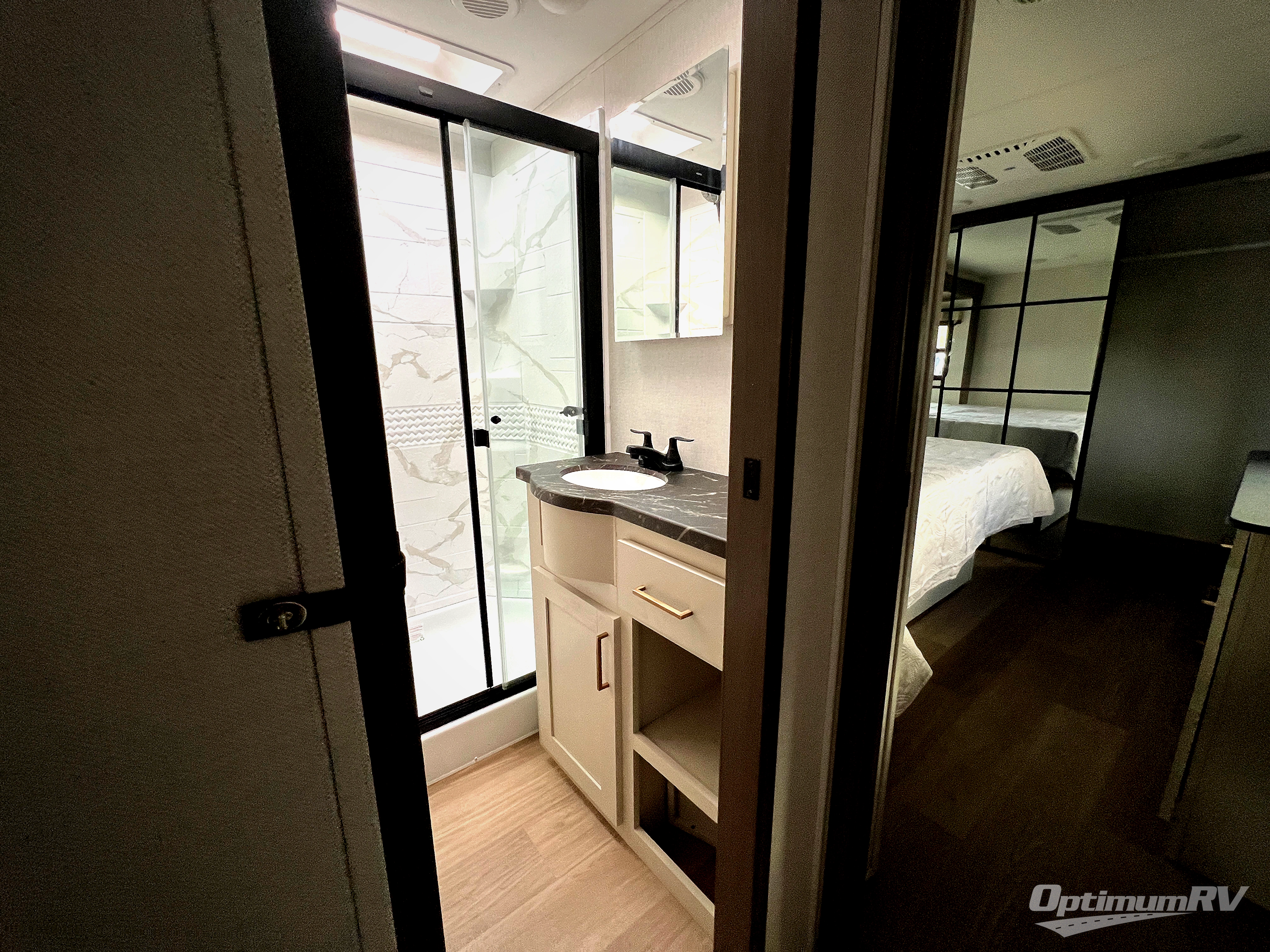 It won't be hard to find comfort and convenience in this spacious fifth wheel! The rear kitchen features ample counter space, a four burner 24" range, plus a 16 cu. ft. 12V refrigerator and pantry for food storage. There is also a desk here if you plan to work while you're away from home, and the coffee station by the pantry will be the perfect place to set up your own Keurig machine. The middle living area includes theater seating across from the 65" TV and fireplace, and there is a hide-a-bed sofa for guests to sleep on. A convenient utility room includes a sink with counter space plus stackable washer/dryer prep to make this an optional laundry room! A full bath will let you freshen up each day, and the front private bedroom will feel just like home with its king bed slide out, dresser and full-width wardrobe!