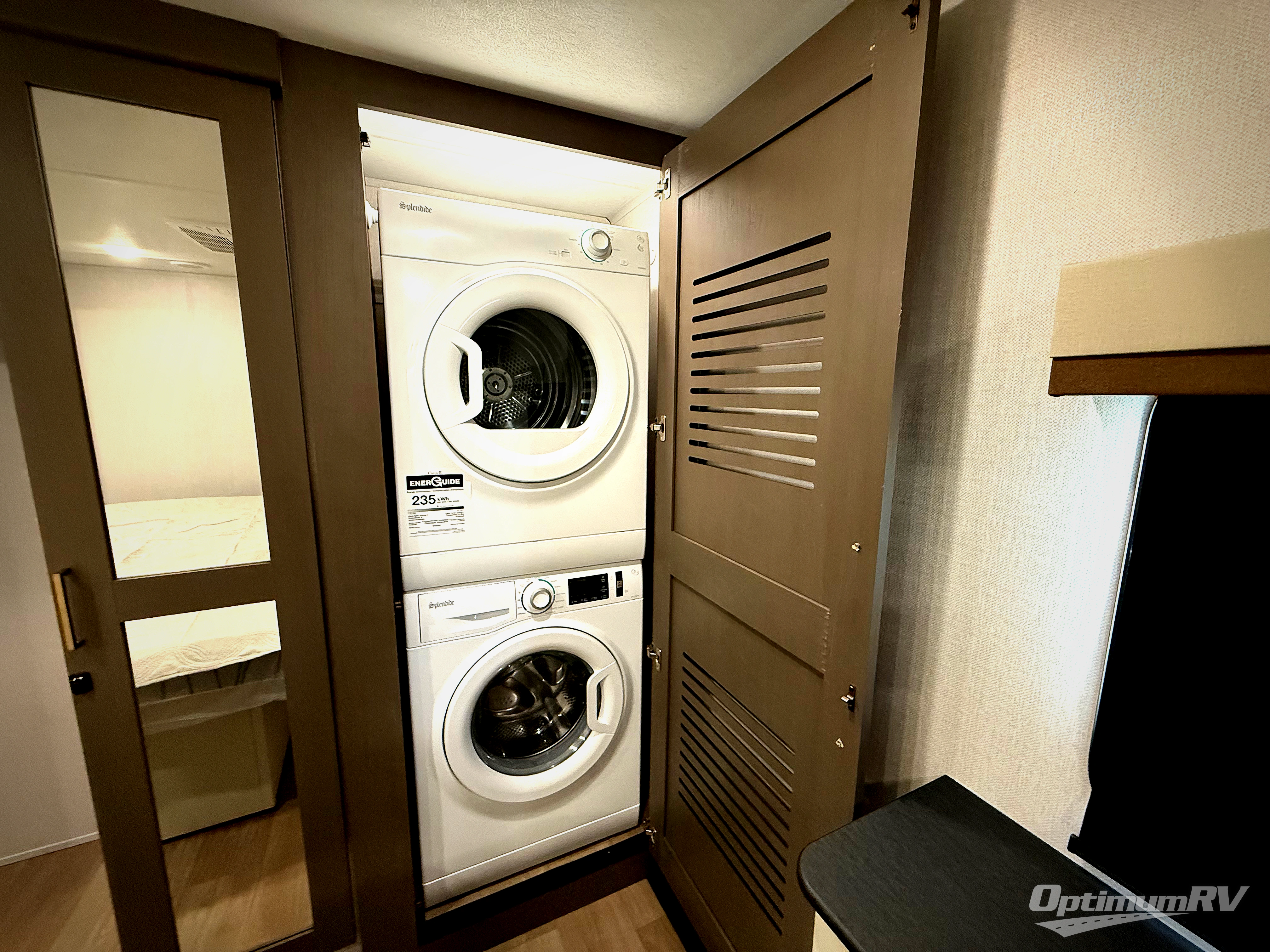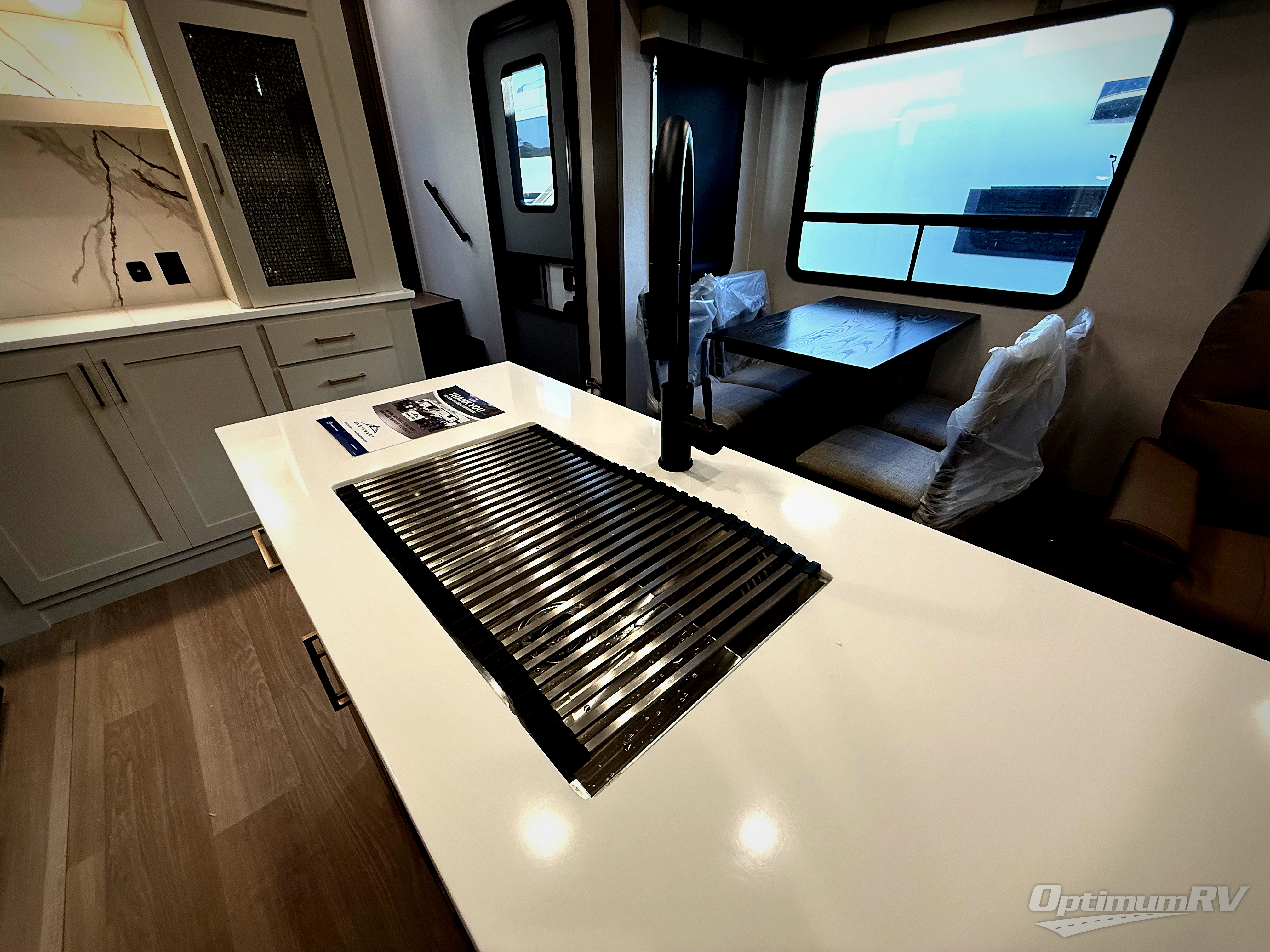 This is the perfect fifth wheel if you enjoy bringing along extra friends and family! You'll have the front private bedroom all to yourselves with a king bed slide out, a dresser with TV prep, plus a large front wardrobe and stackable washer/dryer prep. And a full bath is right next door for easy use. Your guests will love the rear den suite with a power tilt queen bed slide and a desk with a chair. There is also a full rear bath with its own exterior entry door and a loft area for even more sleeping or storage space. In the morning, you can all meet in the combined kitchen and living area that includes dual opposing slides for more space, a kitchen island, and a hutch for additional storage. There is also theater seating in direct view of the 50" TV and fireplace, along with a dinette with four chairs where you can dine together.