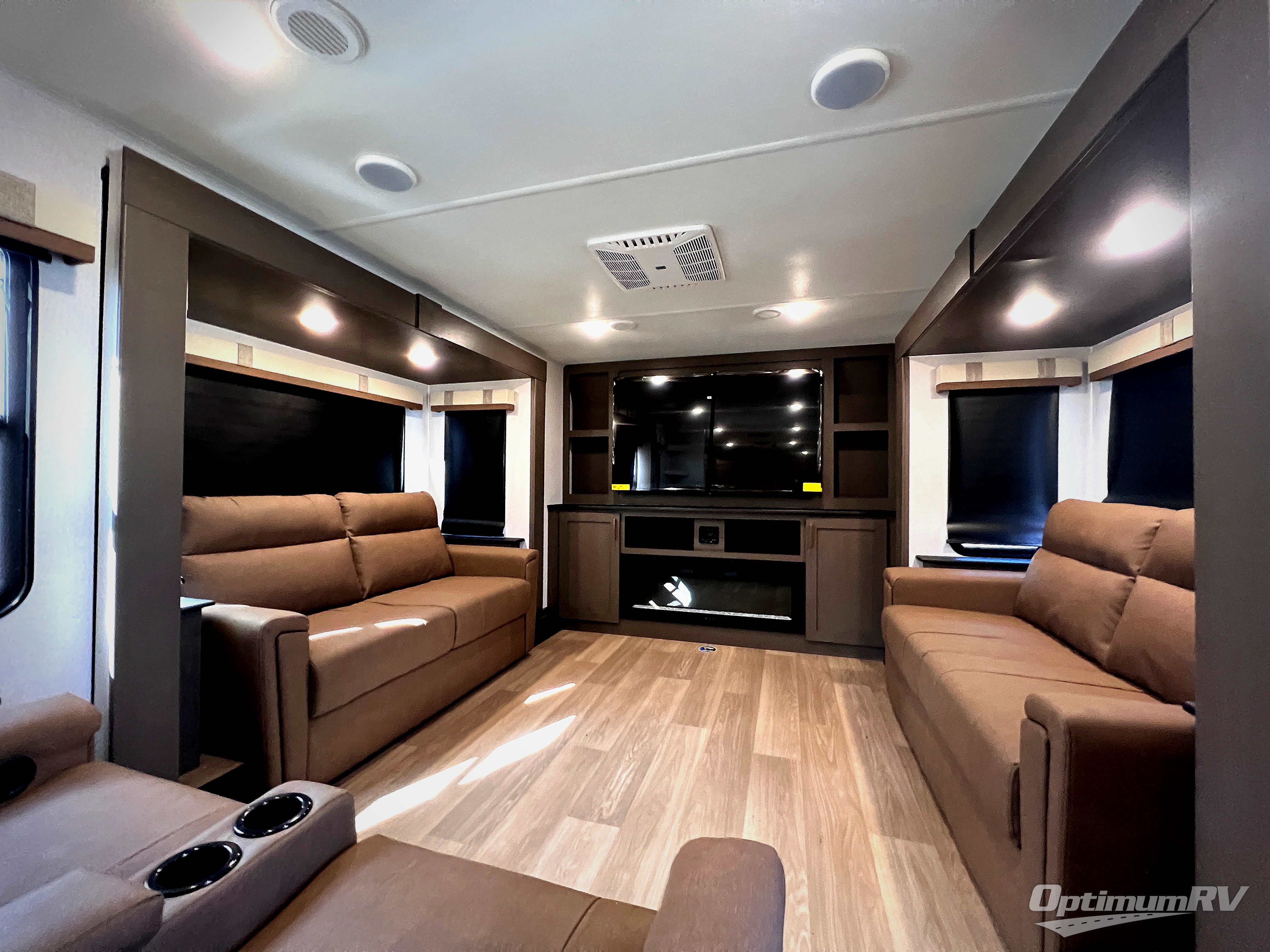 You'll always have a good time in this quad slide out fifth wheel! The front living area will be a favorite hang-out spot with its dual opposing queen bed hide-a-bed sofa slides, along with theater seating across from a 65" TV and fireplace. Your guests can transform this space into their bedroom at night, while you take the rear private bedroom with a king bed slide out, a dresser, and full-width wardrobe. A full bath will let you clean up every day, and the middle kitchen features ample counter space to prep meals. There is also a free-standing dinette where you can dine together, or you can take your plate outdoors to sit under the two power awnings!