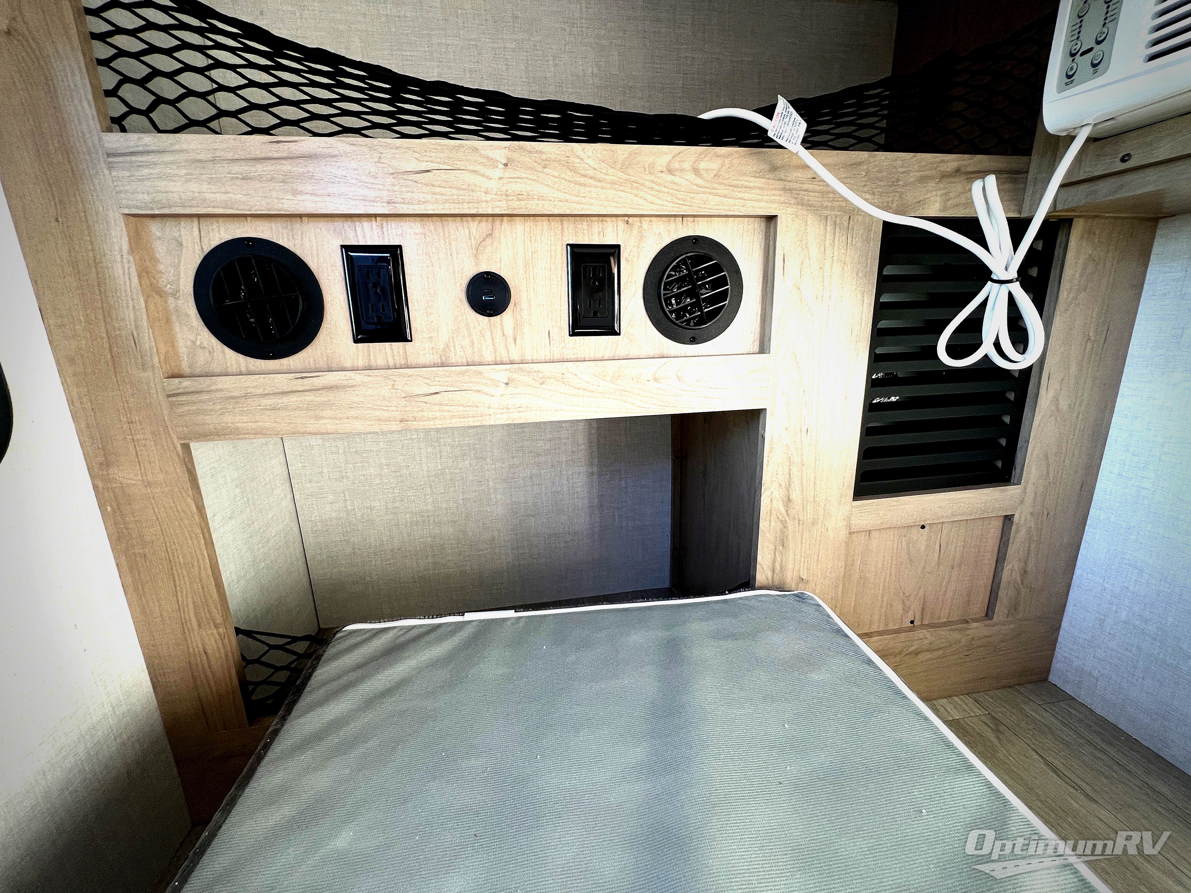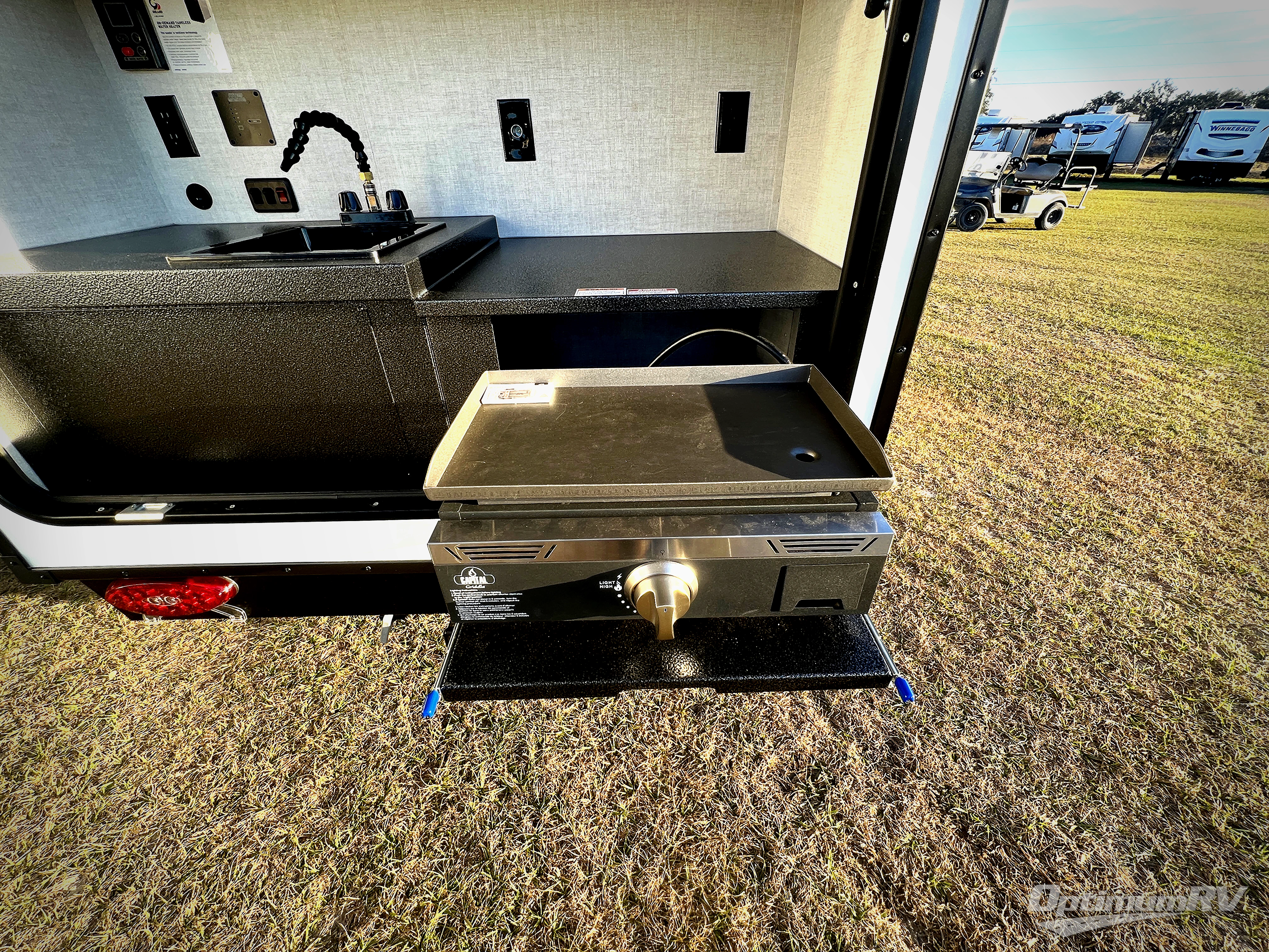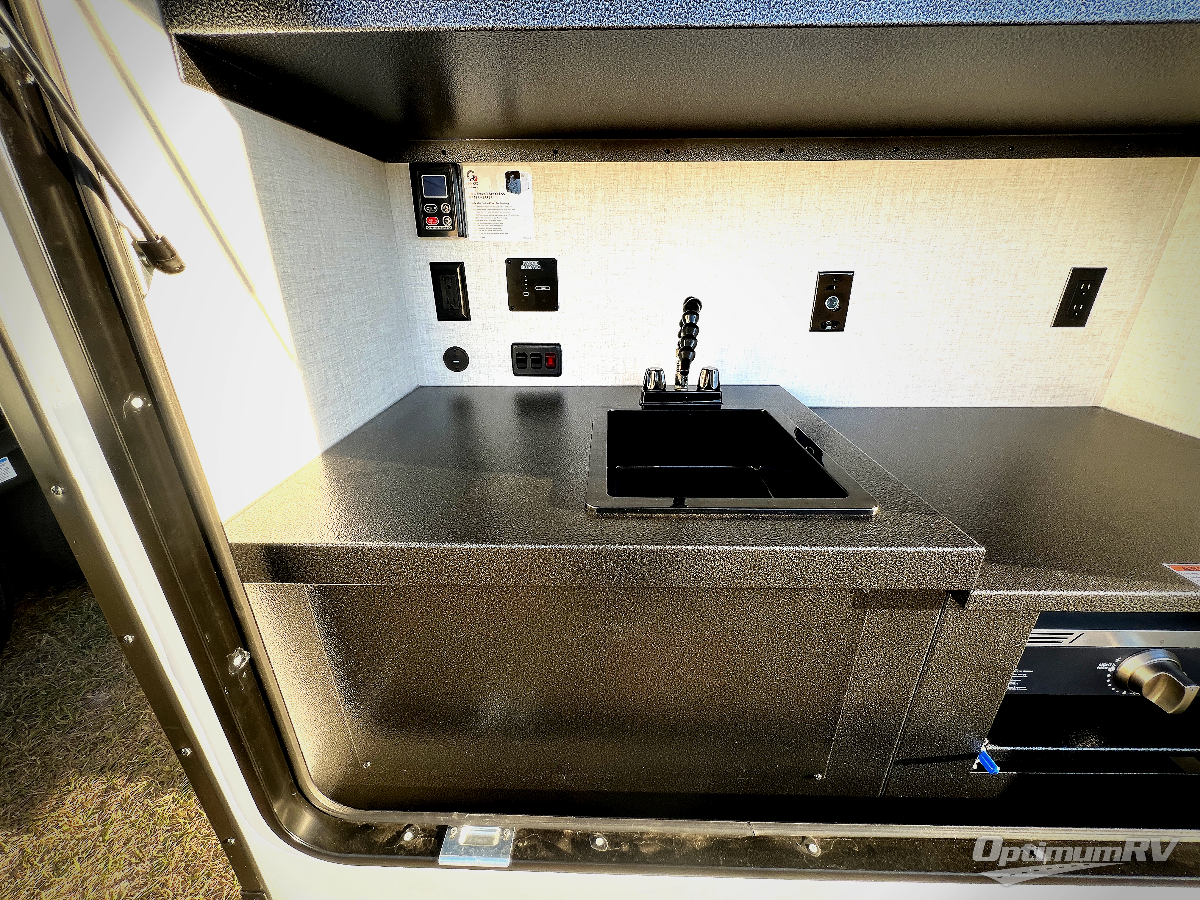 This compact travel trailer is easy to tow and easy to love! There are fender steps so that you can reach the top of your unit, which will especially be helpful if you choose to add the optional Thule roof rack system. You will also find a 6.5" manual awning outside or you can choose the optional batwing awning. The rear kitchen includes a griddle which attaches to the LP Quick Connect, a sink, plus an overhead shelf for food storage. An optional 1.7 cu. ft. refrigerator can be added for even more convenience. Inside, you'll enjoy the dual 28" x 84" mattresses with a converted 56" x 84" "California Queen" sleeping space for a great night's rest. There are also front overhead shelves with shelving below plus floor to ceiling shelves in the back so nothing gets left behind.