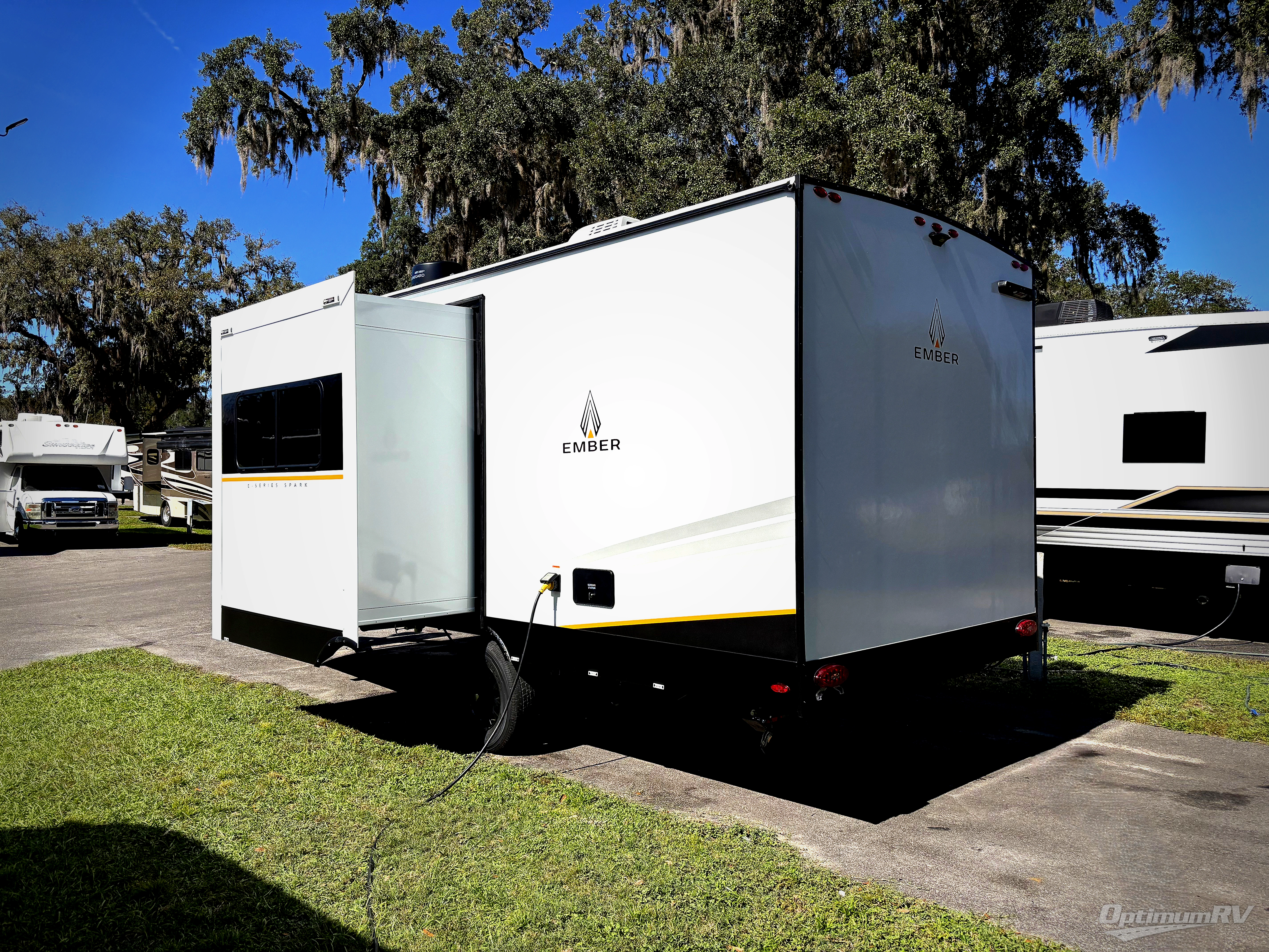 With any E-Series travel trailer by Ember RV you will enjoy a lightweight RV with all the "Essentials" needed for memorable trips in the great outdoors! Each model is constructed with durable laminated Azdel Onboard composite walls, a full walkable roof with a one-piece Tufflex PVC roofing material, and a gel-coated fiberglass exterior. The Dexter axles with E-Z lube hubs and forward self-adjusting electric brakes plus Goodyear Endurance tires will provide a smooth tow from home to campground. You will appreciate the Congoleum DiamondFlor "carpetless" interior that is easy to clean, and the hardwood framed cabinet doors will create a more residential feel. Each model includes a tankless on-demand water heater for endless hot showers and an 18,000 BTU Max Cool "Whisper Quiet" A/C, which is the largest single A/C in its class! If you're looking for off-grid capabilities, you might want to choose the optional Off-Grid Solar Package with 400 total watts of solar panels, a 2,000W Pure Sine wave inverter, and a Victron MPPT solar controller!