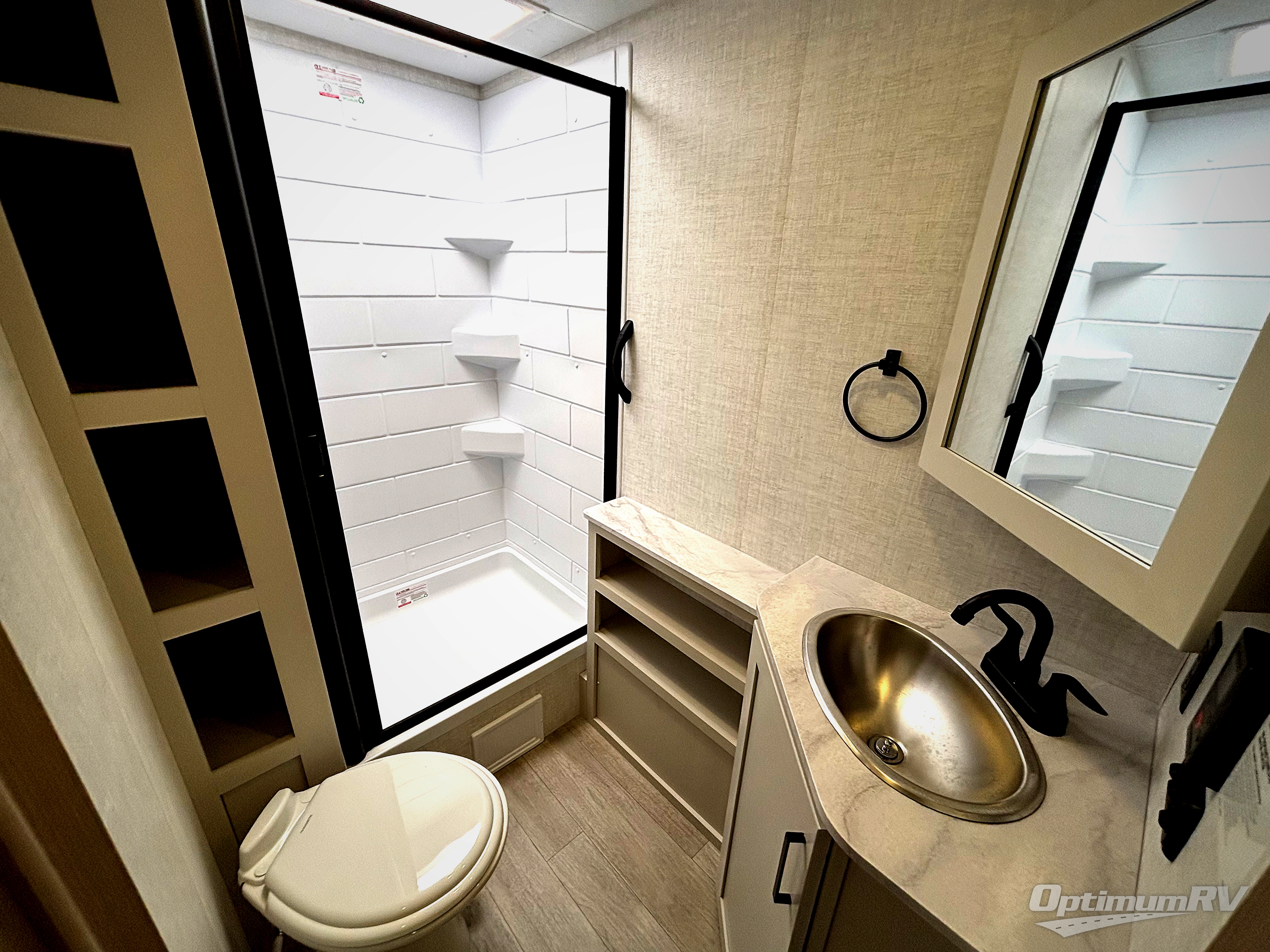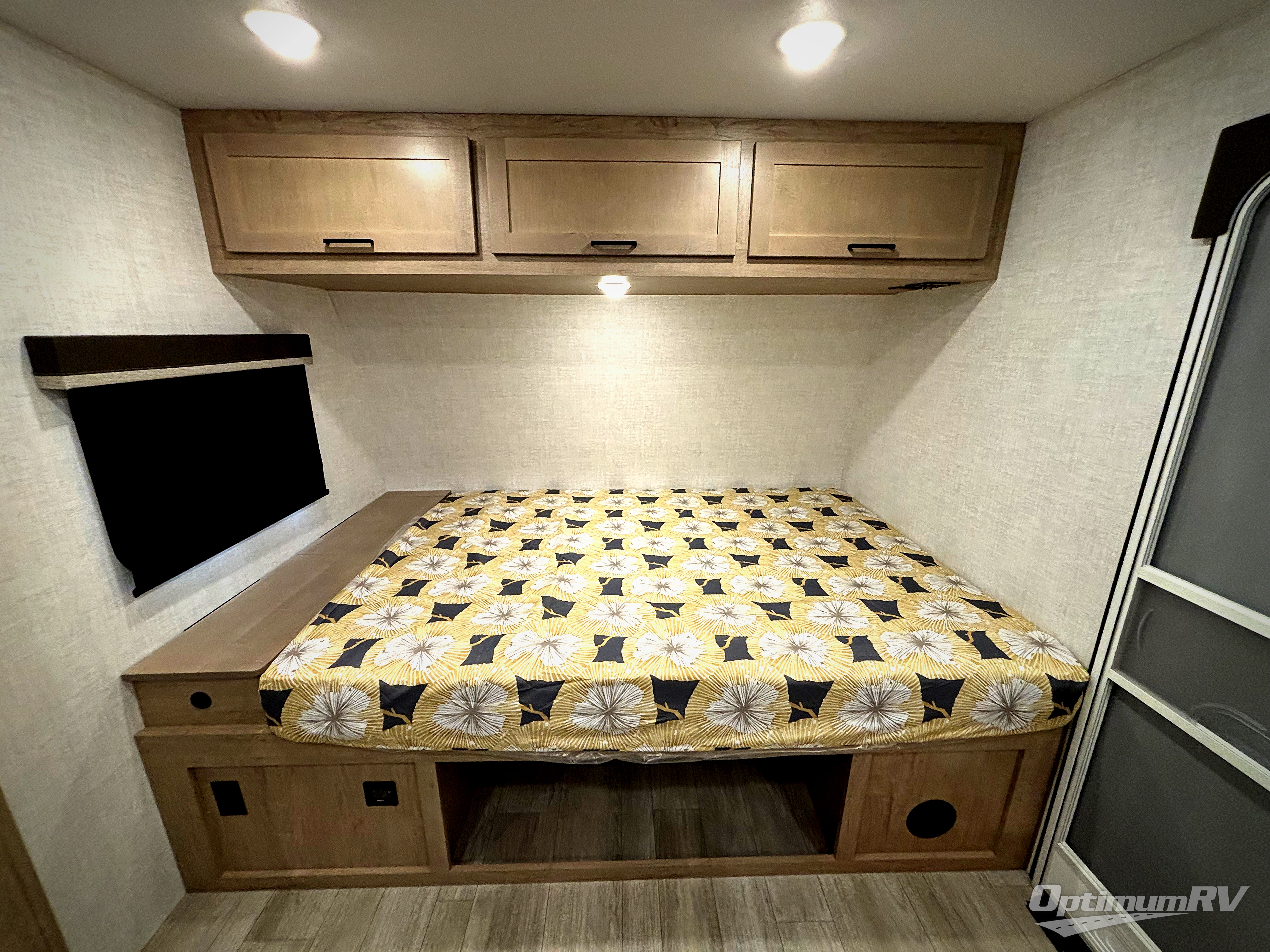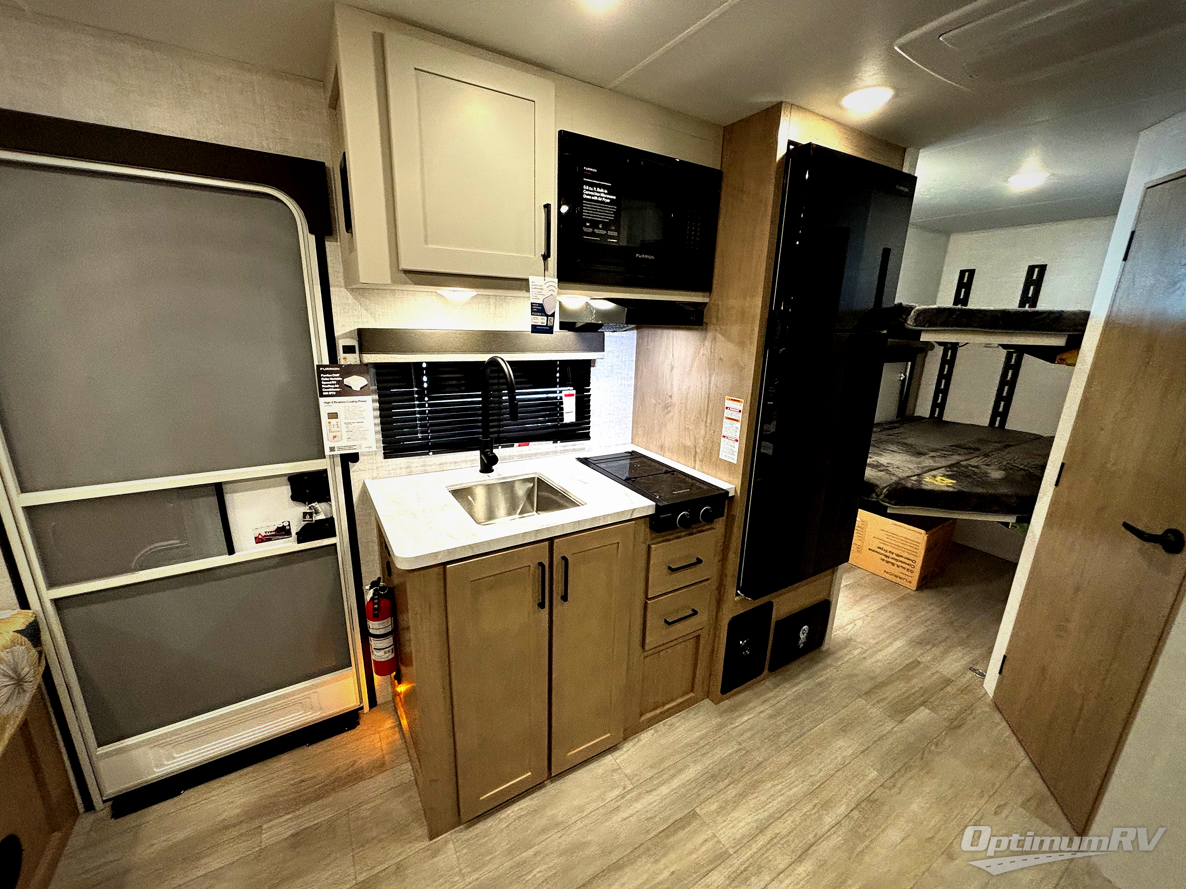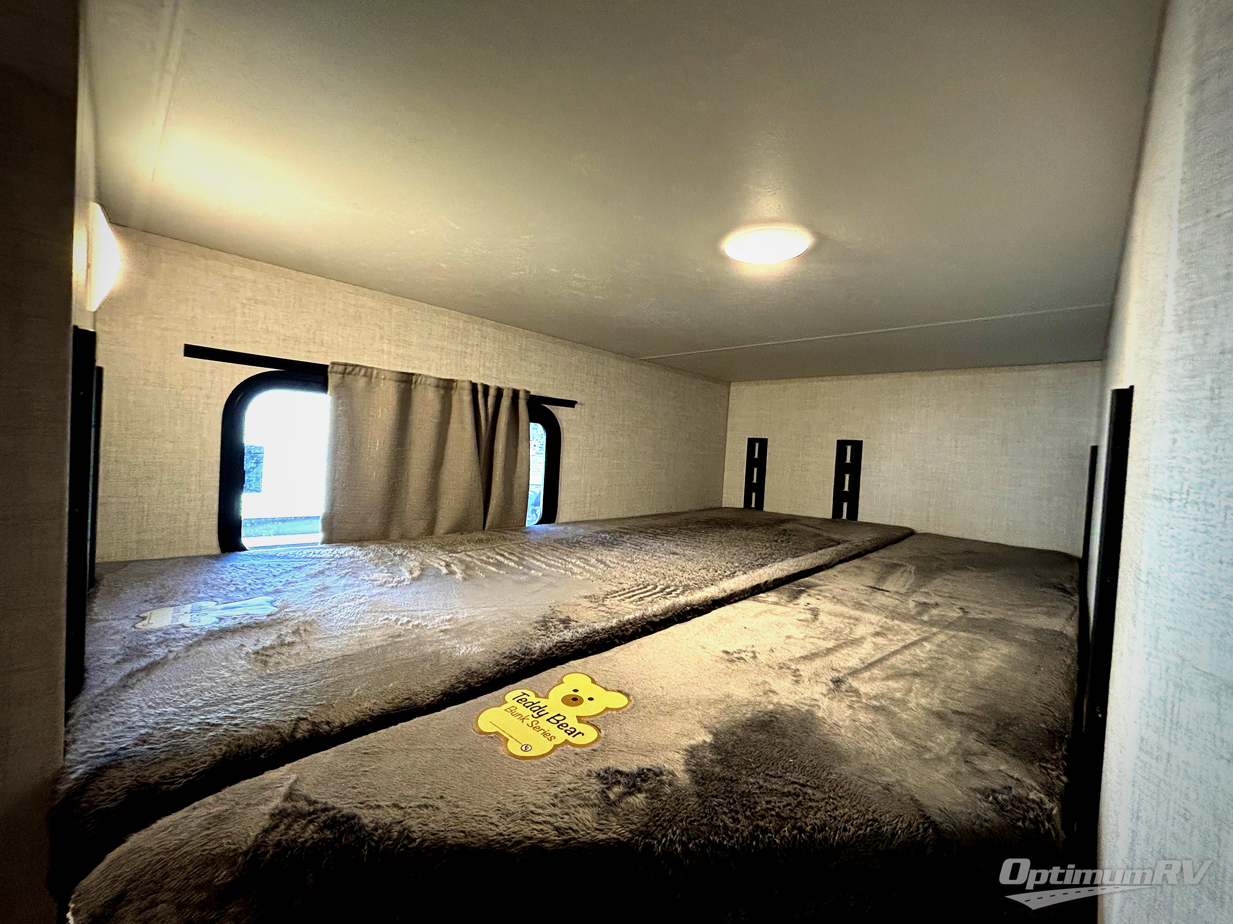 Time at the campground in this travel trailer will be time well spent. Once you arrive at your destination, you can put out the 16' electric awning, unpack the pass-through storage, then head inside for lunch. There is an air fryer convection microwave plus a dual burner cooktop to make meals each day, and the 10 cu. ft. 12V refrigerator will keep your food fresh. A legless dinette slide provides a place to dine together and even let a guest sleep over. If you're not needing the extra sleeping space, just choose the optional theater seating! You'll find the front queen bed will give you a great night's rest, and there is a full bath on board that will allow you to freshen up each morning. This unit includes the patent-pending repositionable EmberTrack E-Track bunk/storage system that allows for multiple single/double bunk configurations, depending on your needs.