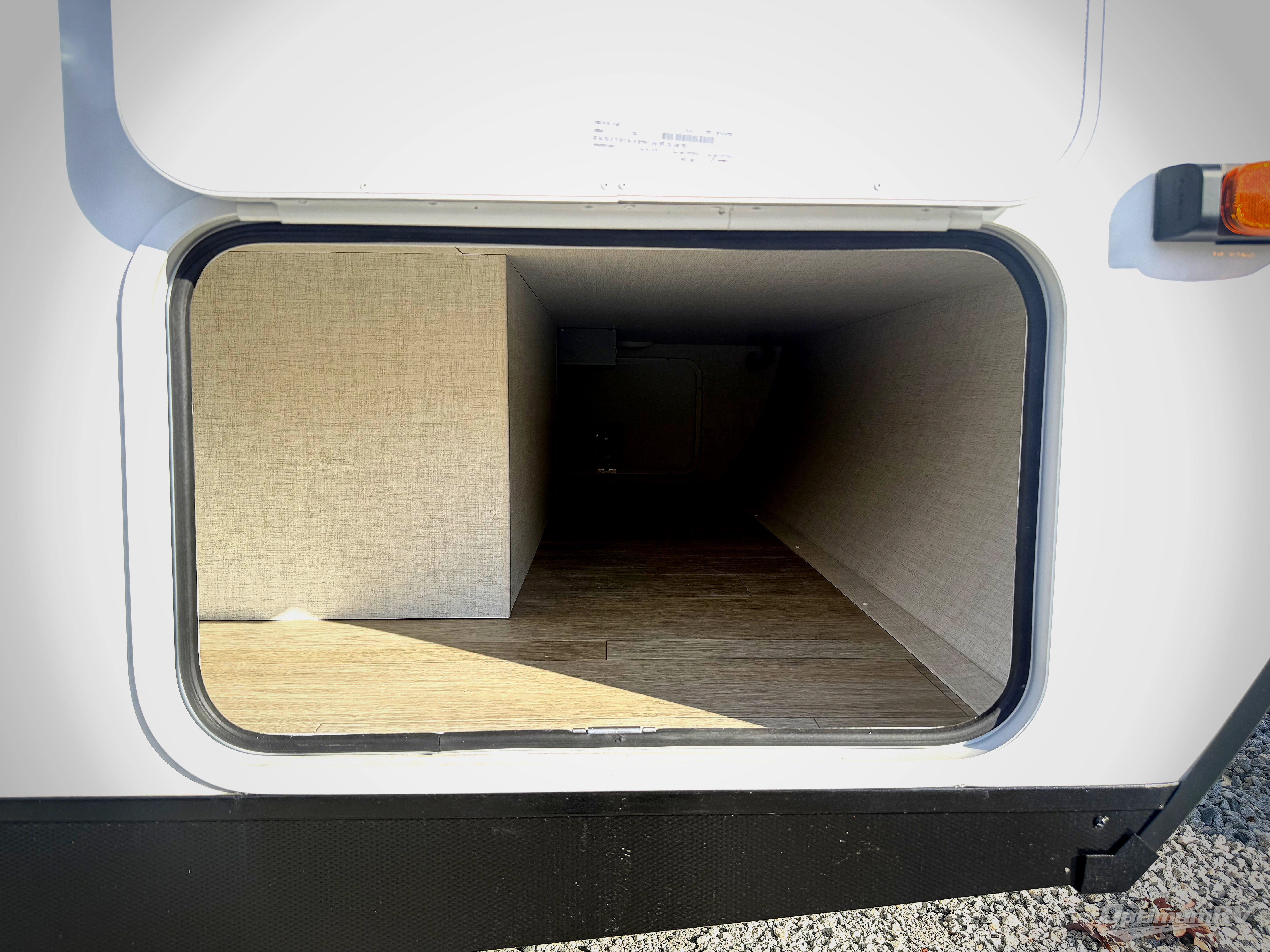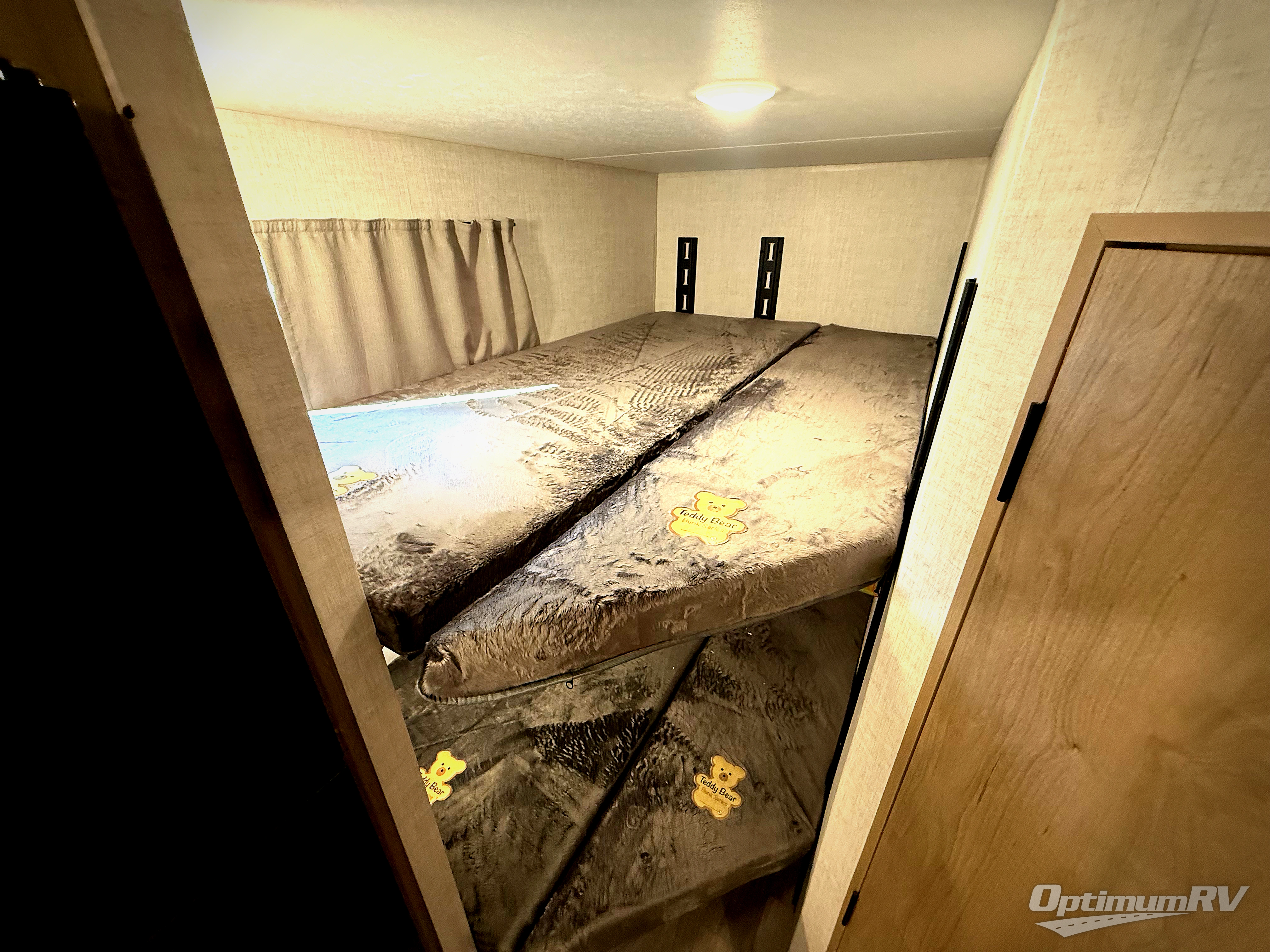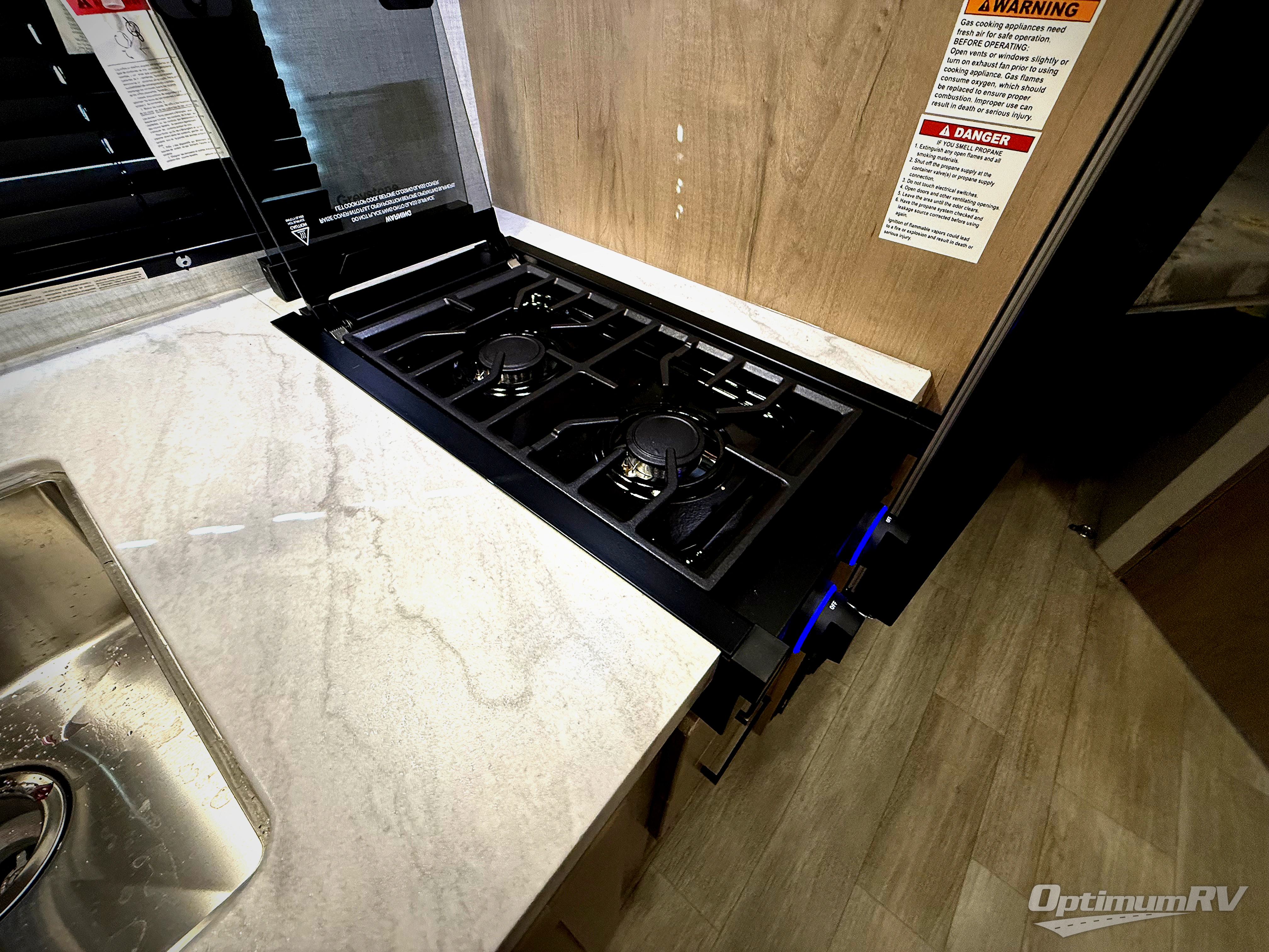 Time at the campground in this travel trailer will be time well spent. Once you arrive at your destination, you can put out the 16' electric awning, unpack the pass-through storage, then head inside for lunch. There is an air fryer convection microwave plus a dual burner cooktop to make meals each day, and the 10 cu. ft. 12V refrigerator will keep your food fresh. A legless dinette slide provides a place to dine together and even let a guest sleep over. If you're not needing the extra sleeping space, just choose the optional theater seating! You'll find the front queen bed will give you a great night's rest, and there is a full bath on board that will allow you to freshen up each morning. This unit includes the patent-pending repositionable EmberTrack E-Track bunk/storage system that allows for multiple single/double bunk configurations, depending on your needs.