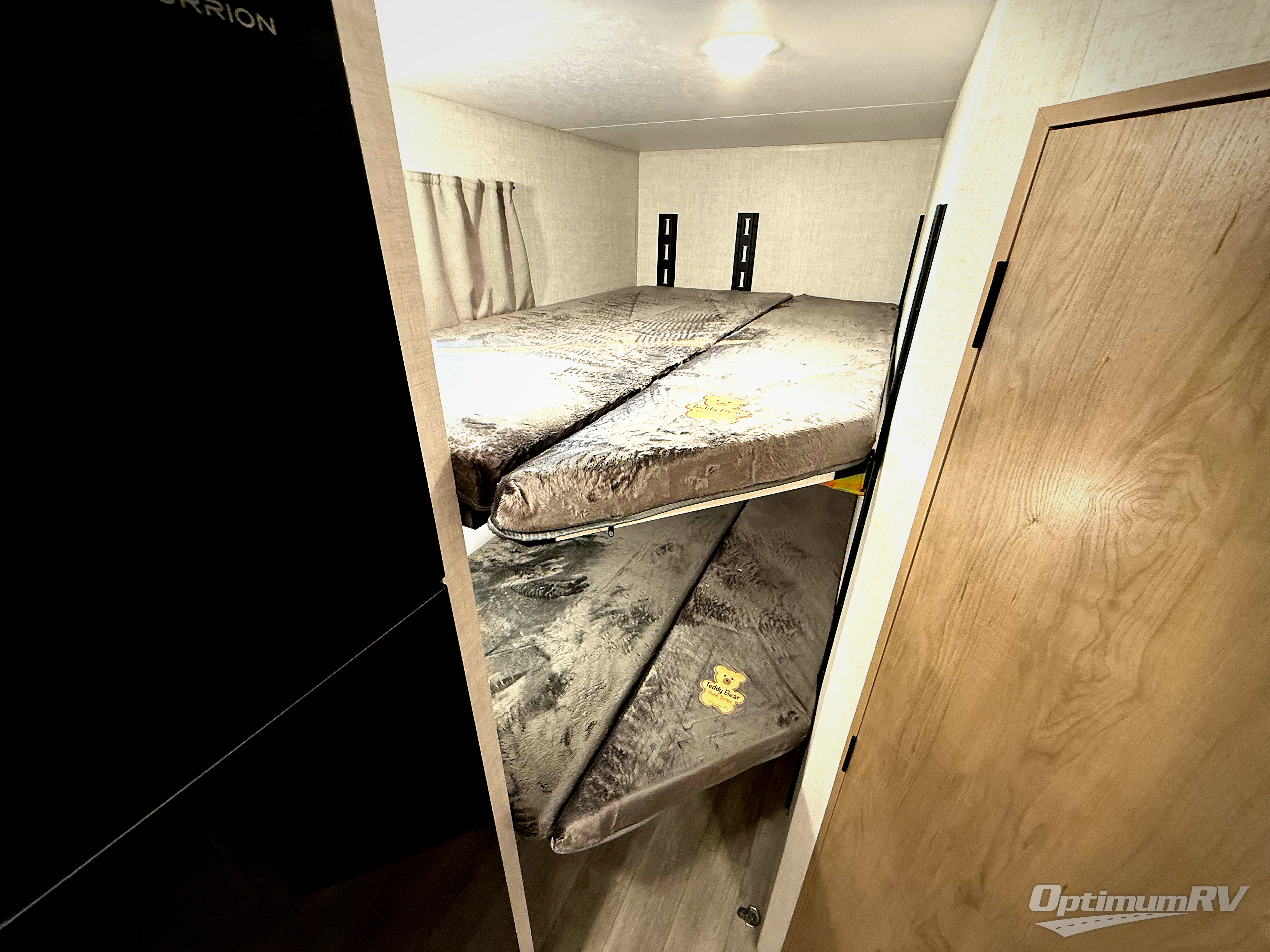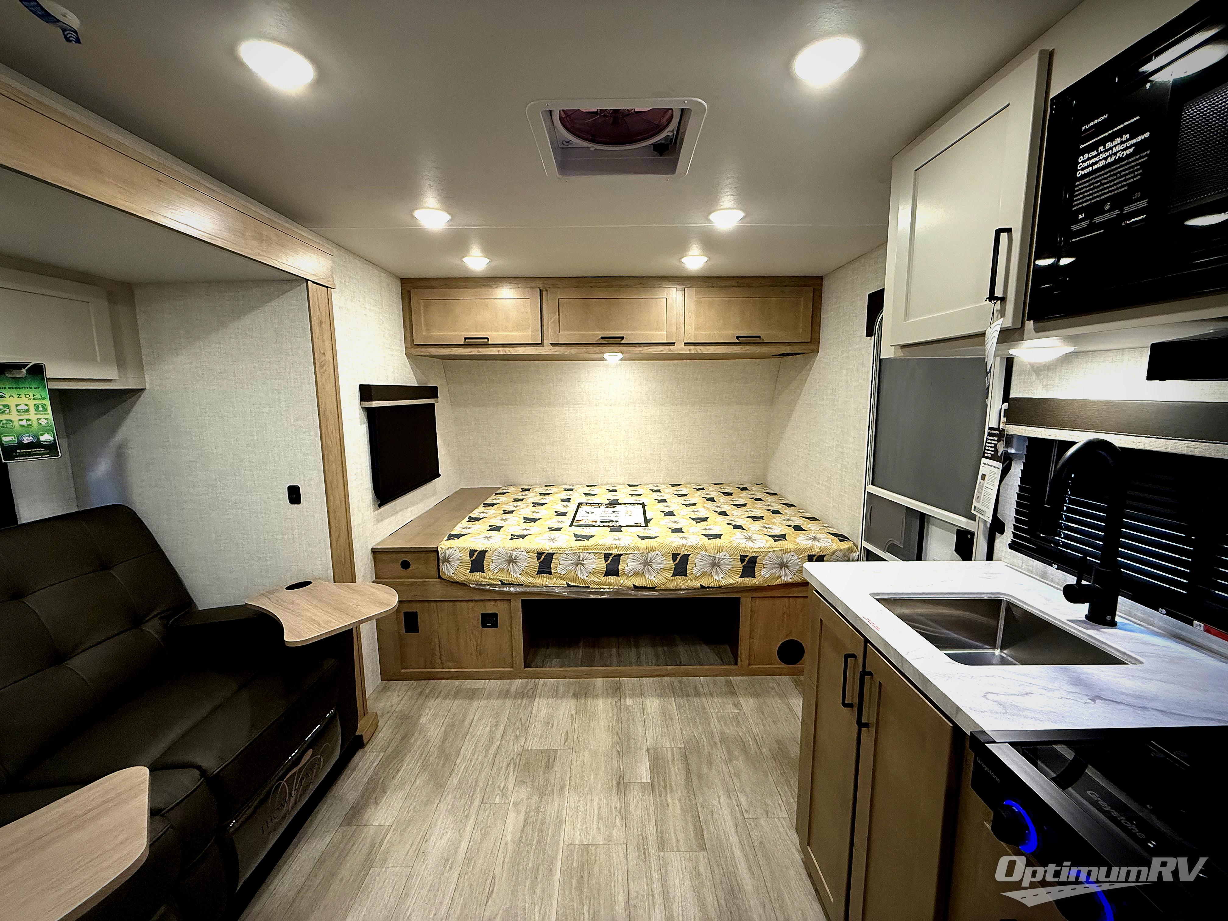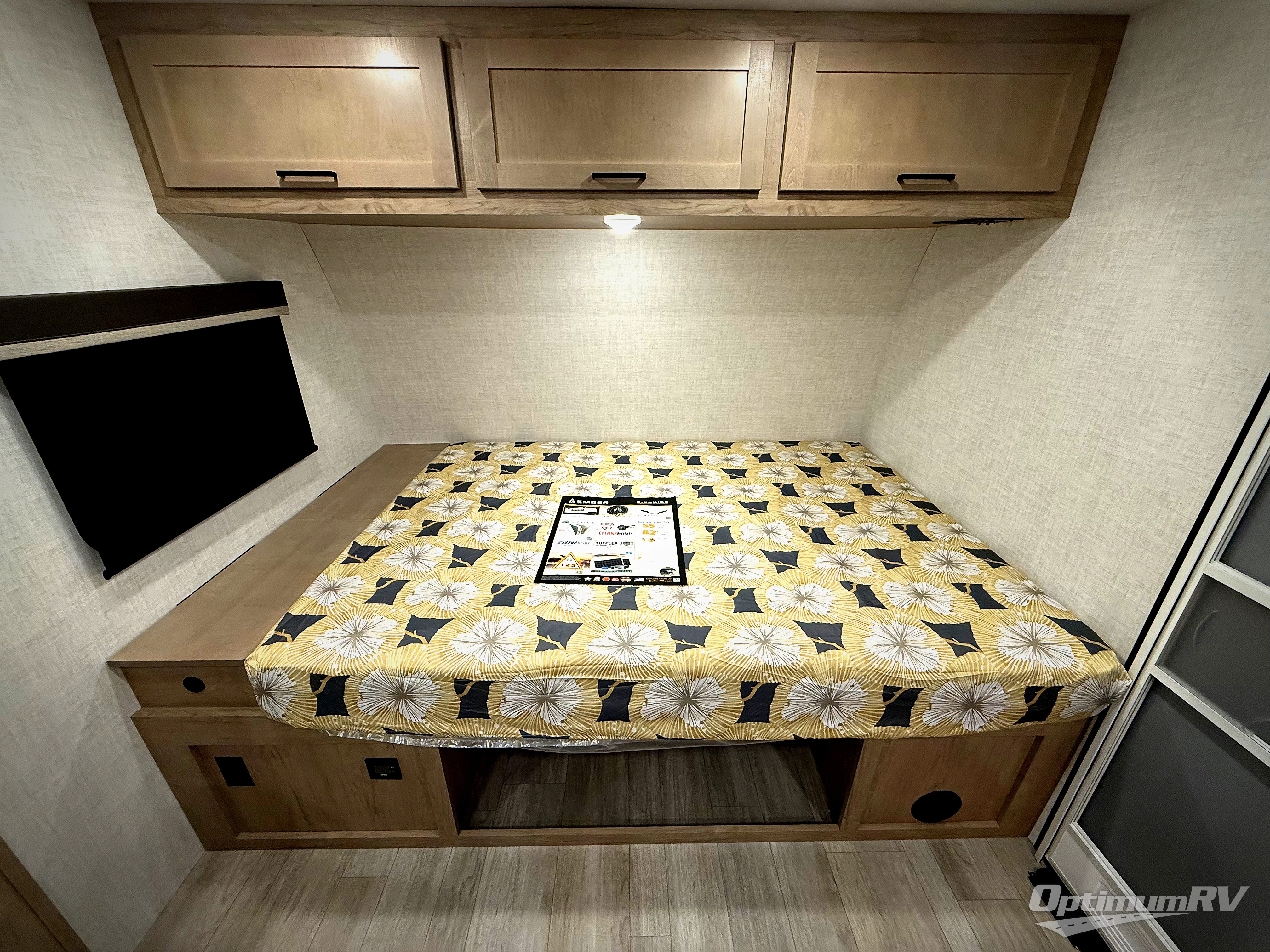 Time at the campground in this travel trailer will be time well spent. Once you arrive at your destination, you can put out the 16' electric awning, unpack the pass-through storage, then head inside for lunch. There is an air fryer convection microwave plus a dual burner cooktop to make meals each day, and the 10 cu. ft. 12V refrigerator will keep your food fresh. A legless dinette slide provides a place to dine together and even let a guest sleep over. If you're not needing the extra sleeping space, just choose the optional theater seating! You'll find the front queen bed will give you a great night's rest, and there is a full bath on board that will allow you to freshen up each morning. This unit includes the patent-pending repositionable EmberTrack E-Track bunk/storage system that allows for multiple single/double bunk configurations, depending on your needs.