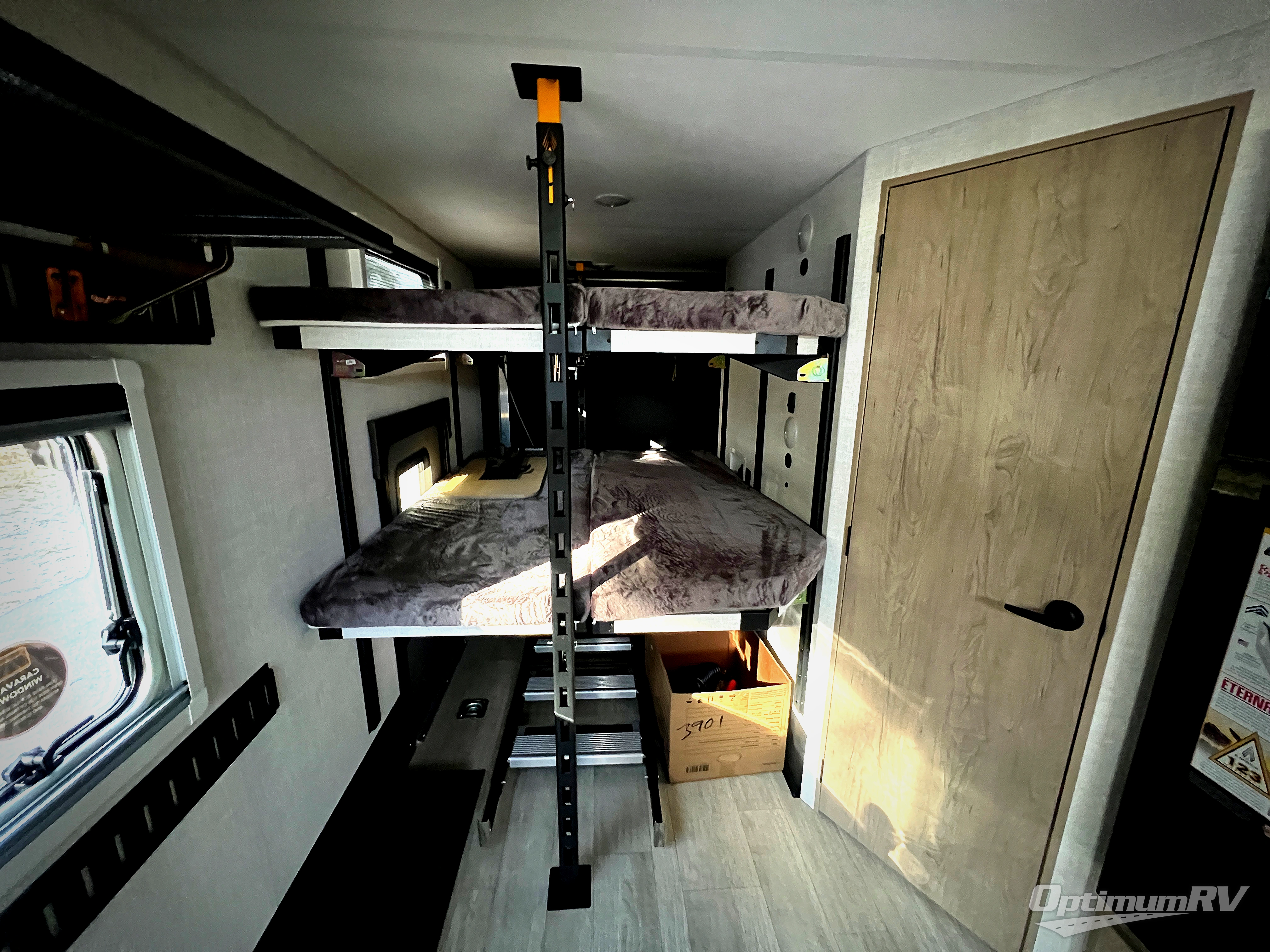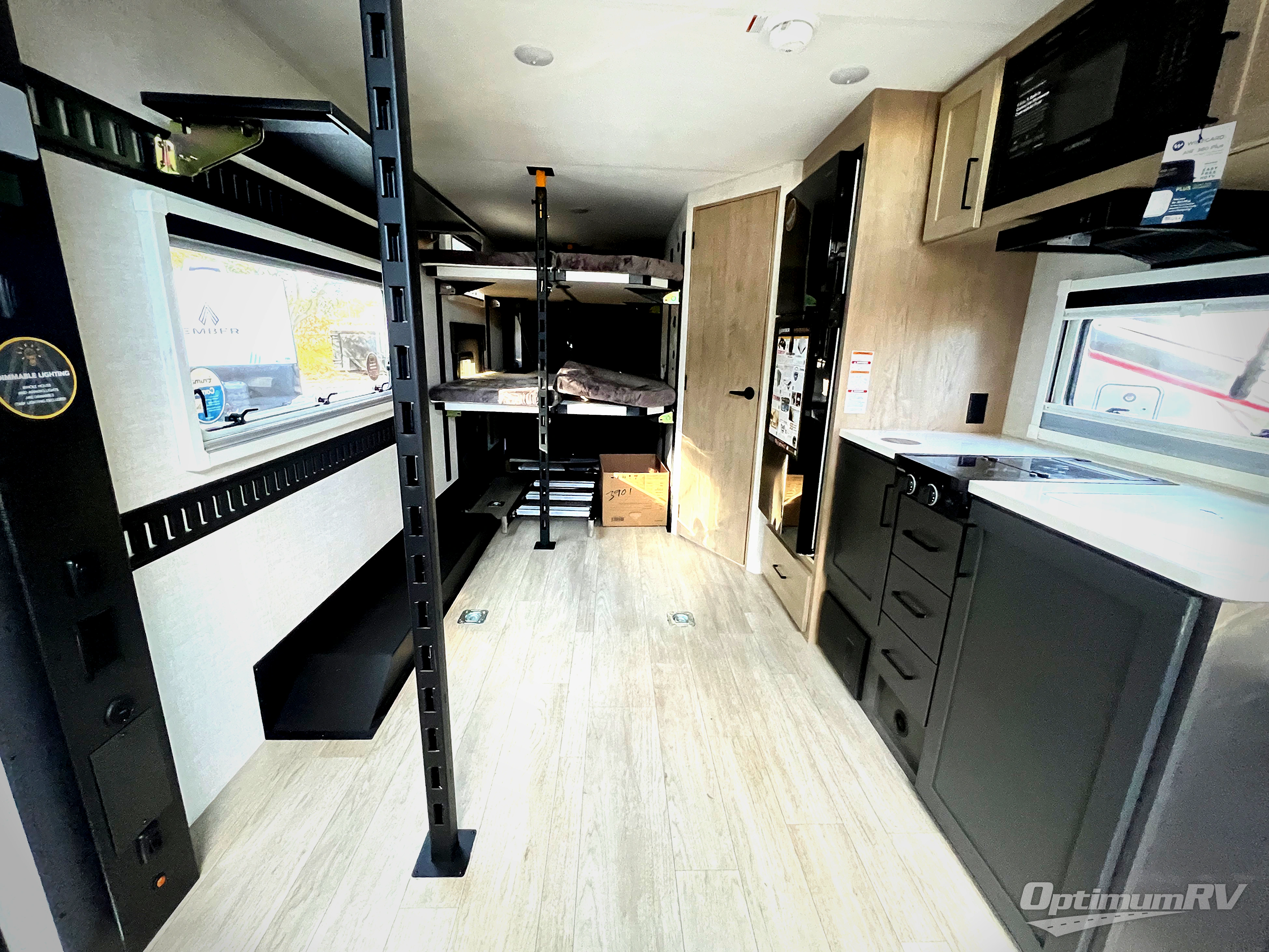 Every adventure will be fun in this versatile toy hauler! The 72" x 90" ramp door can convert to a party deck when you want to entertain friends, and there is 18' total cargo space from the ramp to front sofa to easily fit in your toys. The repositionable Embertrack E-track bunk/storage system provides 80" x 56" cargo space and you can choose whether you want a single or double bunk configuration. You can also choose if you want a desktop or bartop configuration, depending on your needs. The full kitchen includes a two burner cooktop, air fryer convection microwave, plus a 12V refrigerator for perishables. And of course there is a full bath on board, complete with a 24" x 40" shower with a skylight and a 12V fan. At the front of this unit you'll find the twin/king convertible Murphy bed; relax on the sofa, convert to twin beds, or one big king bed, the choice is yours!