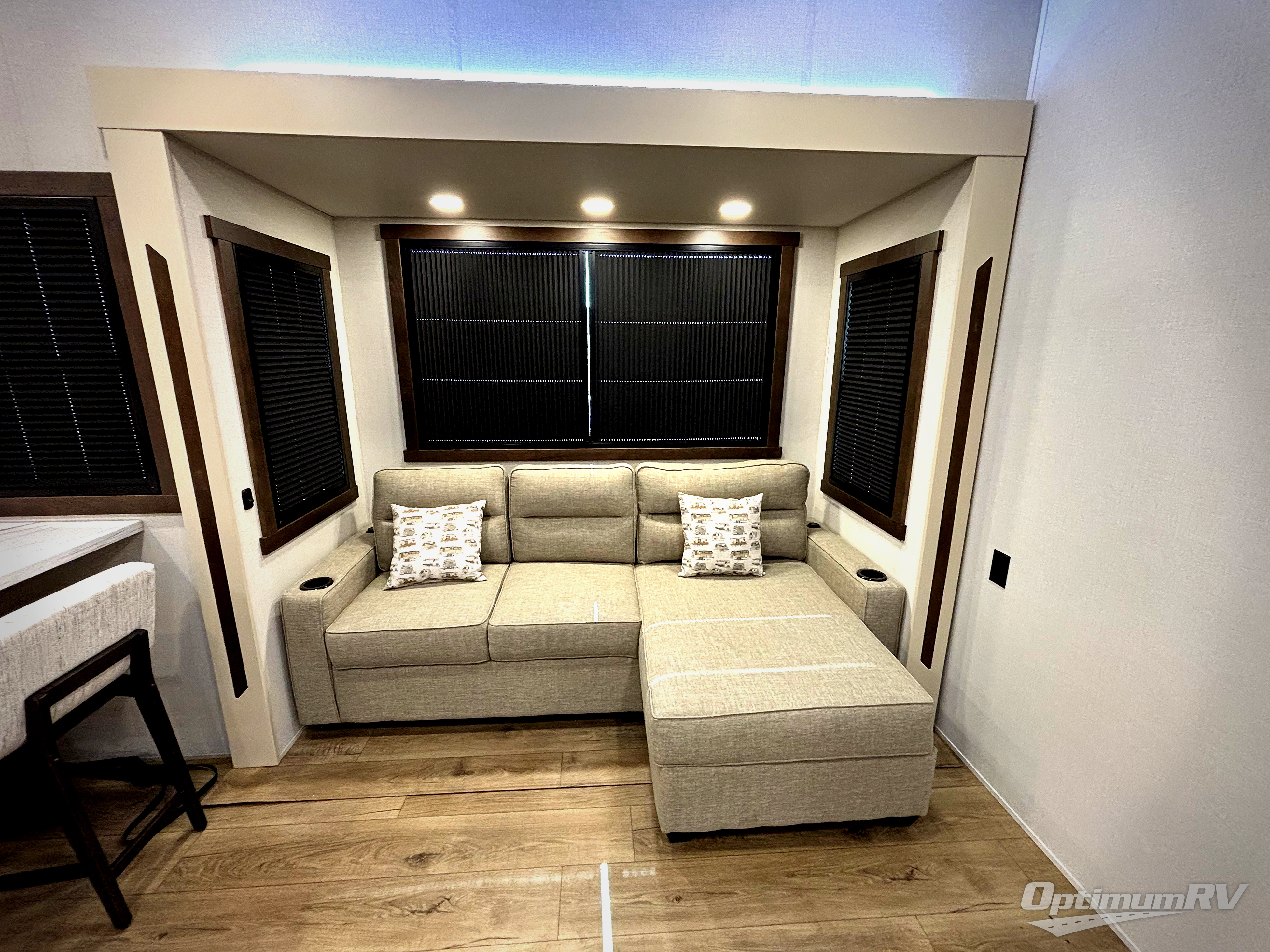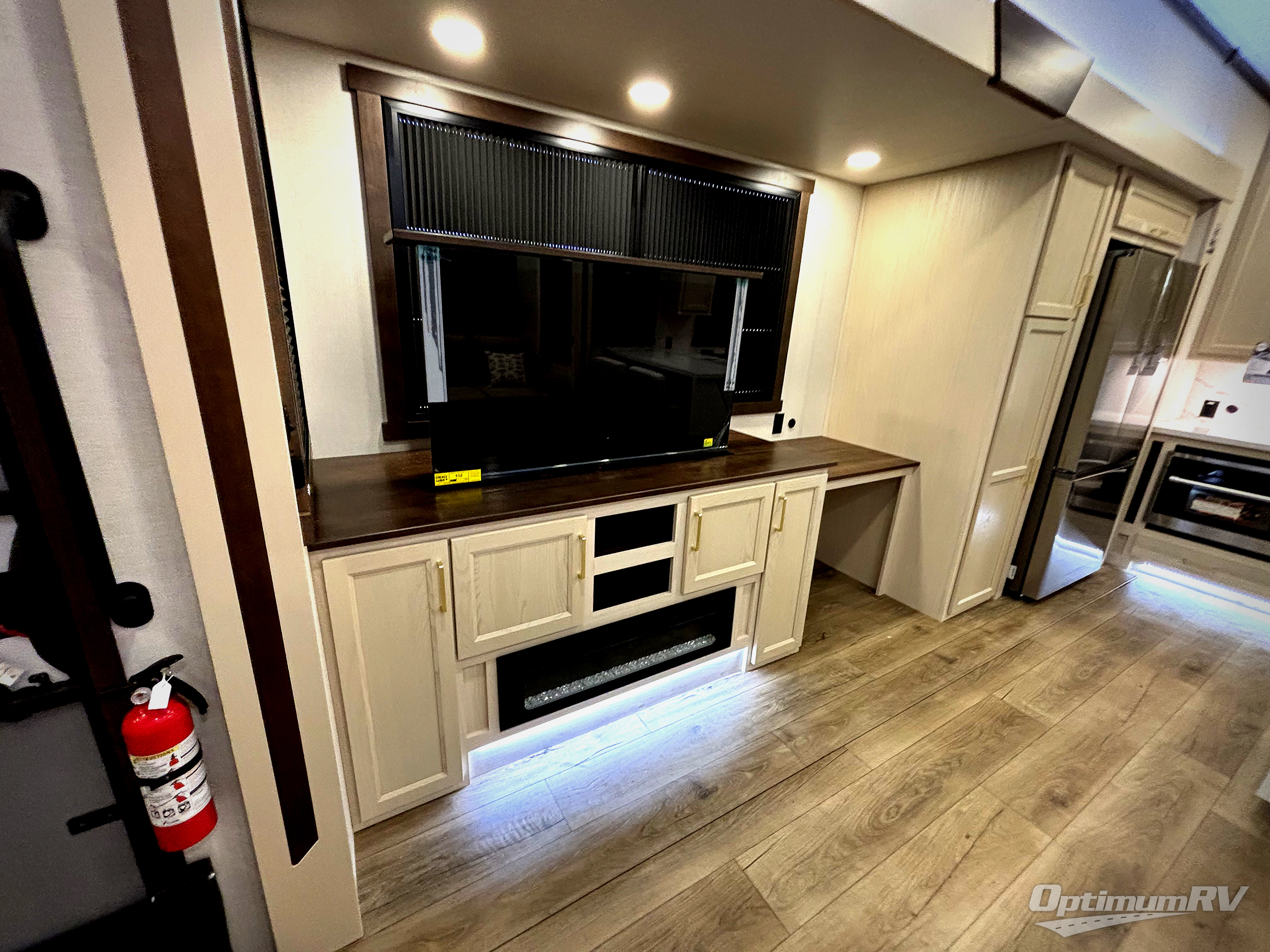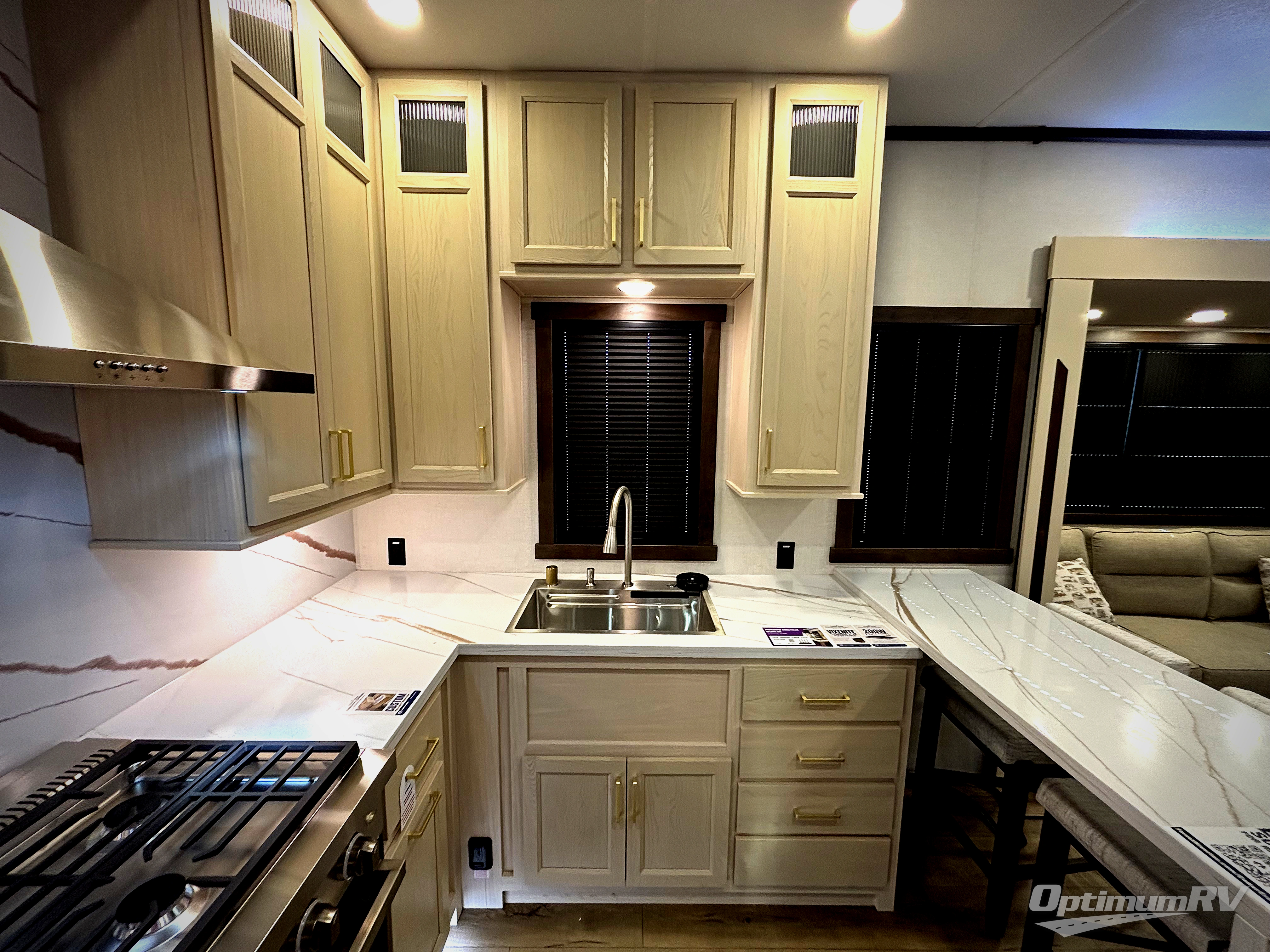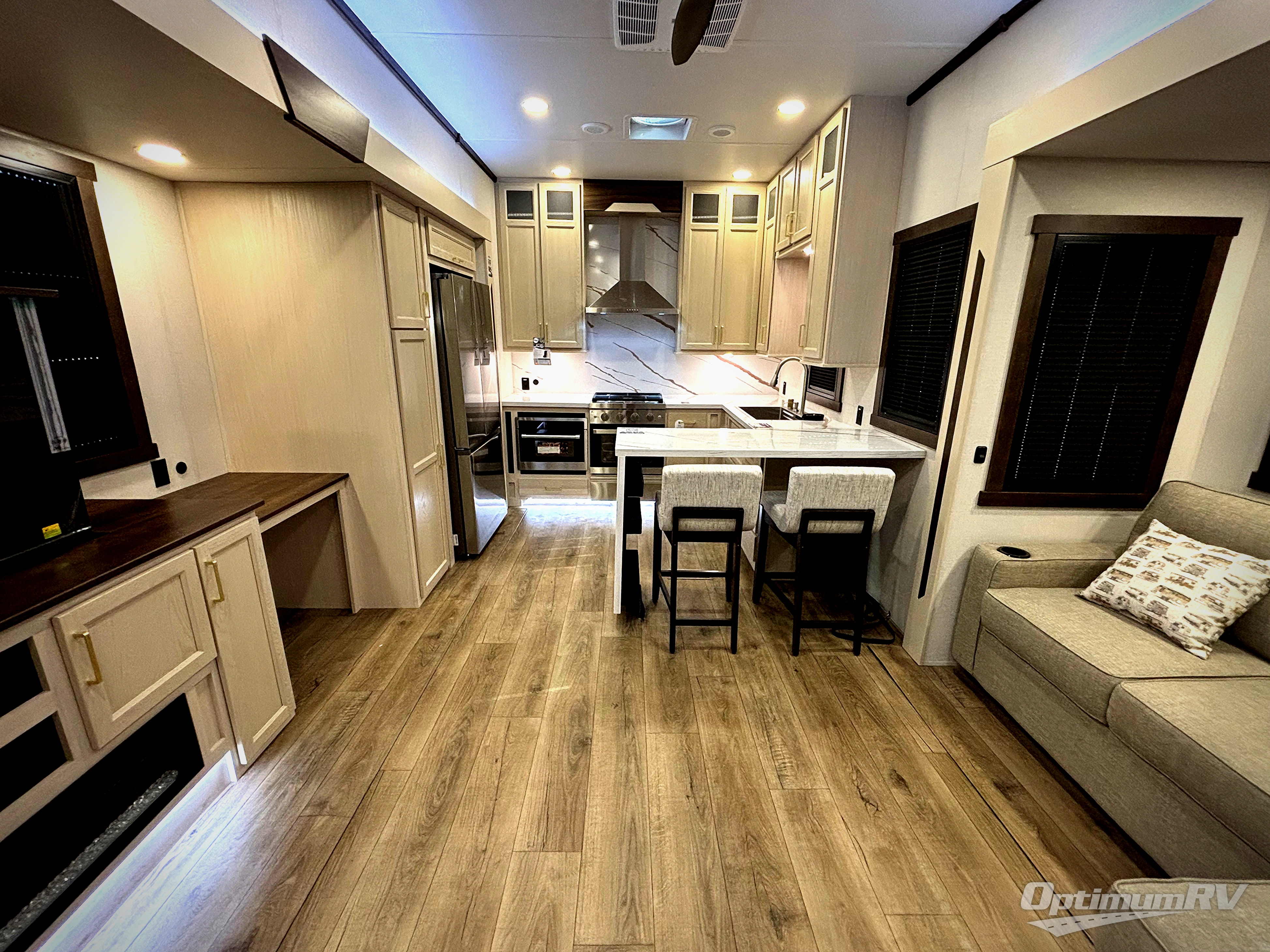 At the front of this 385RK fifth wheel, you’ll find a full bathroom featuring a spacious shower with a built-in seat and convenient LED motion night lighting under the vanity for added comfort. Adjacent to the bathroom is a walk-in closet complete with a dresser and hanging rods, offering ample storage for clothing and gear. Next to this area is the bedroom, which houses a 72" x 80" king bed set in a slide-out for a restful night’s sleep. Across from the bed sits another dresser with a TV, providing extra storage and entertainment. Moving toward the center, a half bath is conveniently located across from the entrance for easy access. The living area opens up with dual opposing slides, creating a roomy lounge space featuring a sectional sofa and an entertainment center with a TV and fireplace, perfect for cozy movie nights. At the rear, the U-shaped kitchen invites the chef of the trip to cook to their heart’s content, equipped with ample overhead cabinets, a 20-cu. ft. stainless steel refrigerator, a 30" stainless steel over-the-range microwave with an updated backsplash, and a 3-burner gas oven with a pull-out pan drawer. Meals can be enjoyed at the convenient bartop with stools to the side, making this fifth wheel both stylish and functional.