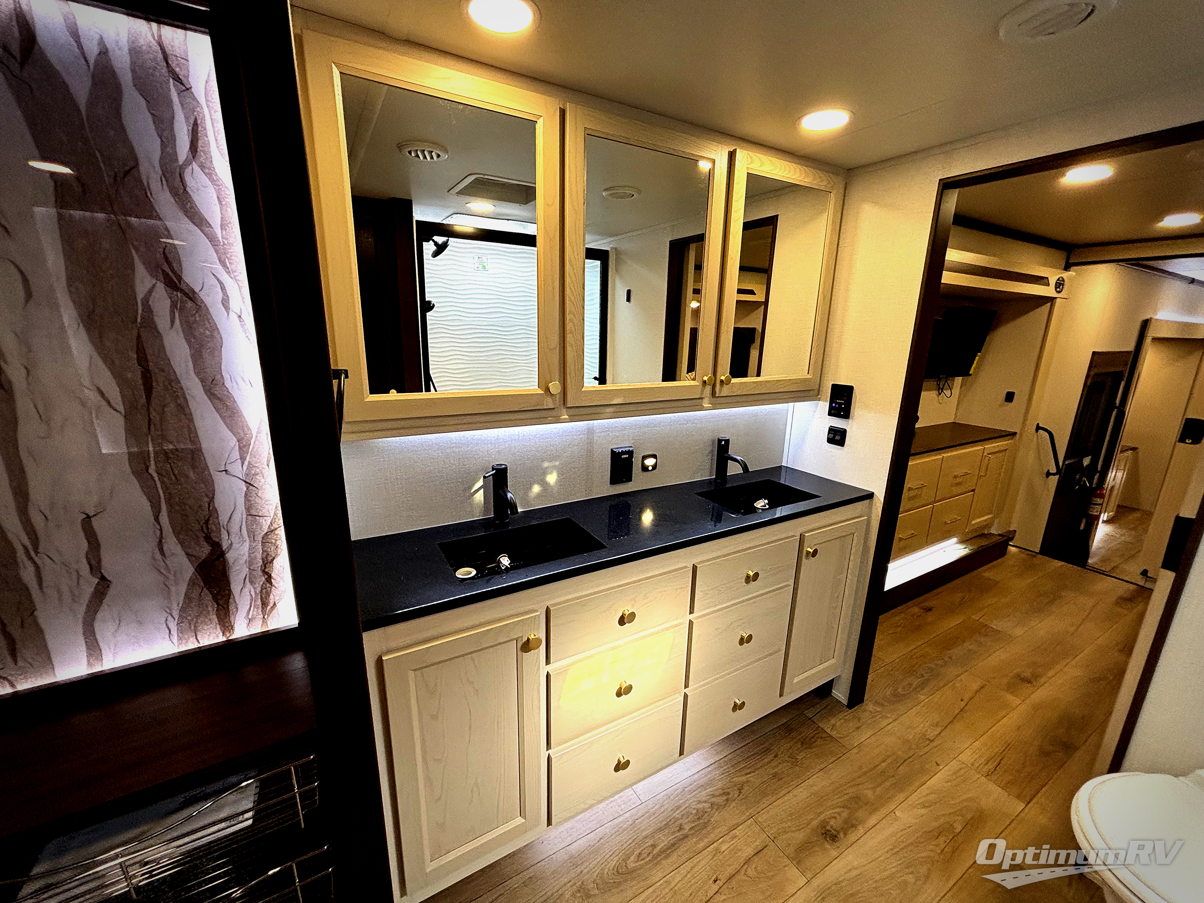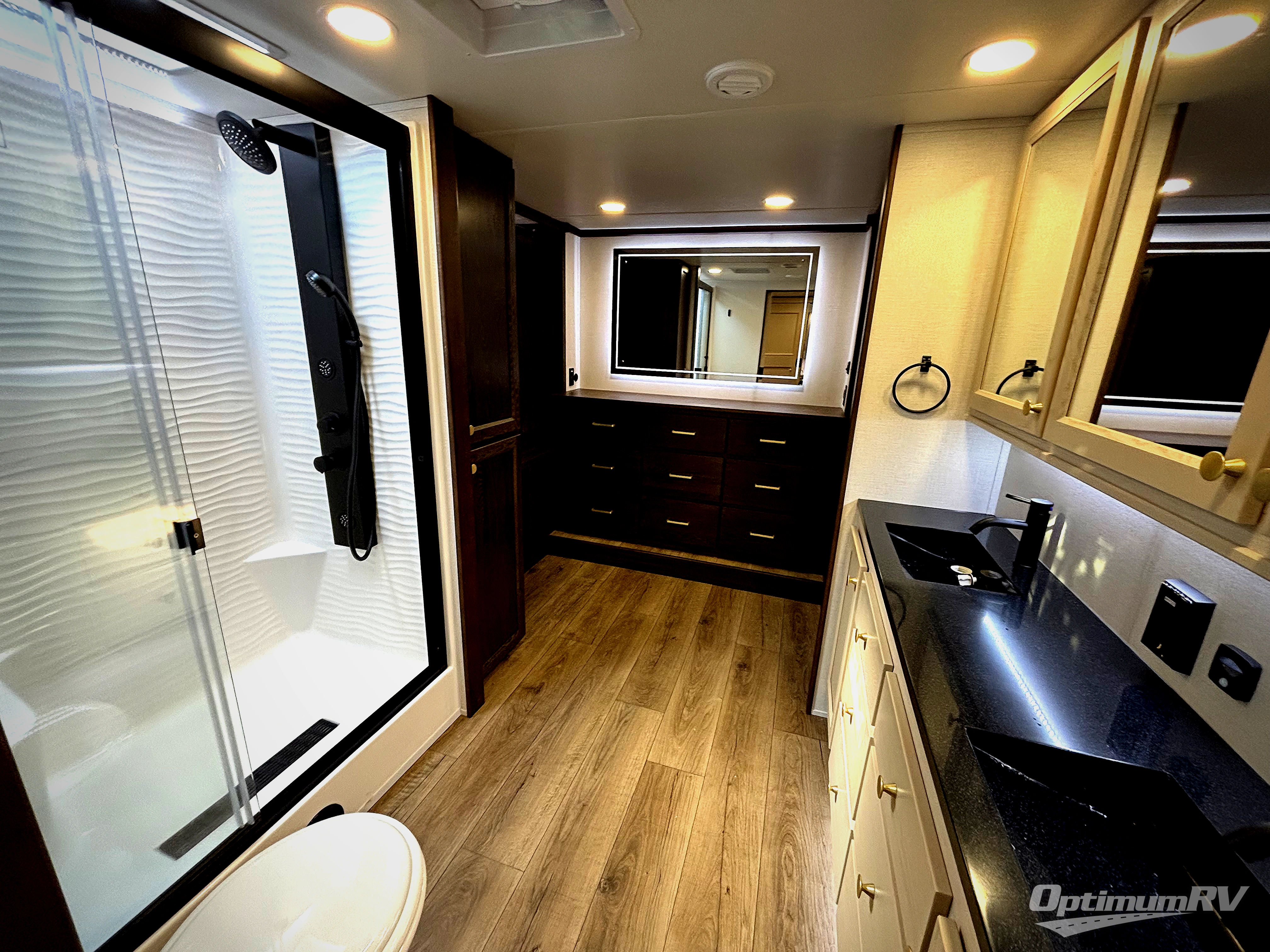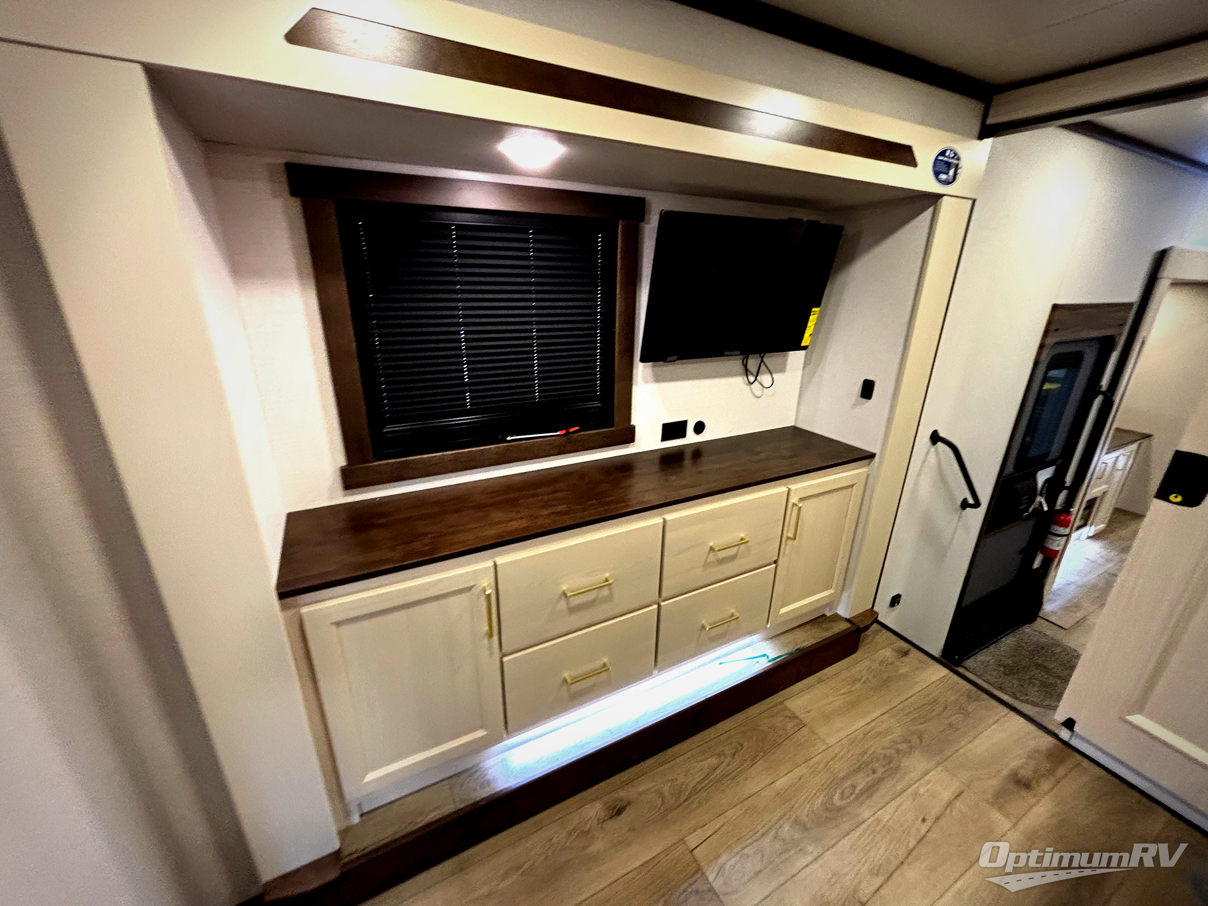 At the front of this 385RK fifth wheel, you’ll find a full bathroom featuring a spacious shower with a built-in seat and convenient LED motion night lighting under the vanity for added comfort. Adjacent to the bathroom is a walk-in closet complete with a dresser and hanging rods, offering ample storage for clothing and gear. Next to this area is the bedroom, which houses a 72" x 80" king bed set in a slide-out for a restful night’s sleep. Across from the bed sits another dresser with a TV, providing extra storage and entertainment. Moving toward the center, a half bath is conveniently located across from the entrance for easy access. The living area opens up with dual opposing slides, creating a roomy lounge space featuring a sectional sofa and an entertainment center with a TV and fireplace, perfect for cozy movie nights. At the rear, the U-shaped kitchen invites the chef of the trip to cook to their heart’s content, equipped with ample overhead cabinets, a 20-cu. ft. stainless steel refrigerator, a 30" stainless steel over-the-range microwave with an updated backsplash, and a 3-burner gas oven with a pull-out pan drawer. Meals can be enjoyed at the convenient bartop with stools to the side, making this fifth wheel both stylish and functional.